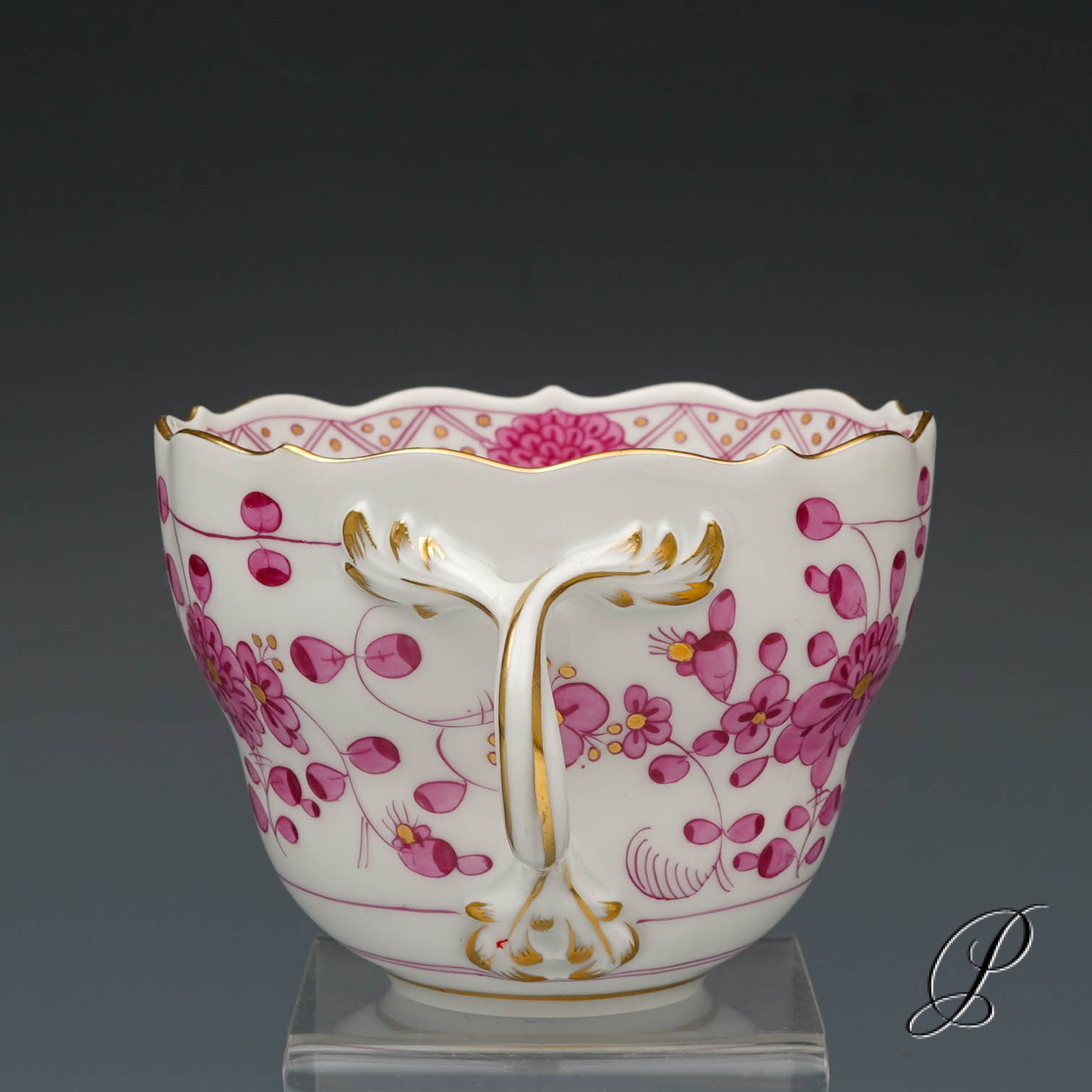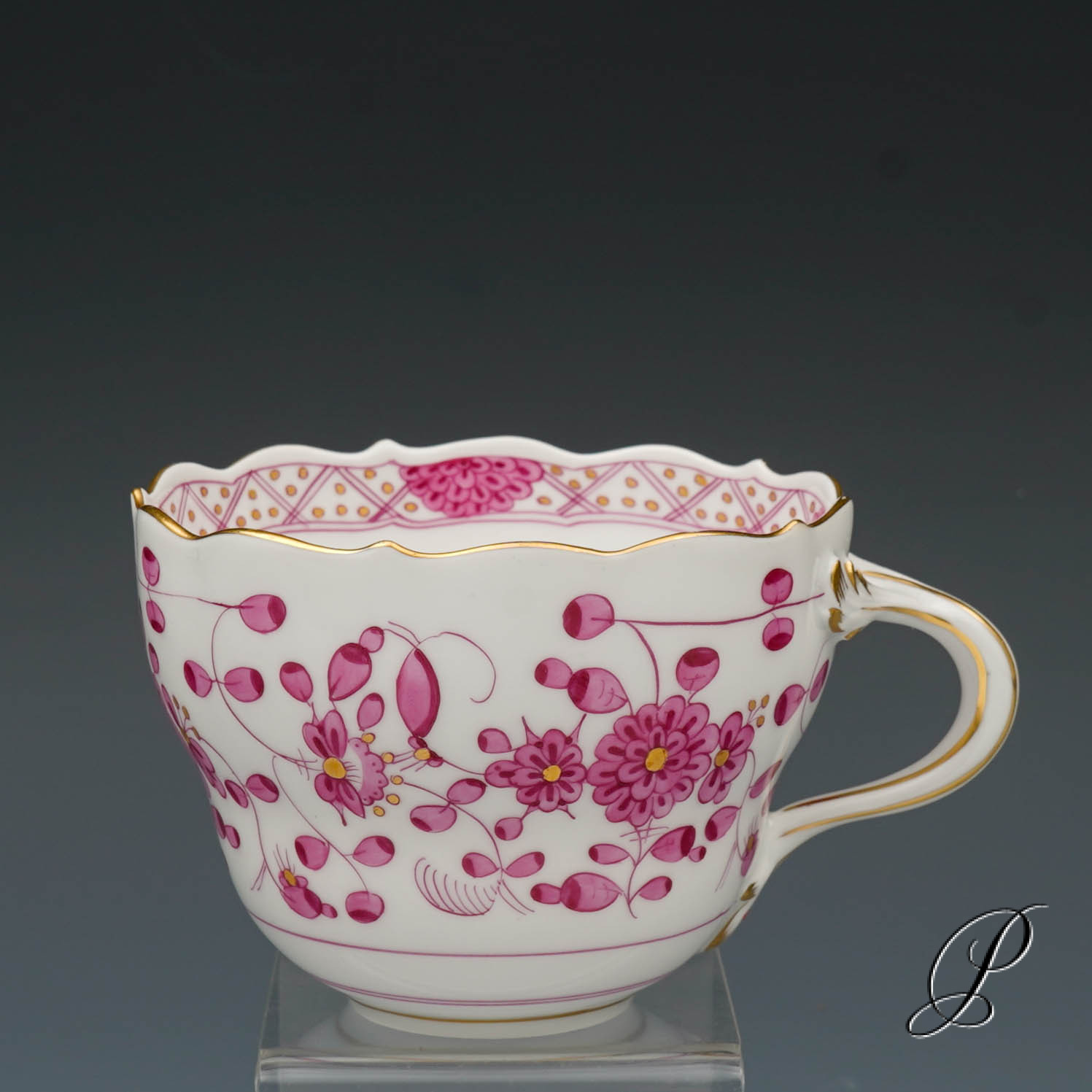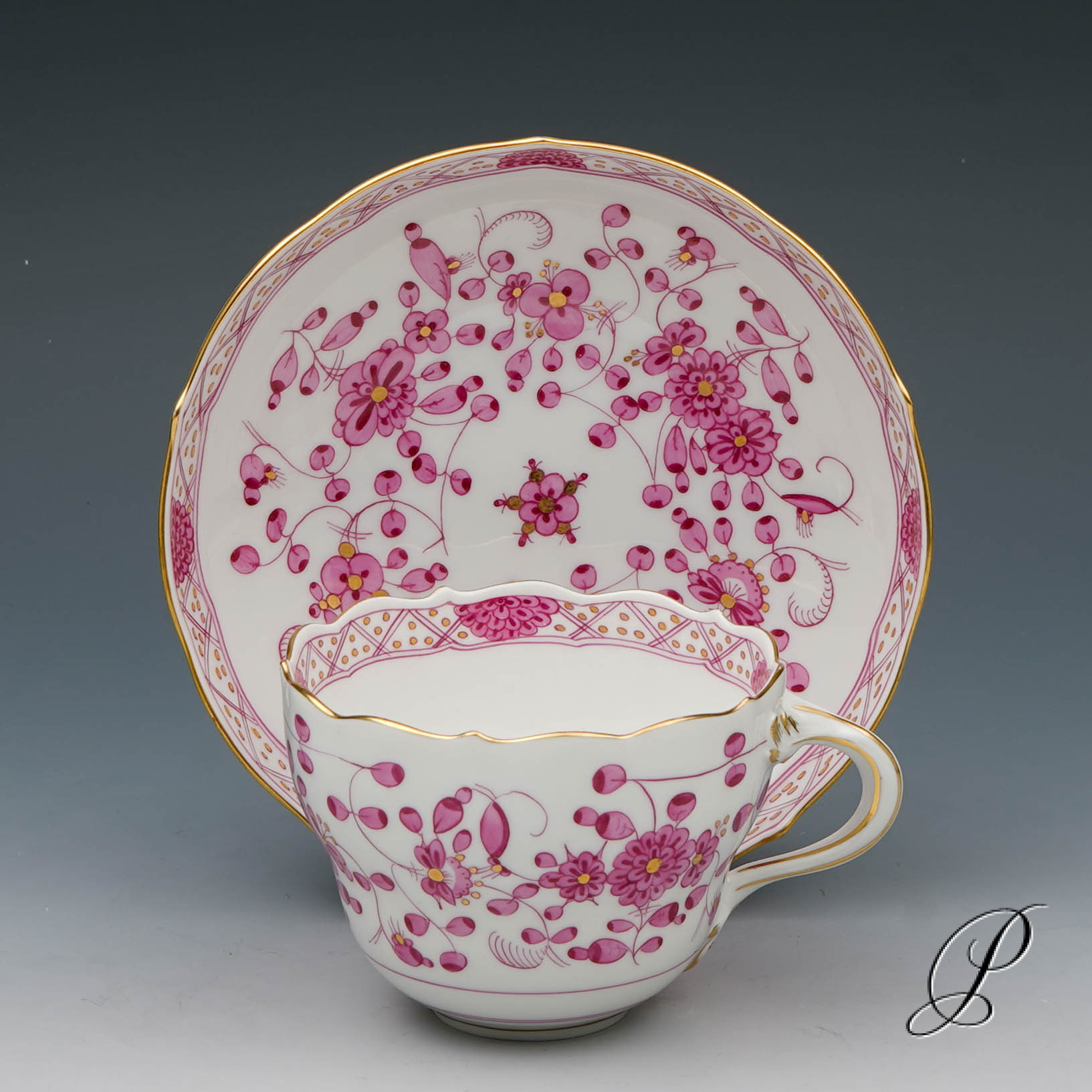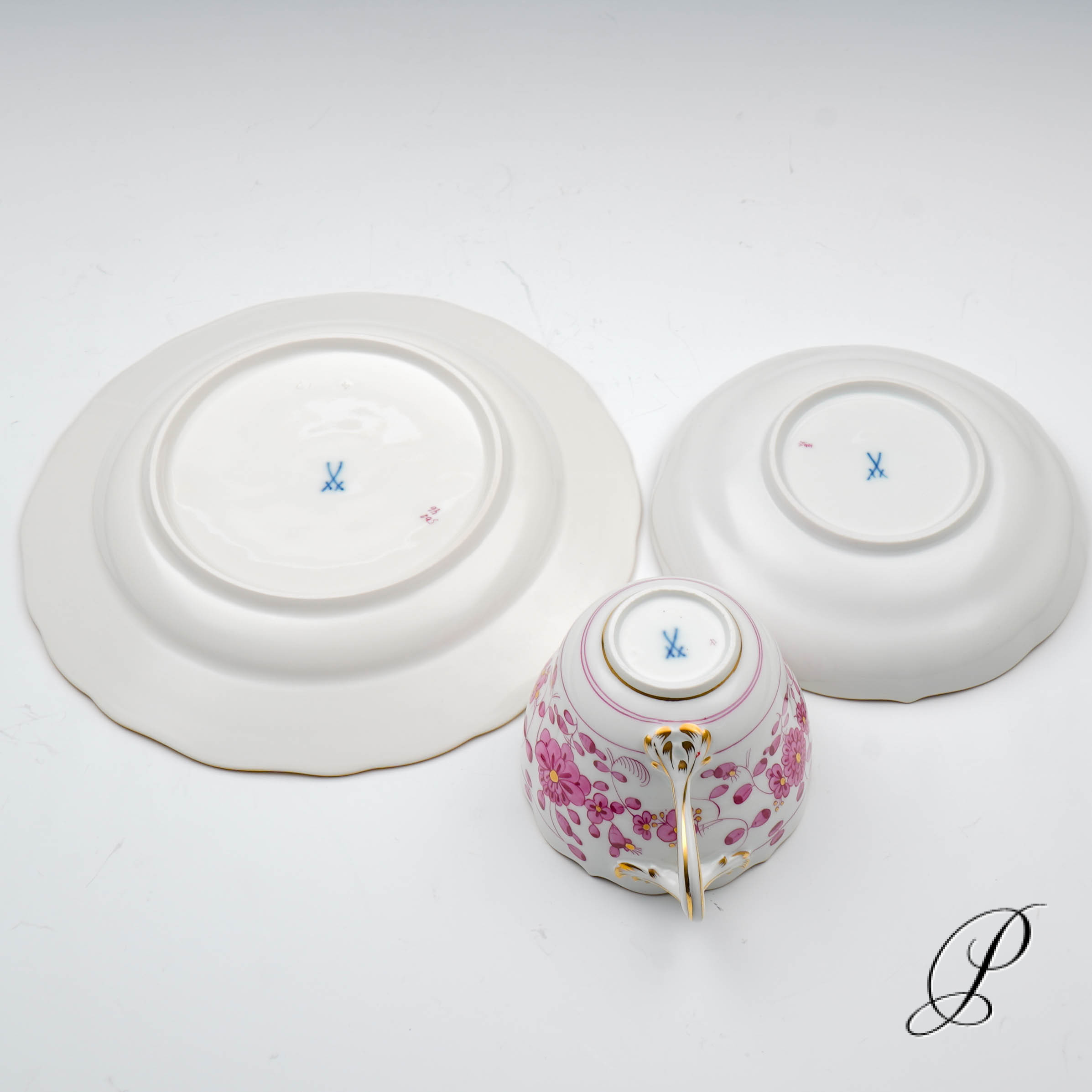 Entdecken Sie ein exquisites Kaffeegedeck von Meissen, handgefertigt und meisterhaft handbemalt im traditionellen Dekor „Reiche Indische Malerei purpur“.