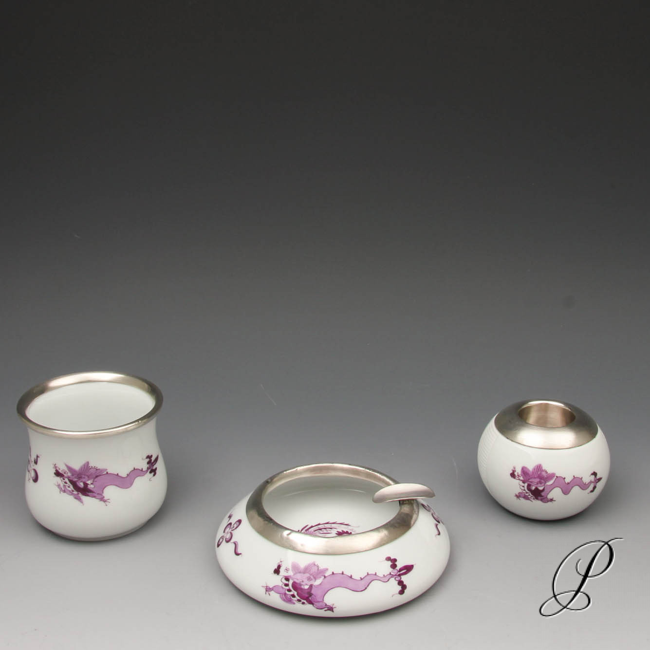 Bemalt im Dekor Drache lila. Zusätzlich sind alle Stücken mit 925 Sterling Silber Rand veredelt worden.