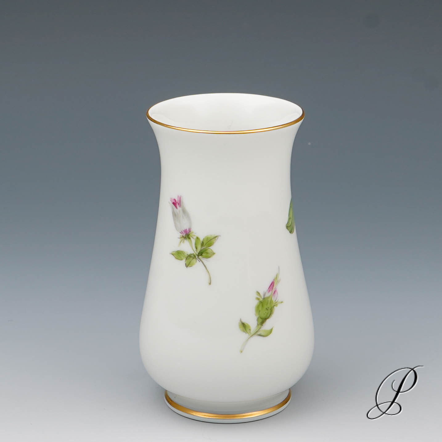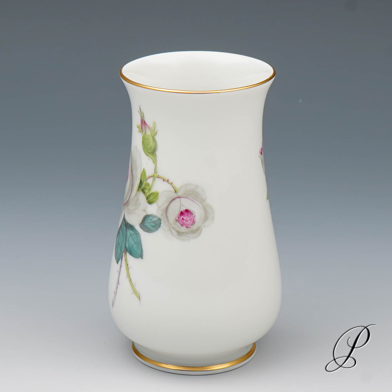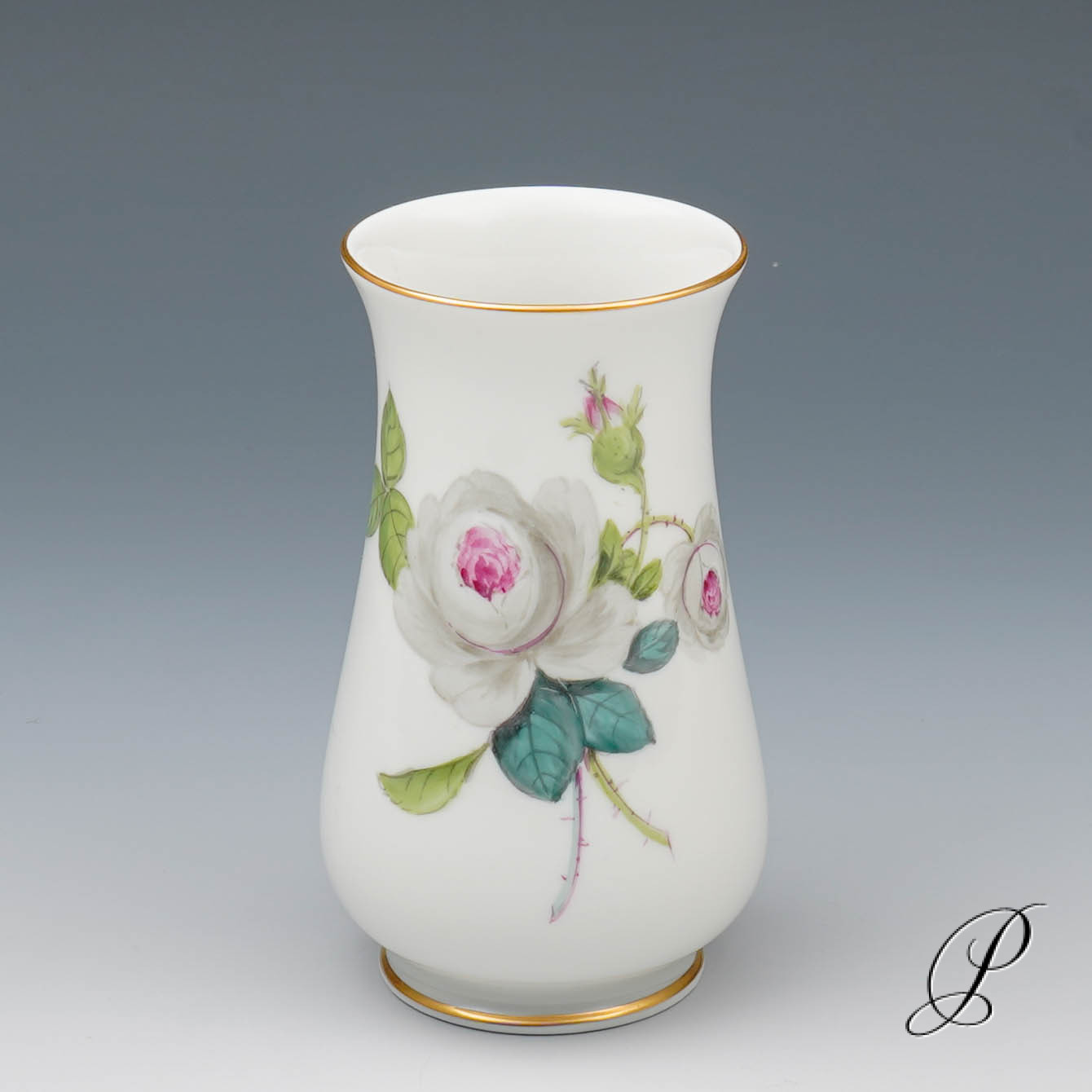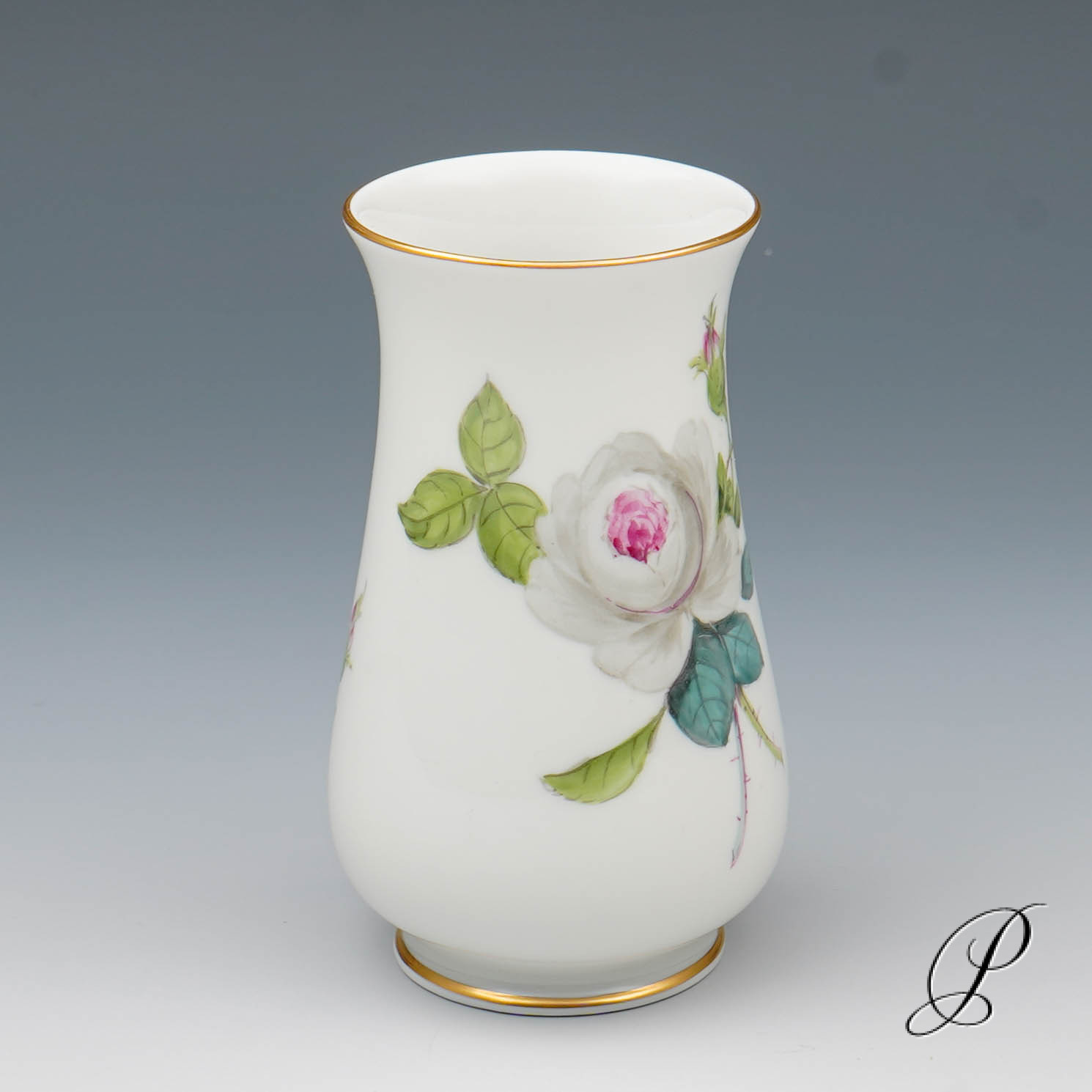 Dieses Dekor wird selten angeboten. Die weiße Rose mit Purpurkern wirkt lebendig und stilvoll. Wie direkt vom Rosenstock geschnitten.