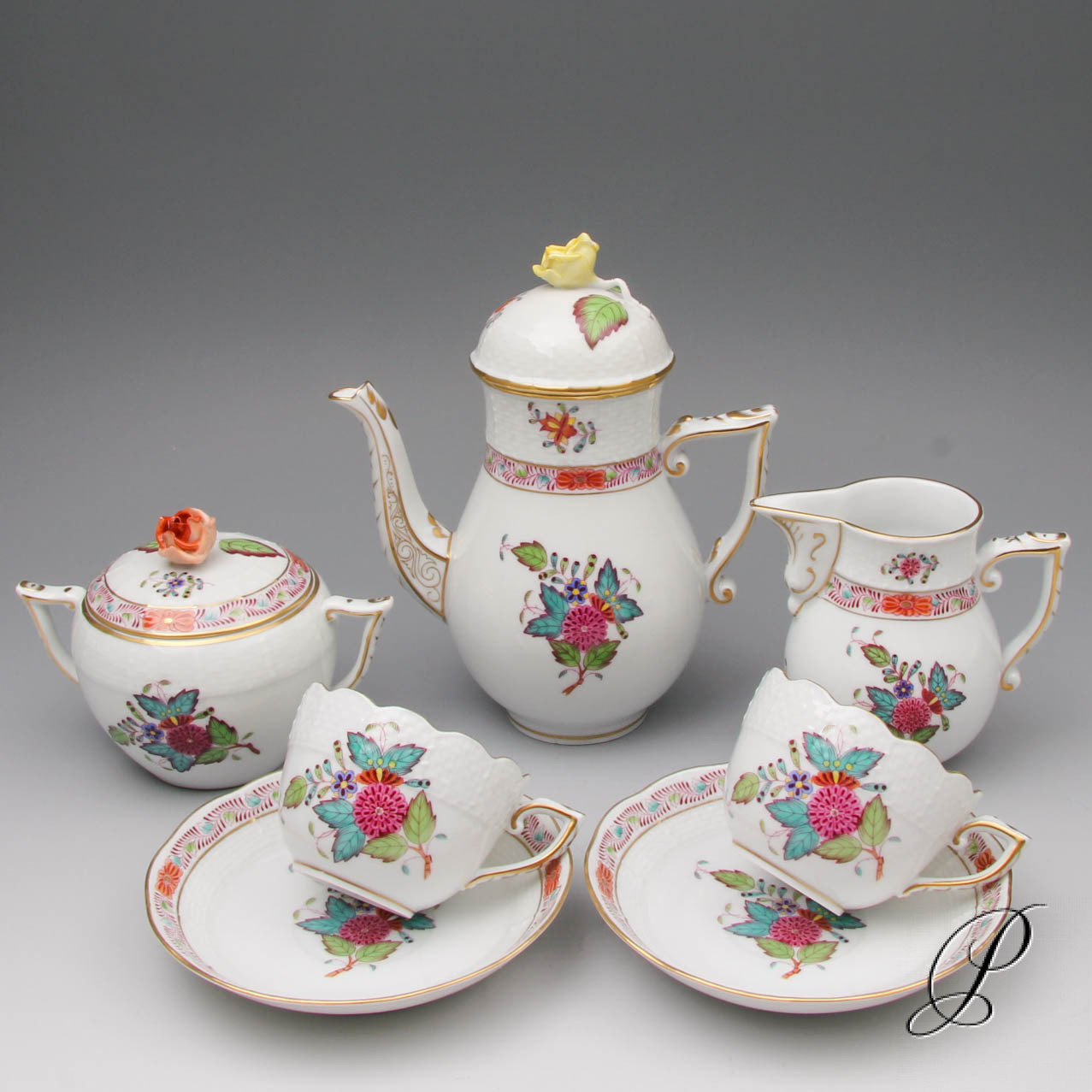 Das Dekor Apponyi gibt es in verschiedenen Farbvarianten. Der Name verbindet sich mit dem Grafen Albert Apponyi, der dieses Motiv in der Herend Manufaktur bestellte. Das Dekor wurde in Anlehnung an das fernöstliche Motiv „Indischer Blumenkorb“ entworfen. Eine stilisierte Pfingstrose in Konturmalerei welche von 6 Streumotiven und einer Girlande aus stilisierten Blättern umgeben ist.