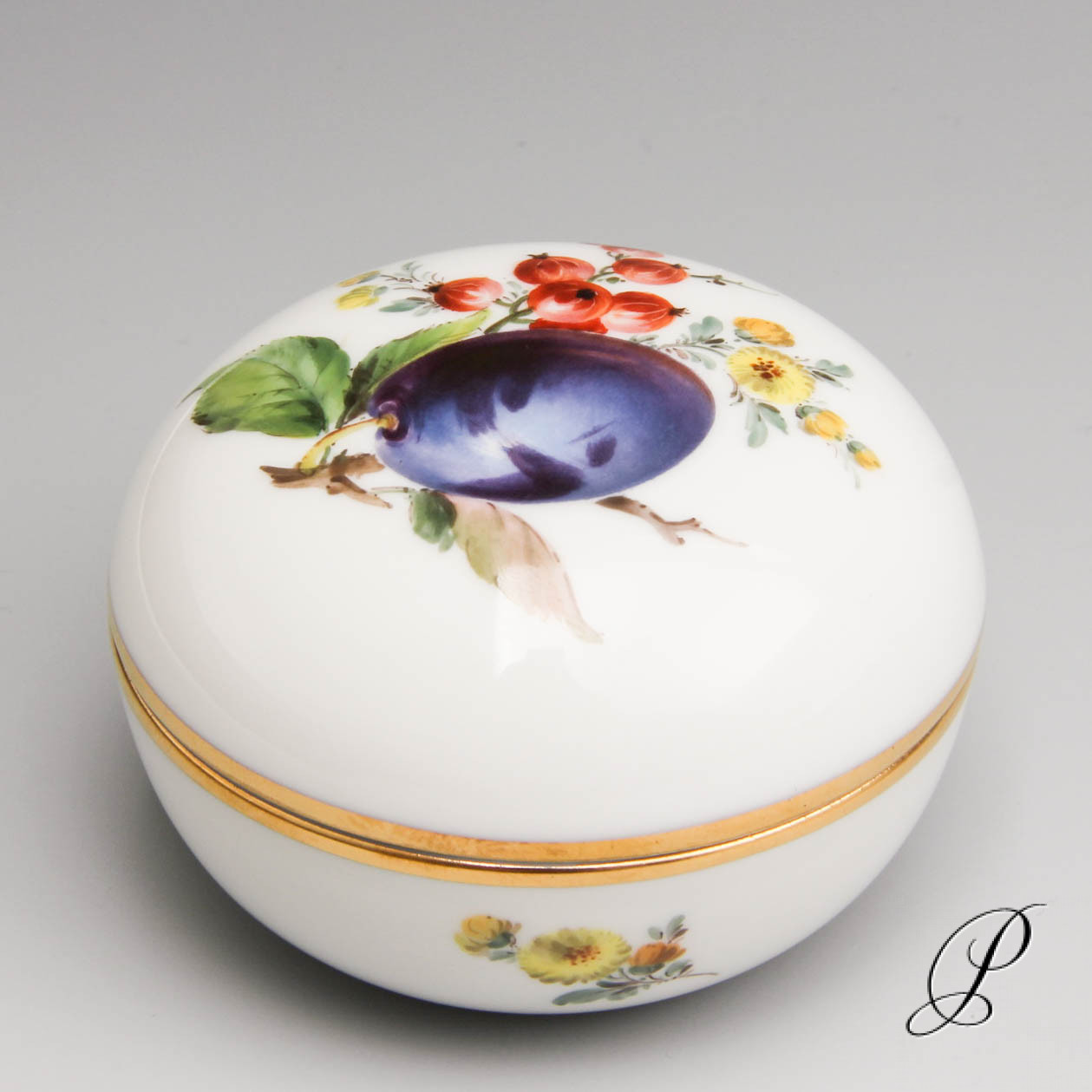 | Keywords | Schmuckdose Meissen,Obstmalerei Meissen,Meissen Porzellan,,Dose Meissen,Blumenmalerei |