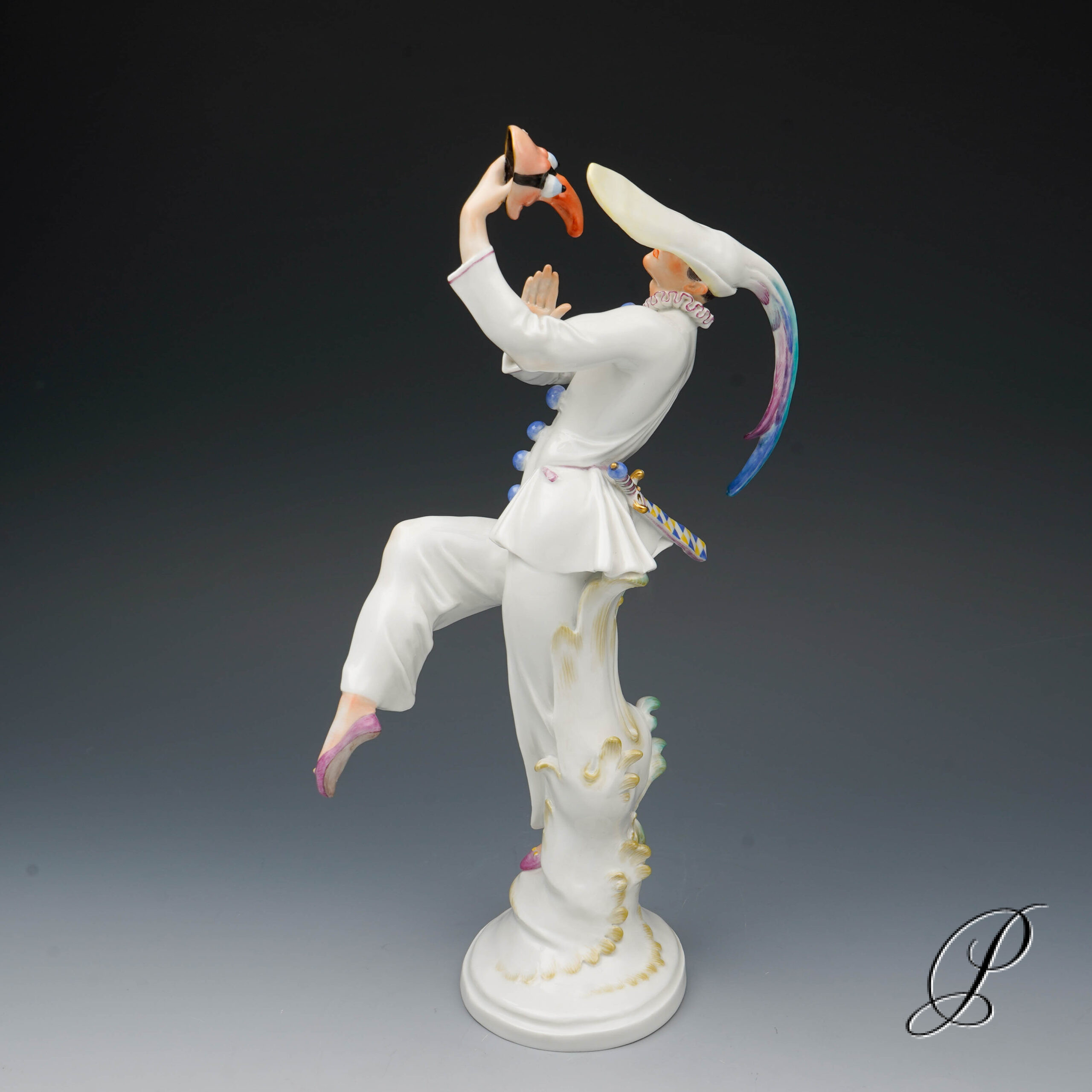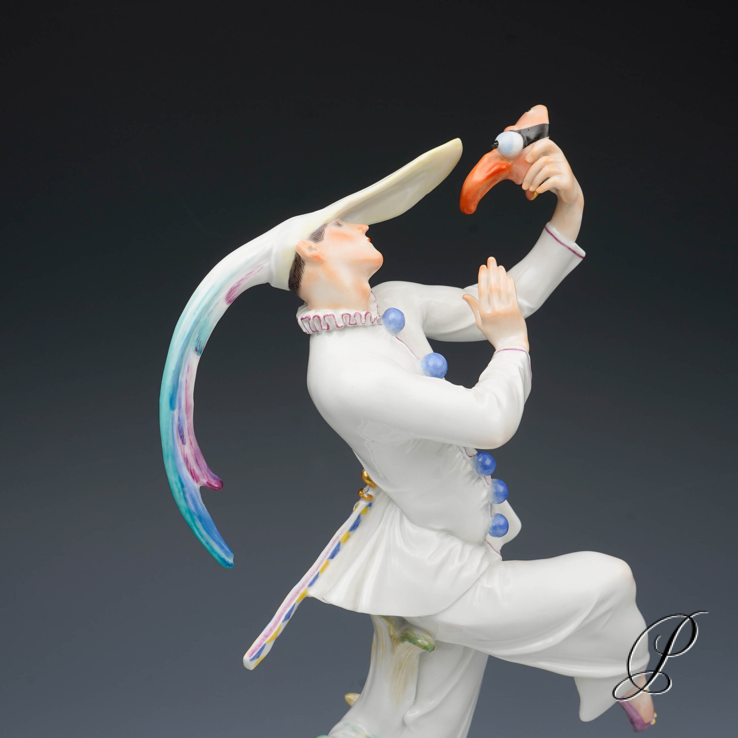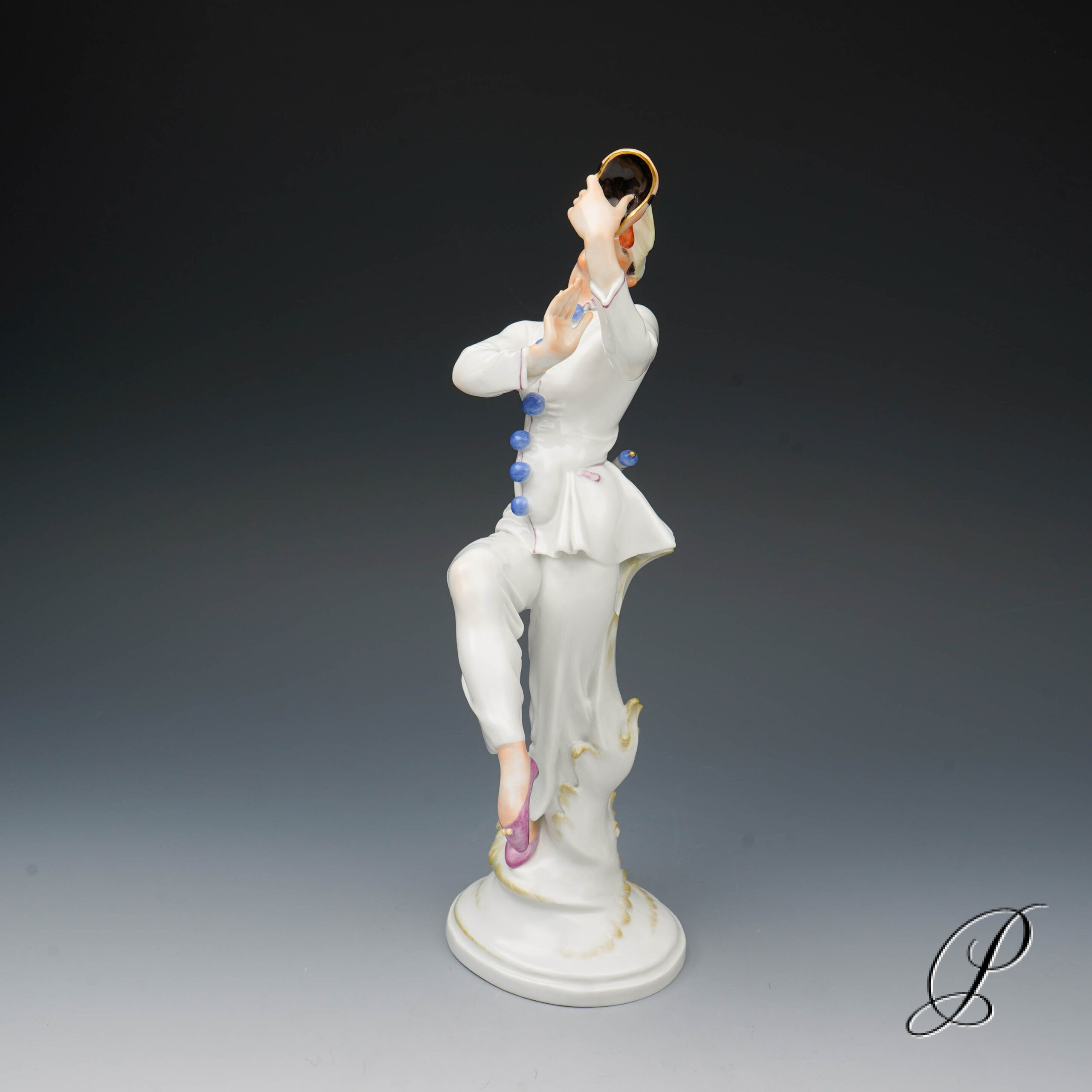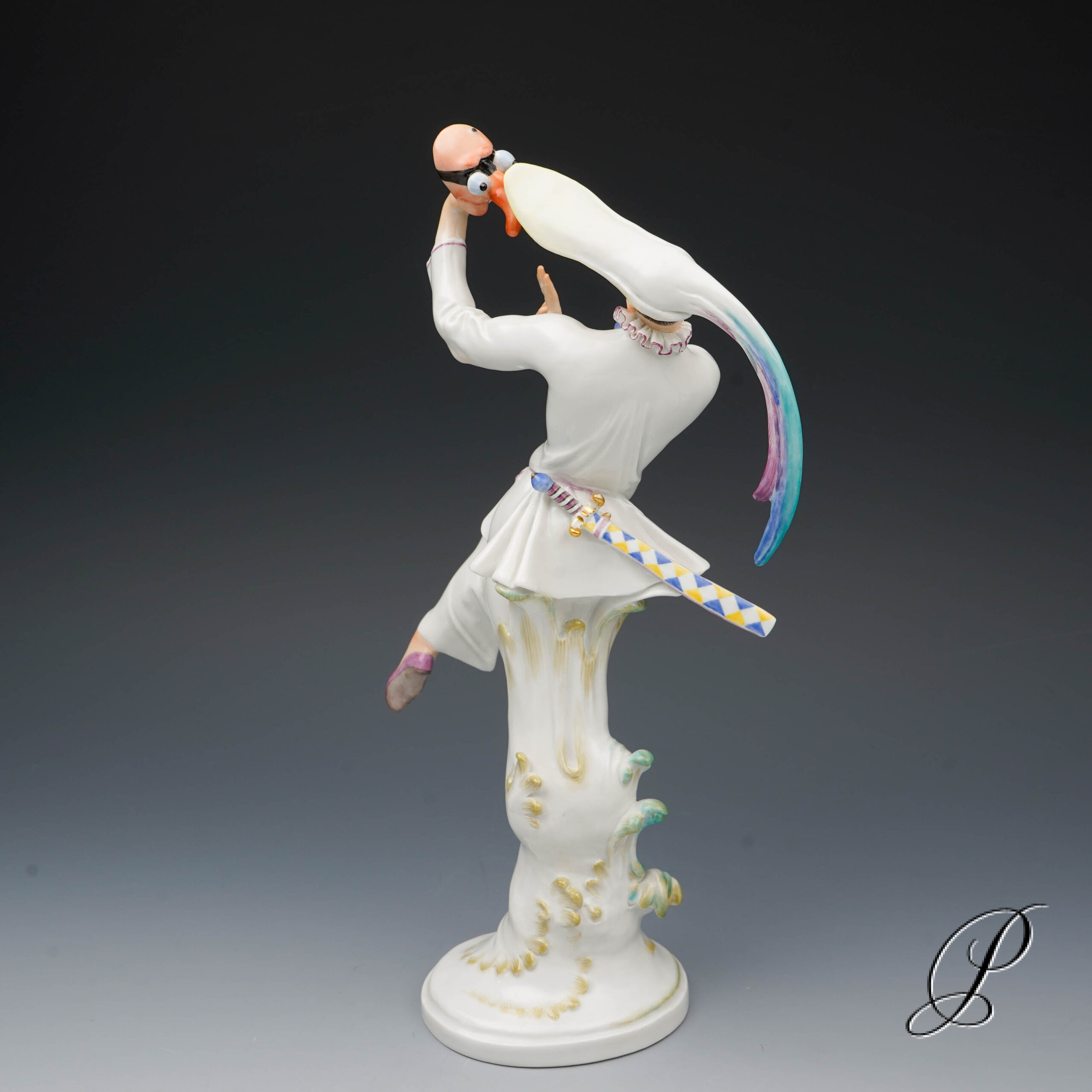 Der Tänzer in der schmalen Kappe mit extrem langen Schirm und Hahnenfedern, hat die Maske abgenommen und betrachtet sie im überlegener Miene. Ein grandioses Meisterwerk der Porzellankunst mit allseitig vollendeter Harmonie.