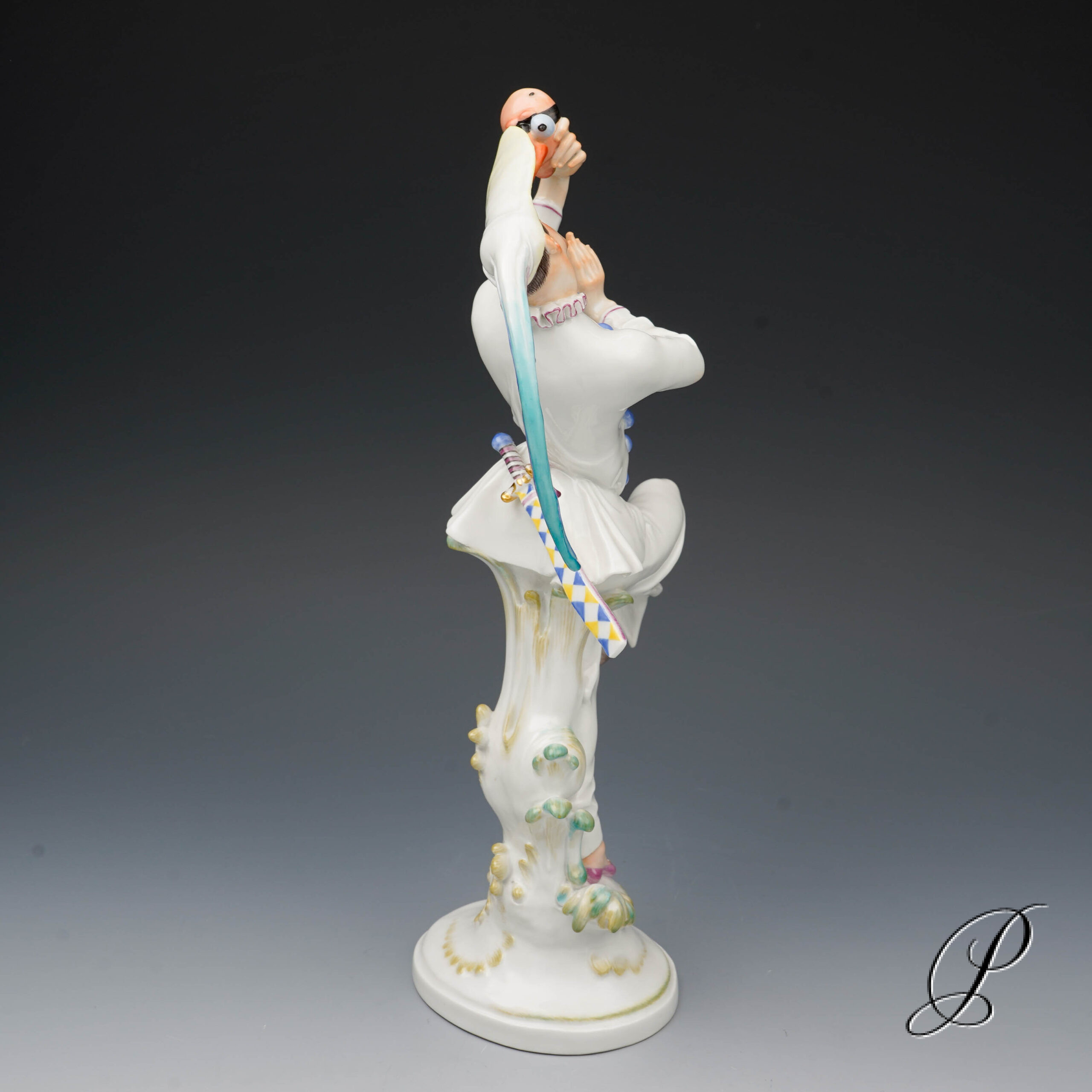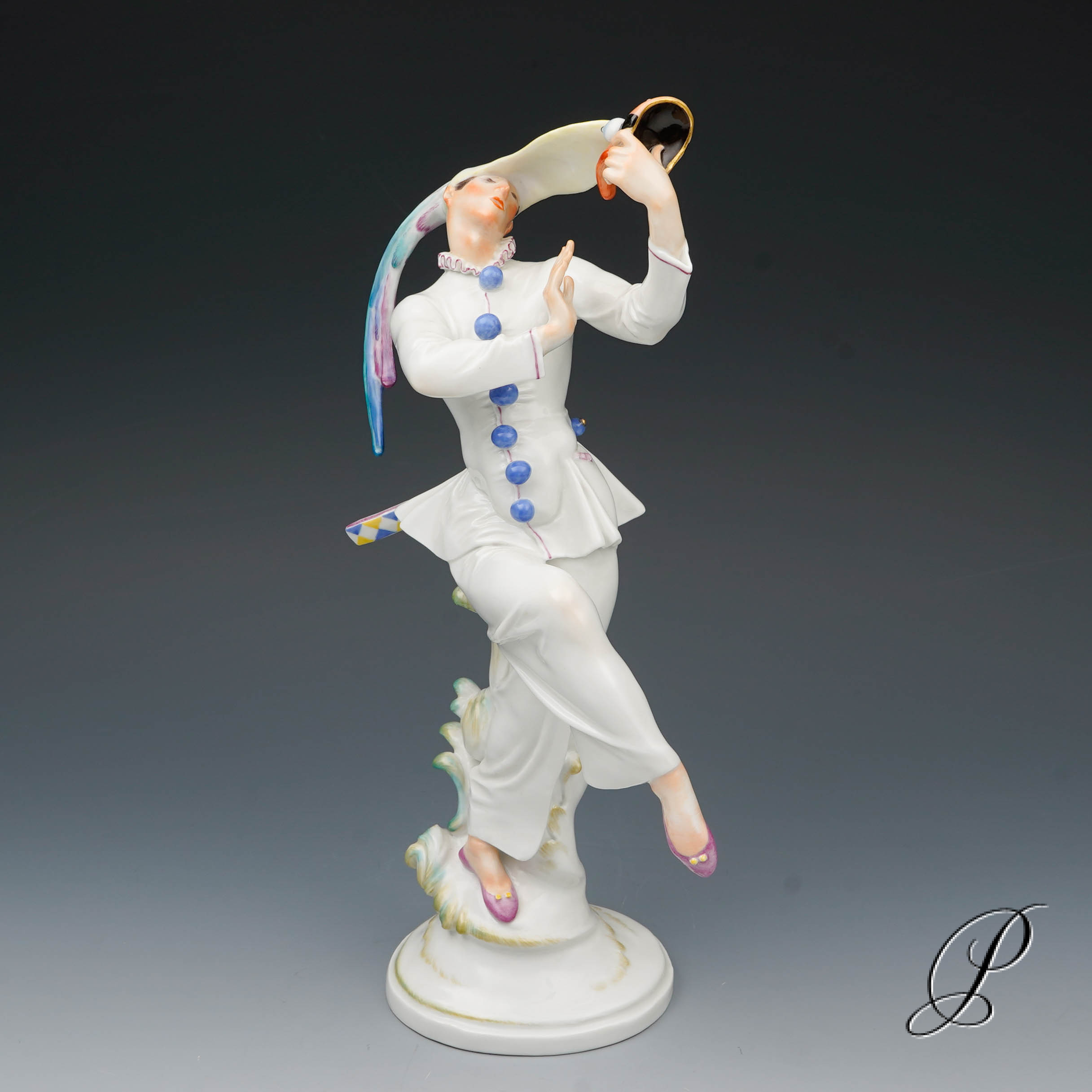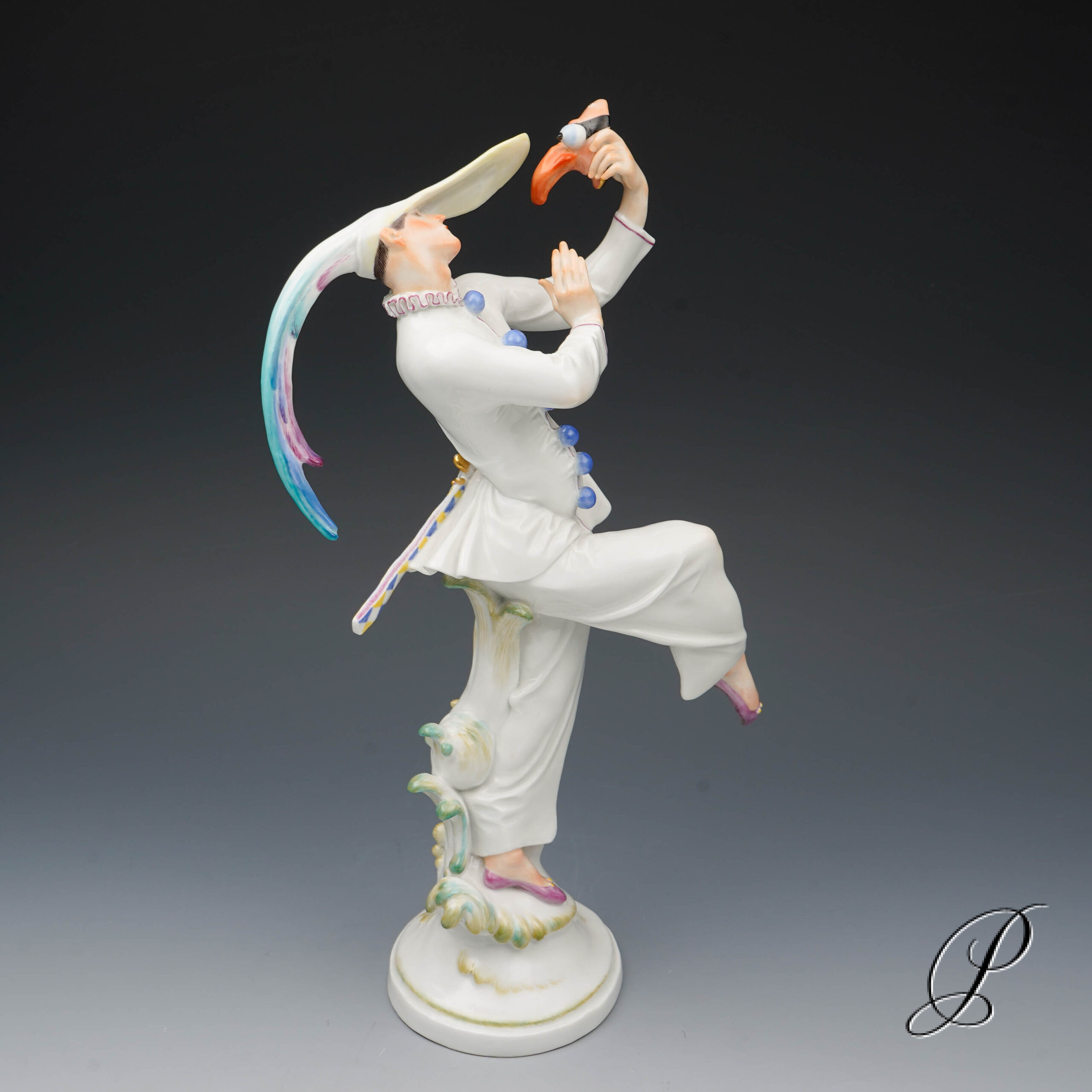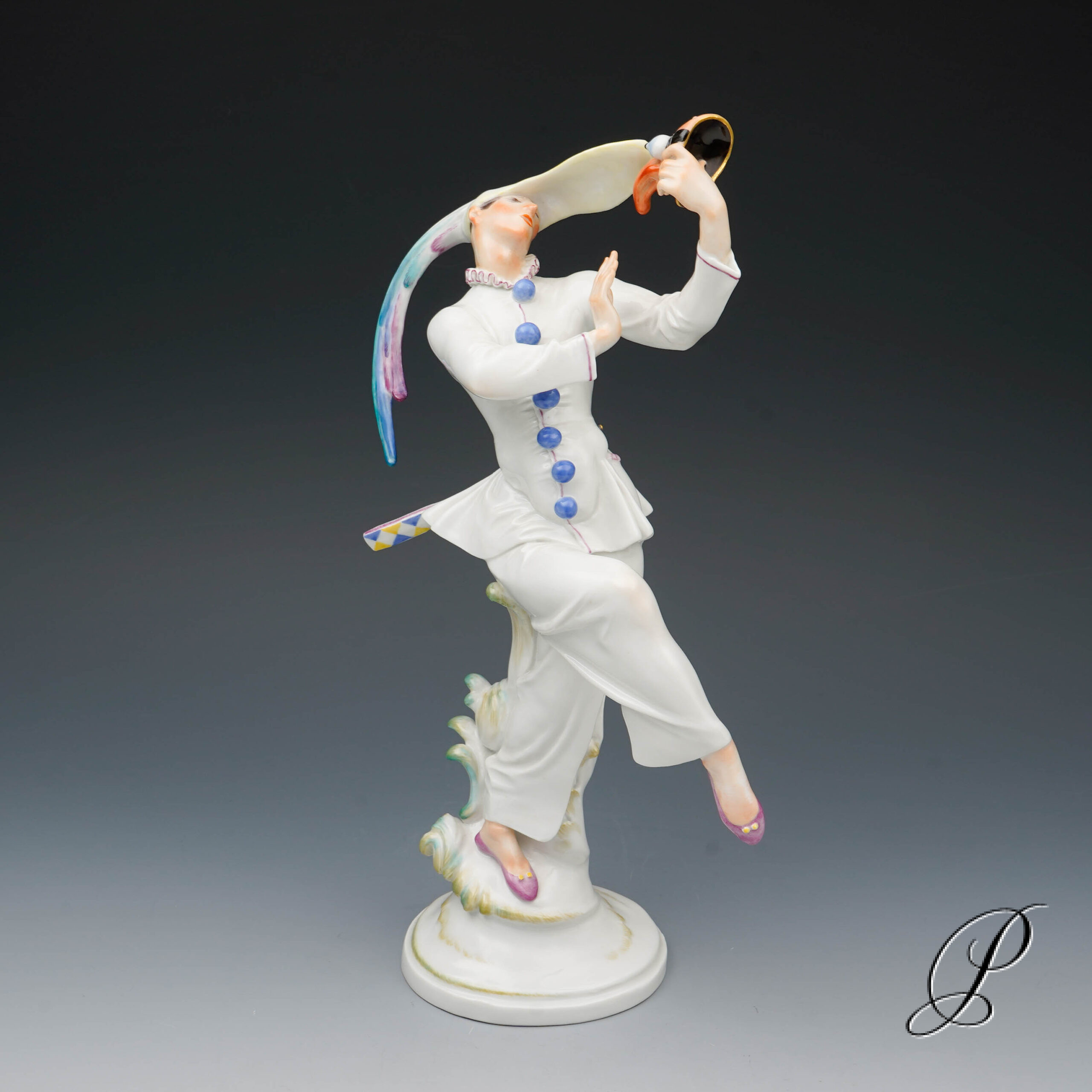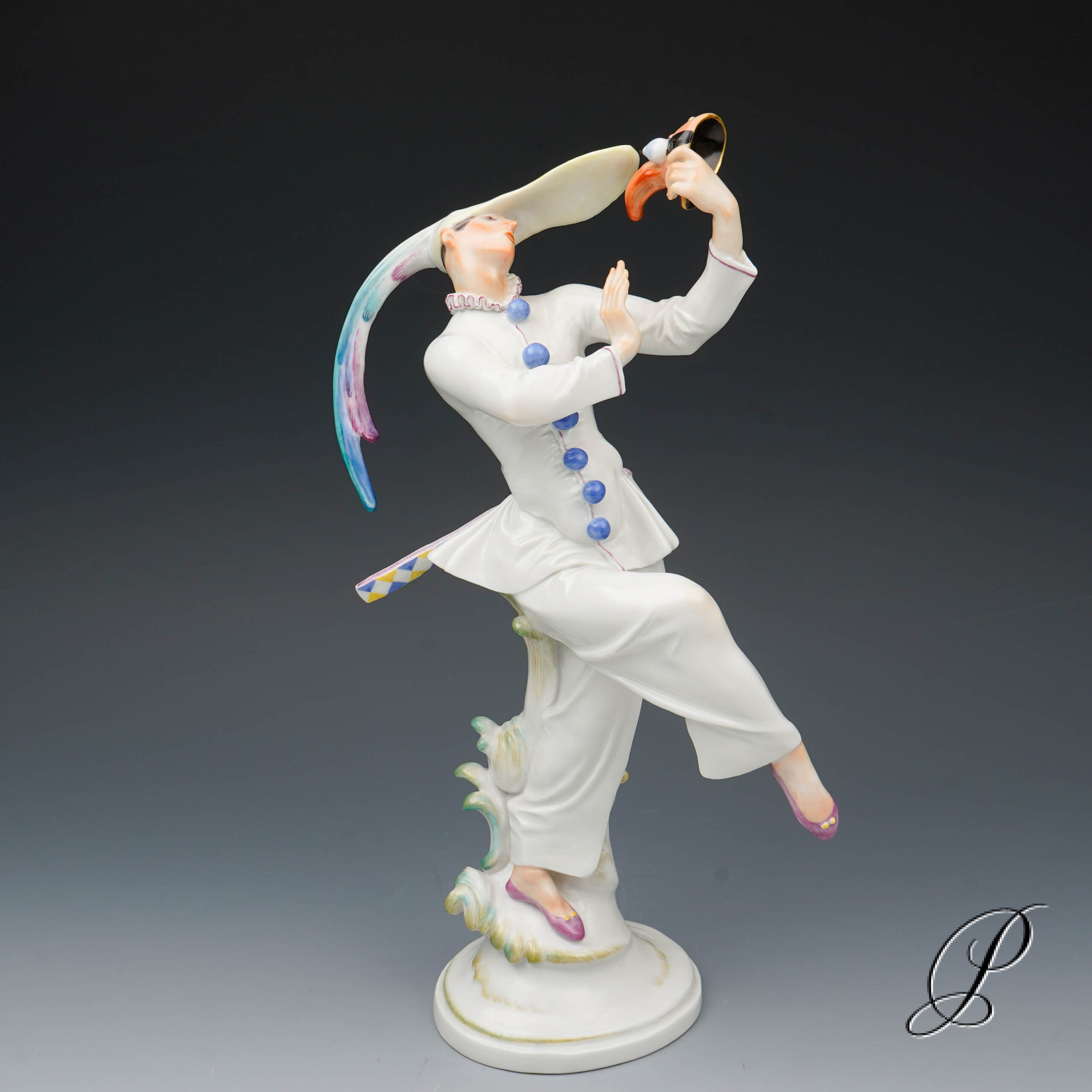 Der Tänzer in der schmalen Kappe mit extrem langen Schirm und Hahnenfedern, hat die Maske abgenommen und betrachtet sie im überlegener Miene. Ein grandioses Meisterwerk der Porzellankunst mit allseitig vollendeter Harmonie.