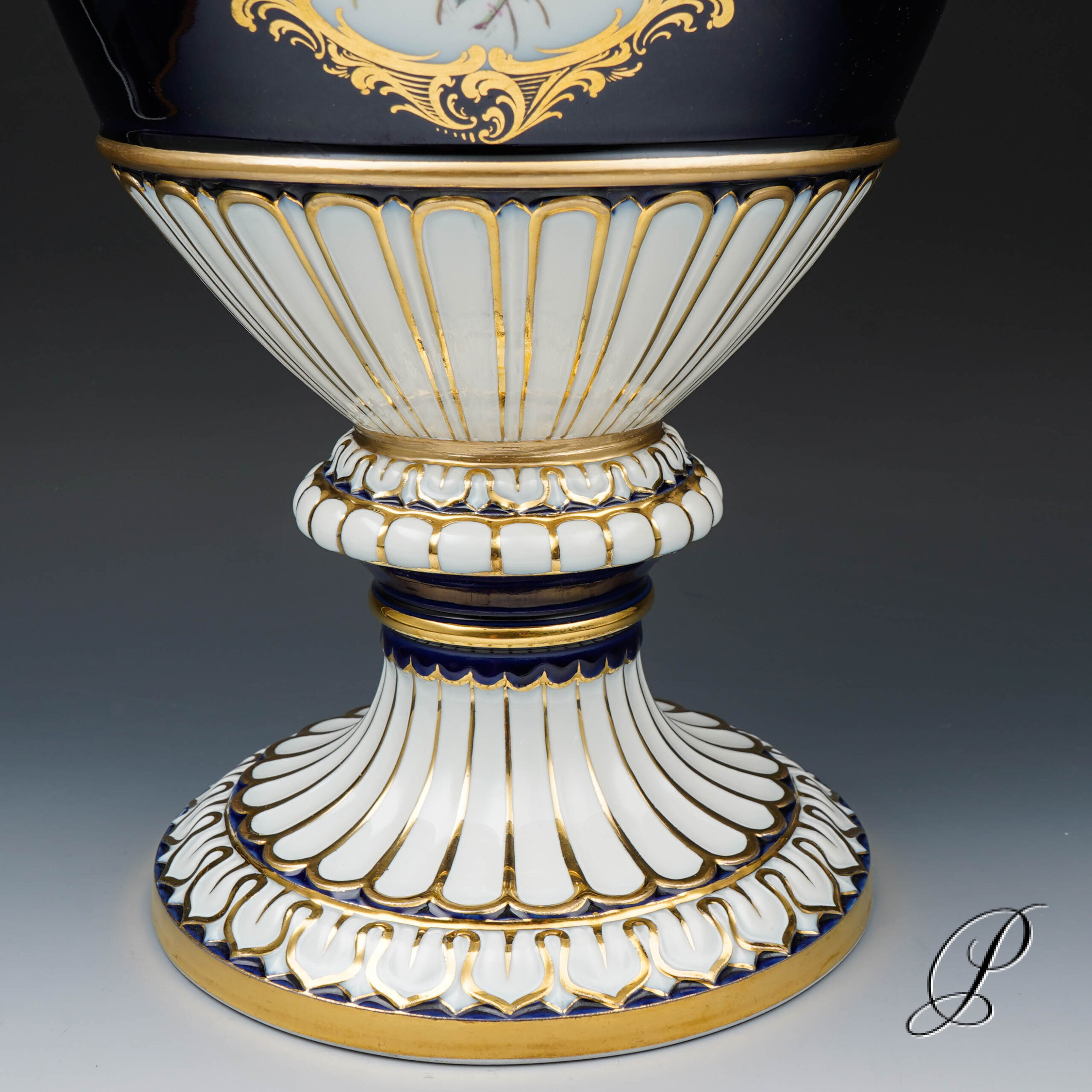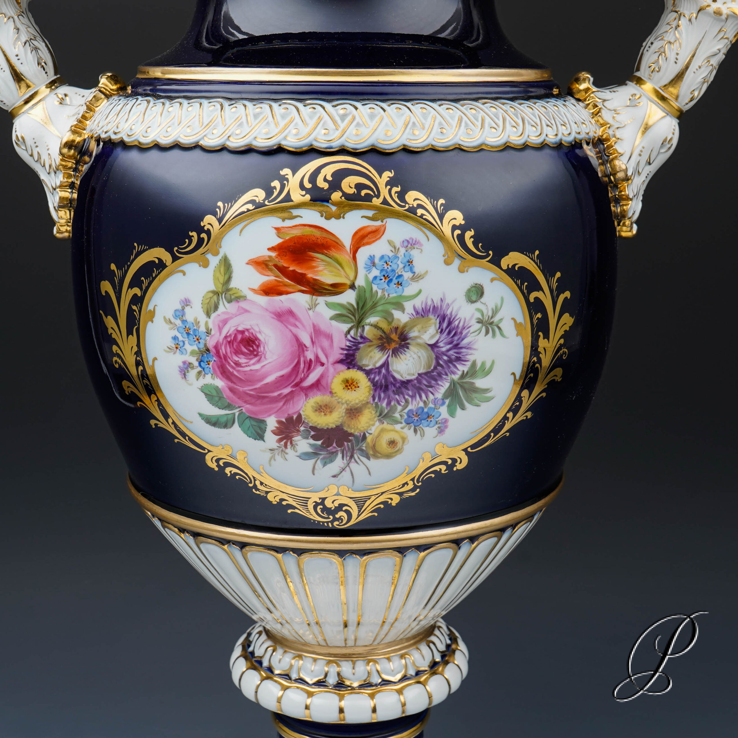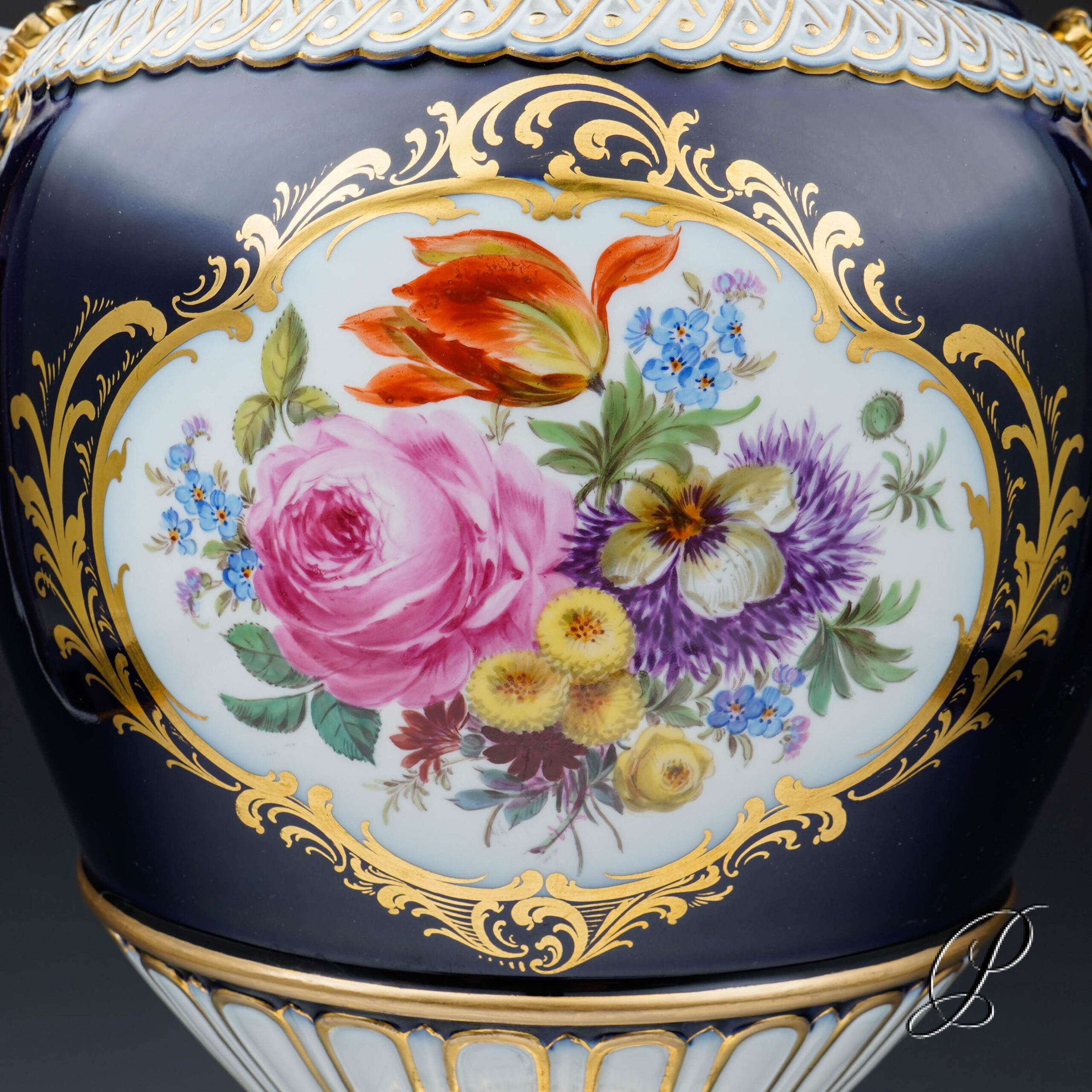 Üppiges Blumenbukett, bunt, königsblau glasiert, Schild mit Goldornamentikkante, Gold angespitzt.