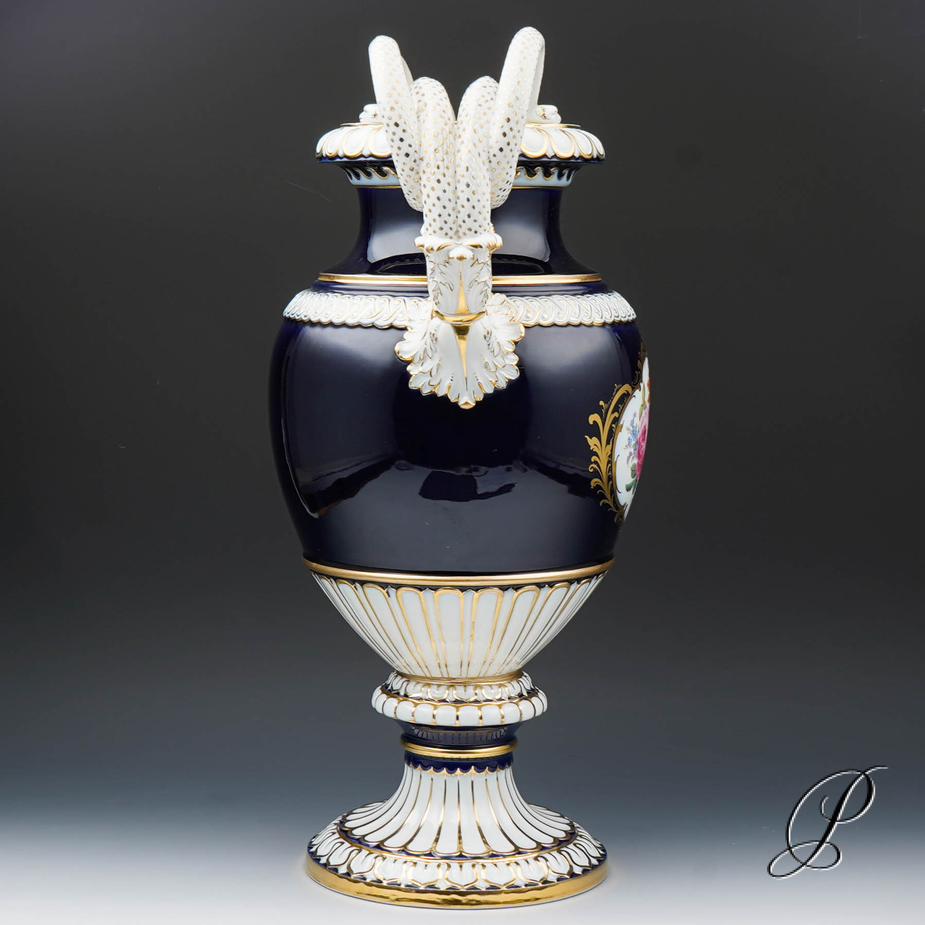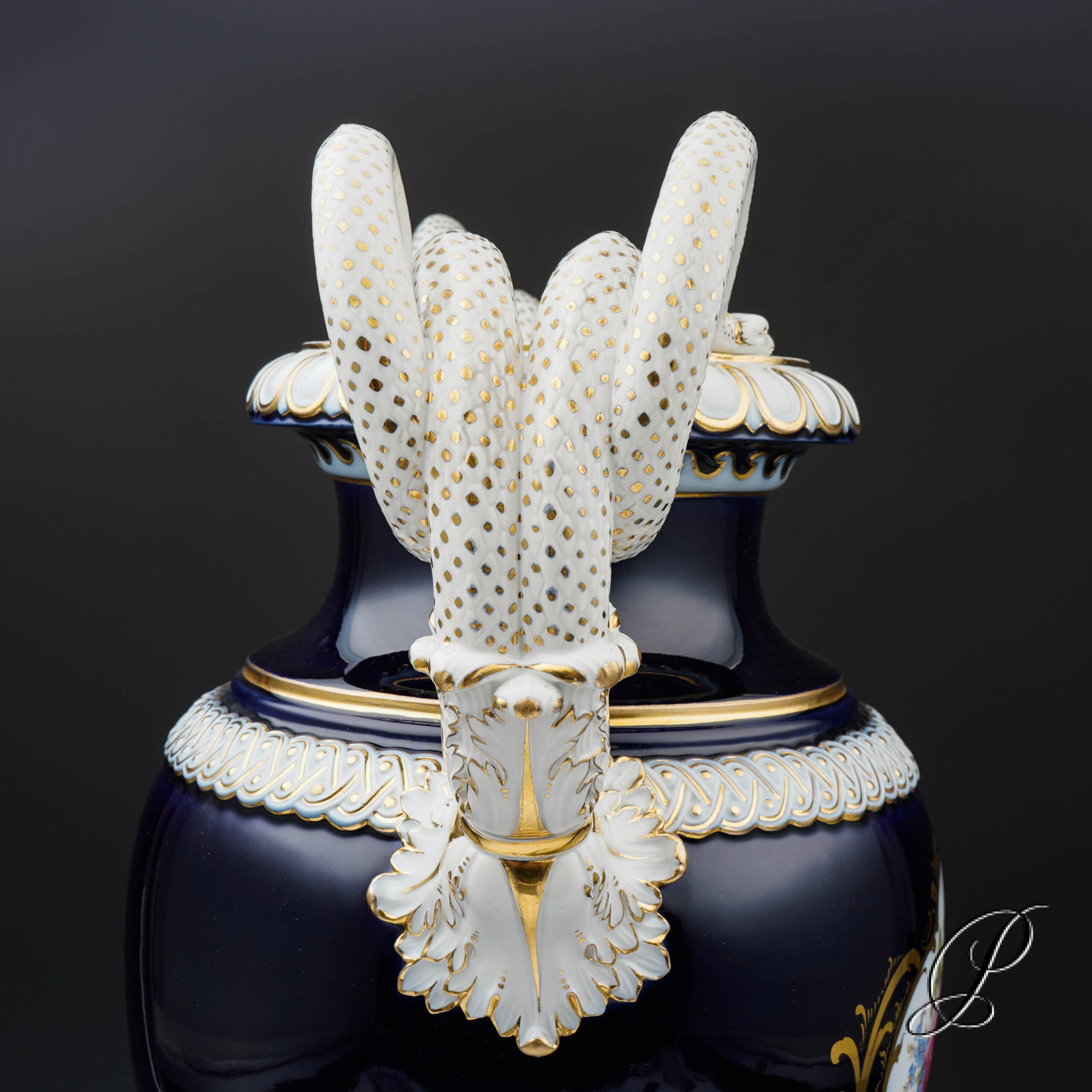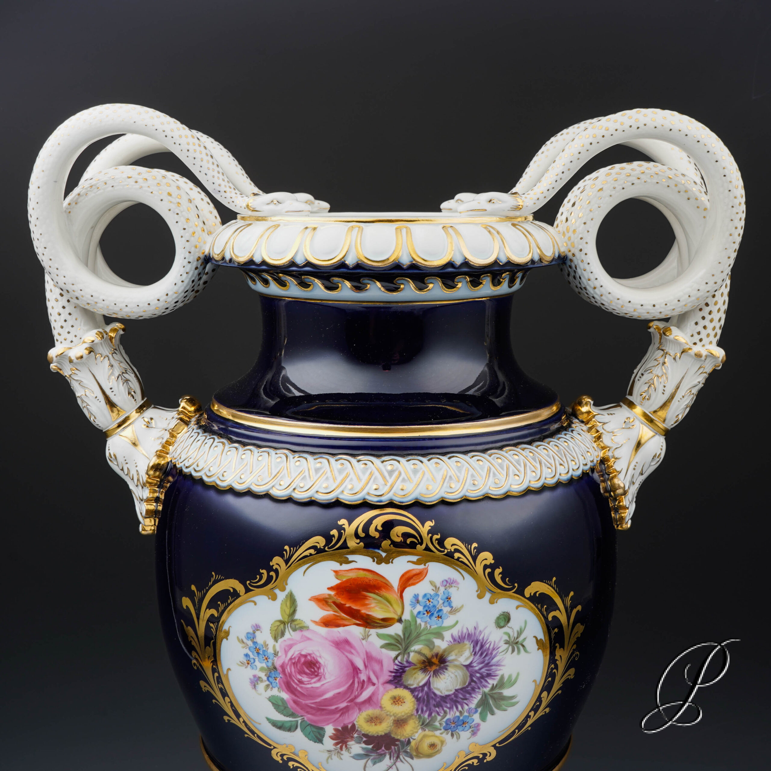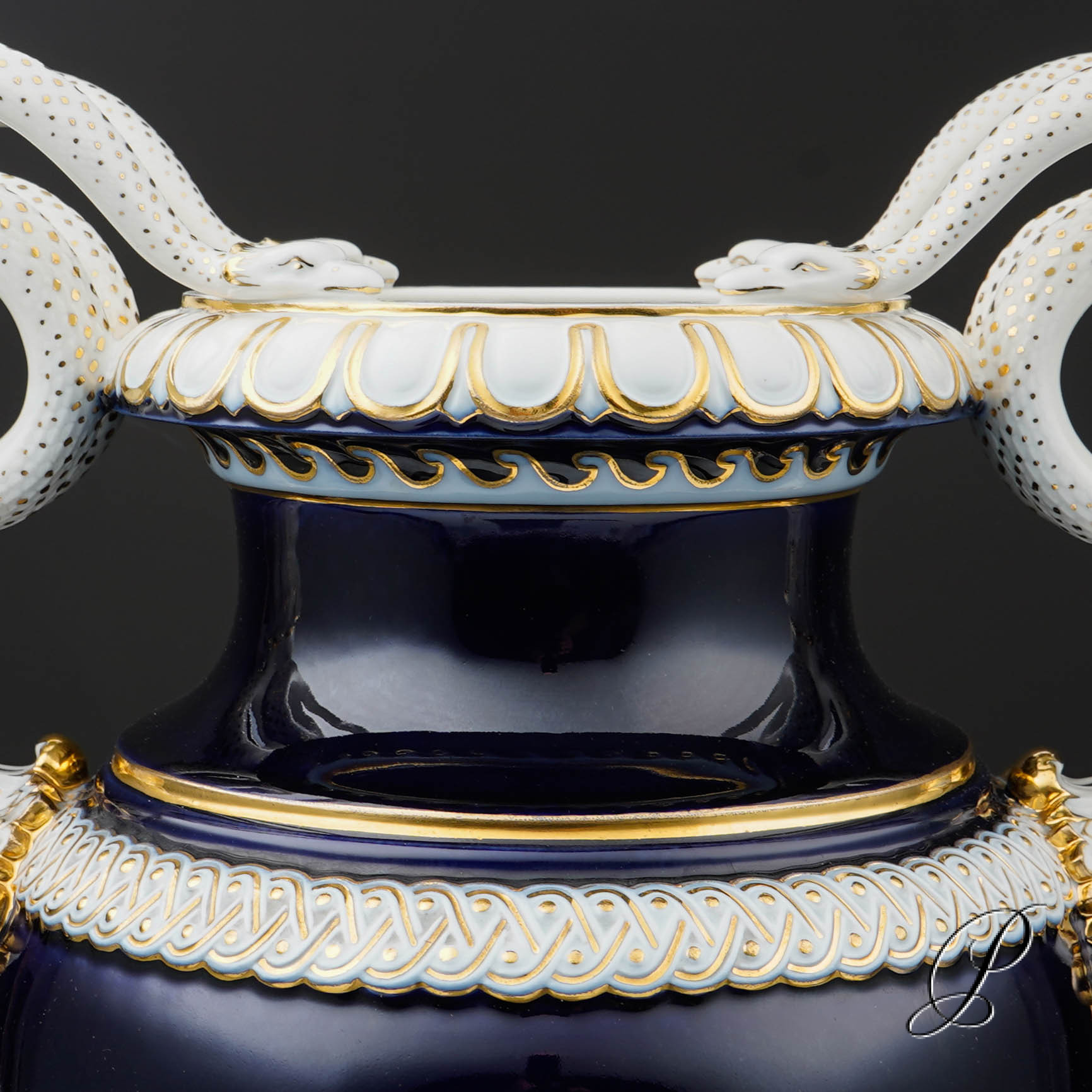 Die seitlichen Schlangenhenkel sind ein auffälliges und einzigartiges Merkmal dieser Vase. Sie unterstreichen die Einzigartigkeit und den kunstvollen Charakter dieses Stücks.