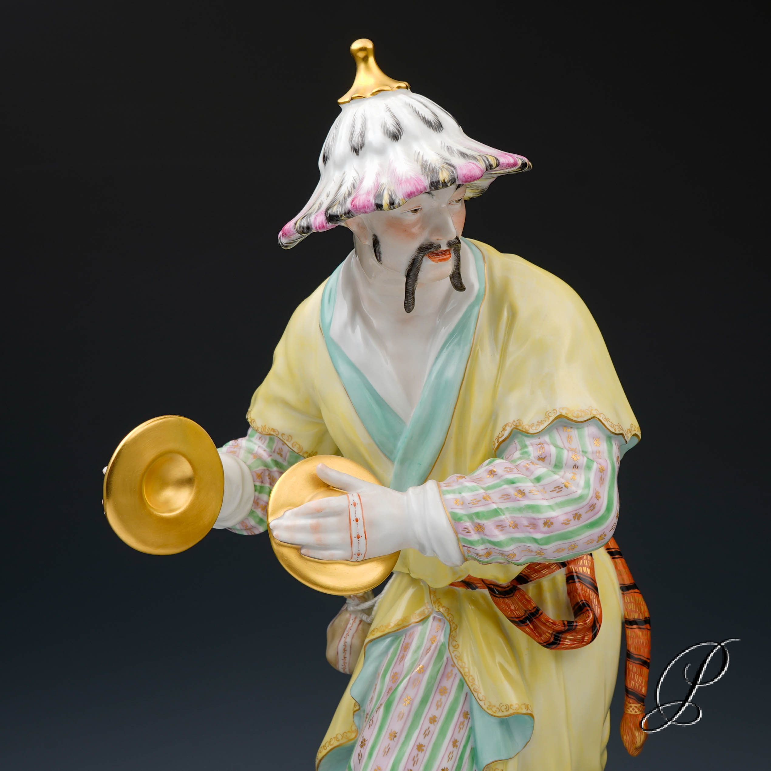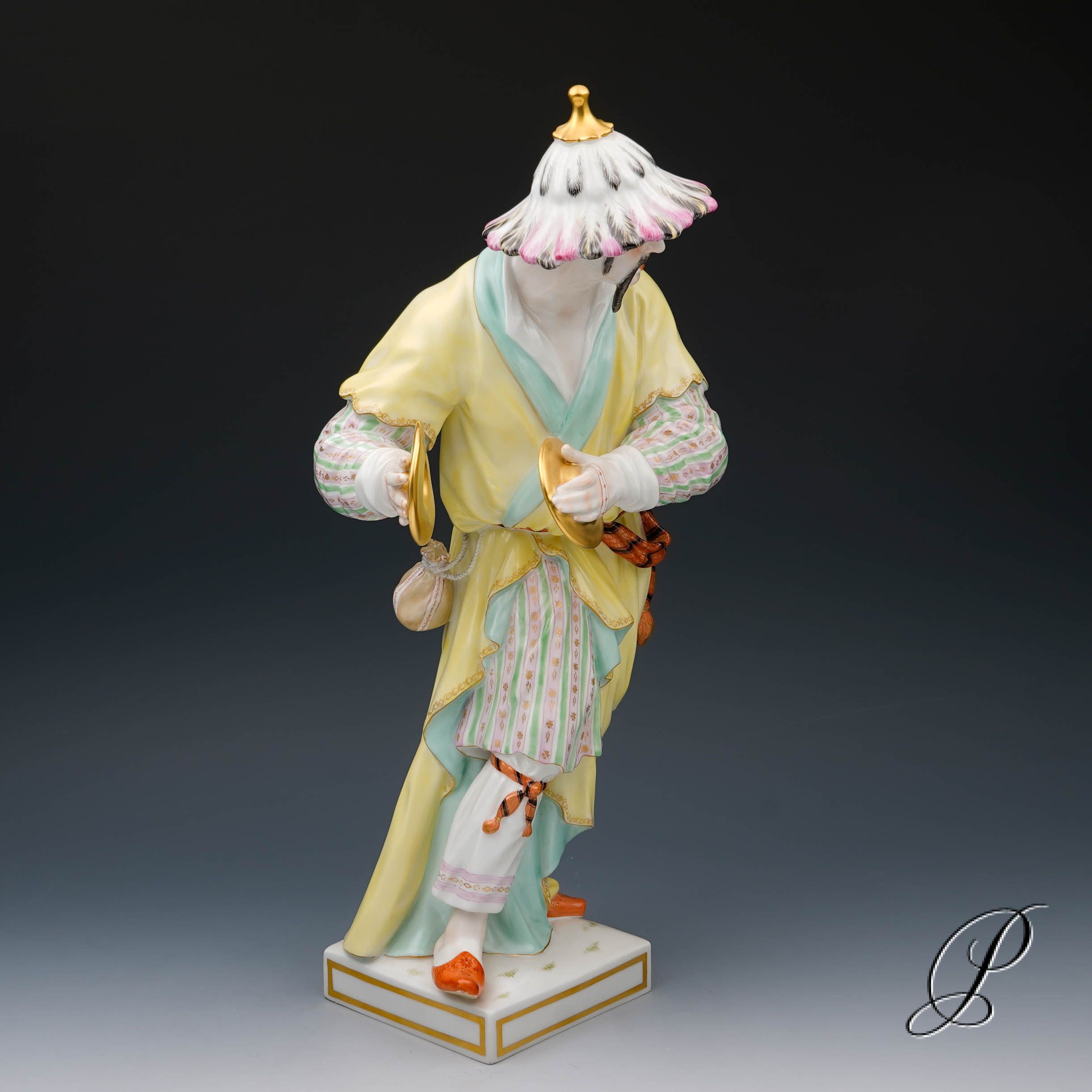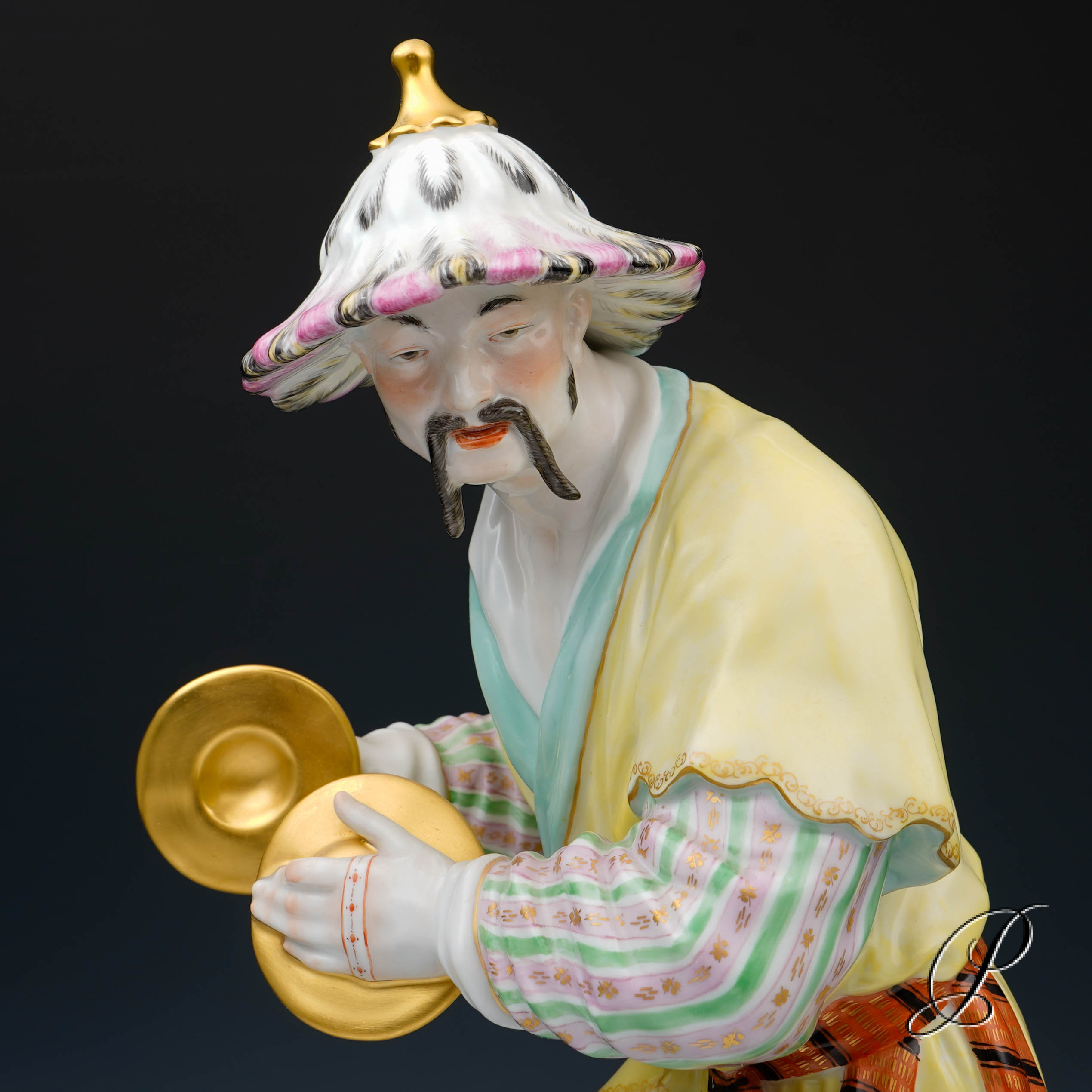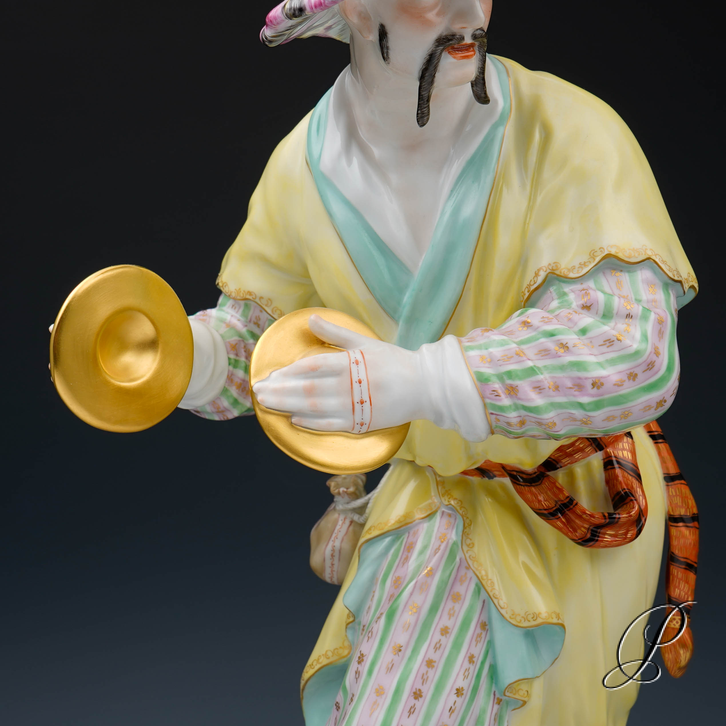 Auf einer quadratischen Plinthe stehender Malabar in traditioneller Kleidung, auf dem Kopf trägt er einen Federhut, in den Händen hält er Becken. Nach einem Entwurf von F. E. Meyer aus dem Jahr 1777.