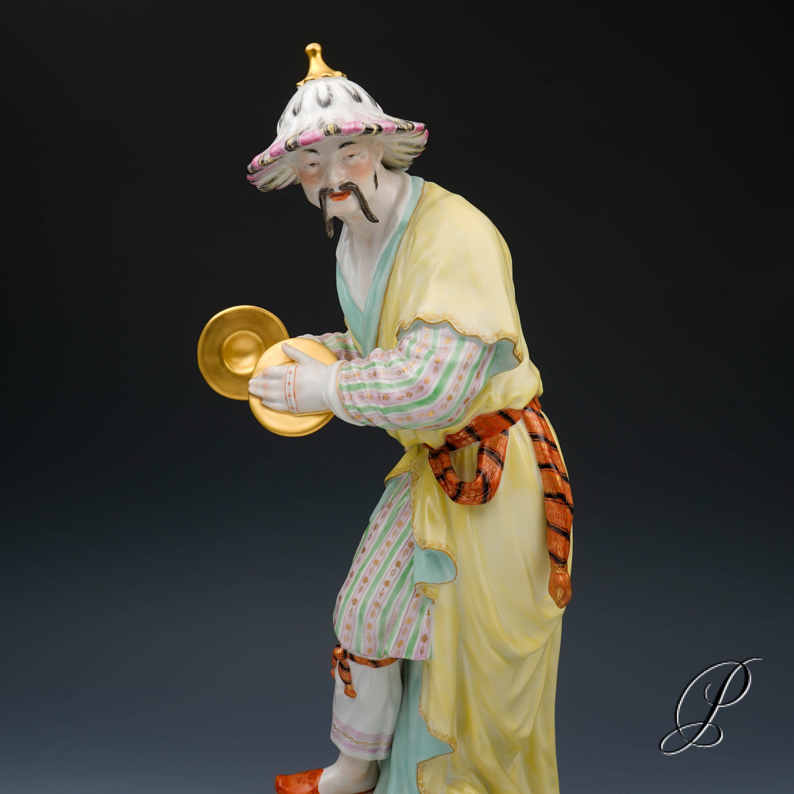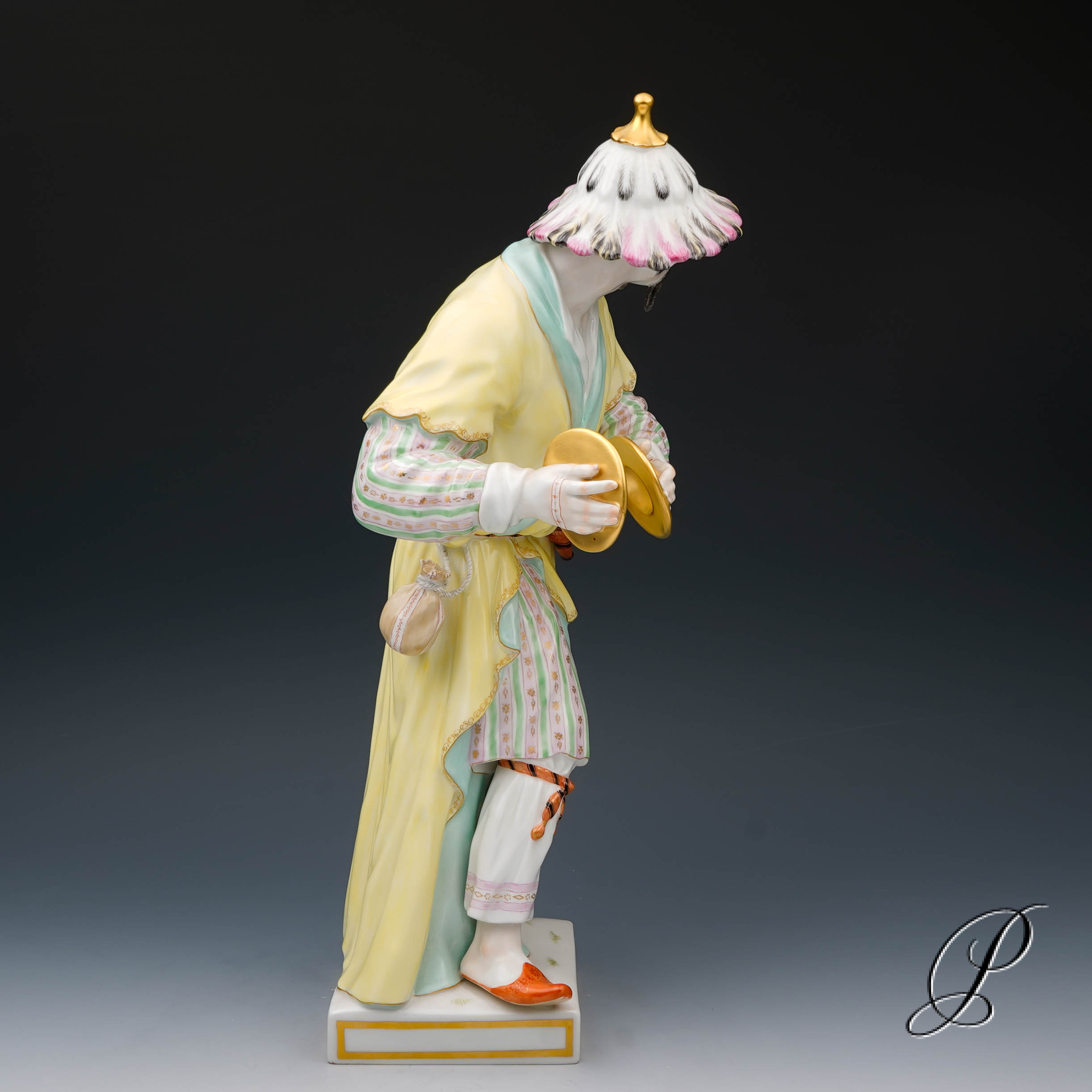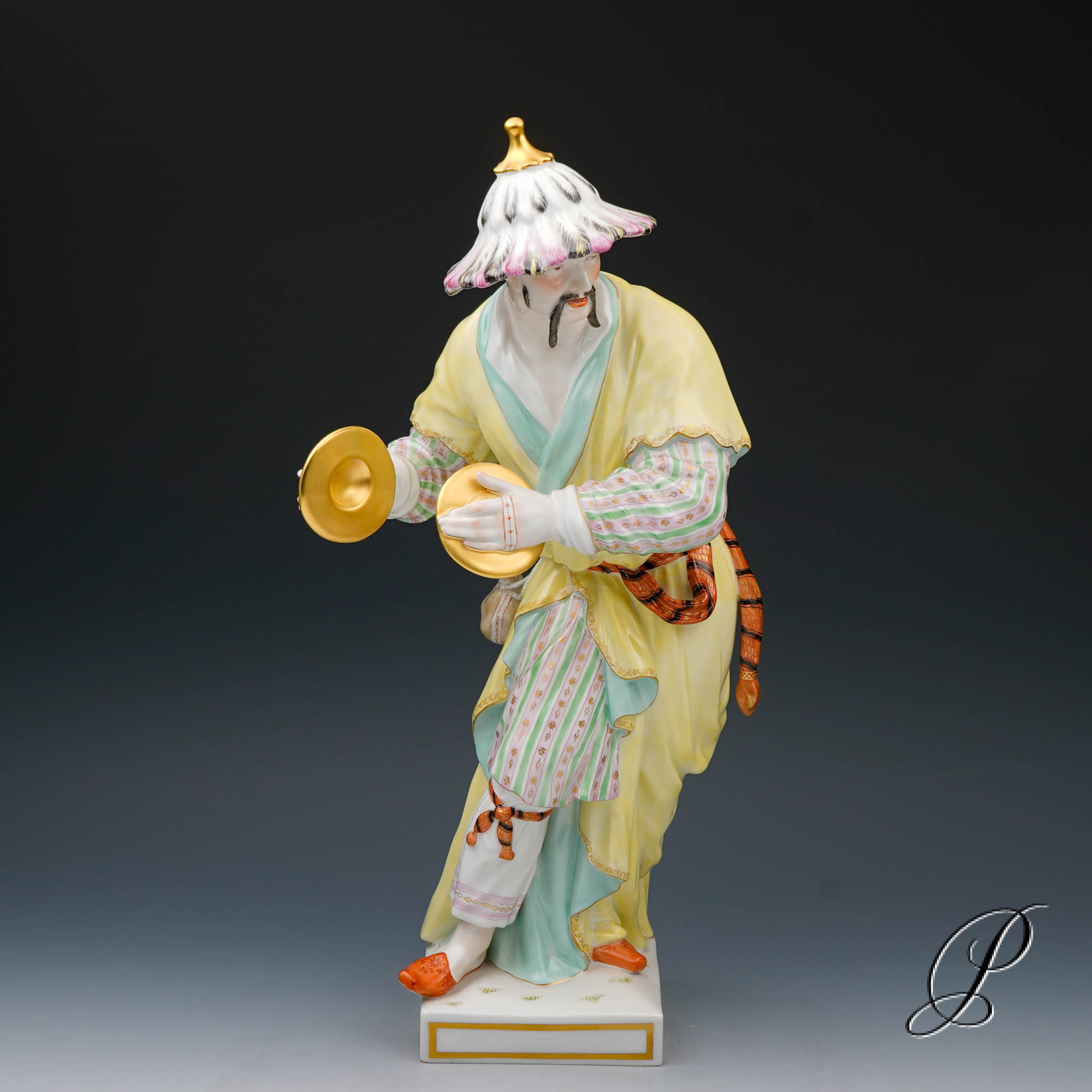 Auf einer quadratischen Plinthe stehender Malabar in traditioneller Kleidung, auf dem Kopf trägt er einen Federhut, in den Händen hält er Becken. Nach einem Entwurf von F. E. Meyer aus dem Jahr 1777.