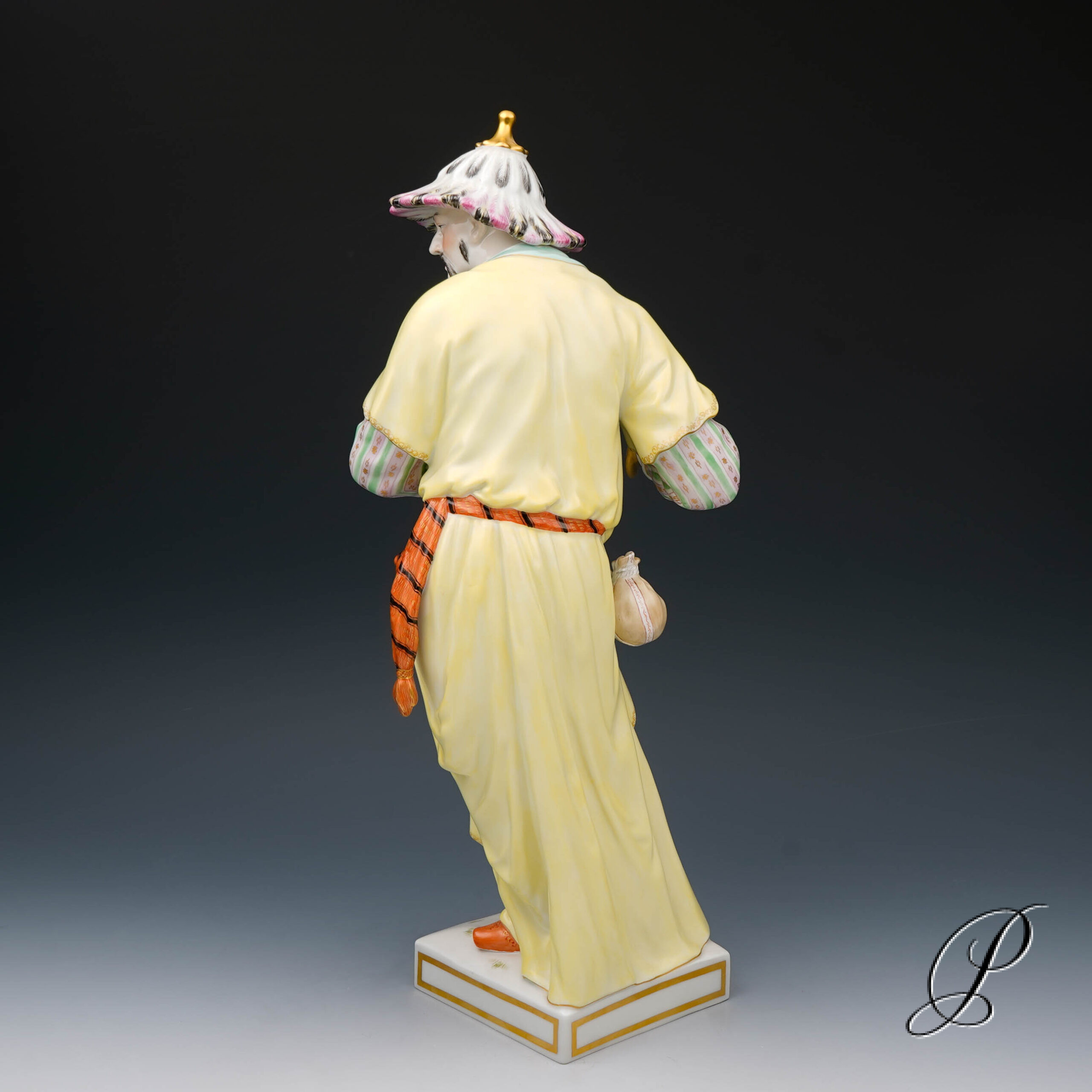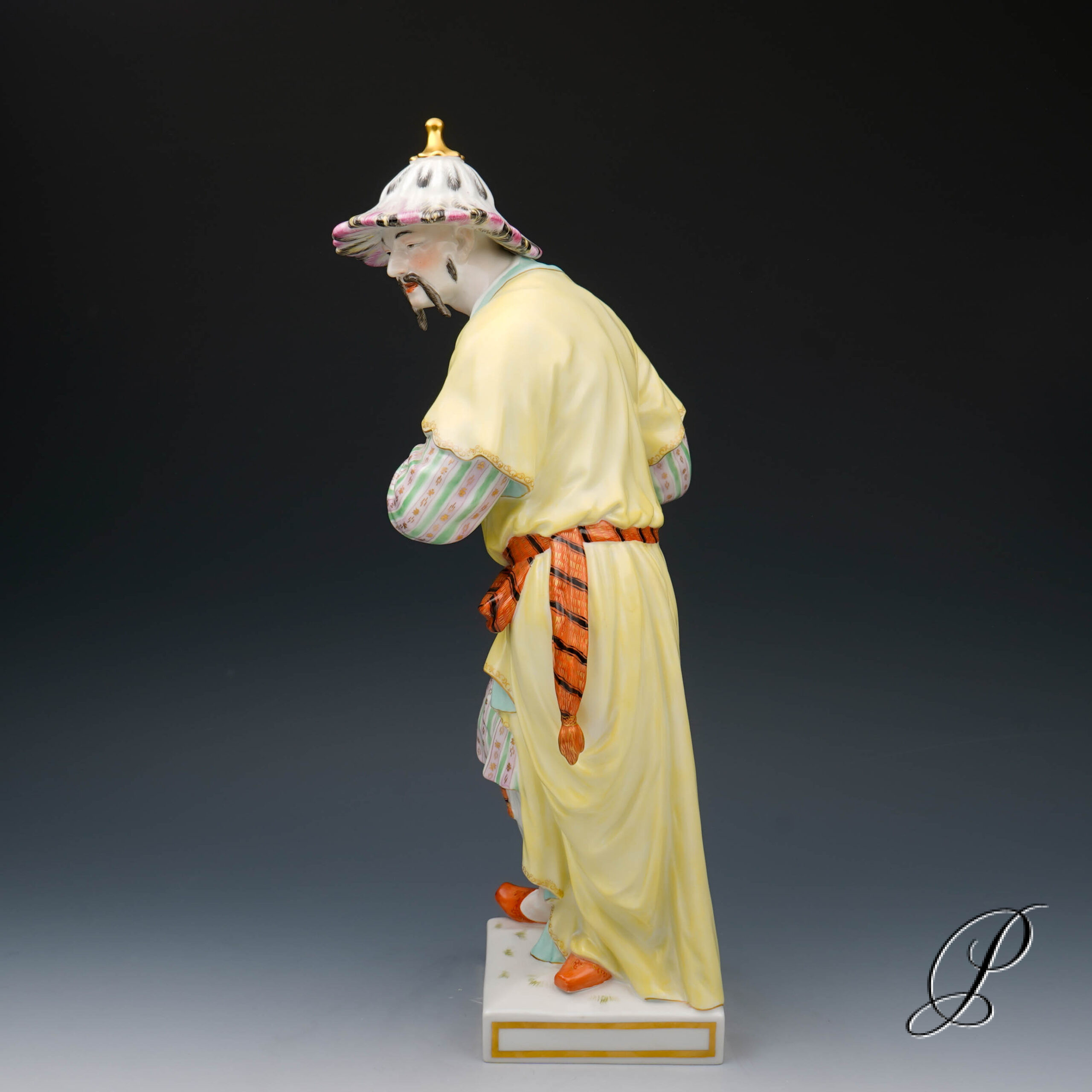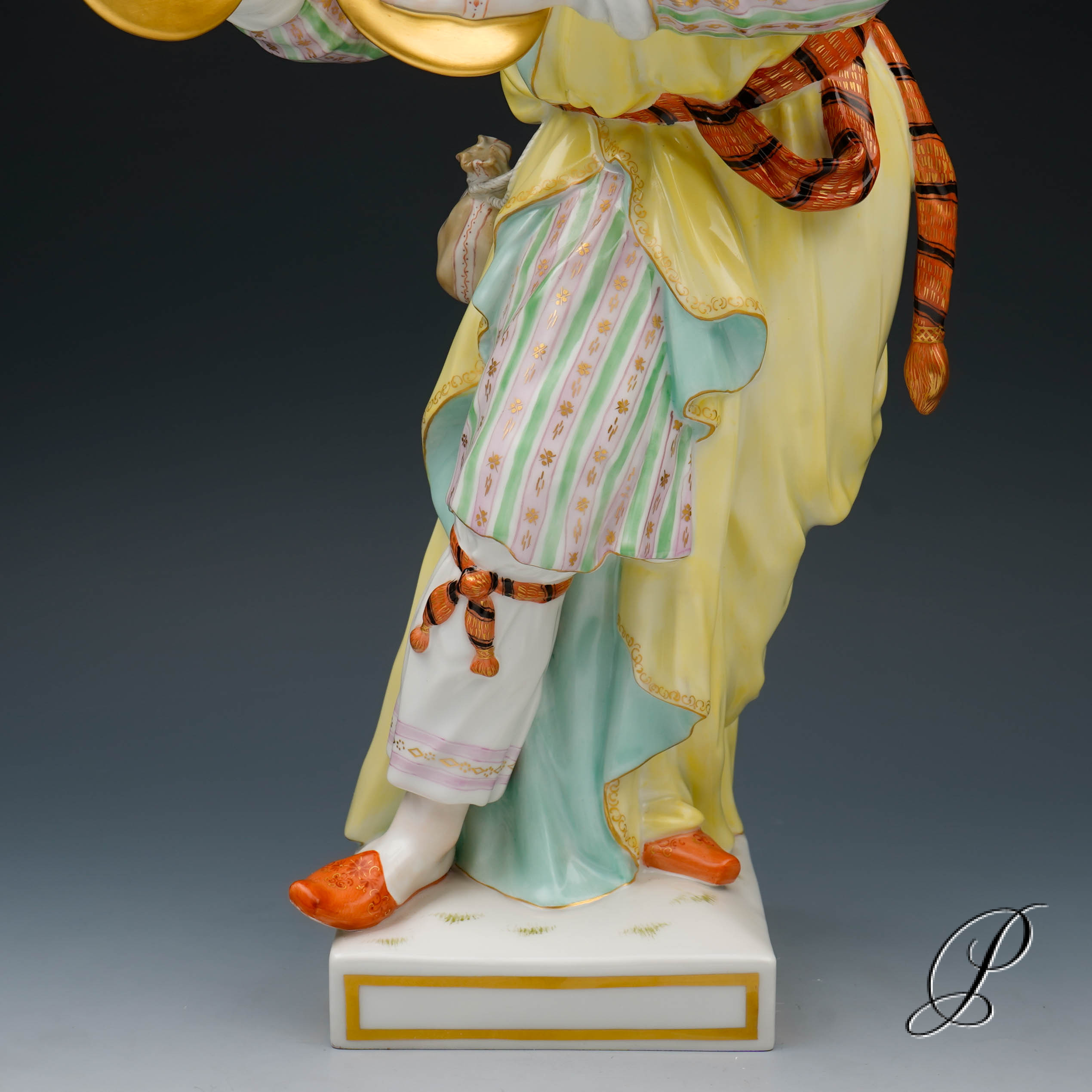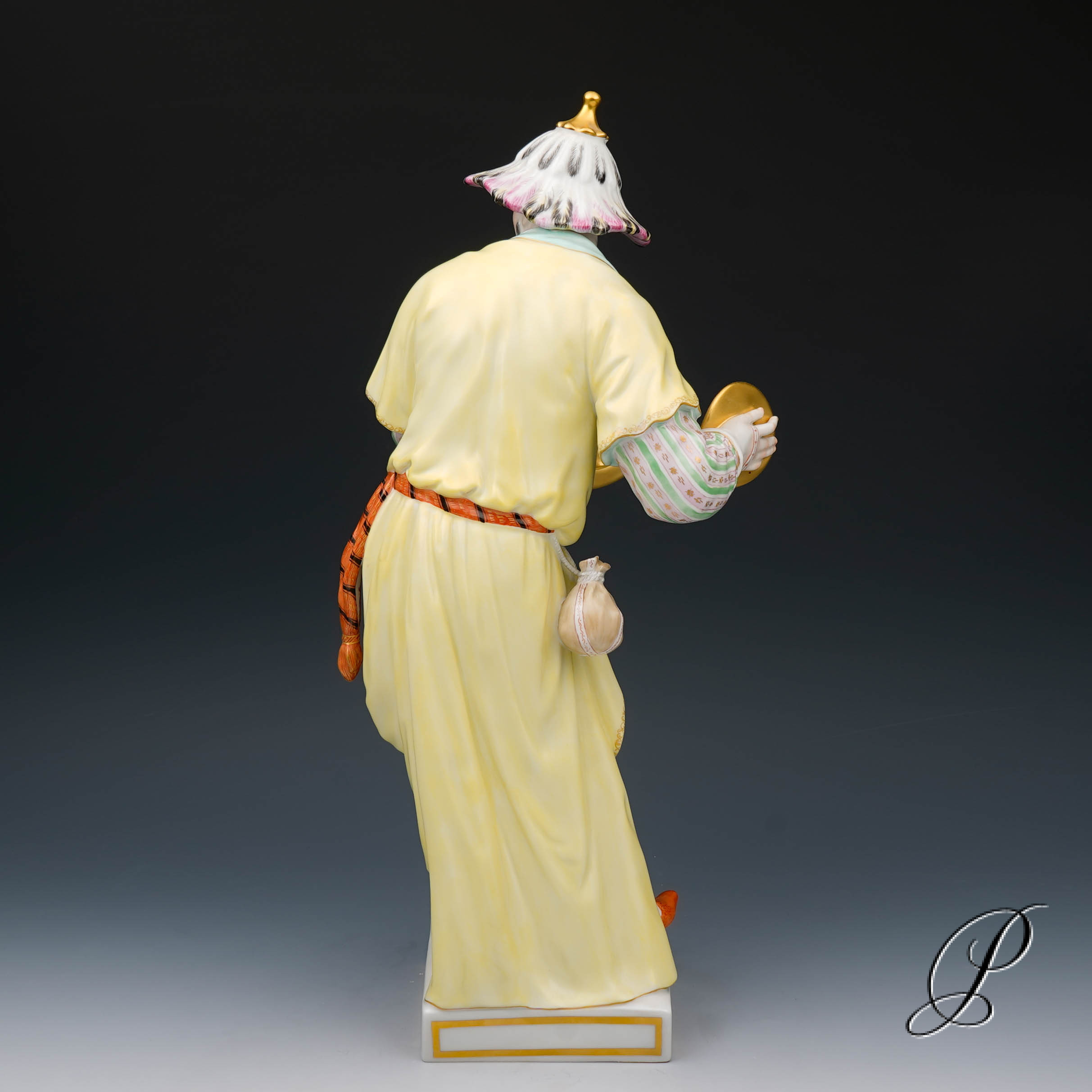 Auf einer quadratischen Plinthe stehender Malabar in traditioneller Kleidung, auf dem Kopf trägt er einen Federhut, in den Händen hält er Becken. Nach einem Entwurf von F. E. Meyer aus dem Jahr 1777.