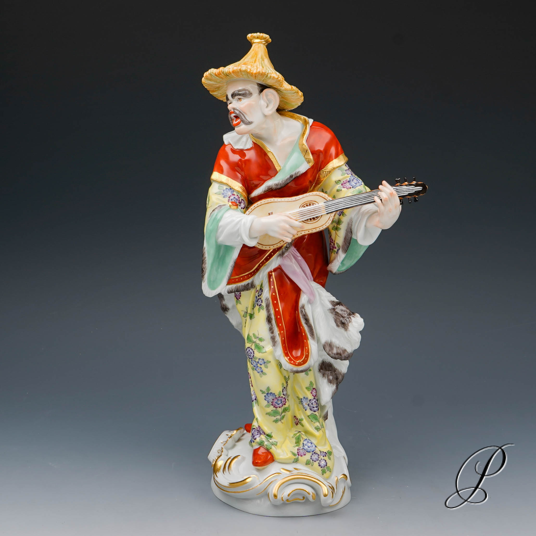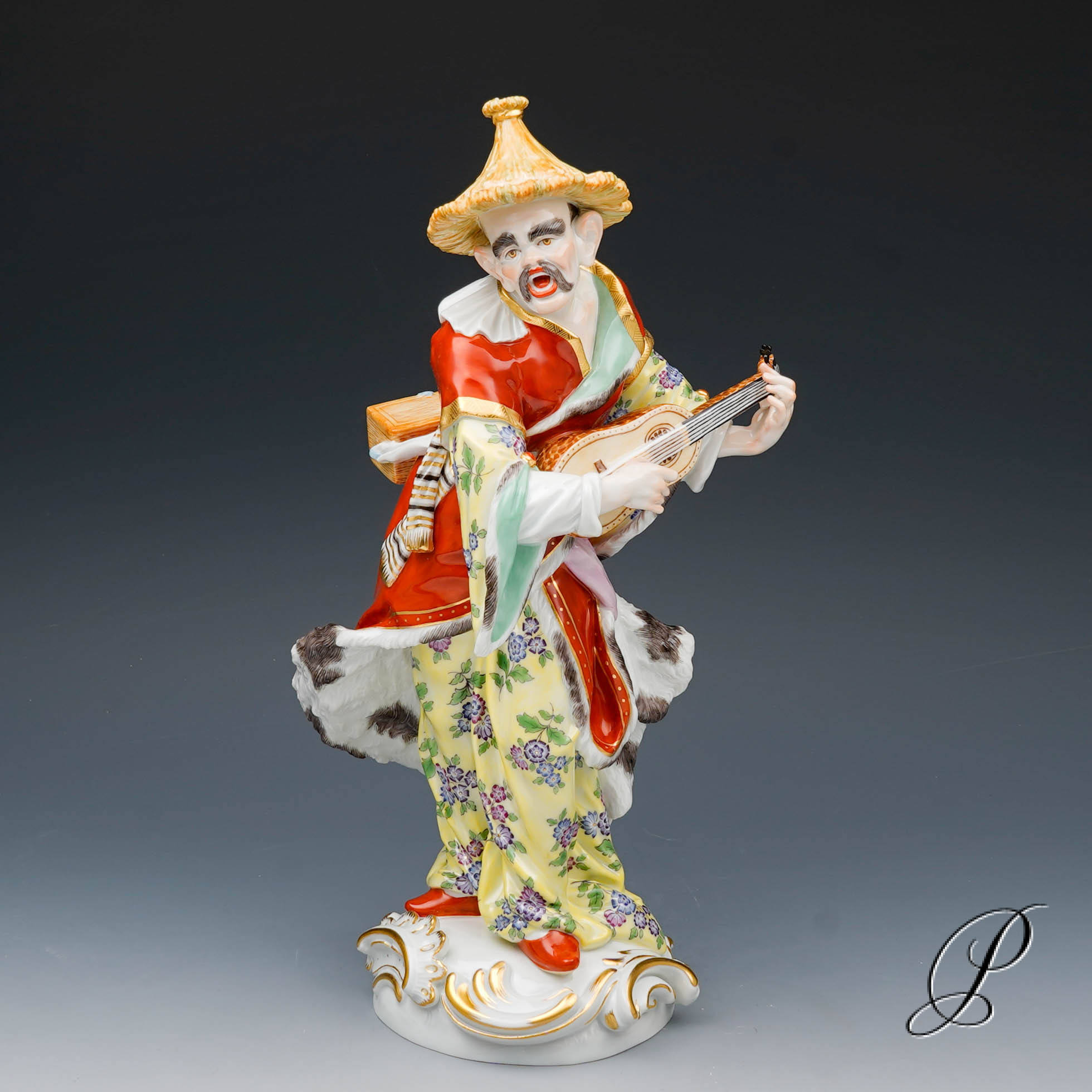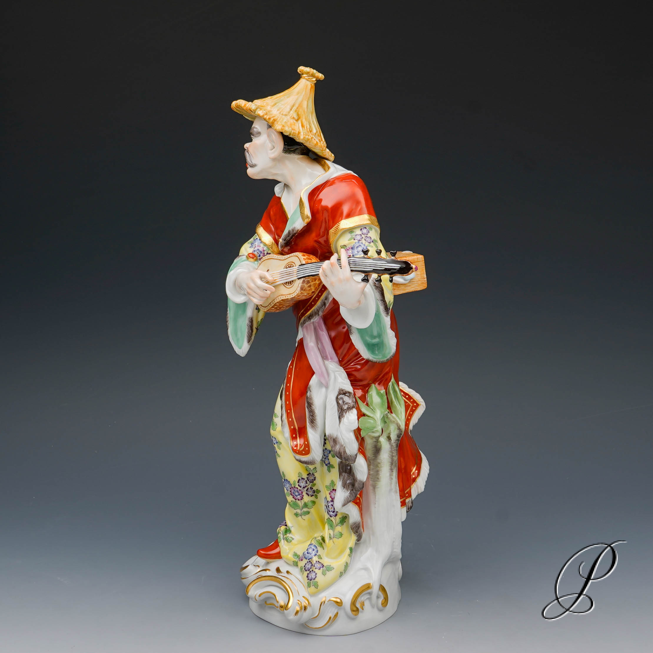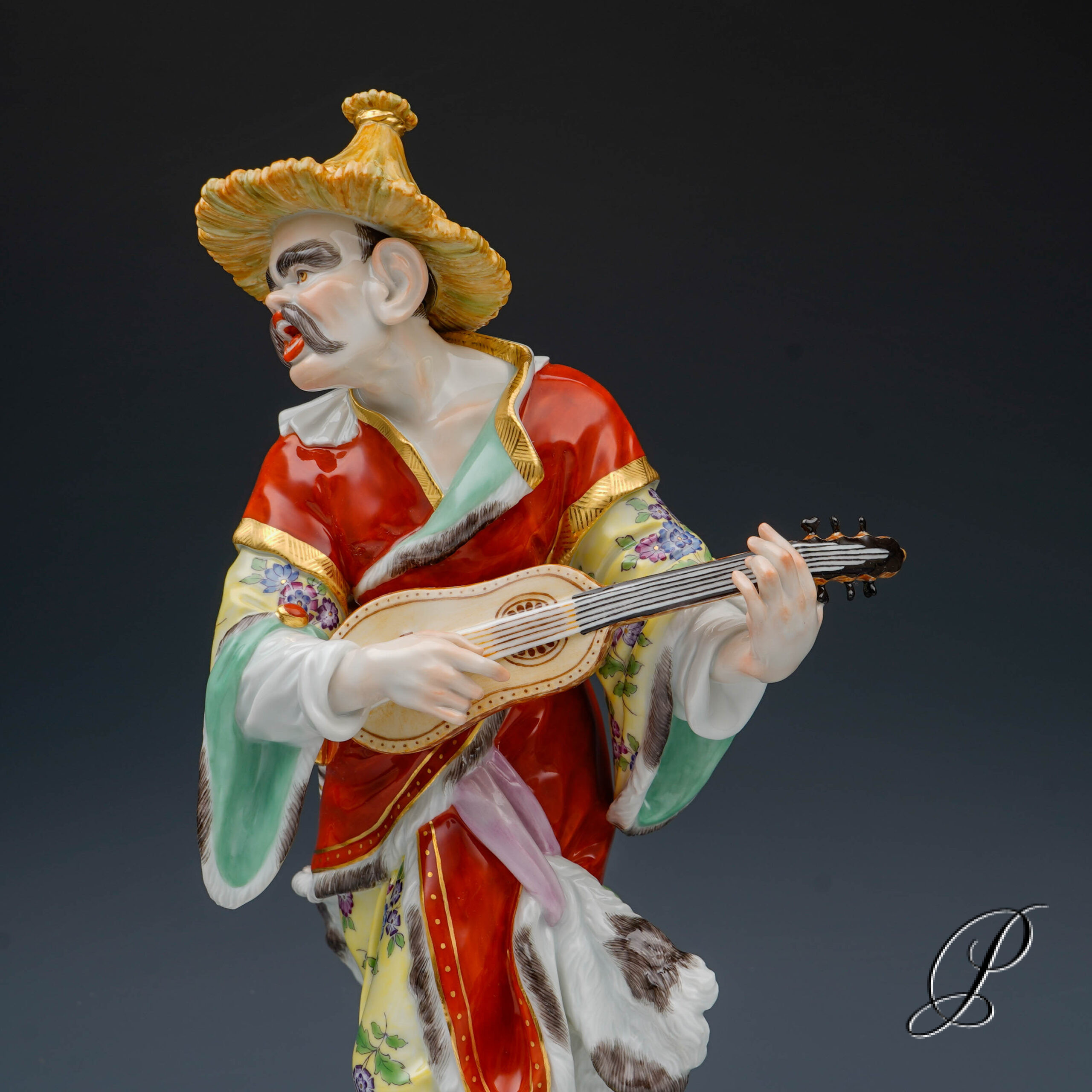 Hier aus dem Hause Meissen ein auf einem Rocaillensockel stehender Malabar in langen Gewand mit Gitarre.