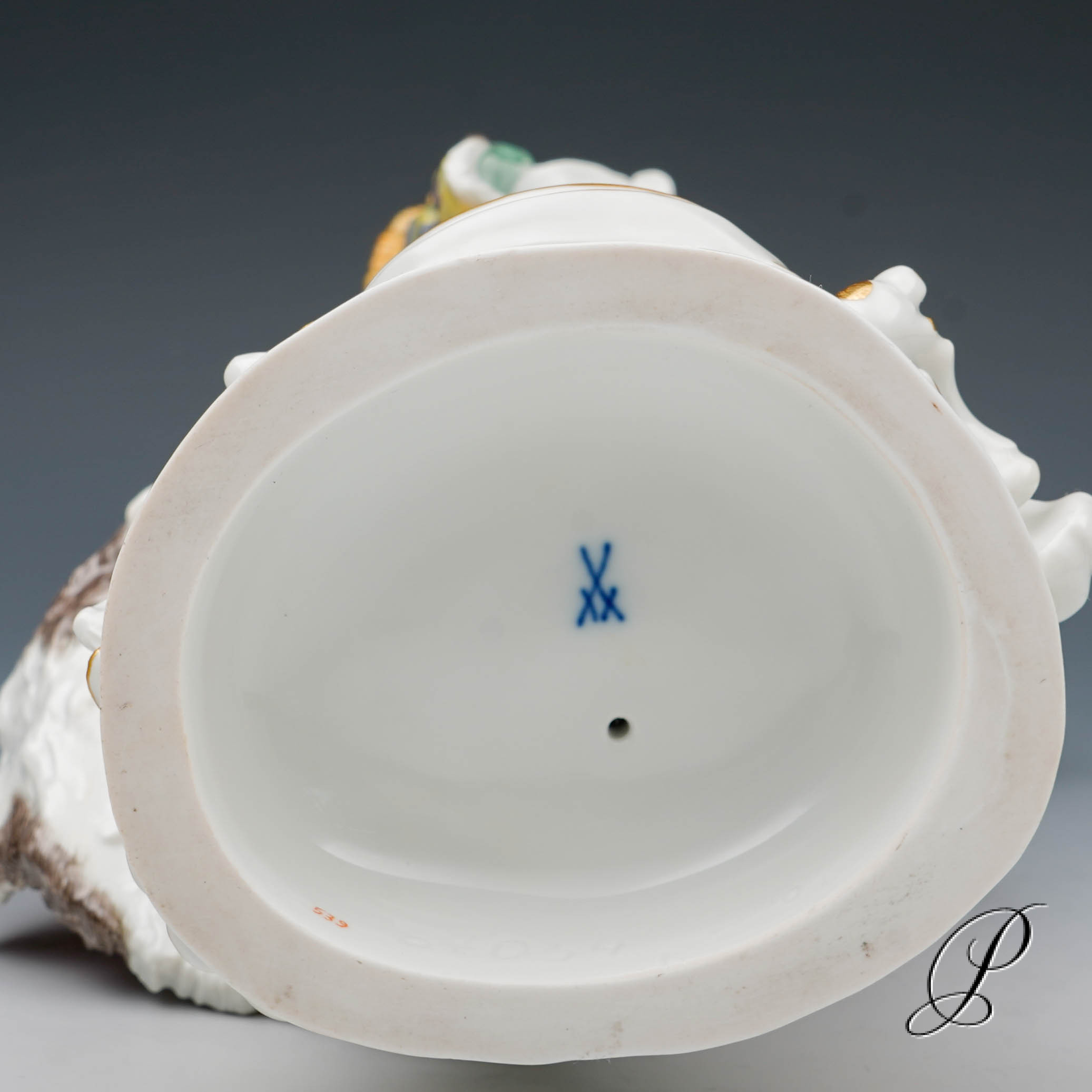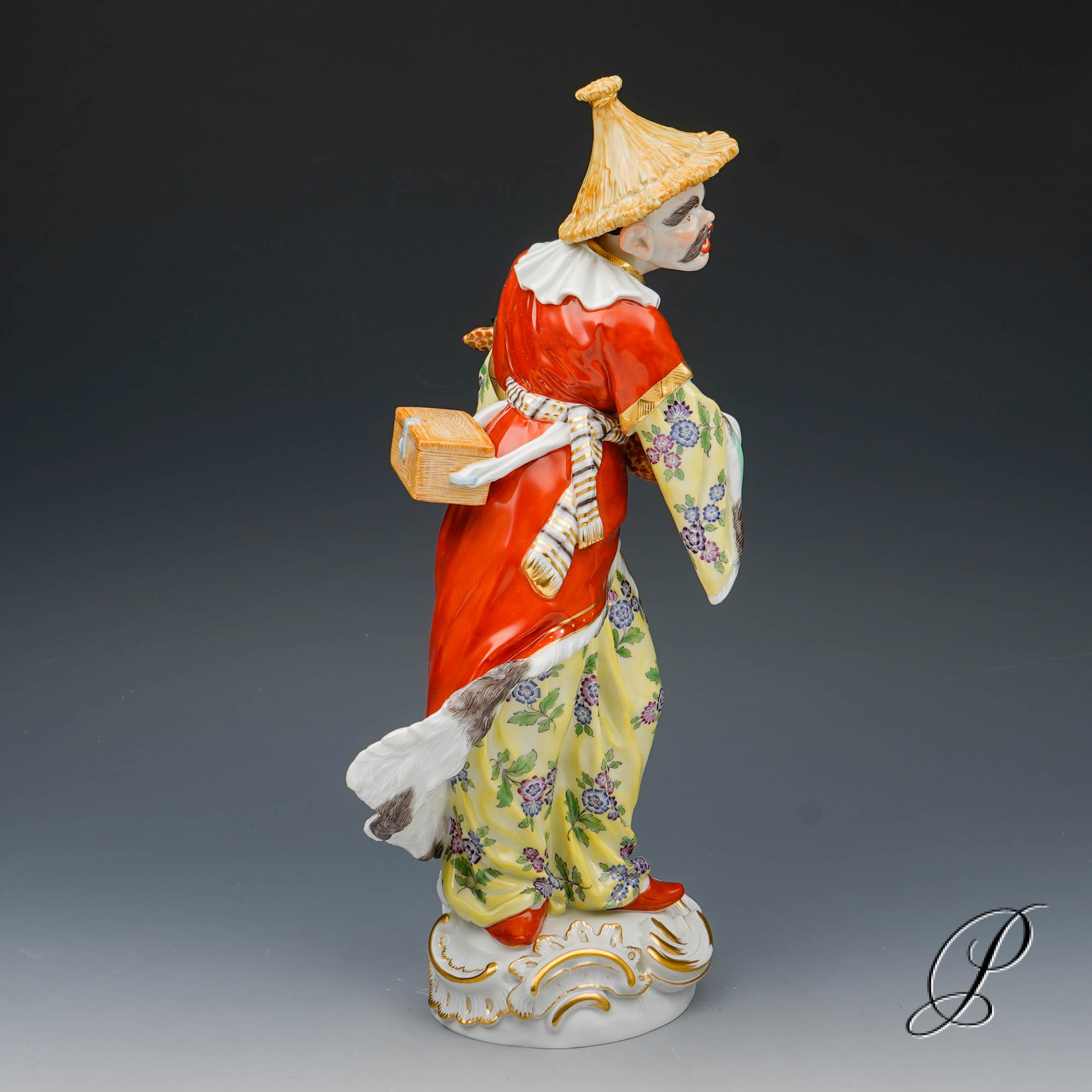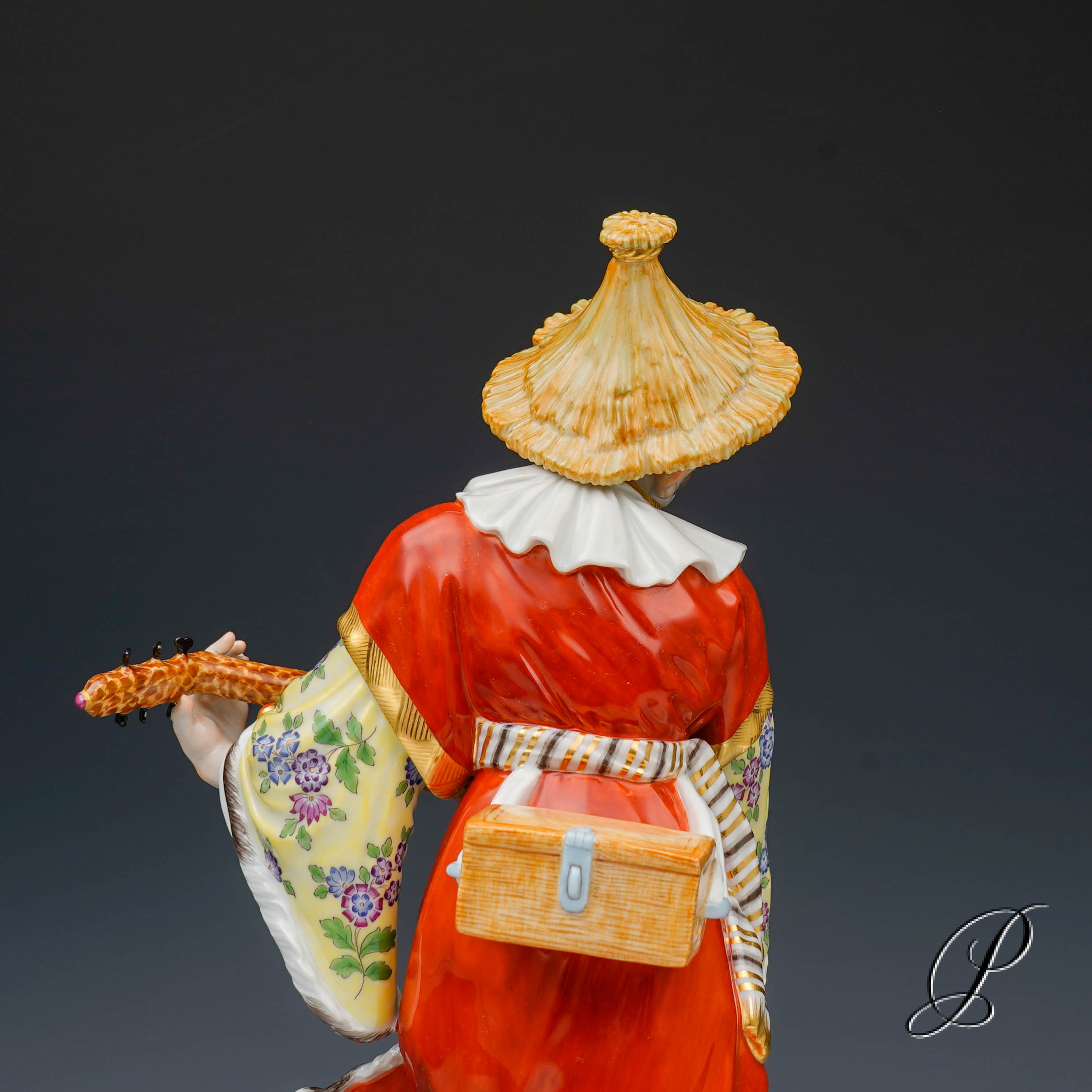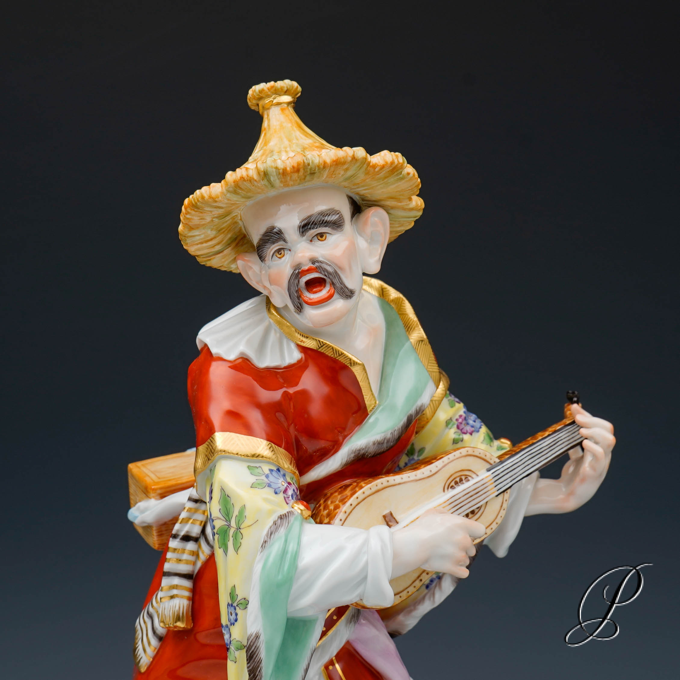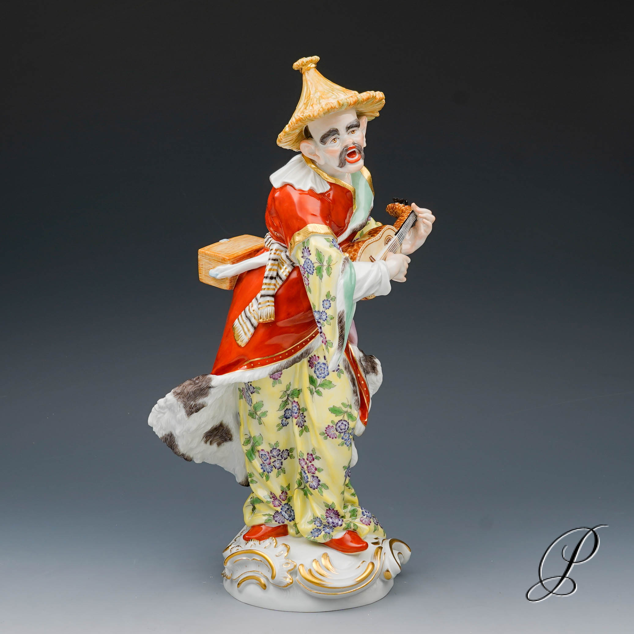 Hier aus dem Hause Meissen ein auf einem Rocaillensockel stehender Malabar in langen Gewand mit Gitarre.