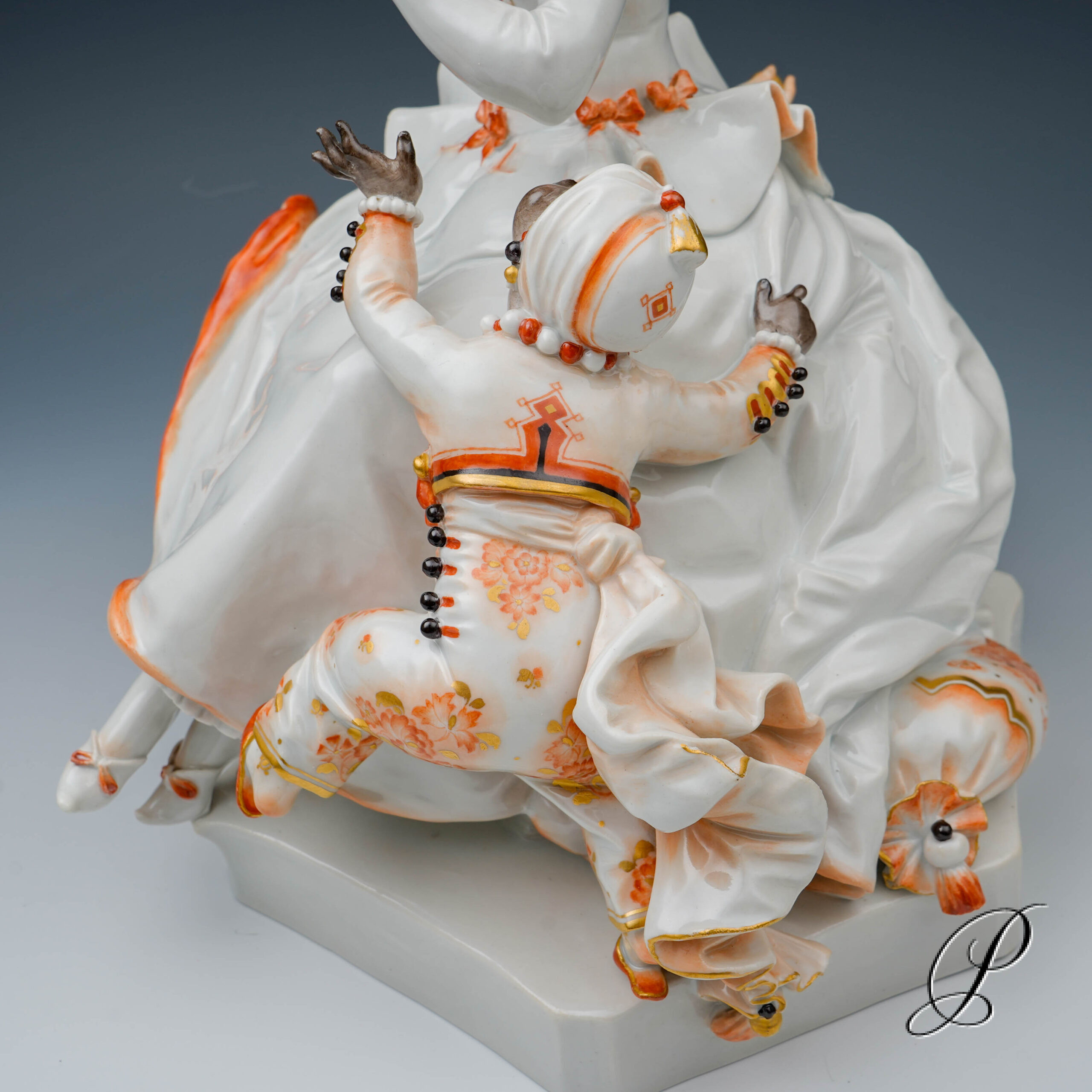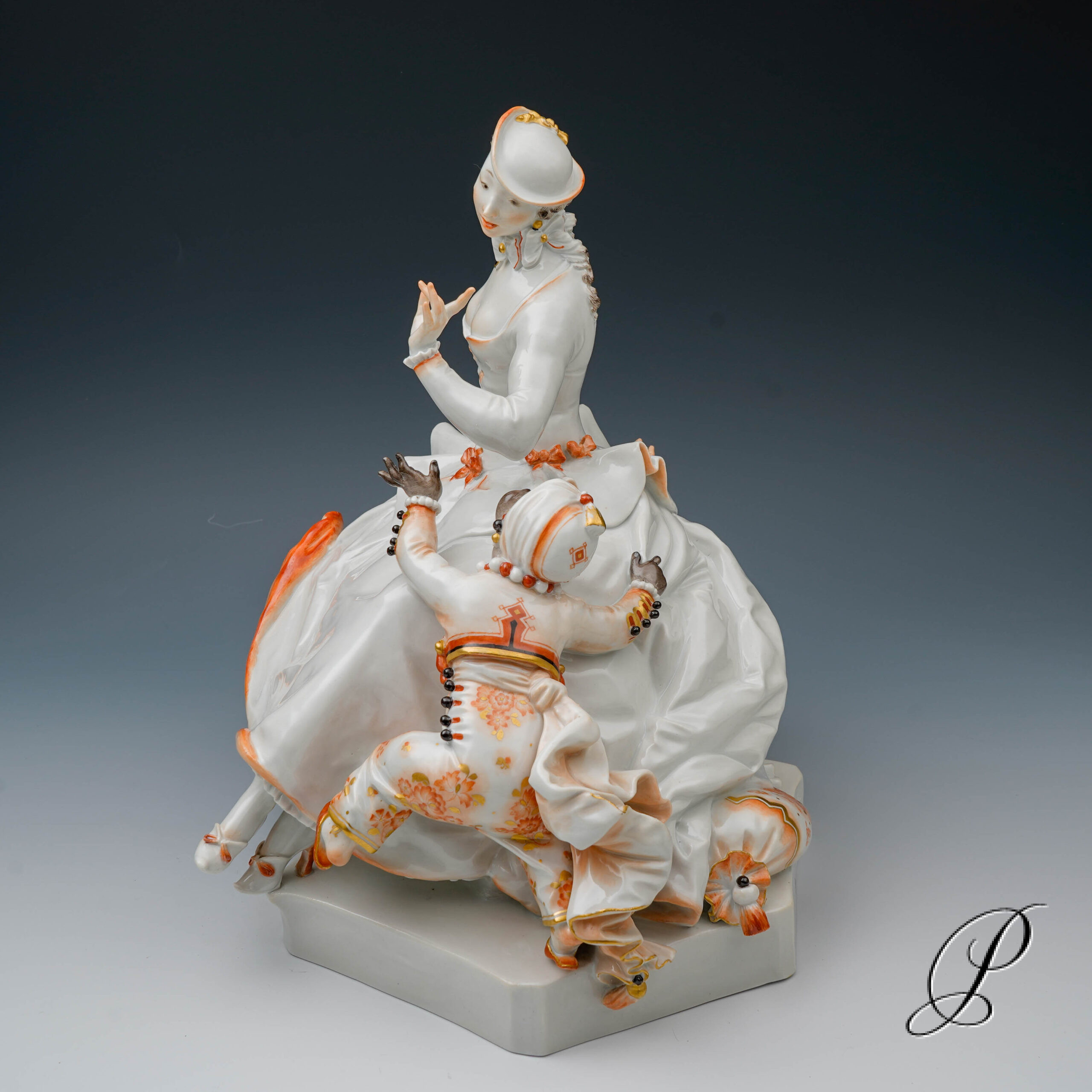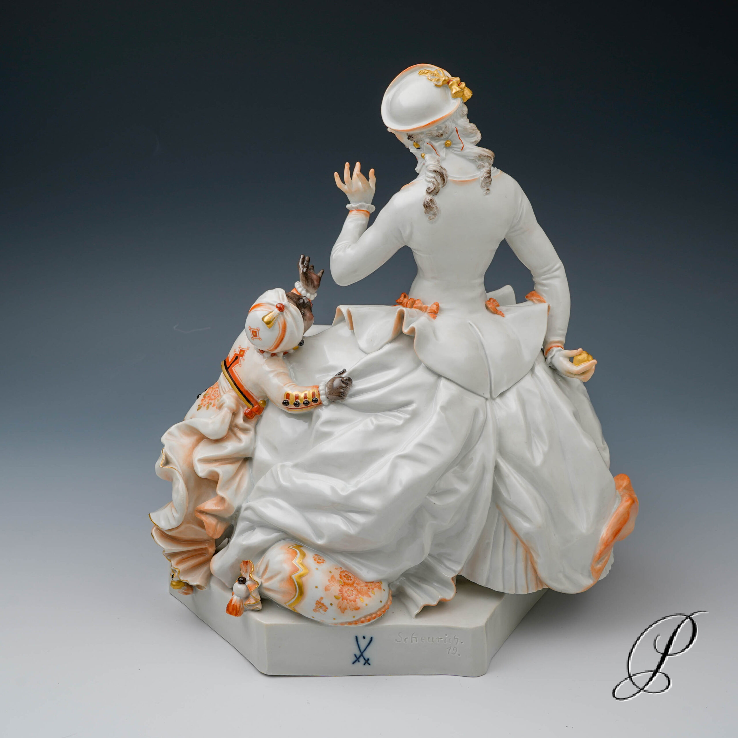 Meissner Manuskripte Band VIII Seite 48-51 + belustigt und ein wenig distanziert neckt die vornehme junge Dame den kleinen Mohrenknaben, der mit unschuldig kindlicher Miene stürmisch den goldenen Ball von ihr fordert, den sie hinter ihrem Rücken verbirgt, sie weist ihn mit mahnender Geste zurück, ein Meisterwerk der Modellierkunst + Scheurich Paul, 1883 New York-1945 Brandenburg, Graphiker, Maler und Bildhauer, studierte an der Akademie in Berlin, ab 1912 erste Arbeiten für Meissen, 1923 Professor