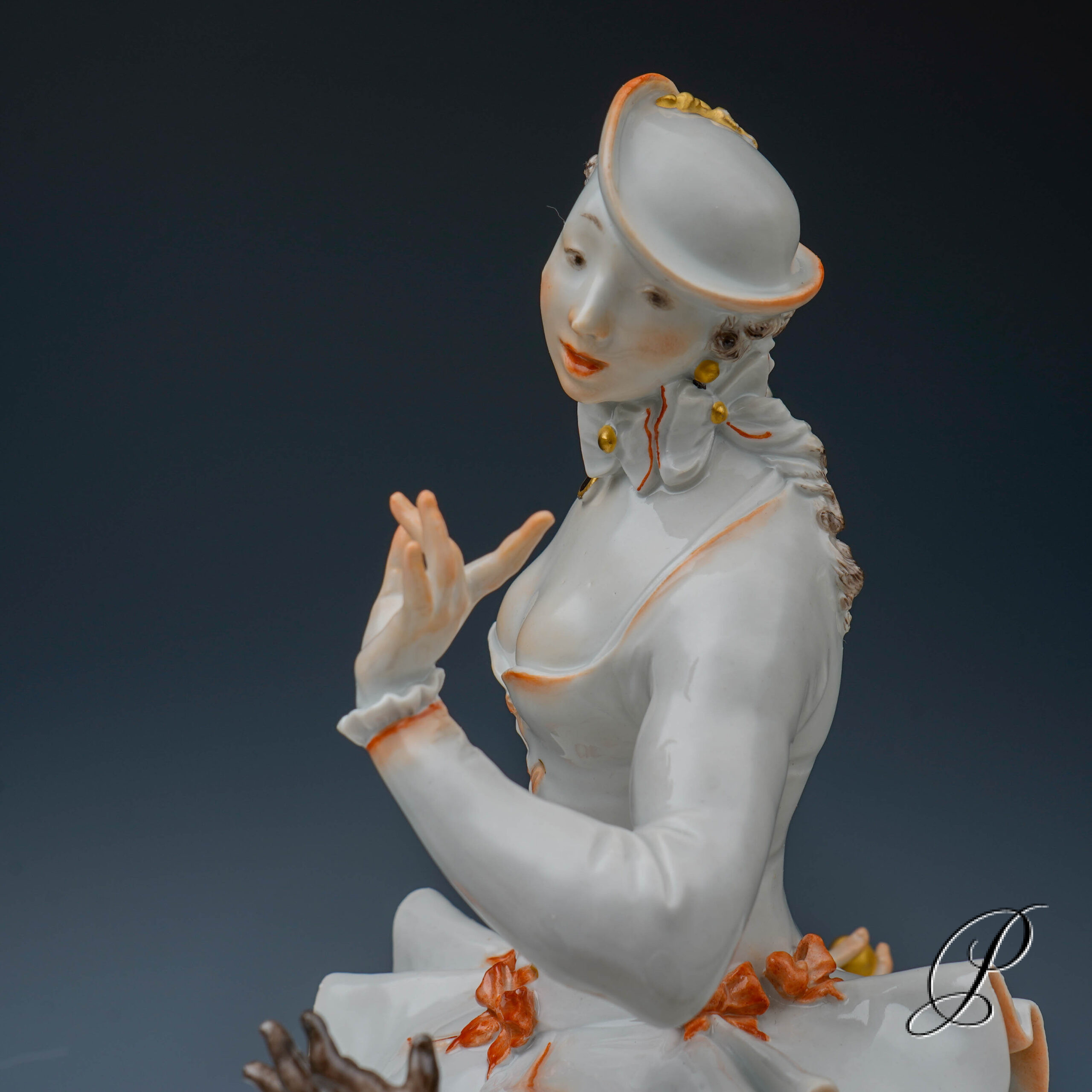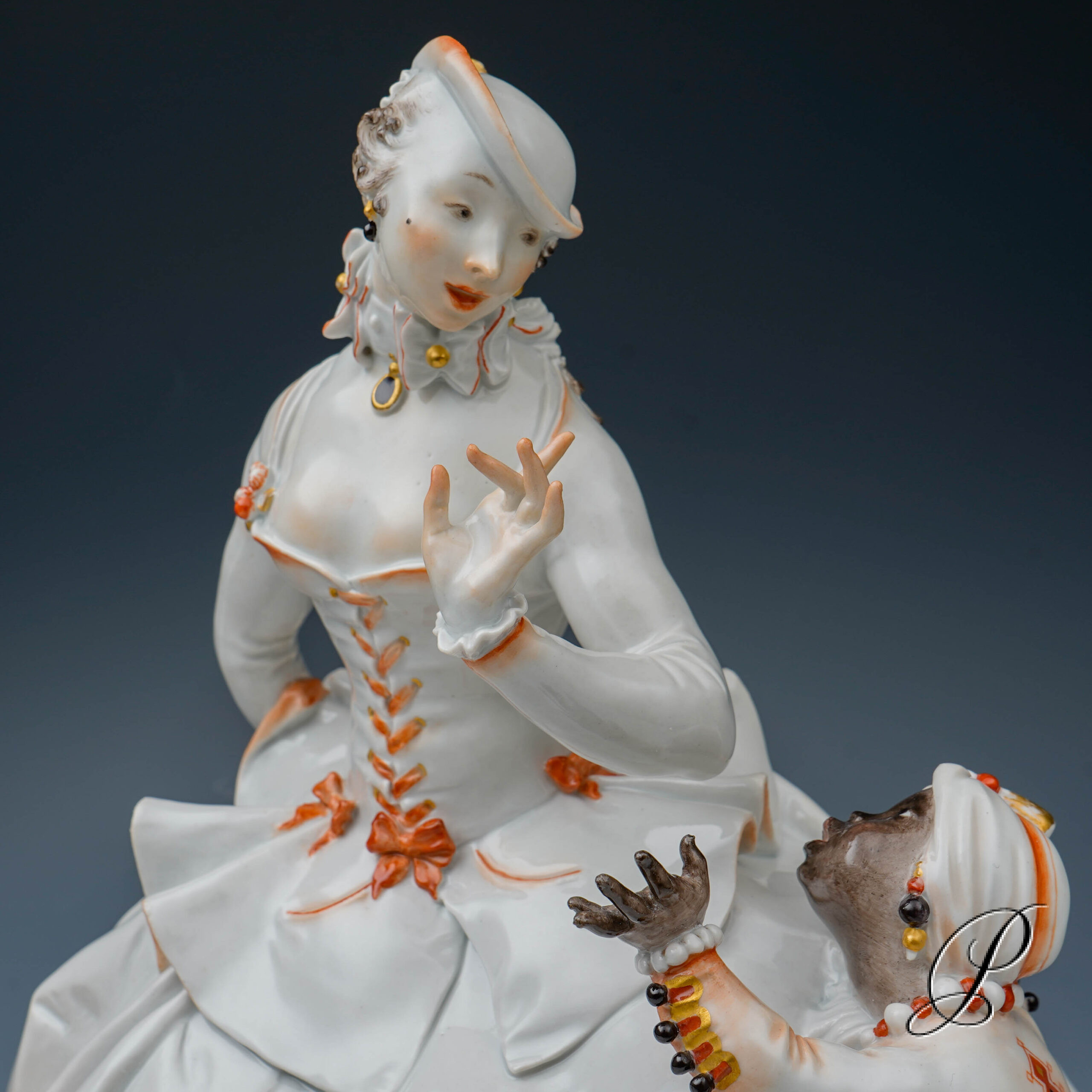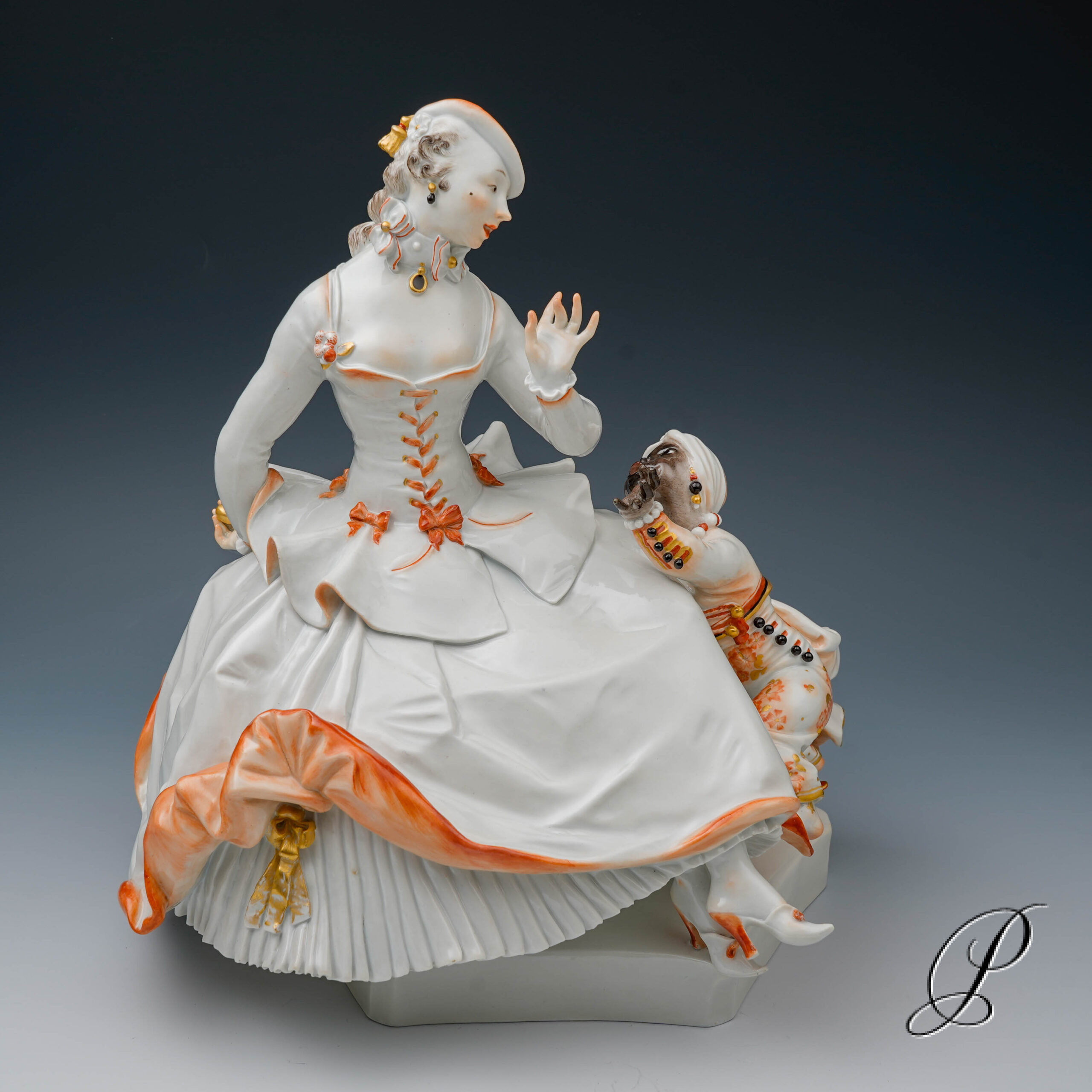 Meissner Manuskripte Band VIII Seite 48-51 + belustigt und ein wenig distanziert neckt die vornehme junge Dame den kleinen Mohrenknaben, der mit unschuldig kindlicher Miene stürmisch den goldenen Ball von ihr fordert, den sie hinter ihrem Rücken verbirgt, sie weist ihn mit mahnender Geste zurück, ein Meisterwerk der Modellierkunst + Scheurich Paul, 1883 New York-1945 Brandenburg, Graphiker, Maler und Bildhauer, studierte an der Akademie in Berlin, ab 1912 erste Arbeiten für Meissen, 1923 Professor