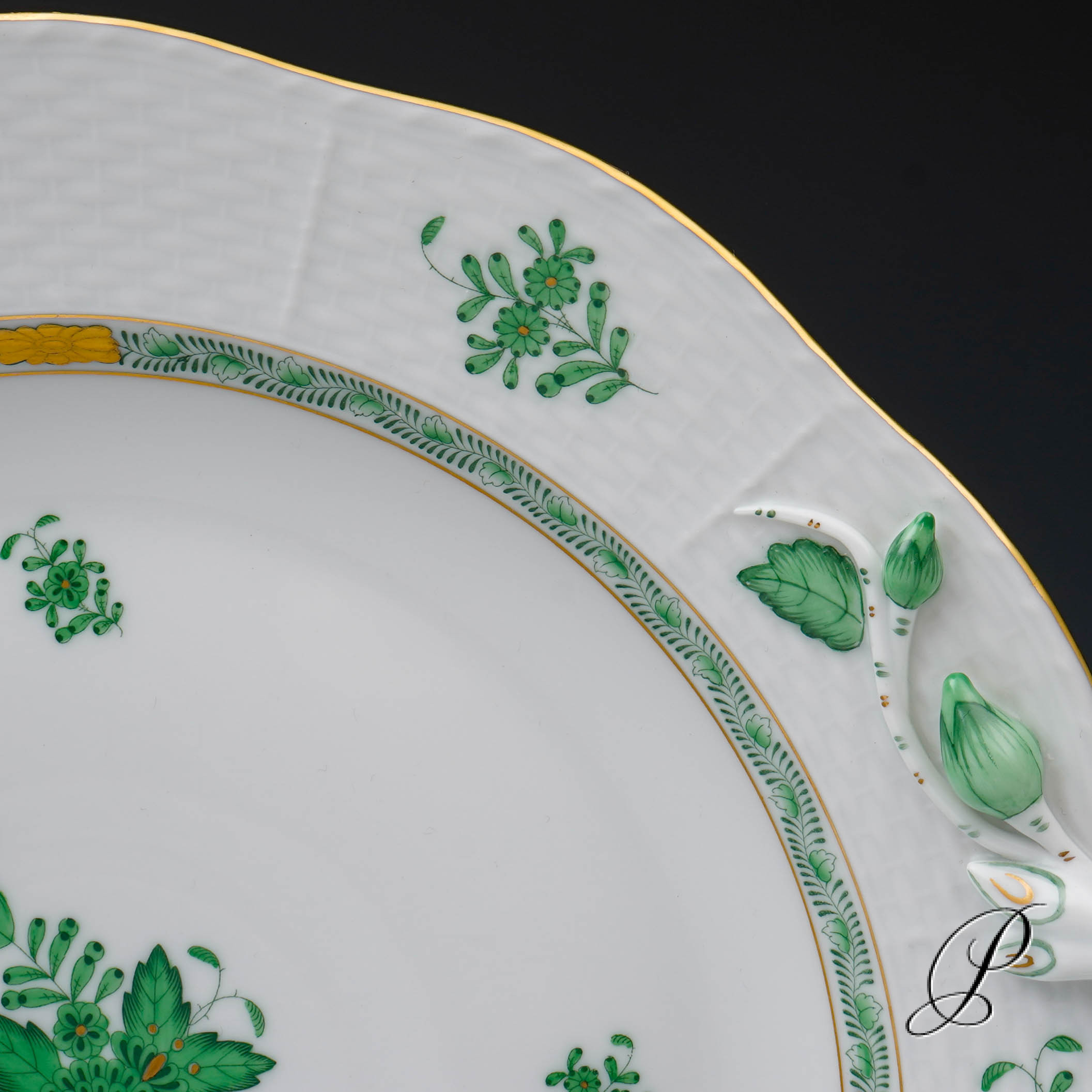 Dekor: Apponyi grün. Mit plast. modellierten Blumen und Blättern belegt.