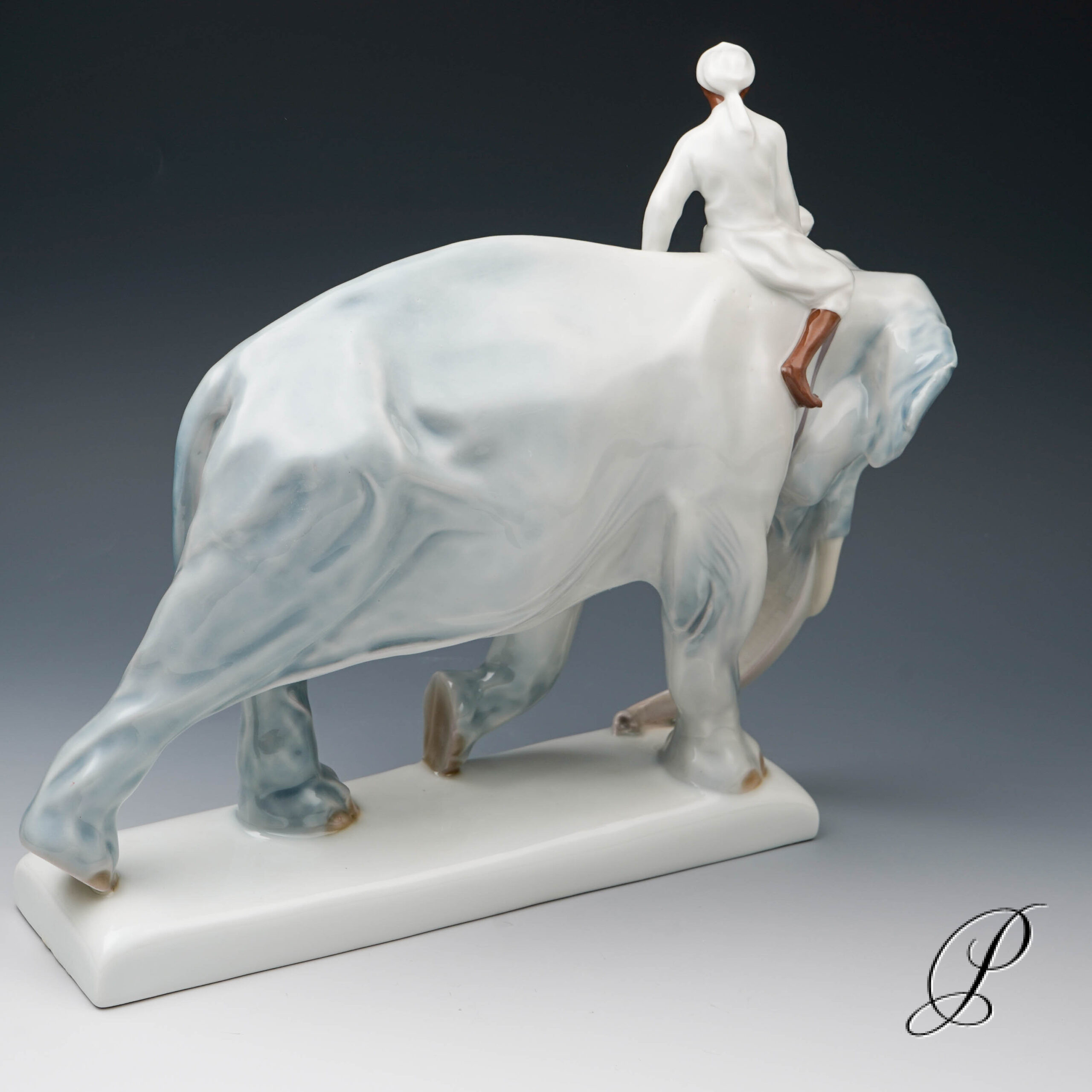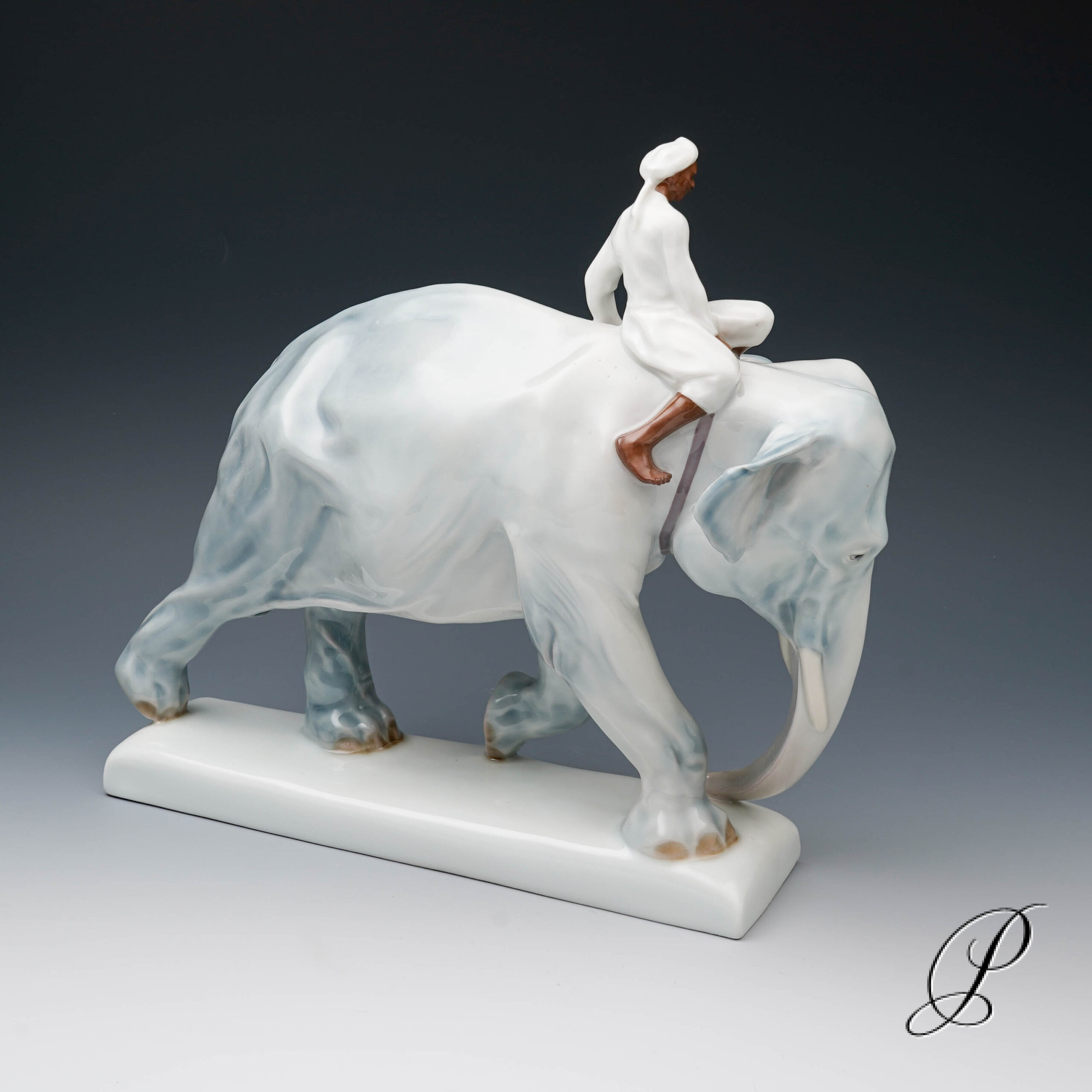 Auf schmalem Sockel schreitender Elefant, auf seinem Rücken ein Inder reitend.