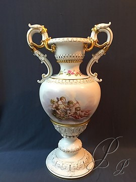 Sie ist verziert mit einer wunderschönen Puttenmalerei. Eine ganz liebreizende, traumhafte Darstellung. Die Malerei ist sehr gut ausgeführt wurden. Rückseitig und über den Vasenhals verteilt ist noch eine Blumengirlande gemalt.