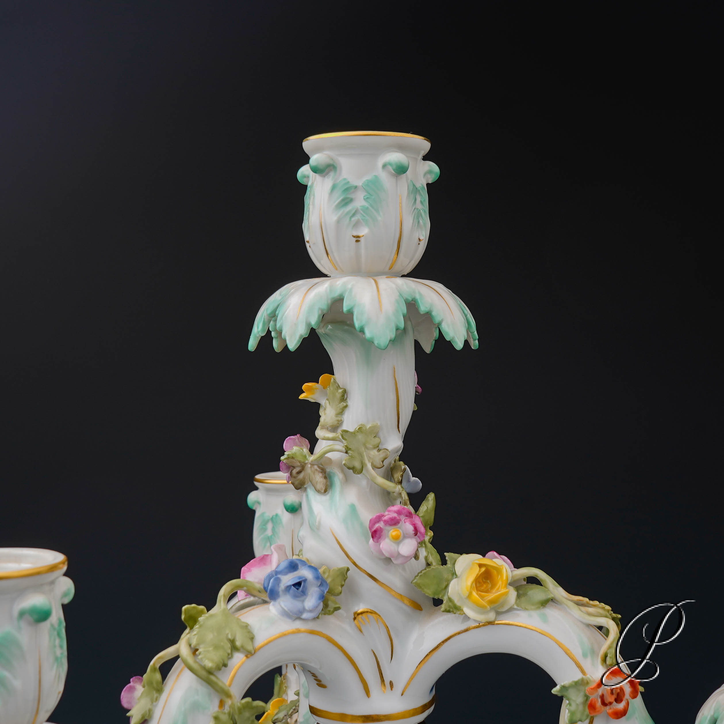Ringsherum belegt mit Blumen und Blättern. Sehr Detailgetreu modelliert. So wie man das aus Meissen kennt.