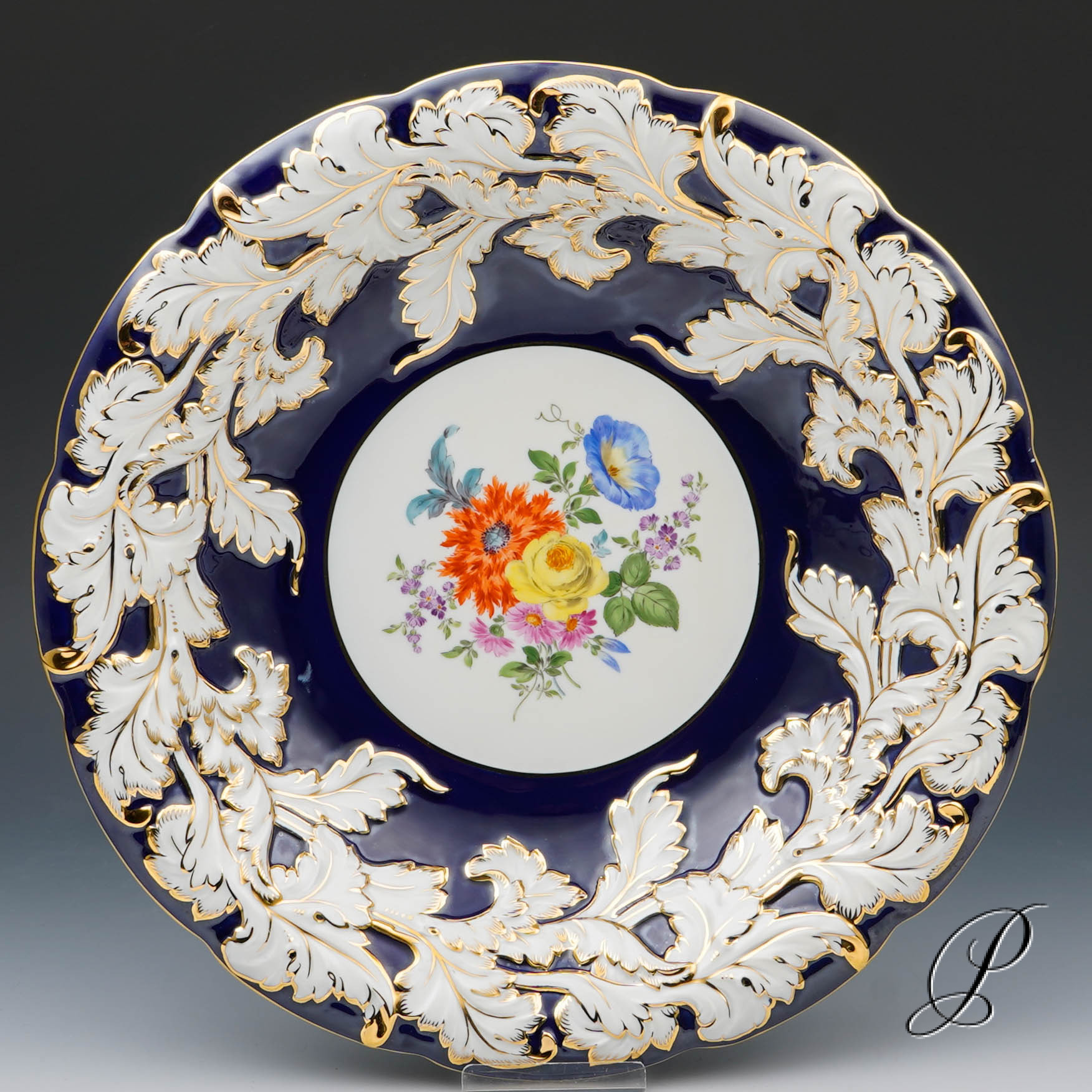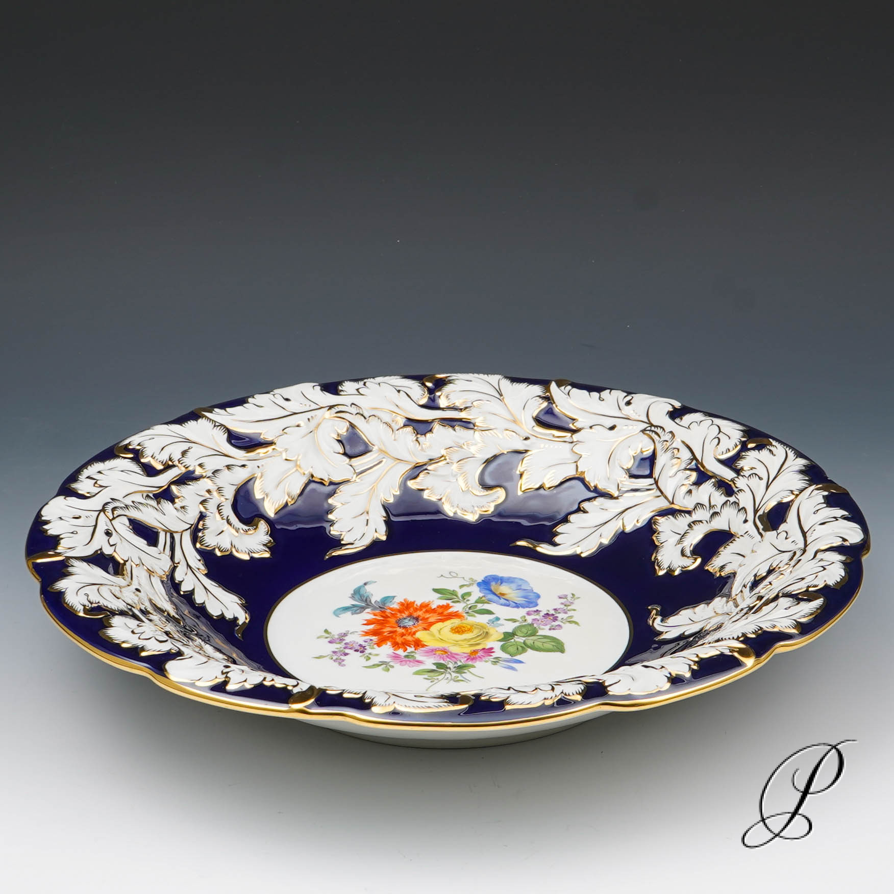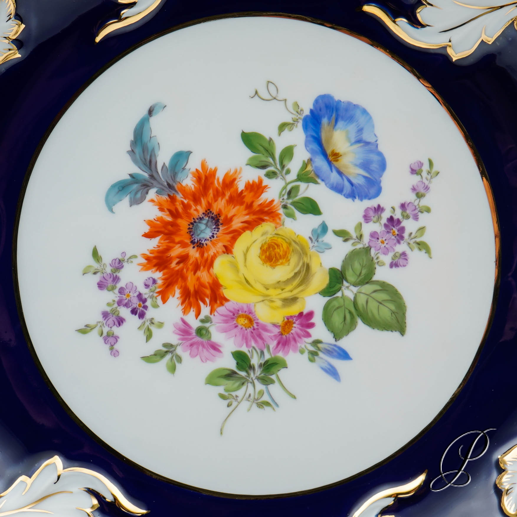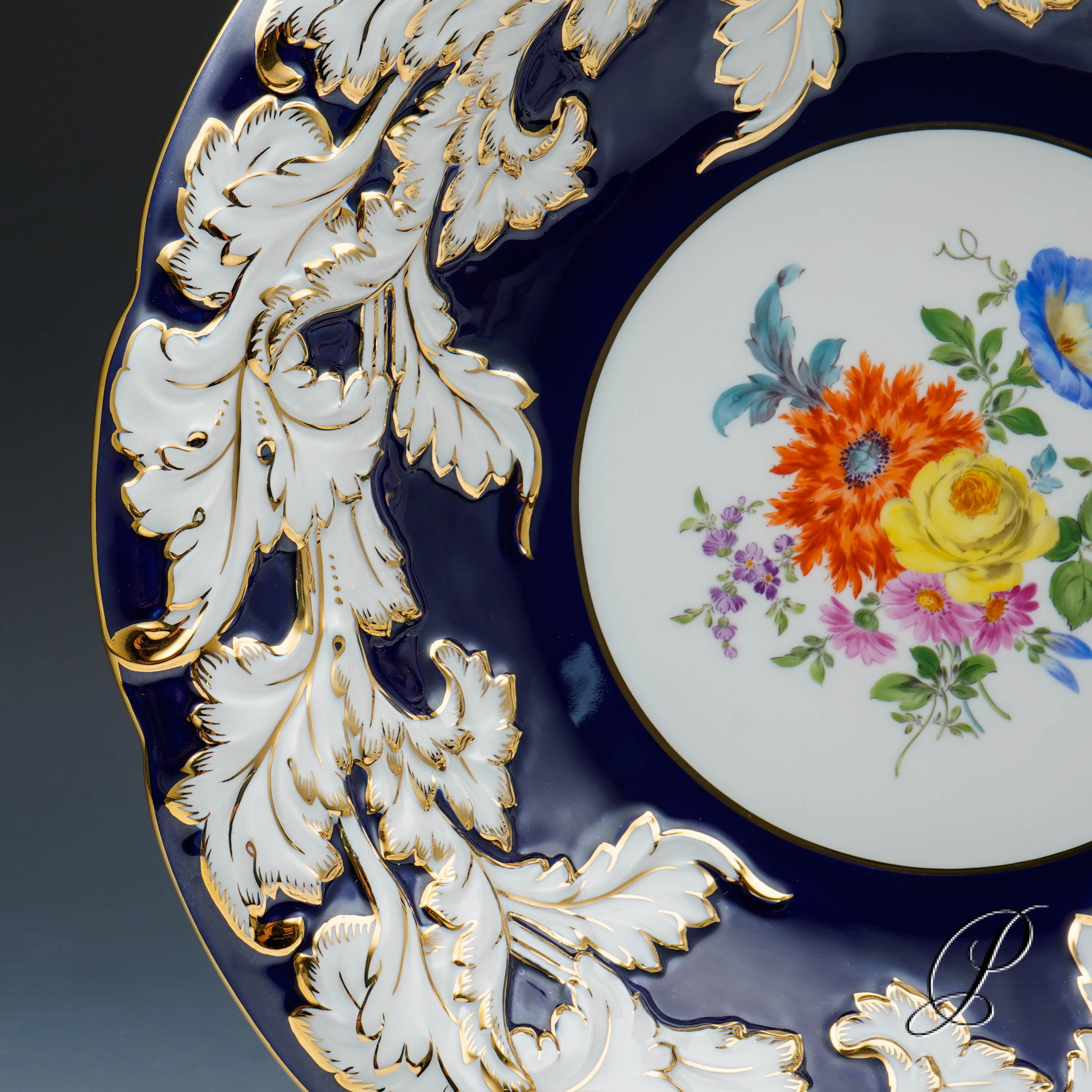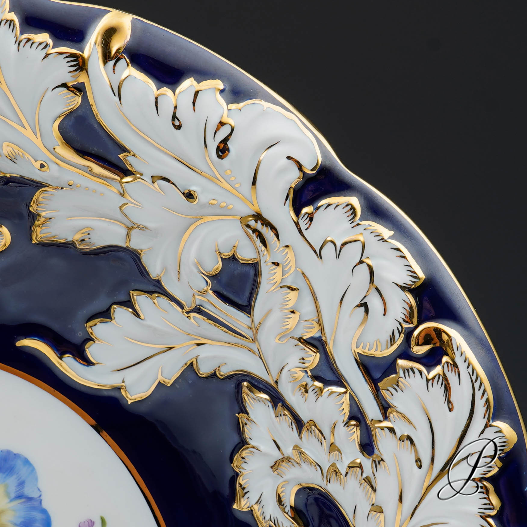 Traumhaft gemaltes Blumenbukett eingehüllt in kobaltblaue Fondmalerei und nicht zu vergessen die prunk vergoldete Blattornamentik.