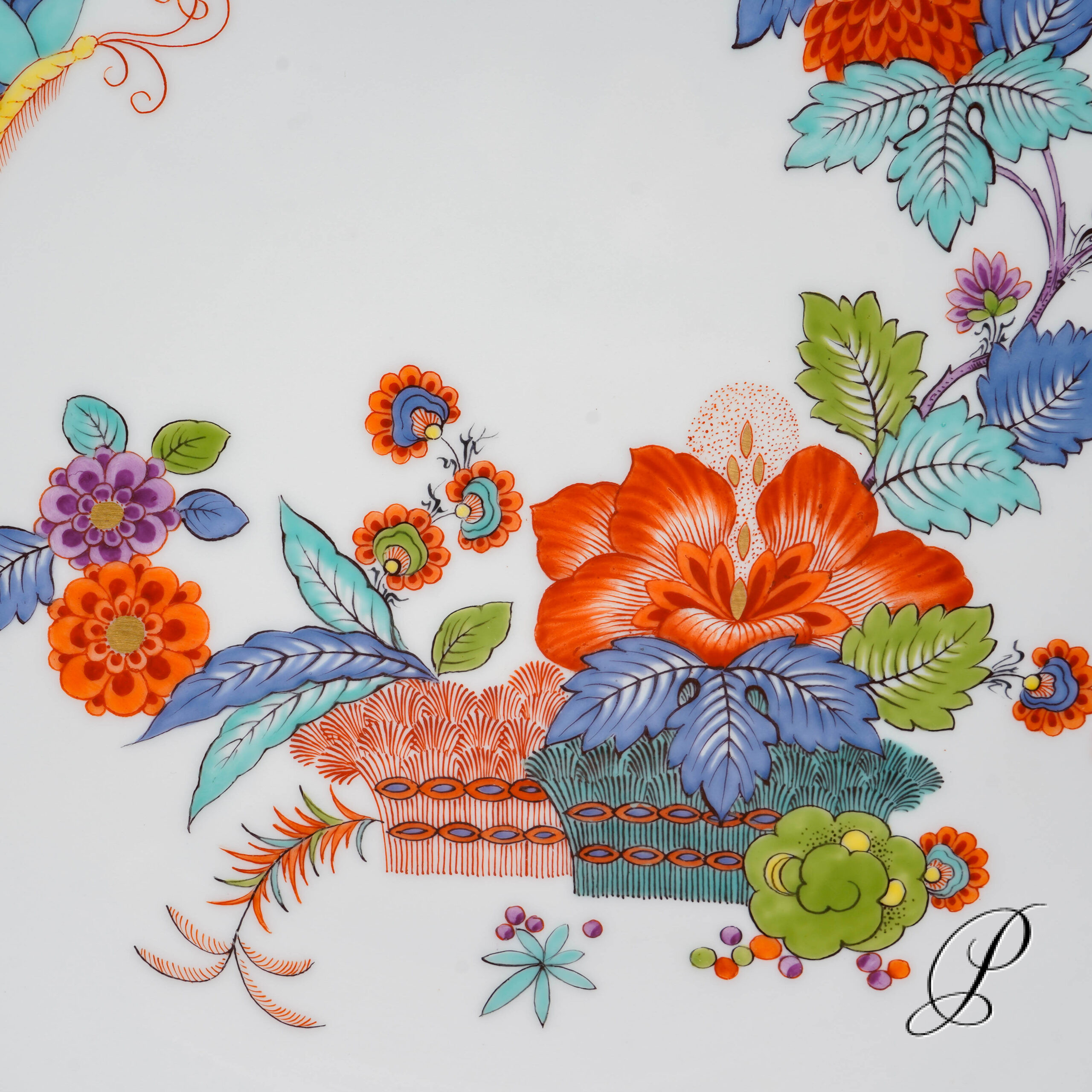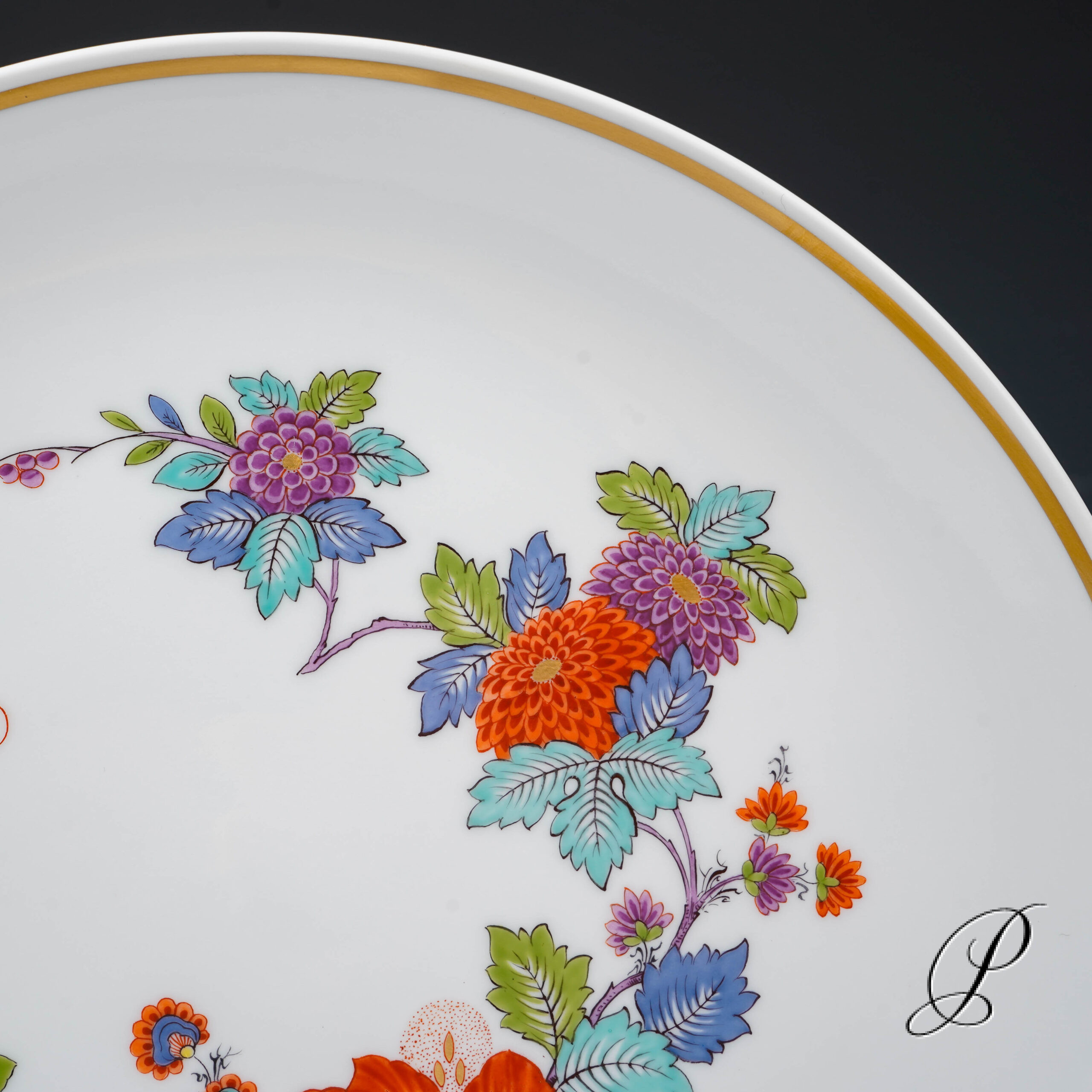 Dekor: Indische Blumenmalerei nach Schloßvase2, ohne Kante, bunt mit Kupferfarben und Goldrand. Akt. Dekornummer 479110.