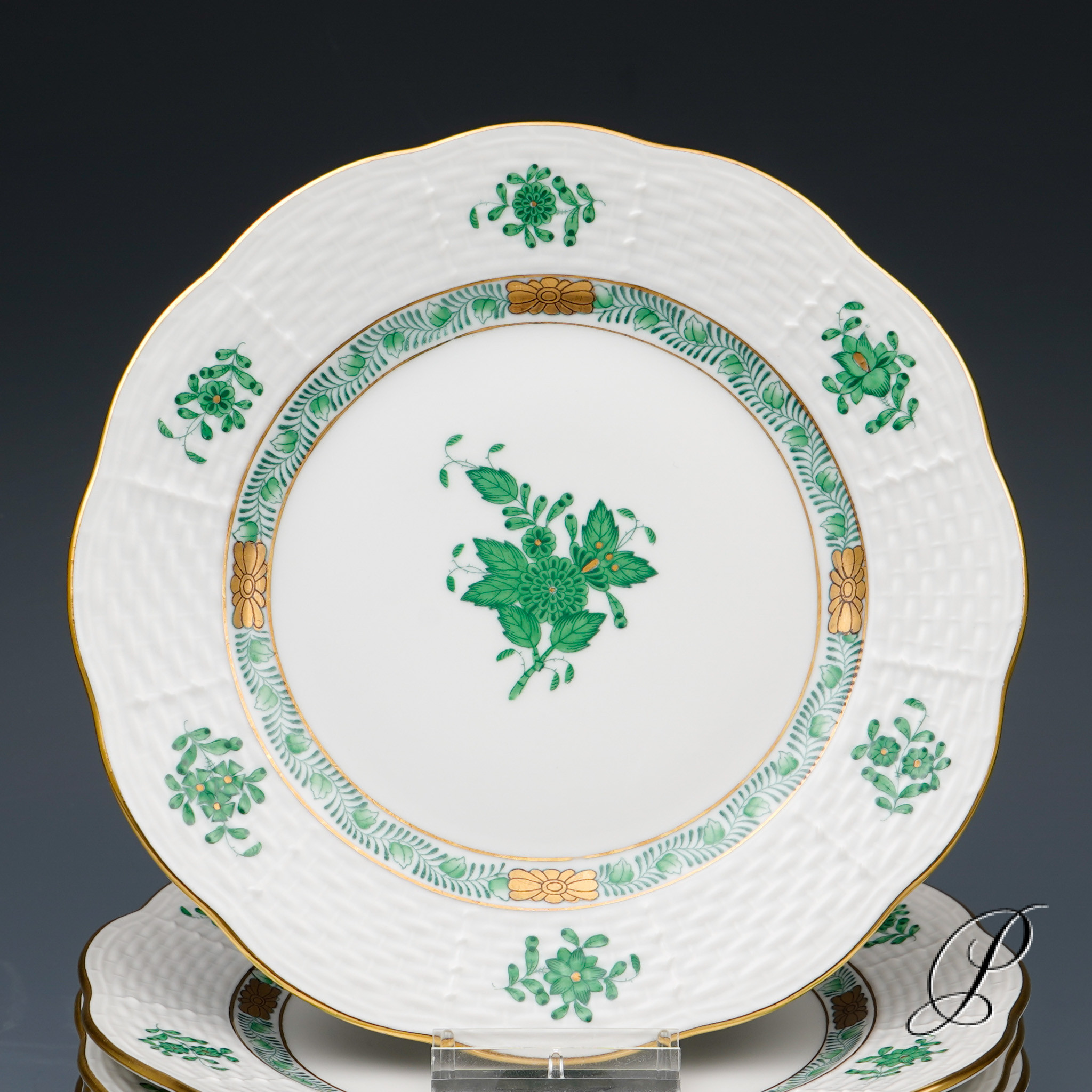 Das Dekor Apponyi gibt es in verschiedenen Farbvarianten. Der Name verbindet sich mit dem Grafen Albert Apponyi, der dieses Motiv in der Herend Manufaktur bestellte. Das Dekor wurde in Anlehnung an das fernöstliche Motiv „Indischer Blumenkorb“ entworfen. Eine stilisierte Pfingstrose in Konturmalerei welche von 6 Streumotiven und einer Girlande aus stilisierten Blättern umgeben ist.