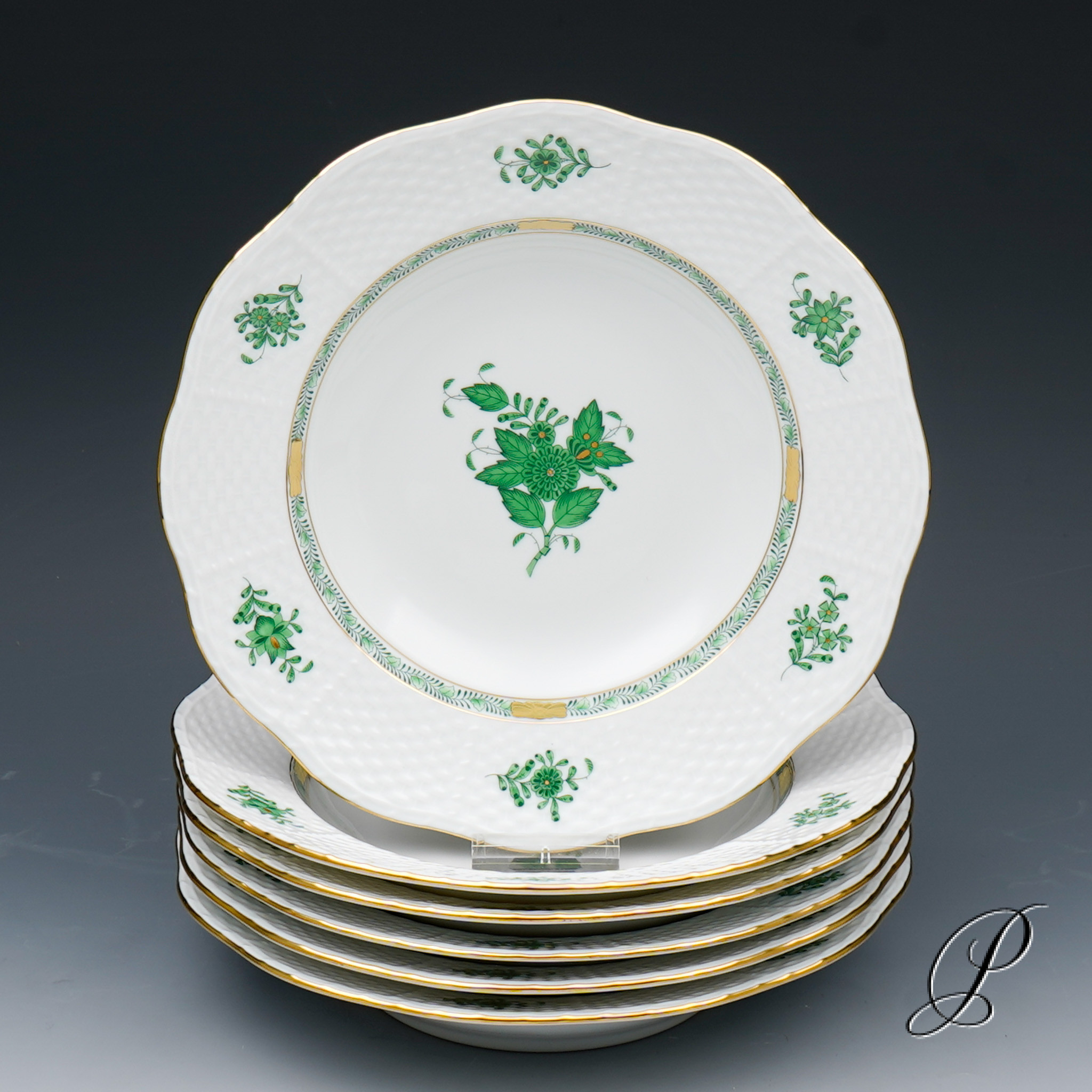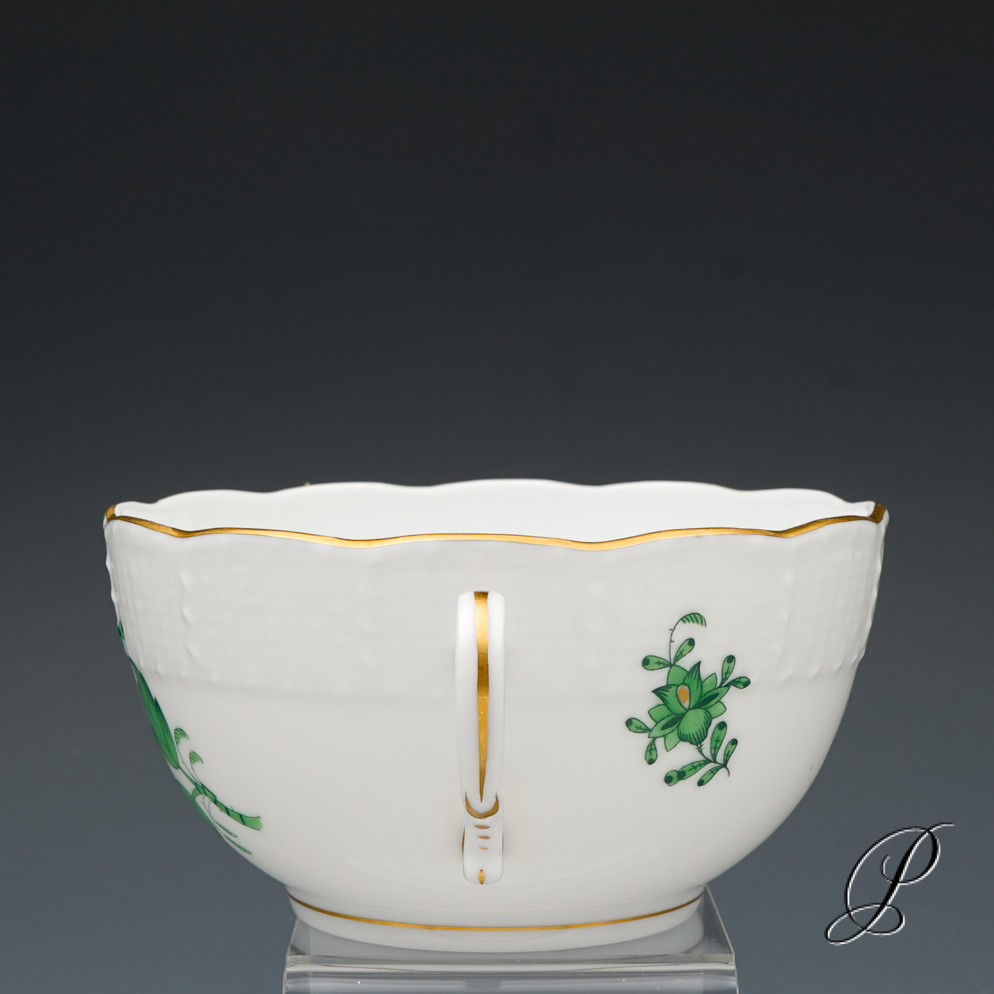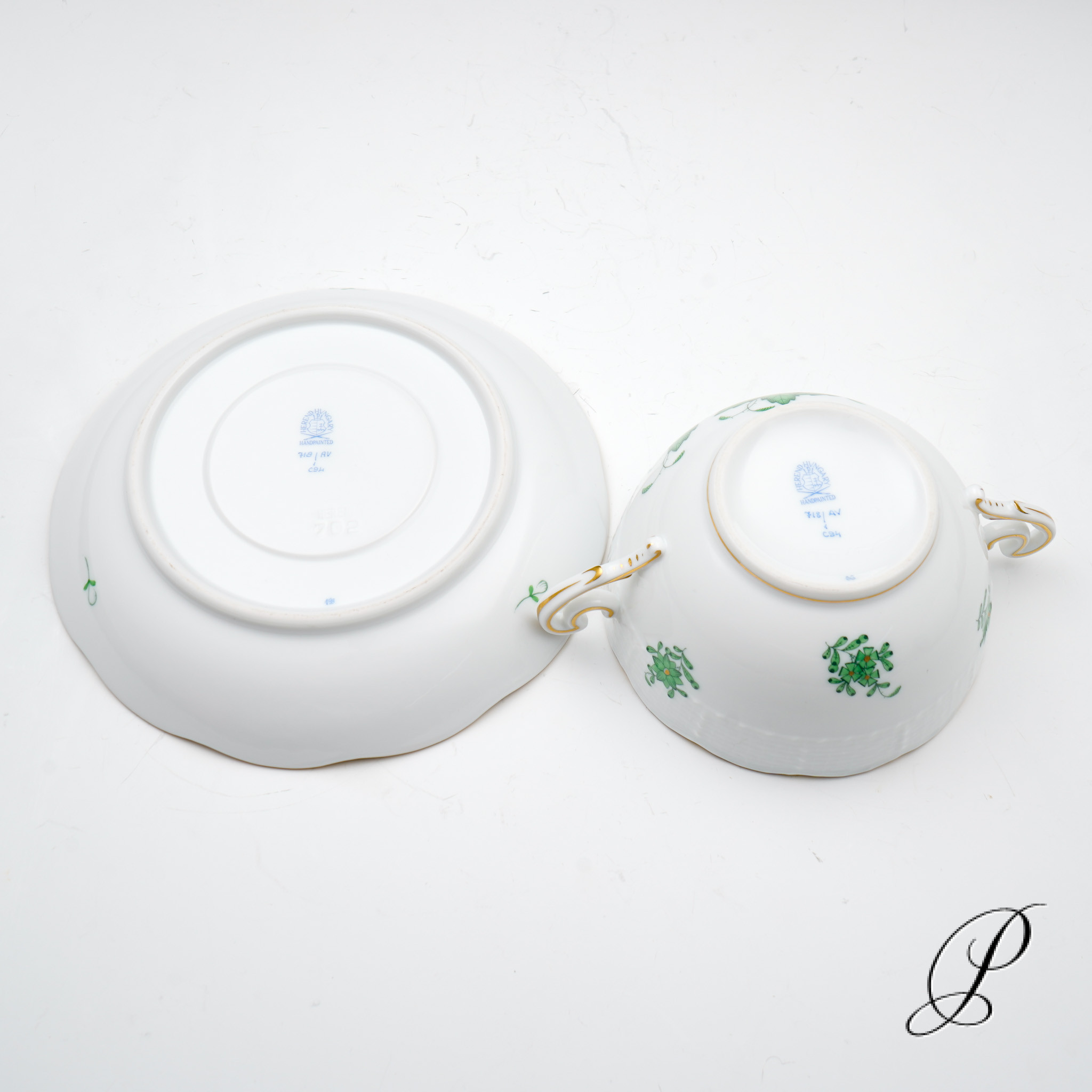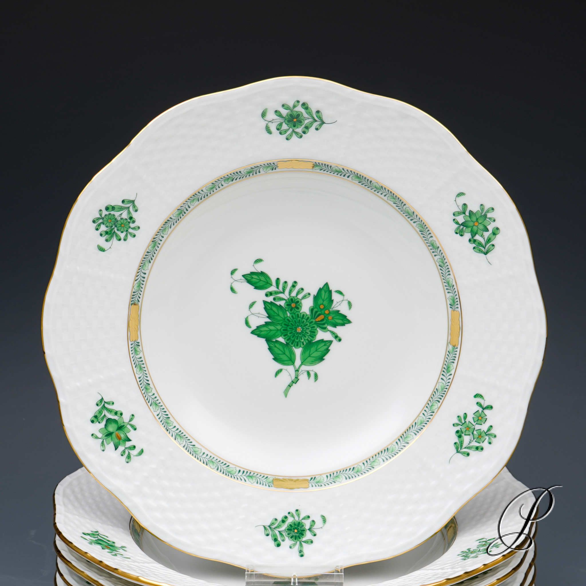 Das Dekor Apponyi gibt es in verschiedenen Farbvarianten. Der Name verbindet sich mit dem Grafen Albert Apponyi, der dieses Motiv in der Herend Manufaktur bestellte. Das Dekor wurde in Anlehnung an das fernöstliche Motiv „Indischer Blumenkorb“ entworfen. Eine stilisierte Pfingstrose in Konturmalerei welche von 6 Streumotiven und einer Girlande aus stilisierten Blättern umgeben ist.