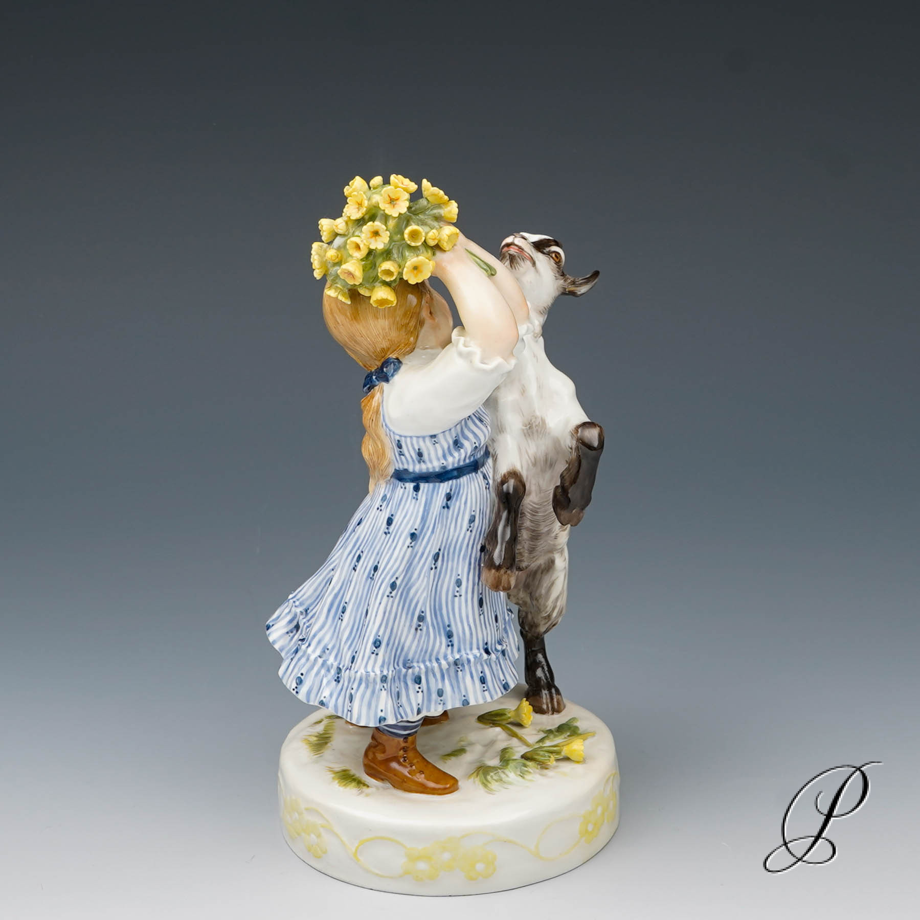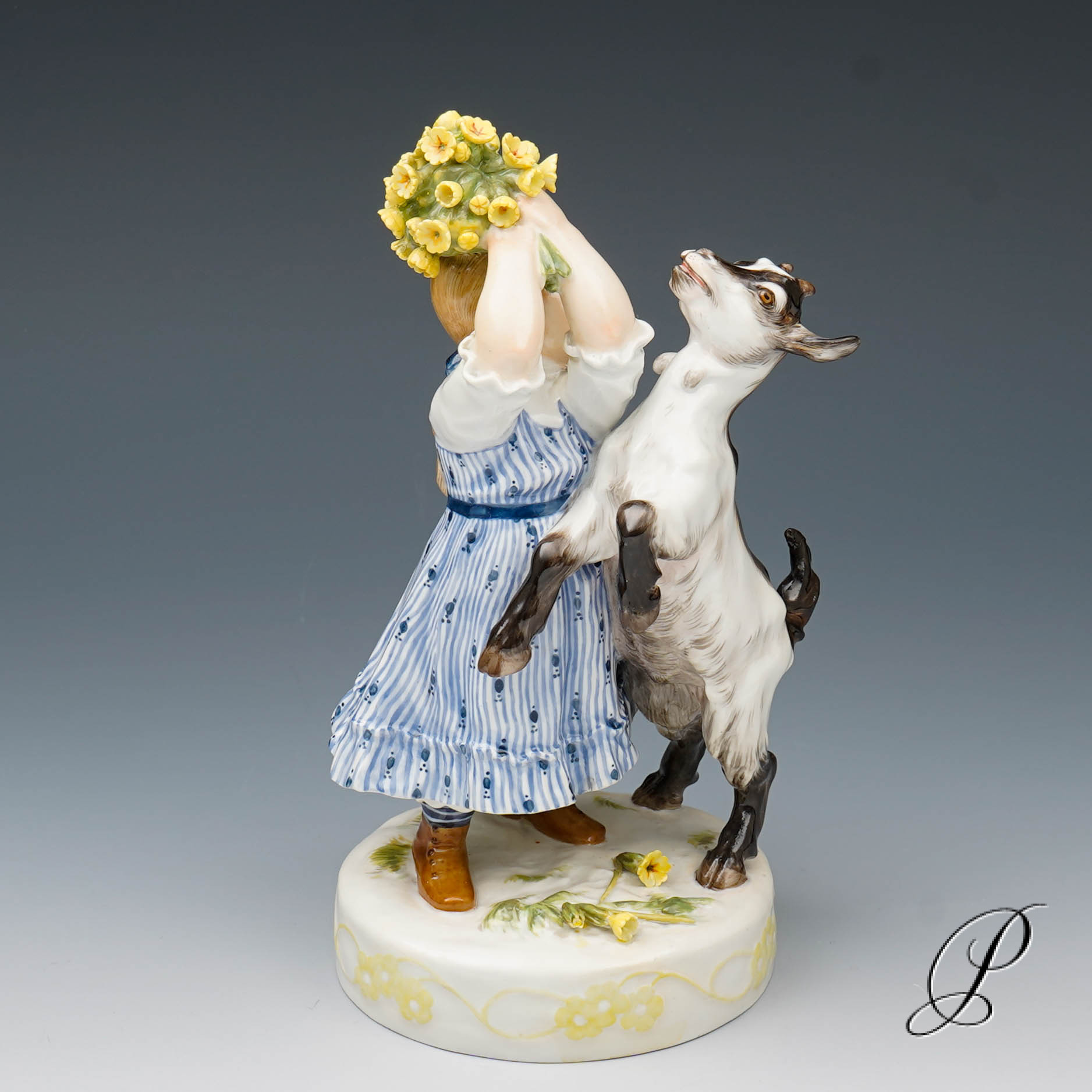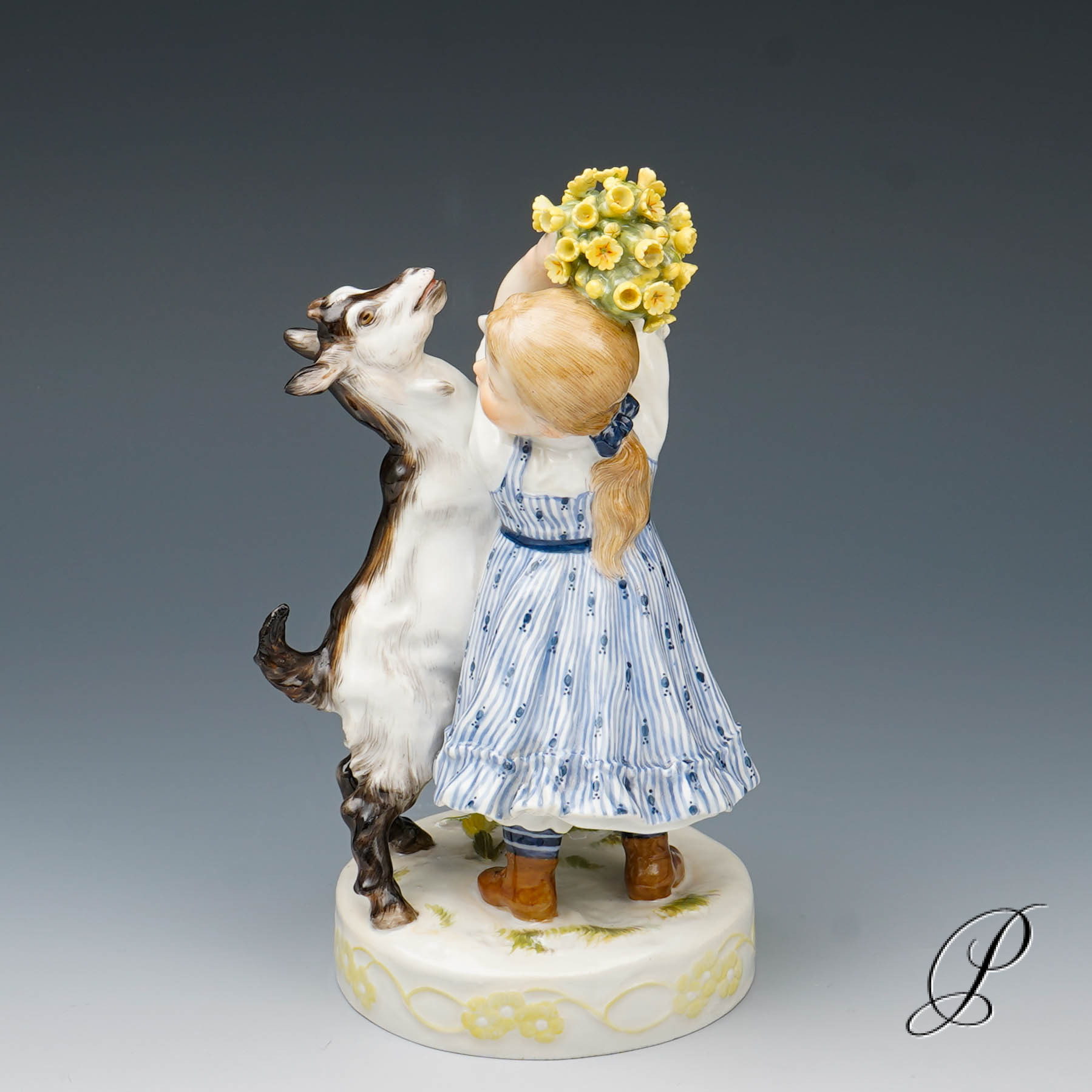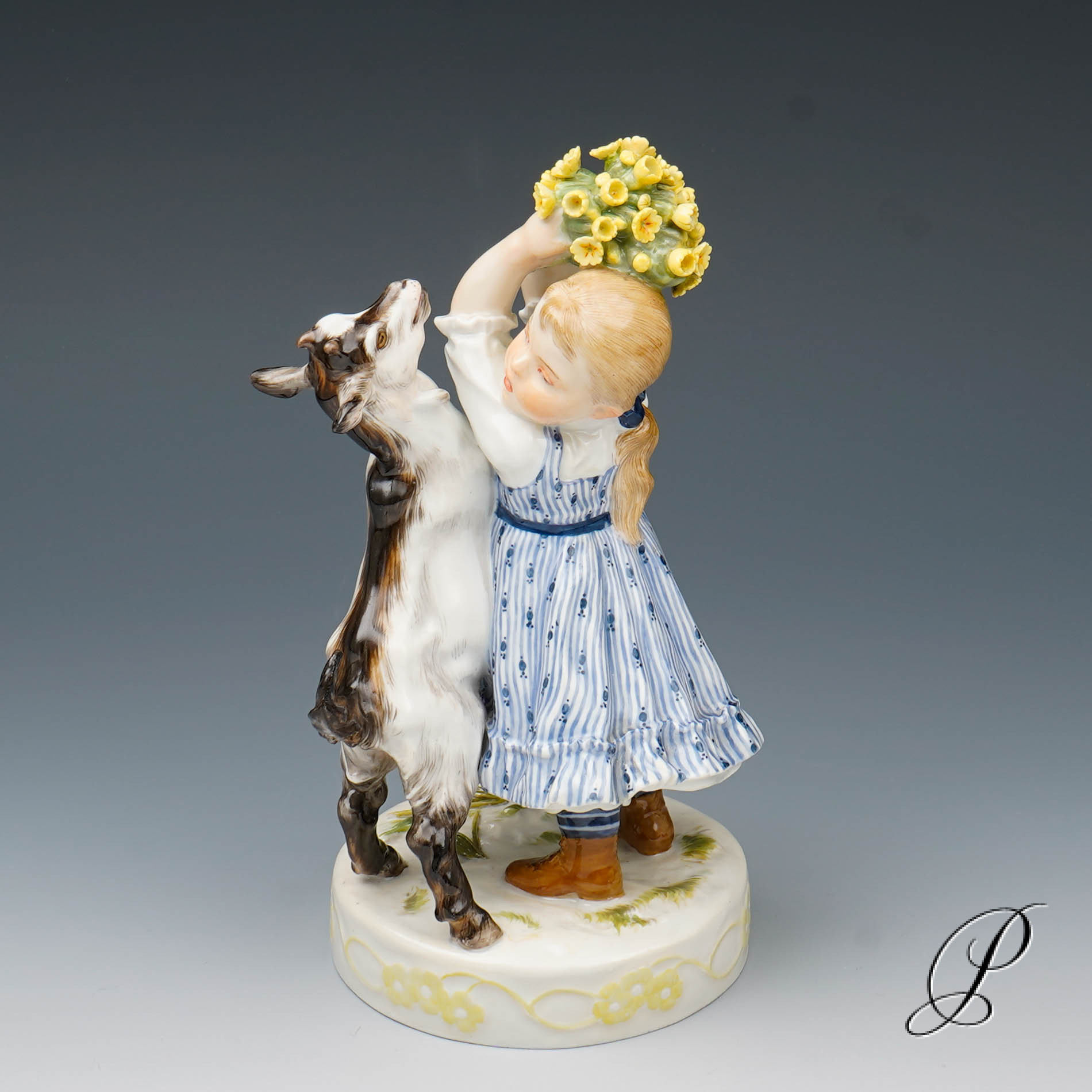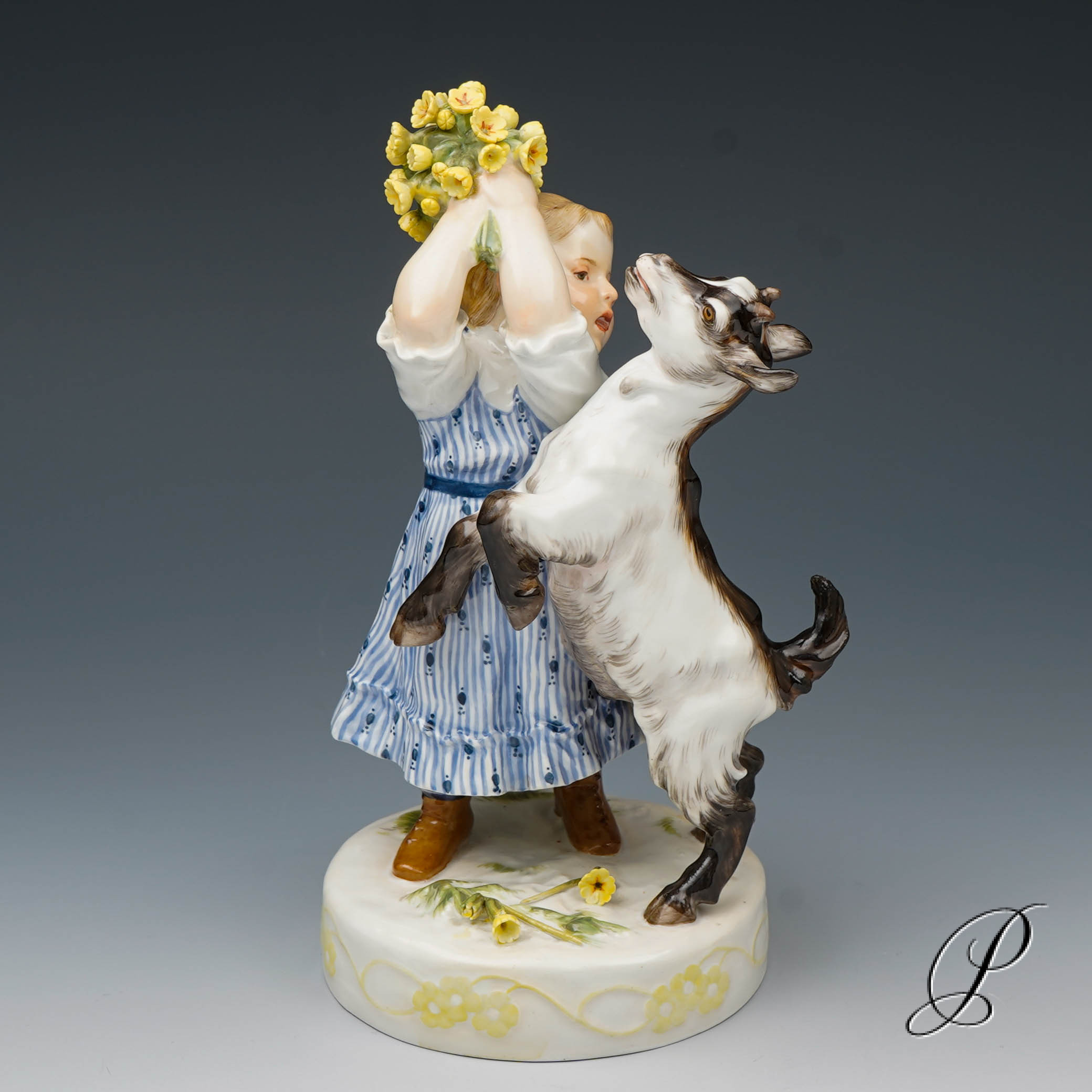 In der Darstellung ein Mädchen mit Ziege. Eine wunderbare Ausführung mit toller Staffage. Auf rundem Sockel mit umlaufendem Blütenrankenrelief und aufgelegten Blumen stehendes Mädchen in blauem Kleid, das die neben ihr emporsteigende, gefräßige Ziege von ihrem gepflückten Primelstrauß abzuwehren versucht.