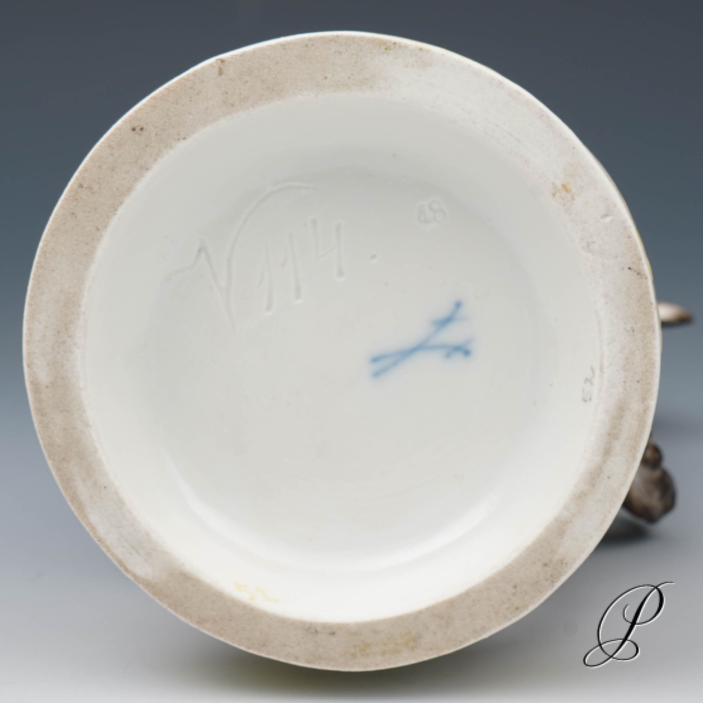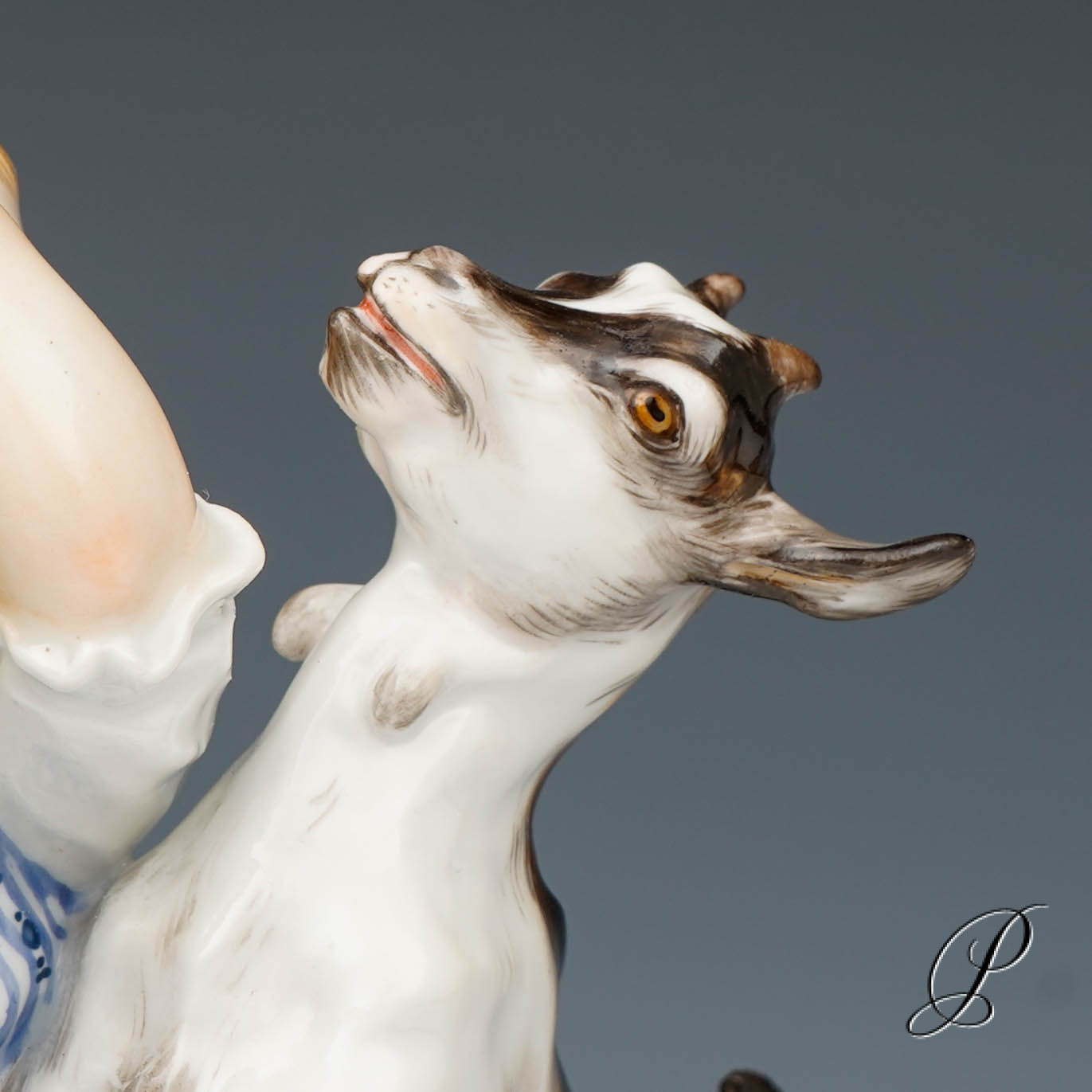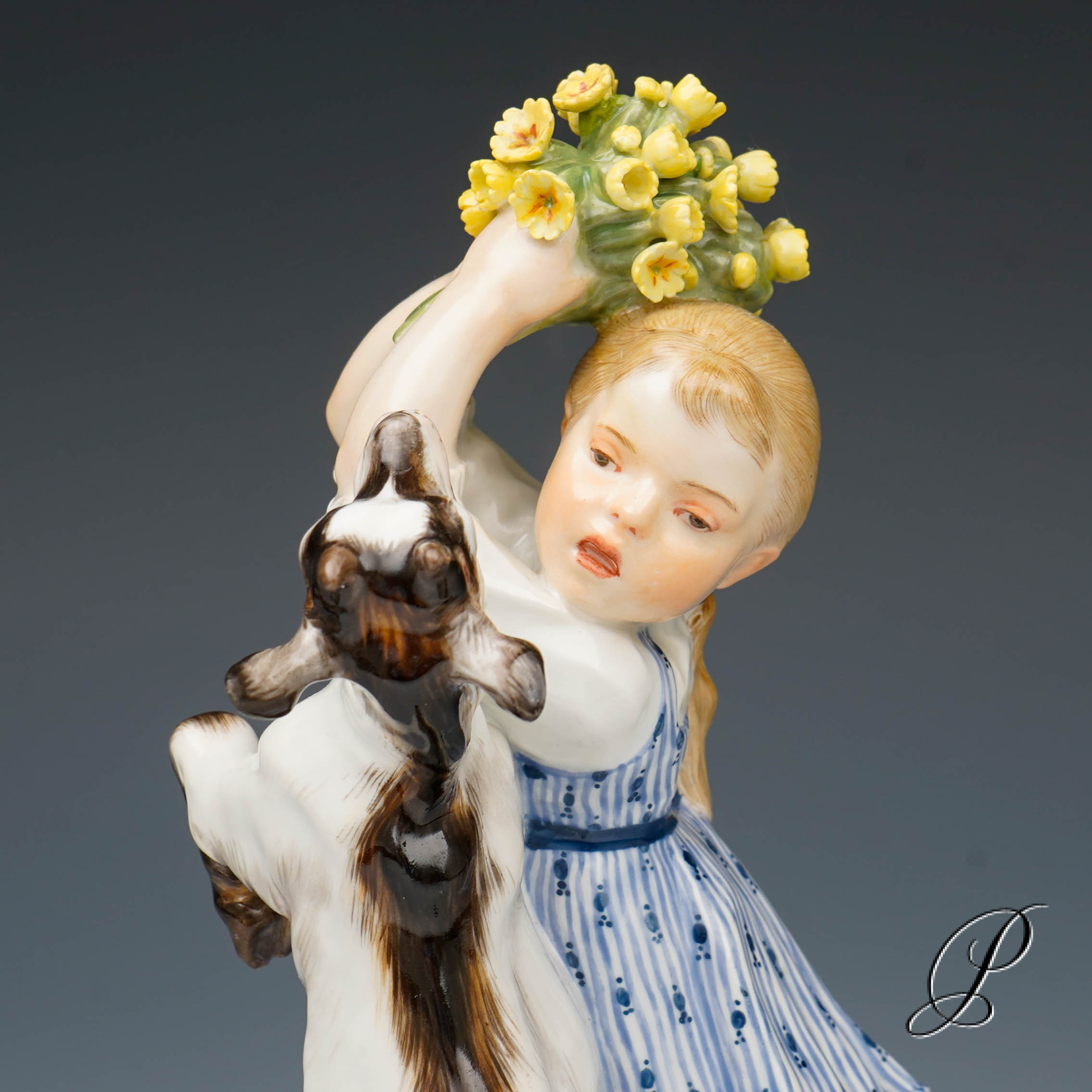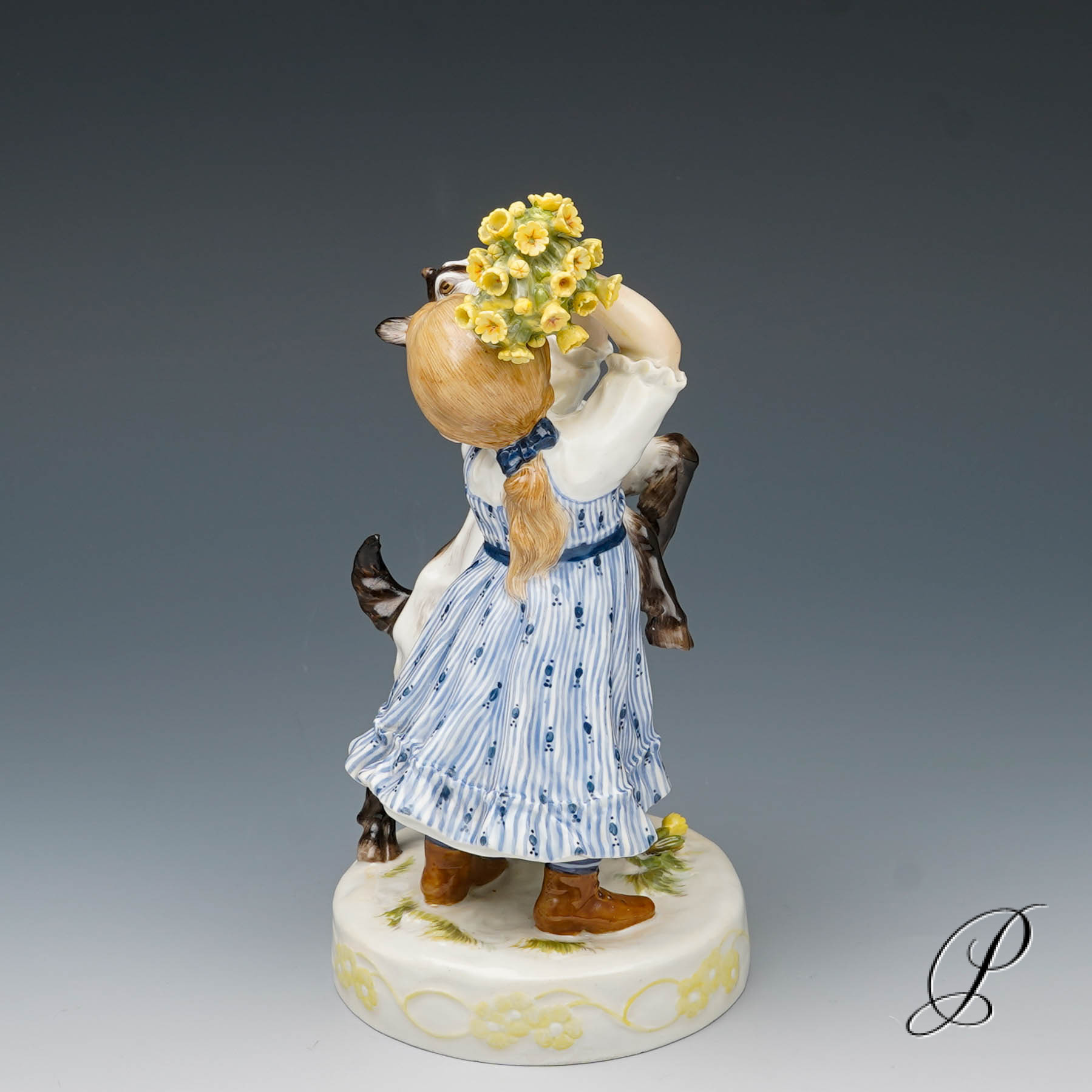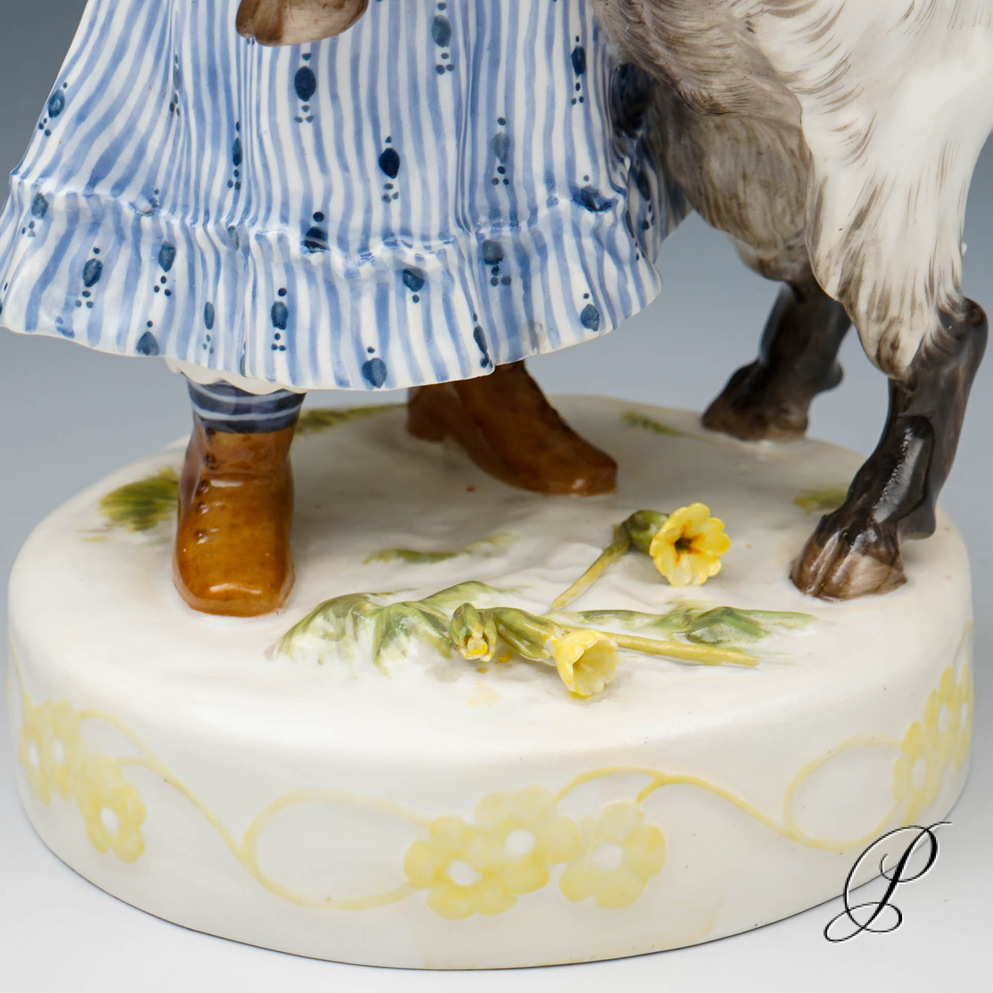 In der Darstellung ein Mädchen mit Ziege. Eine wunderbare Ausführung mit toller Staffage. Auf rundem Sockel mit umlaufendem Blütenrankenrelief und aufgelegten Blumen stehendes Mädchen in blauem Kleid, das die neben ihr emporsteigende, gefräßige Ziege von ihrem gepflückten Primelstrauß abzuwehren versucht.