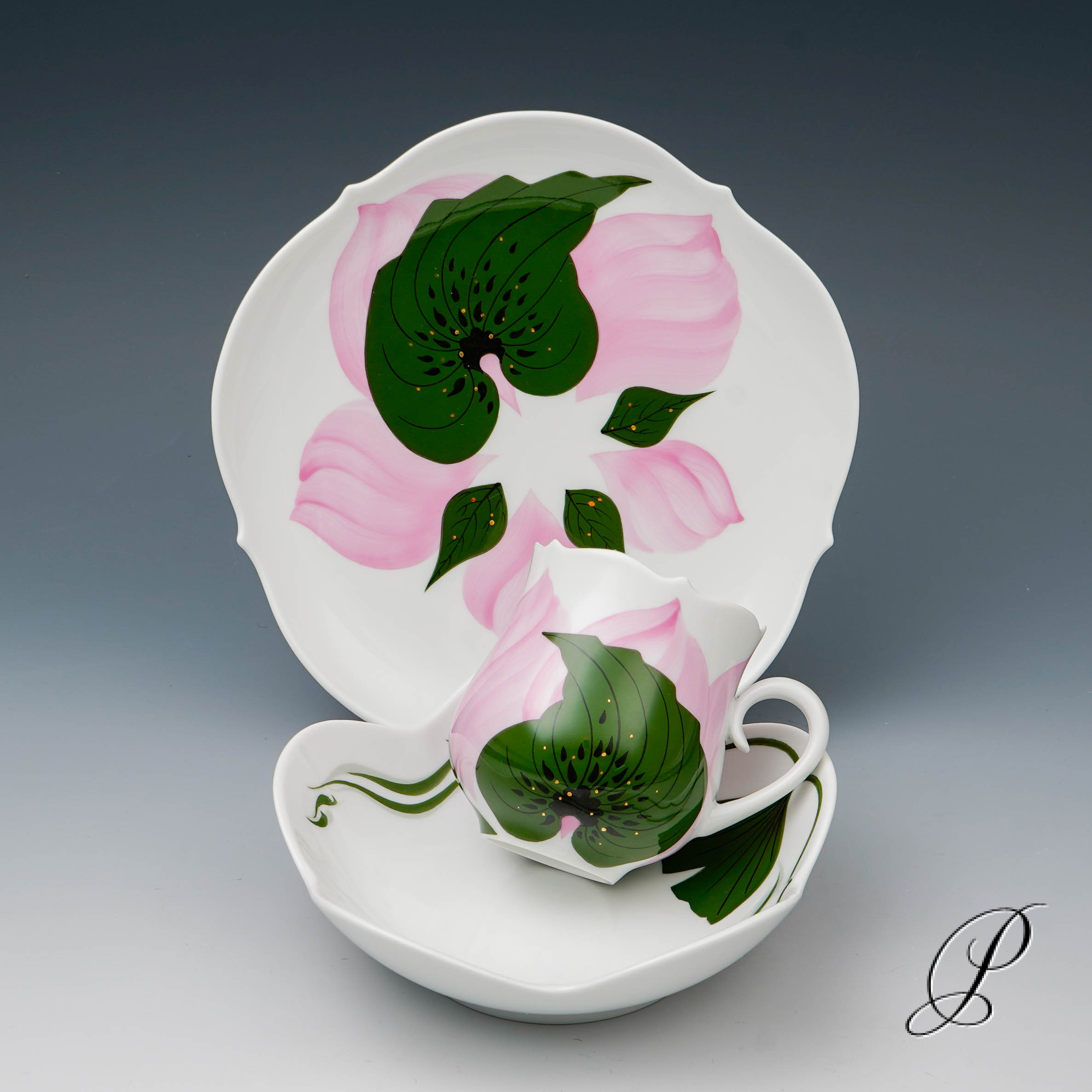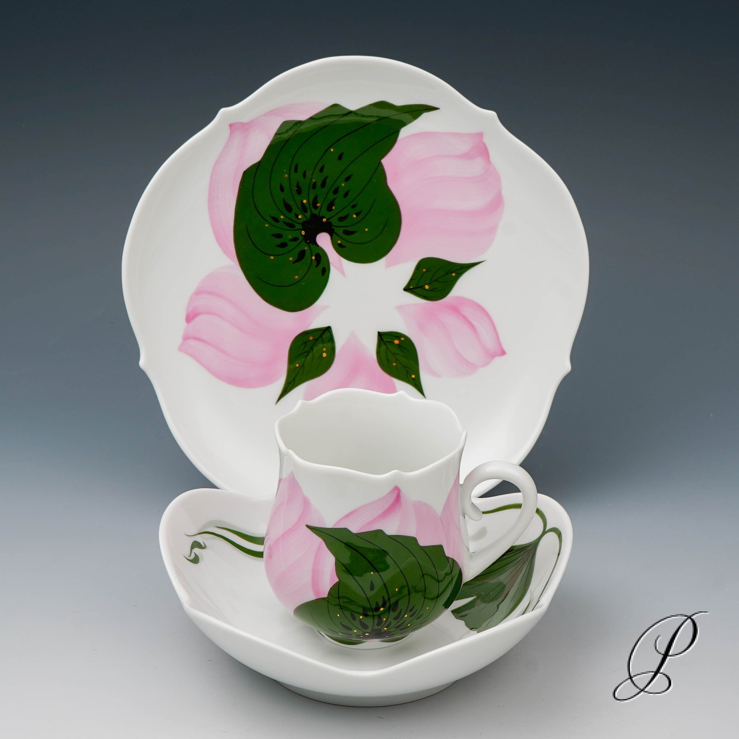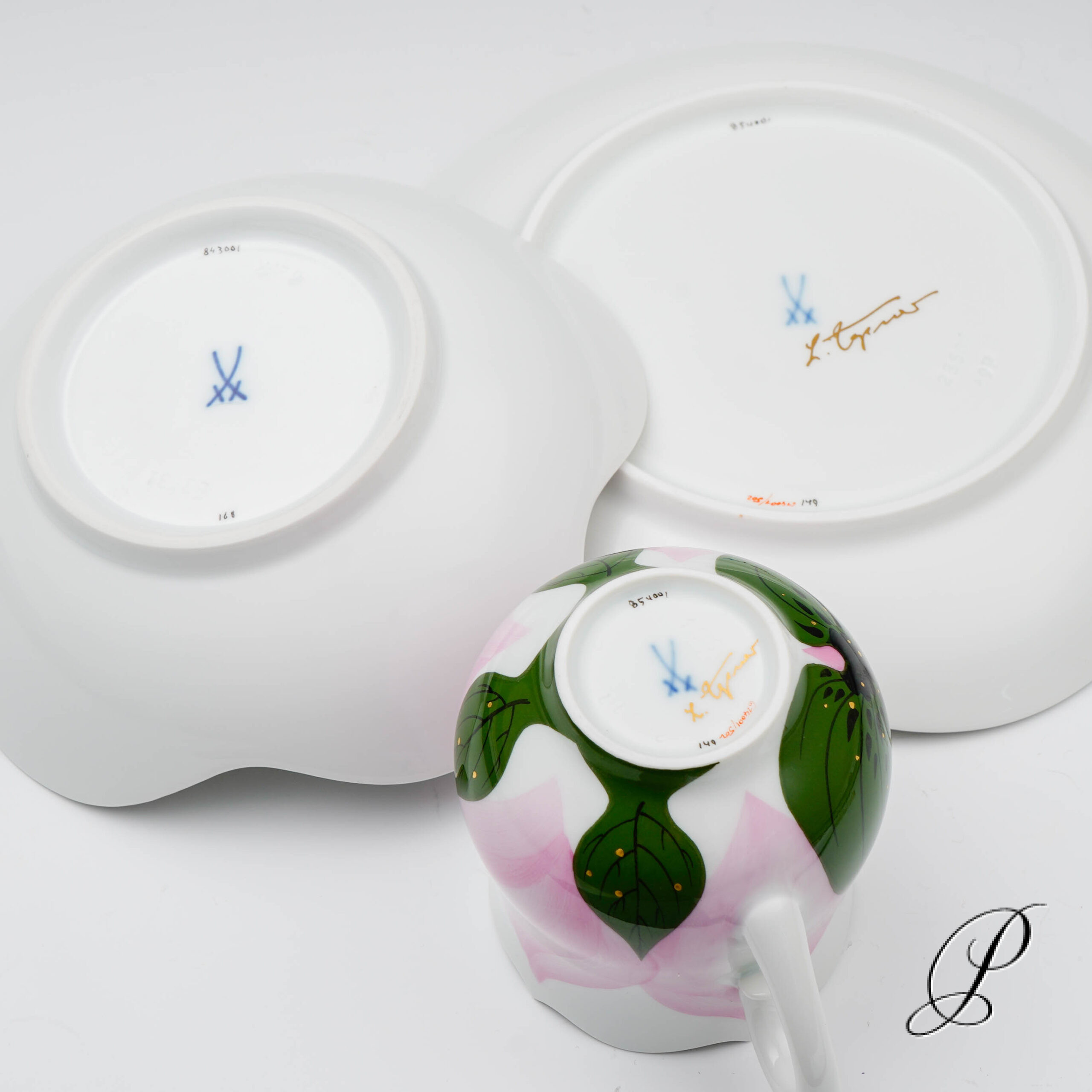 Dekor: Rose, kombiniert Unterglasur grün und Aufglasur purpur mit Goldrand. Dekornummer 614001. Maße: Tasse Durchmesser 6,5cm und Höhe 8cm. Untertasse Durchmesser 14,5cm. Kuchenteller 18,5cm.