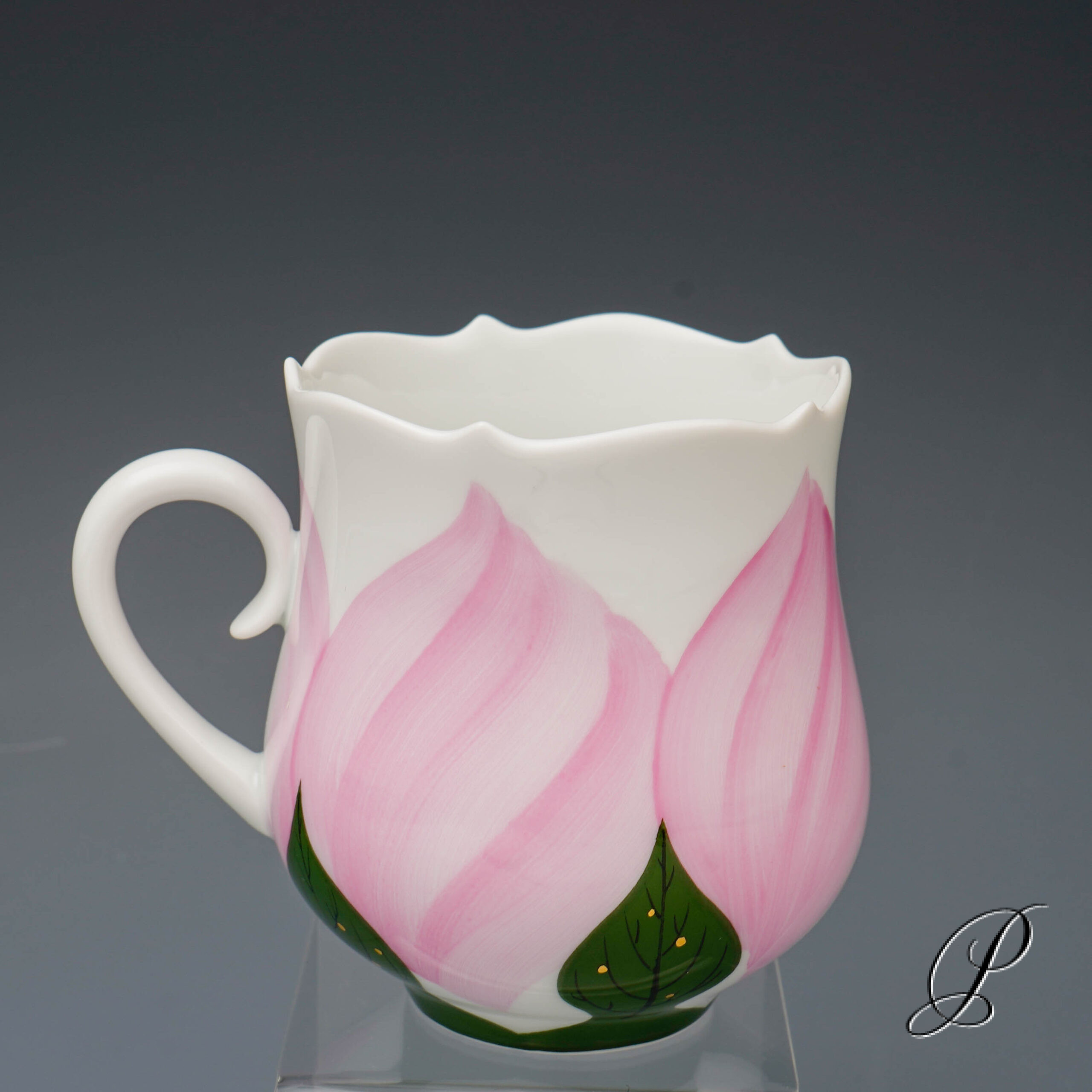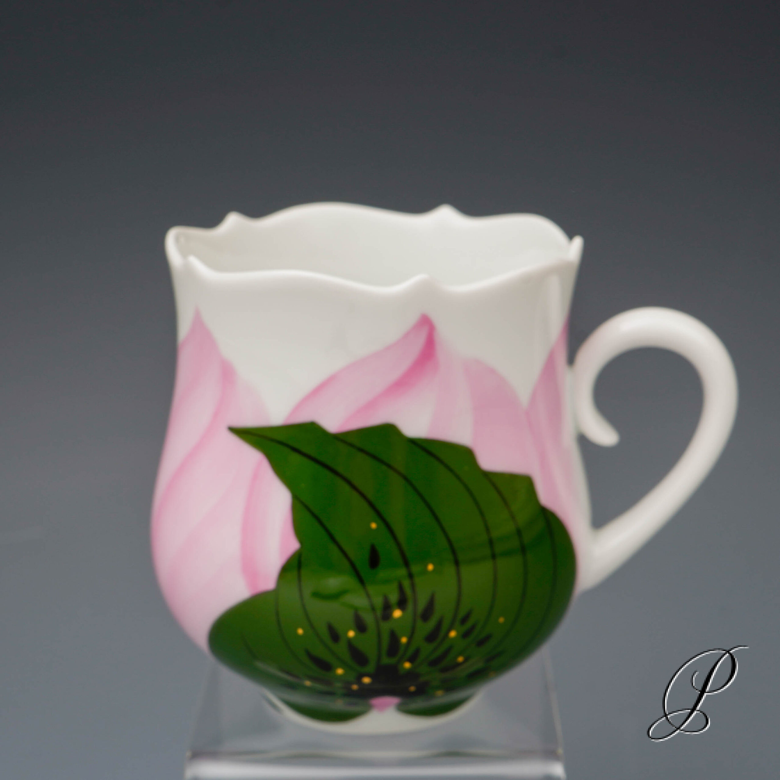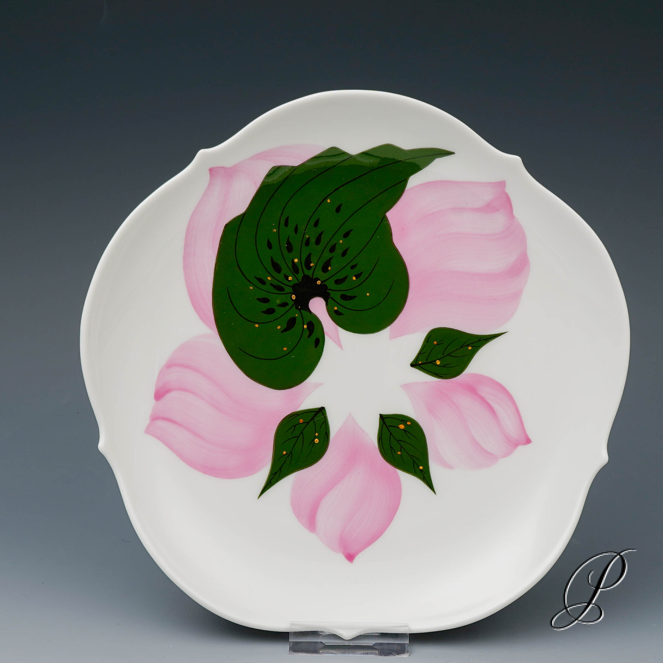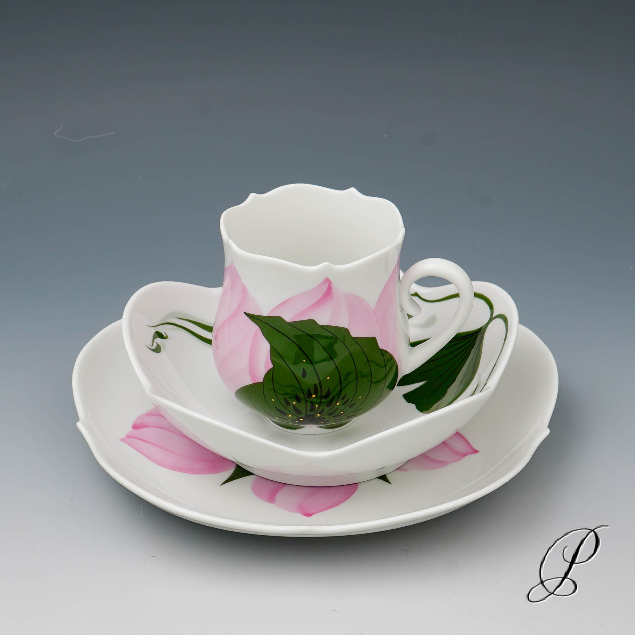 Dekor: Rose, kombiniert Unterglasur grün und Aufglasur purpur mit Goldrand. Dekornummer 614001. Maße: Tasse Durchmesser 6,5cm und Höhe 8cm. Untertasse Durchmesser 14,5cm. Kuchenteller 18,5cm.