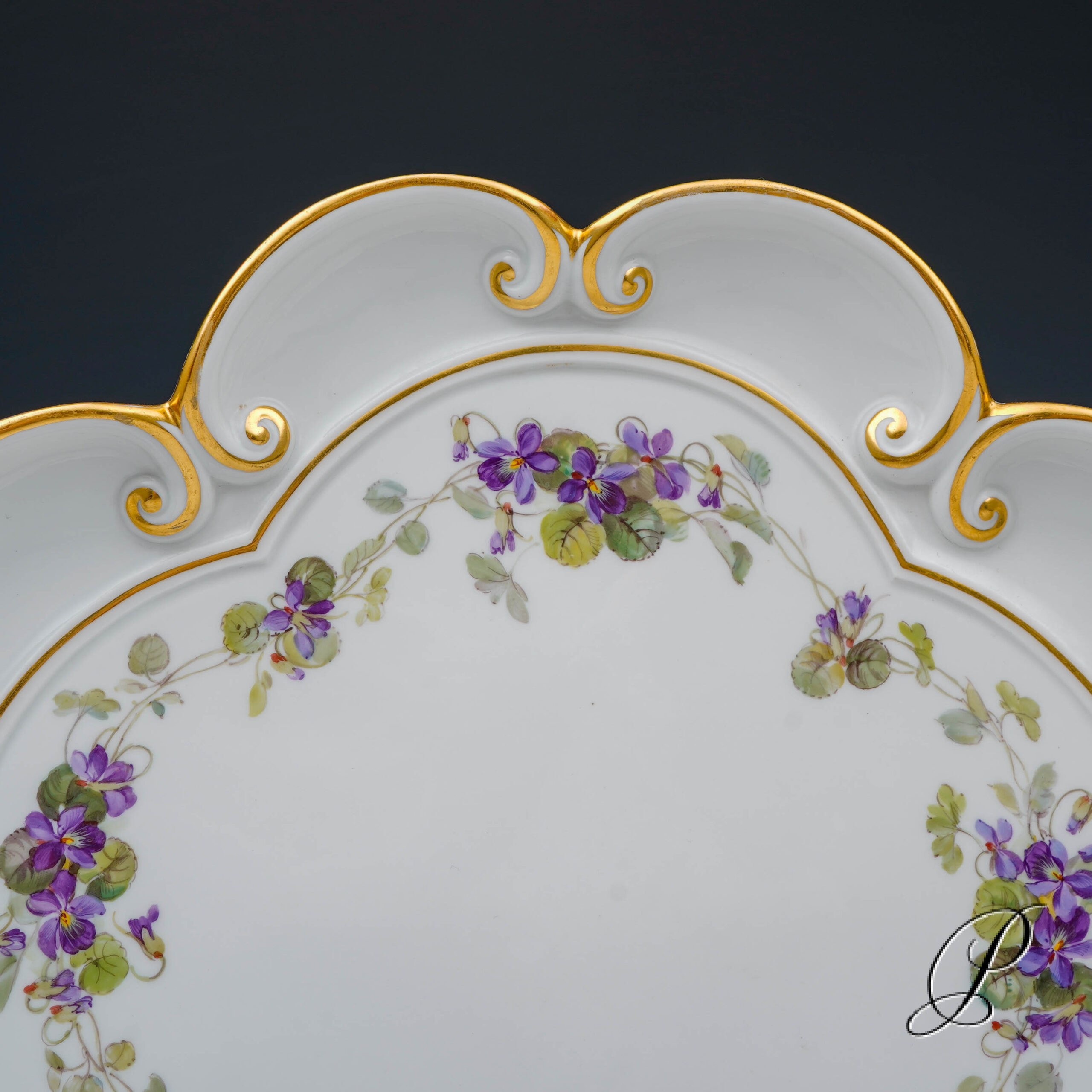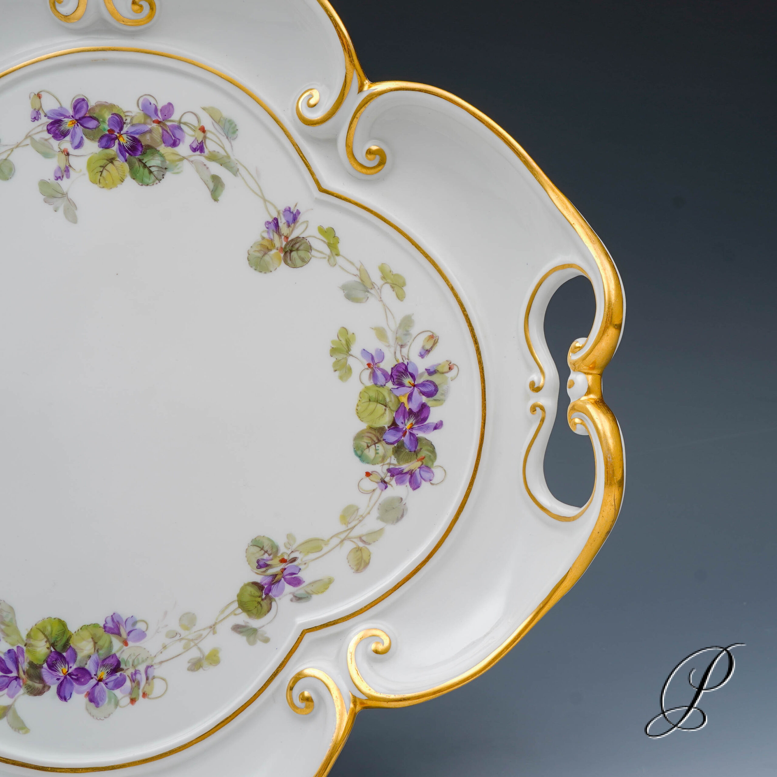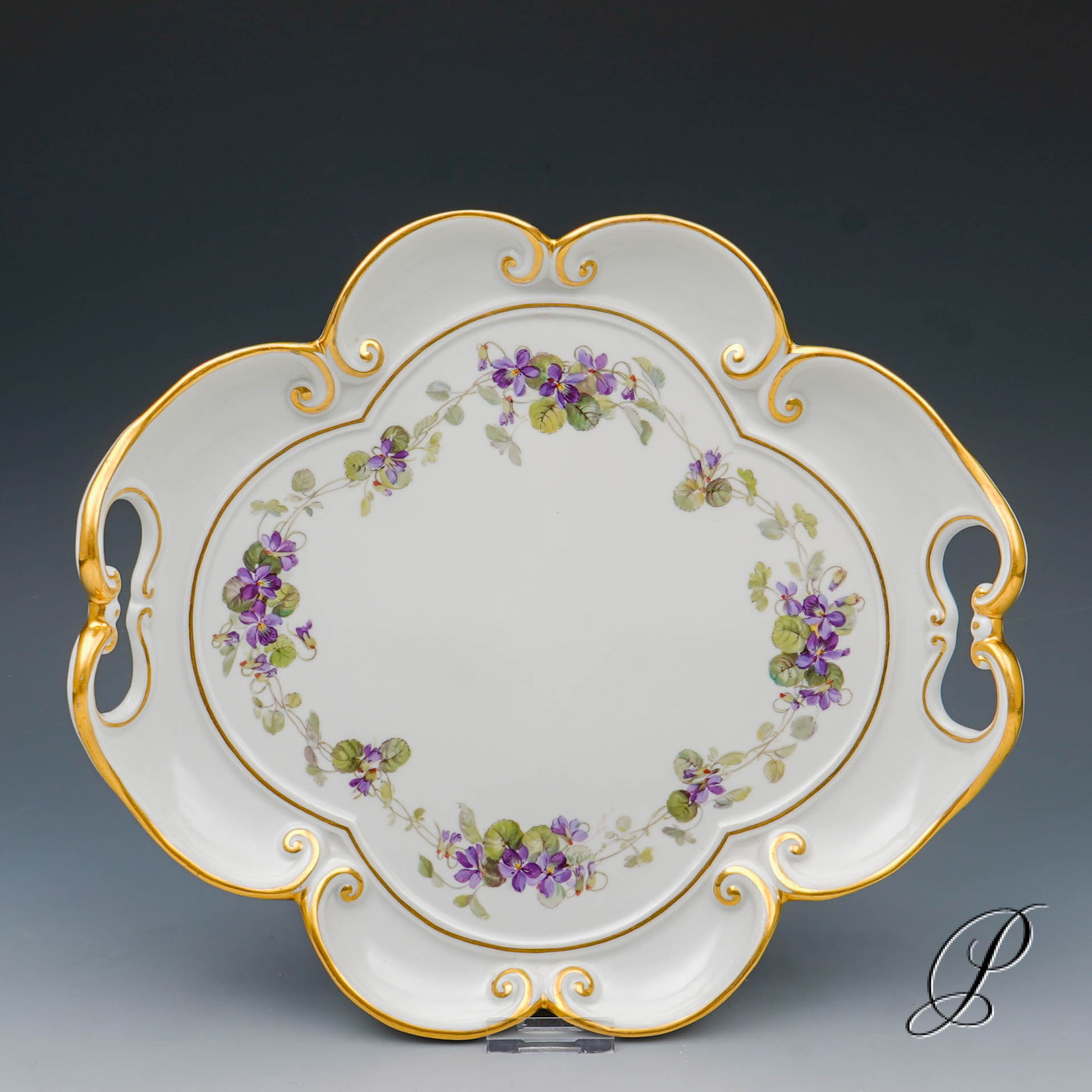 Wunderschönes Tablett mit geschwungenen Henkeln. Bemalt mit einer Girlande aus Veilchen. In dieser Ausführung sehr selten!!