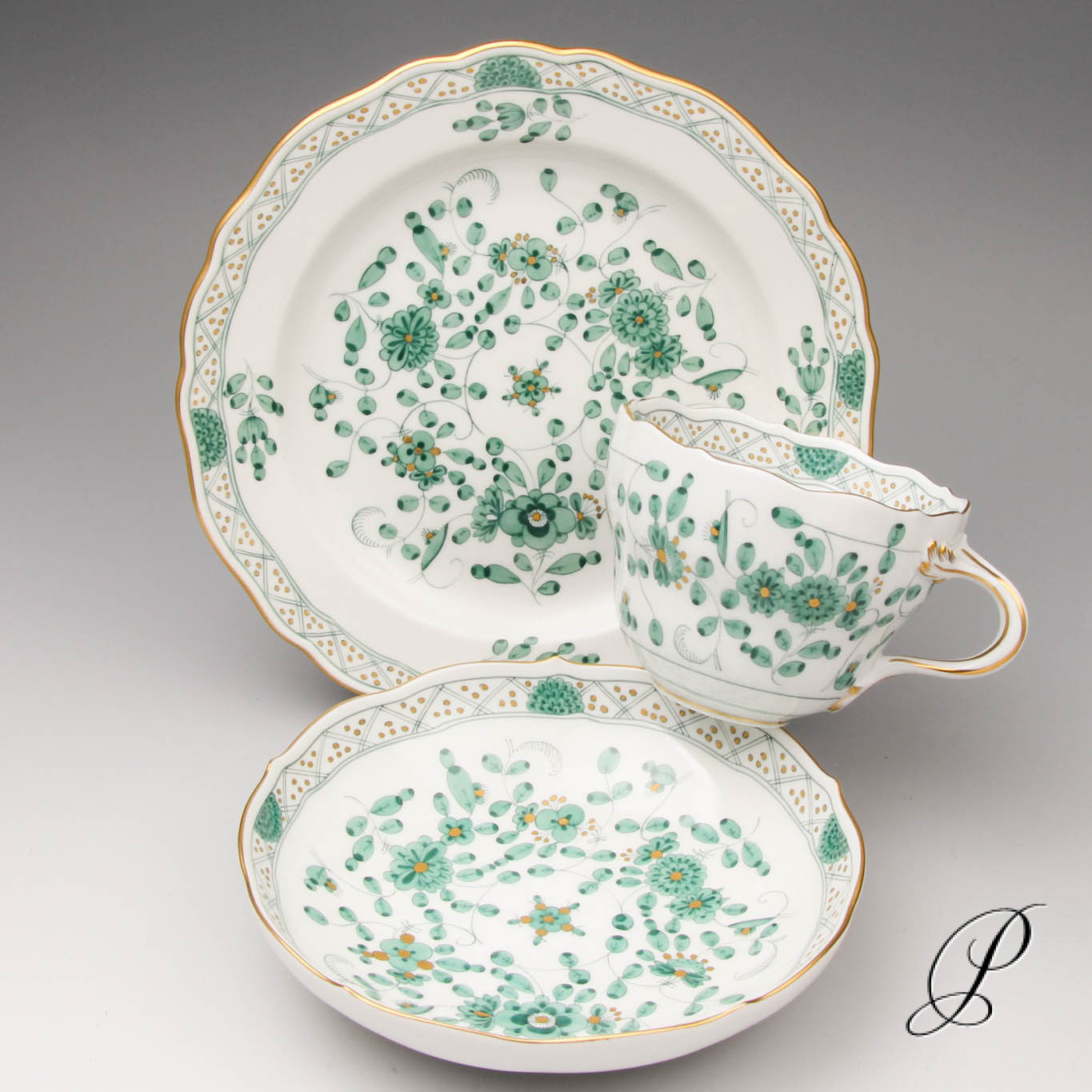 Dekor: reiche Indische Malerei grün, Goldpunkte und Goldrand. Dekornummer: 343310.
