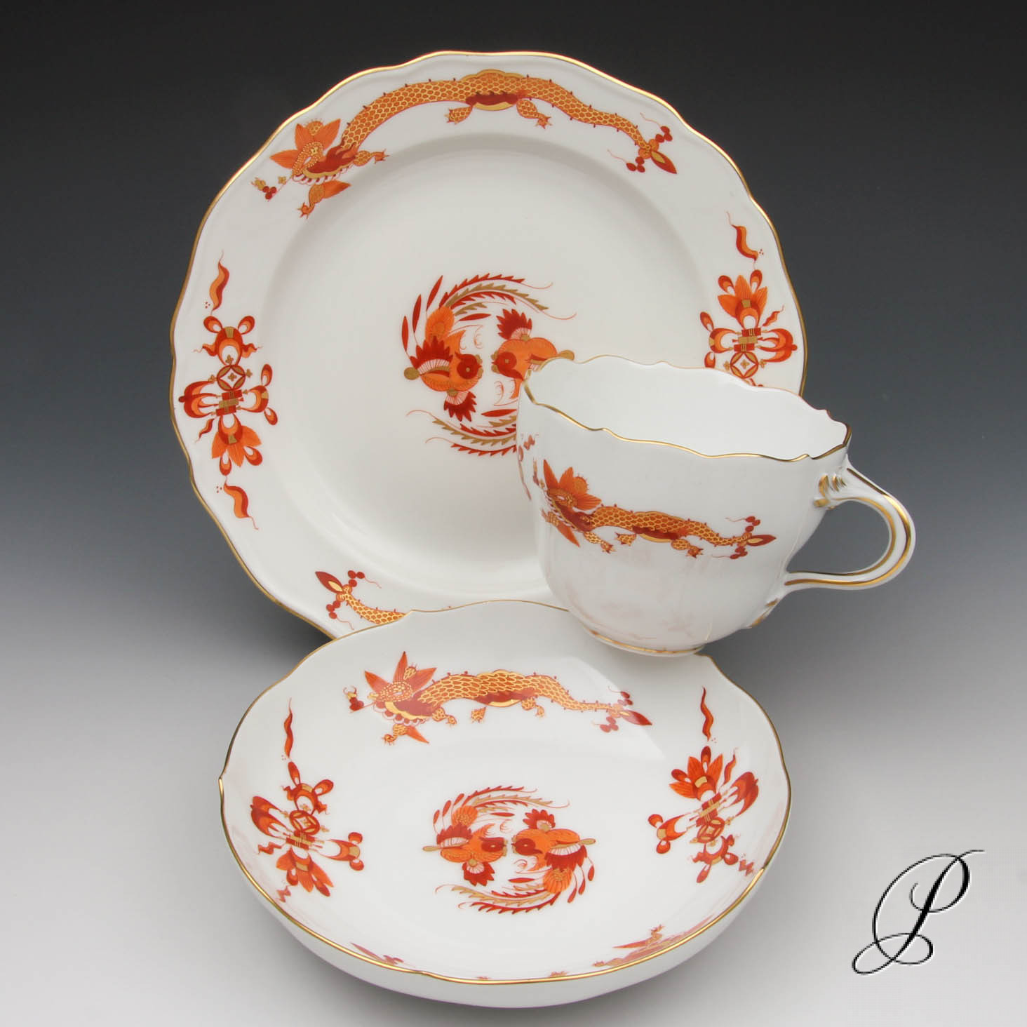Dekor: Reicher Drache rot, goldschattiert mit Goldrand.