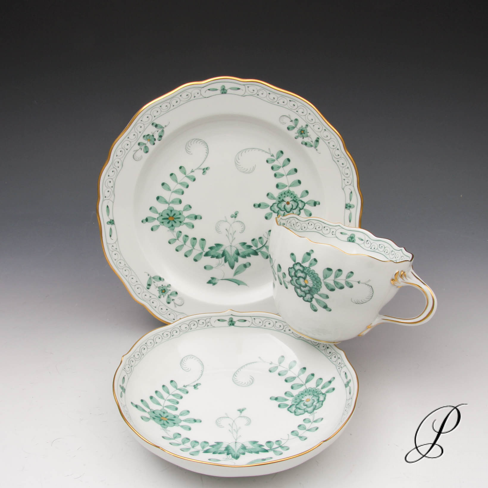 Dekor: Indische Malerei2 mit Kante, grün, Goldpunkte und Goldrand. Dekornummer: 340310.