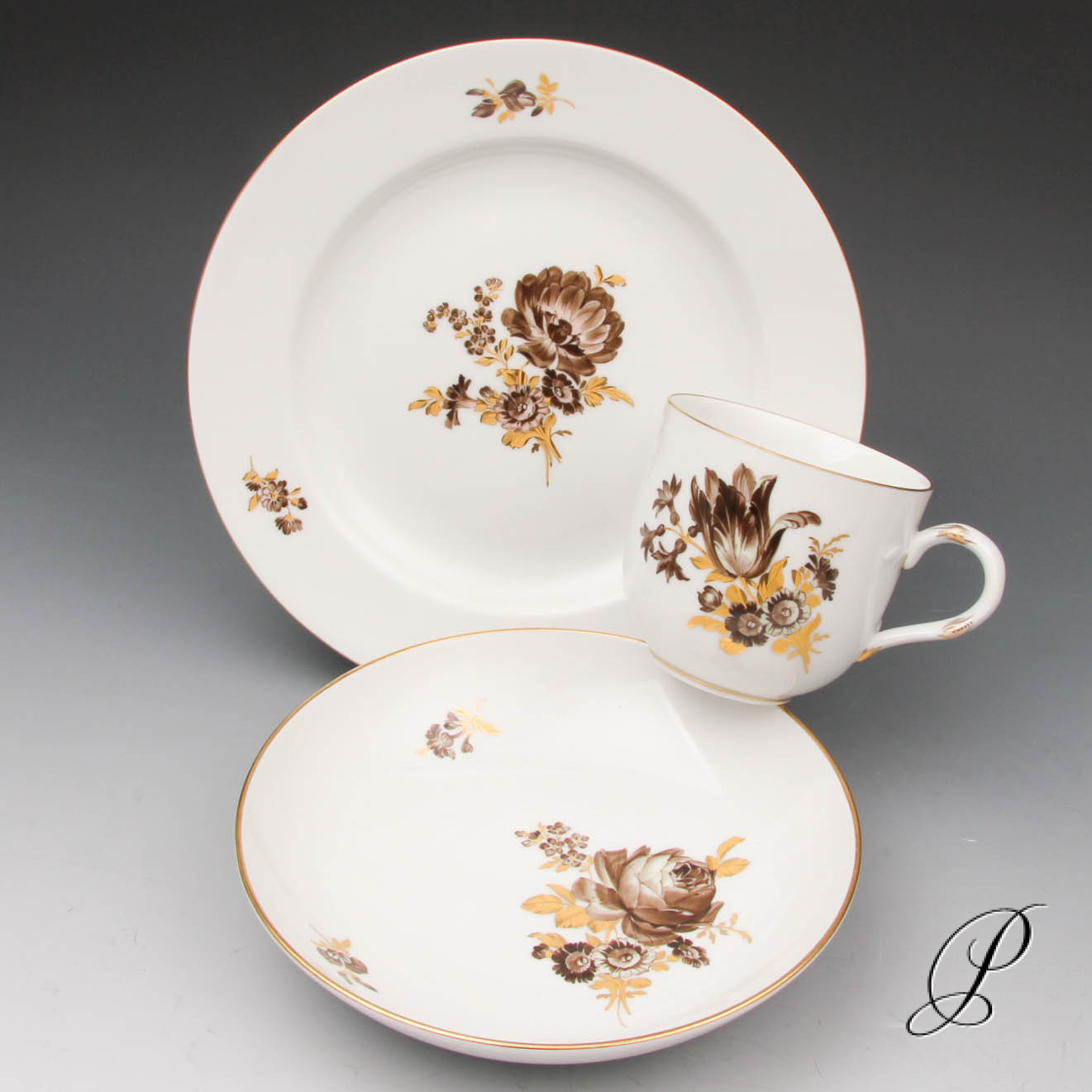 Dekor: Blumenmalerei in sepia, goldgravierte Blätter, Marcolini Malweise und Goldrand.