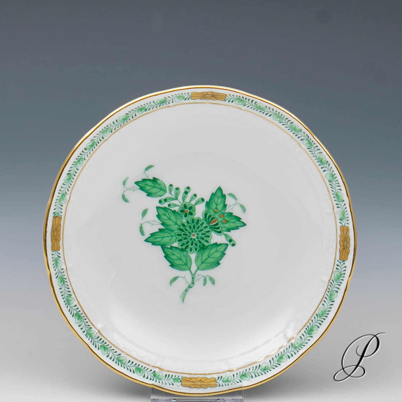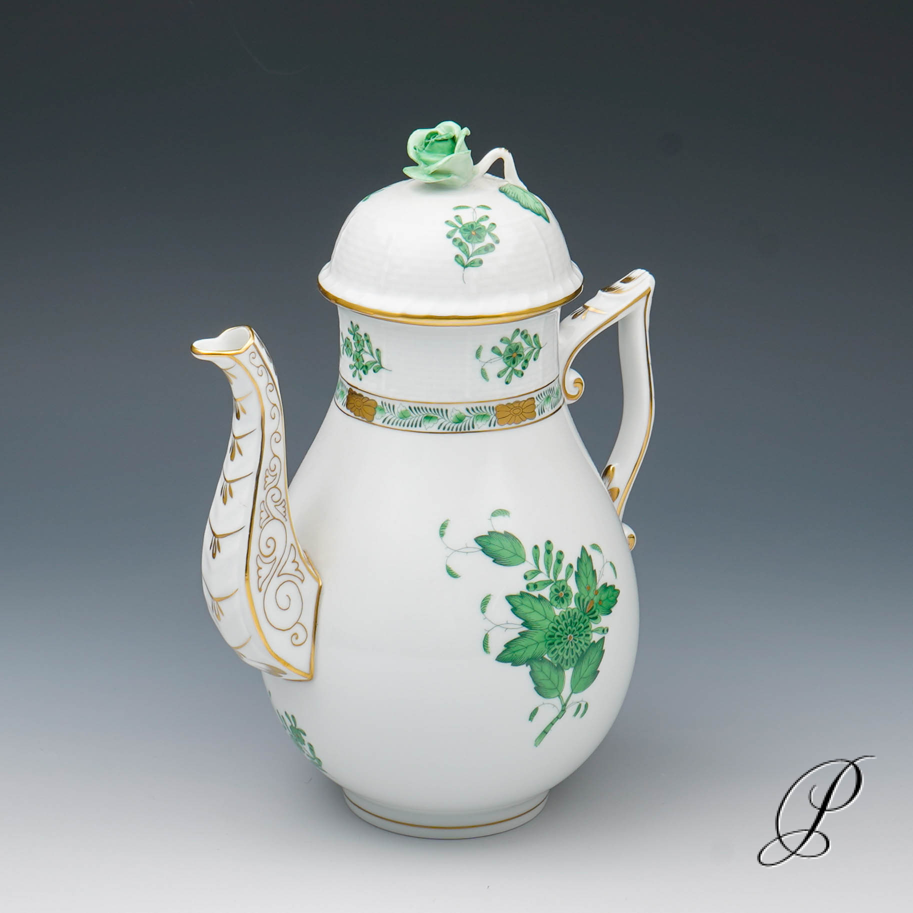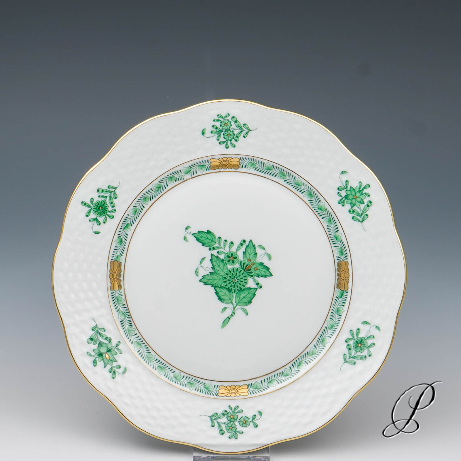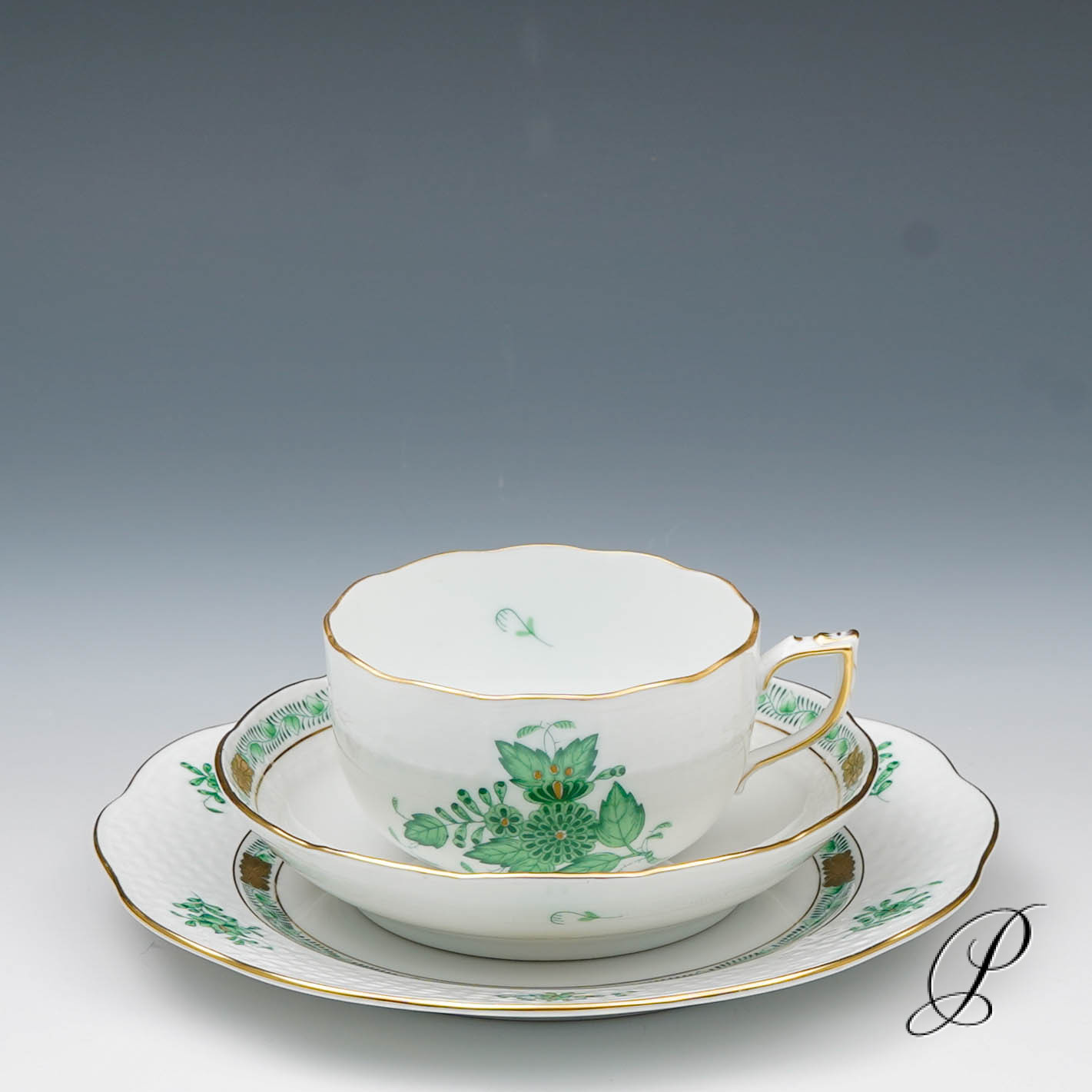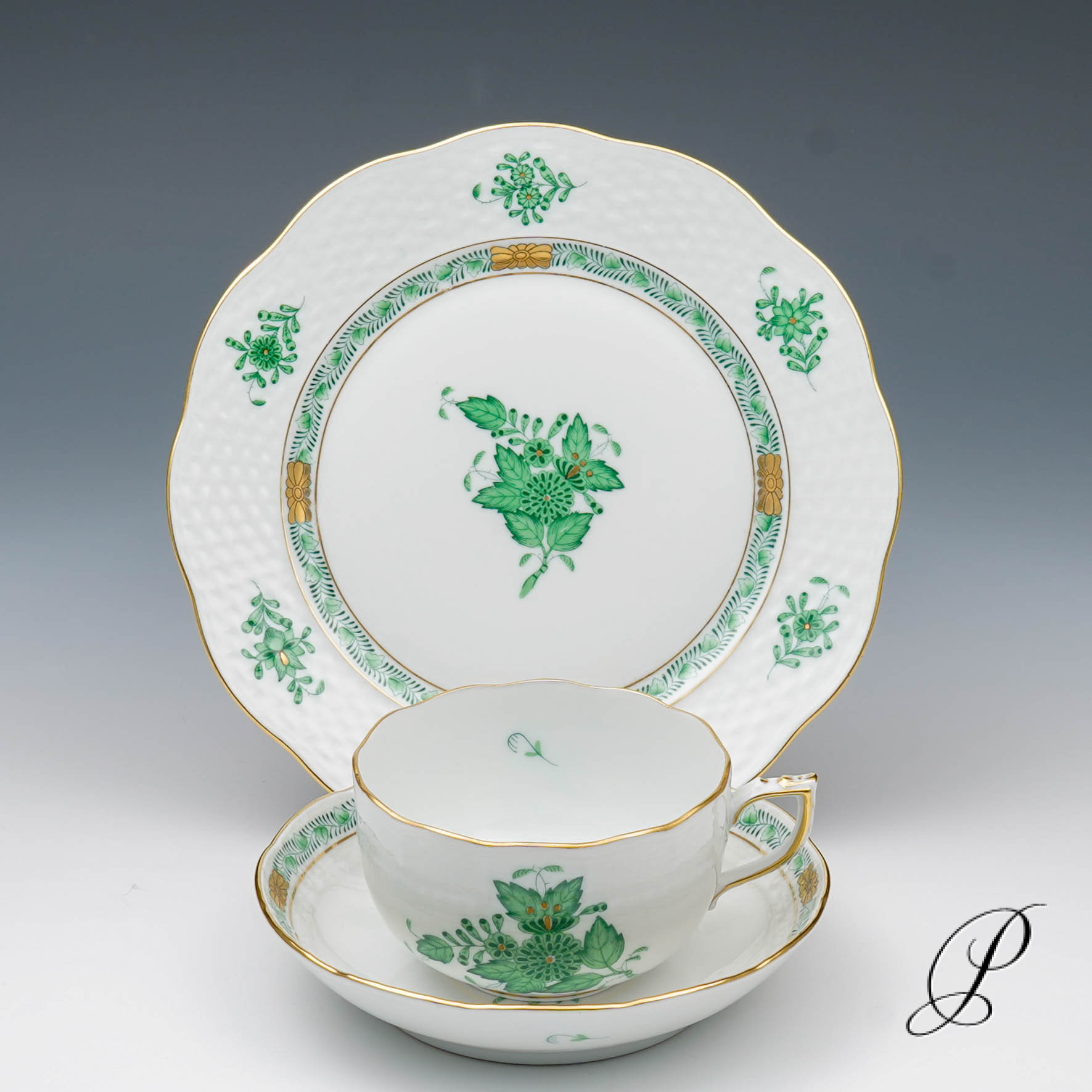 Das Dekor Apponyi gibt es in verschiedenen Farbvarianten. Der Name verbindet sich mit dem Grafen Albert Apponyi, der dieses Motiv in der Herend Manufaktur bestellte. Das Dekor wurde in Anlehnung an das fernöstliche Motiv „Indischer Blumenkorb“ entworfen. Eine stilisierte Pfingstrose in Konturmalerei welche von 6 Streumotiven und einer Girlande aus stilisierten Blättern umgeben ist.