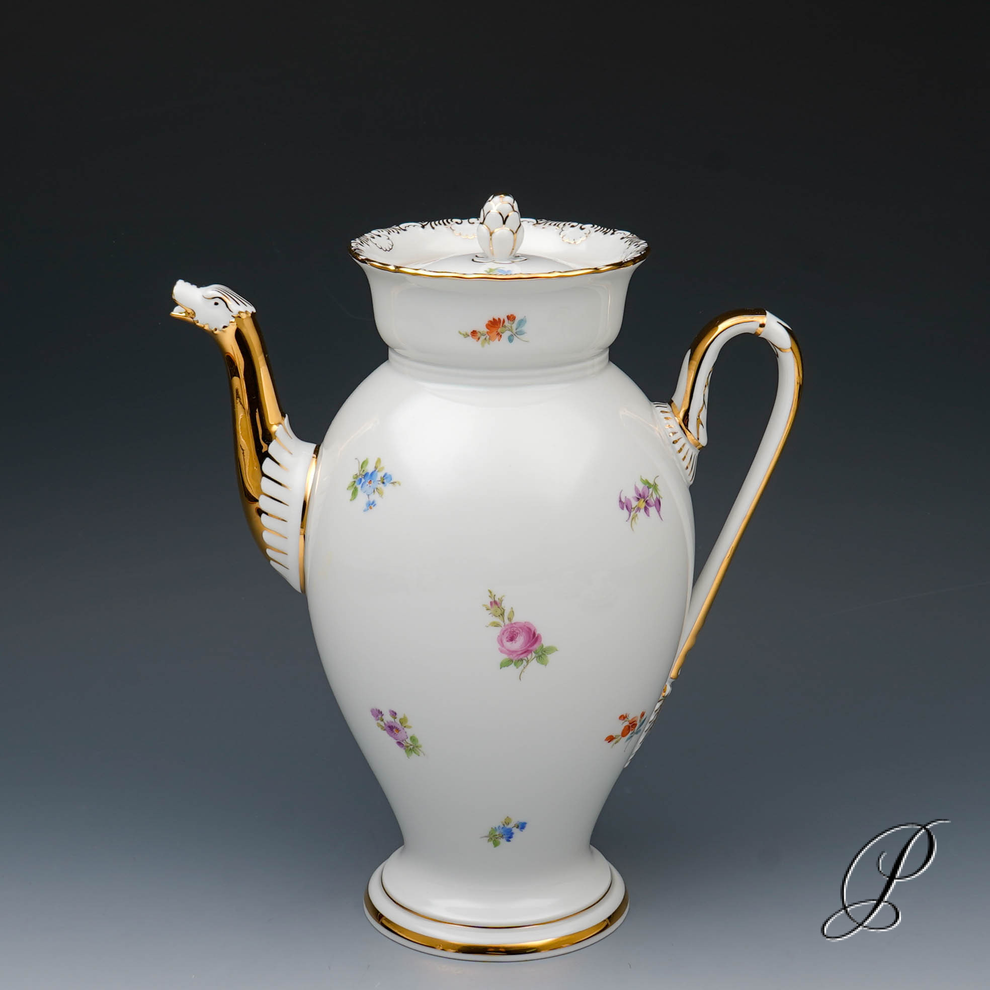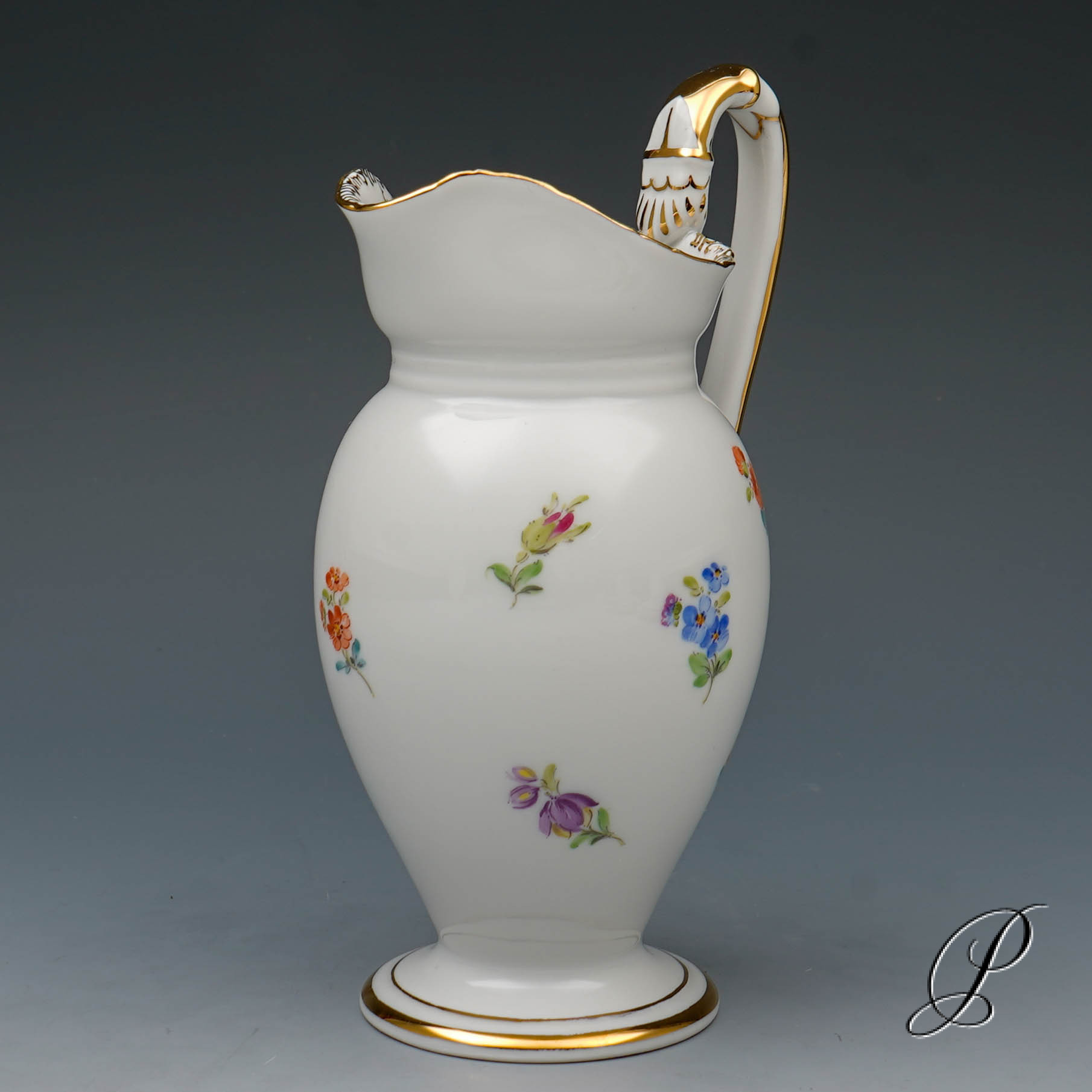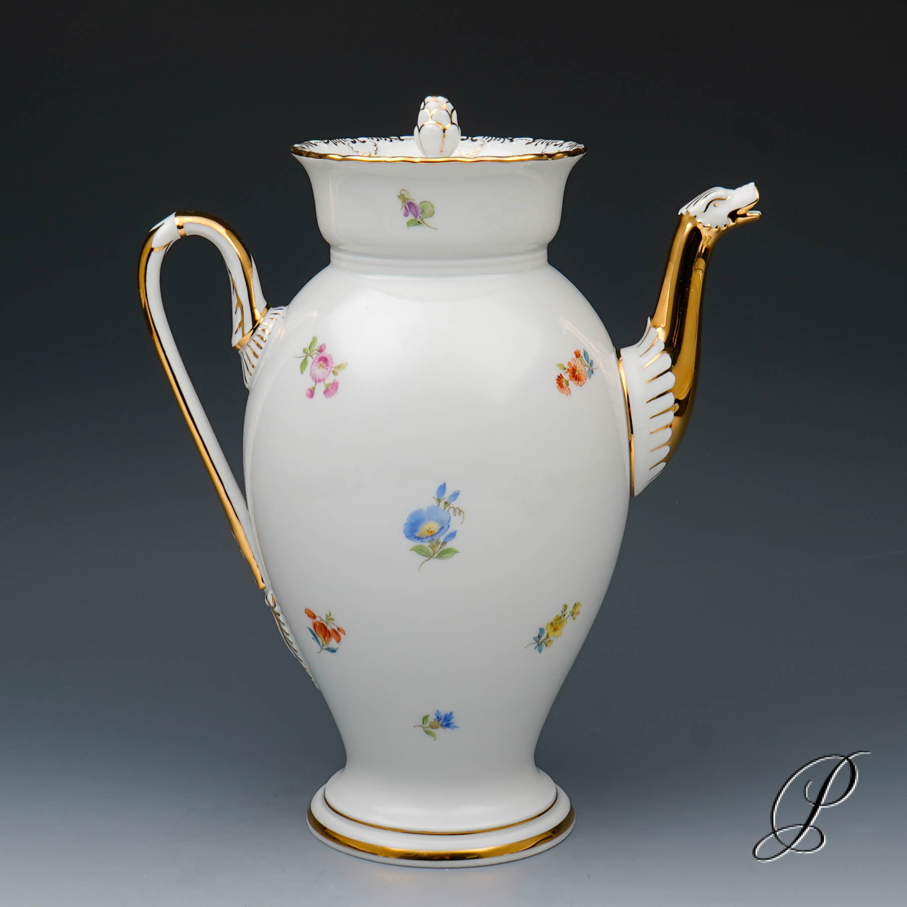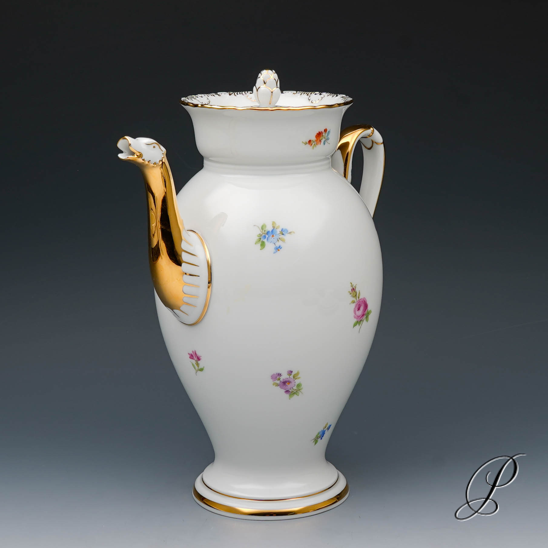 Dekor: Streublume. Sehr aufwedig vergoldete Ornamente. Tierkopfausguss an der Kanne.