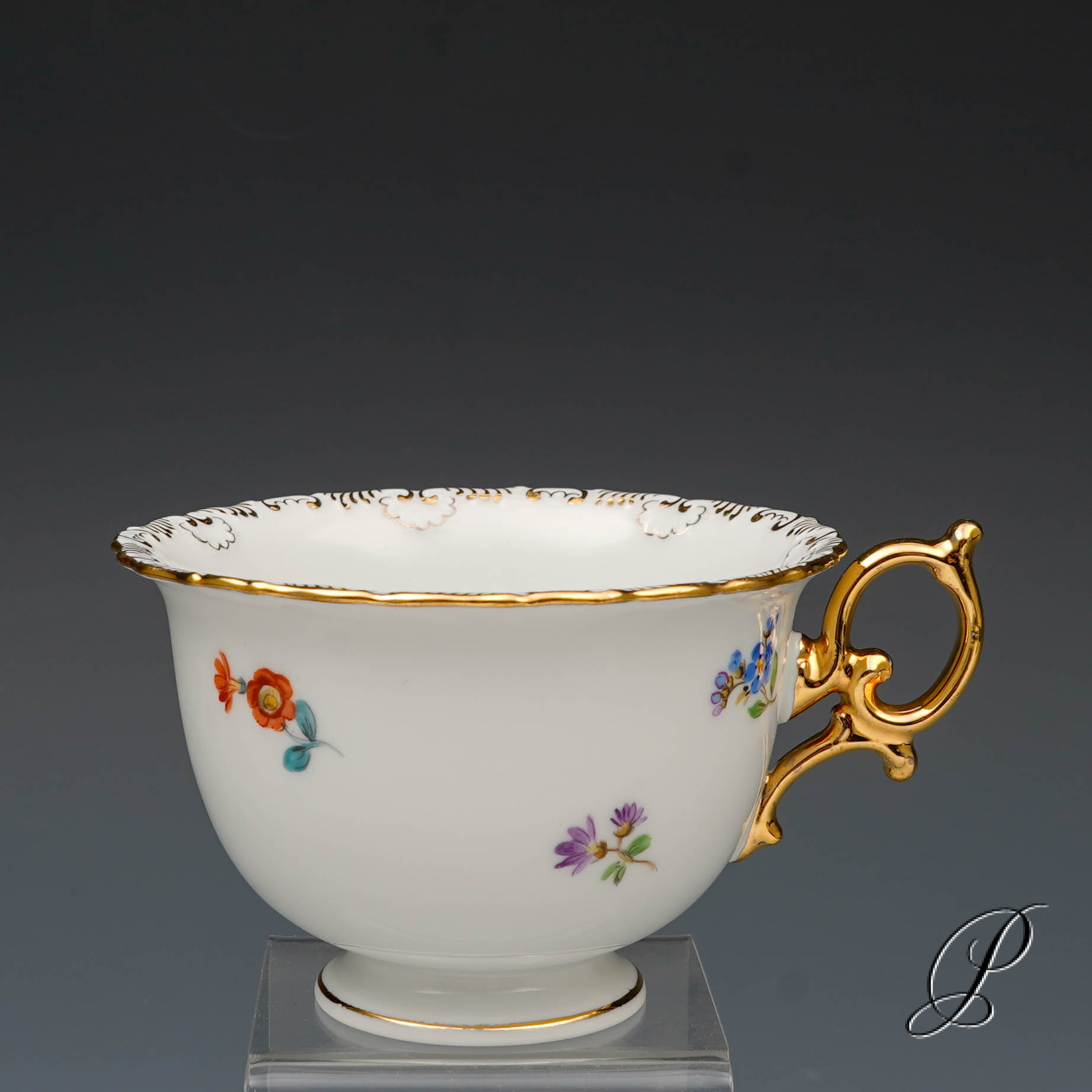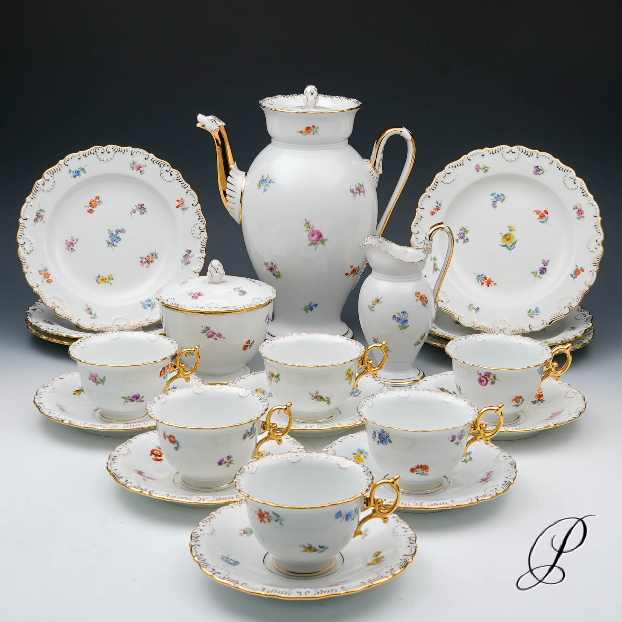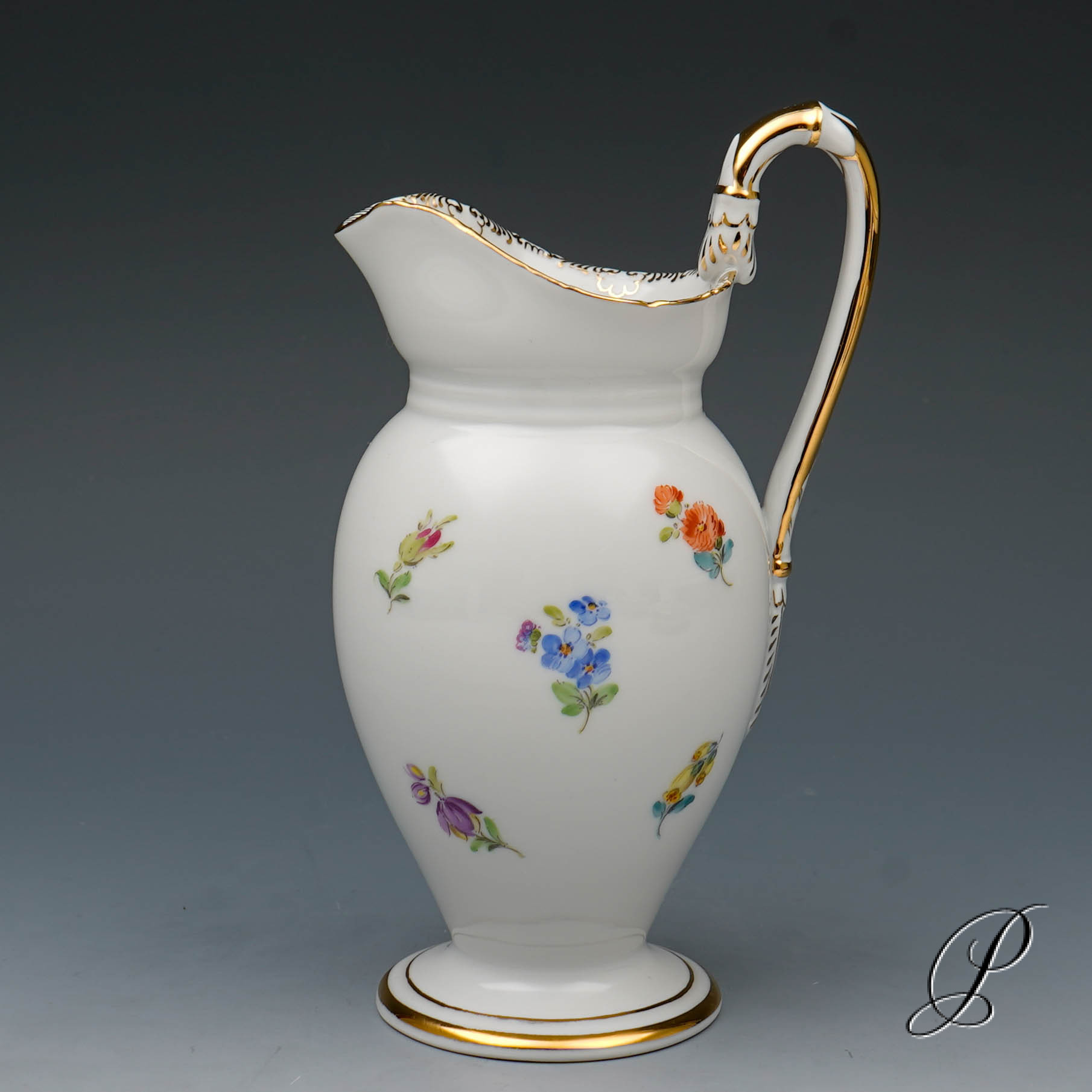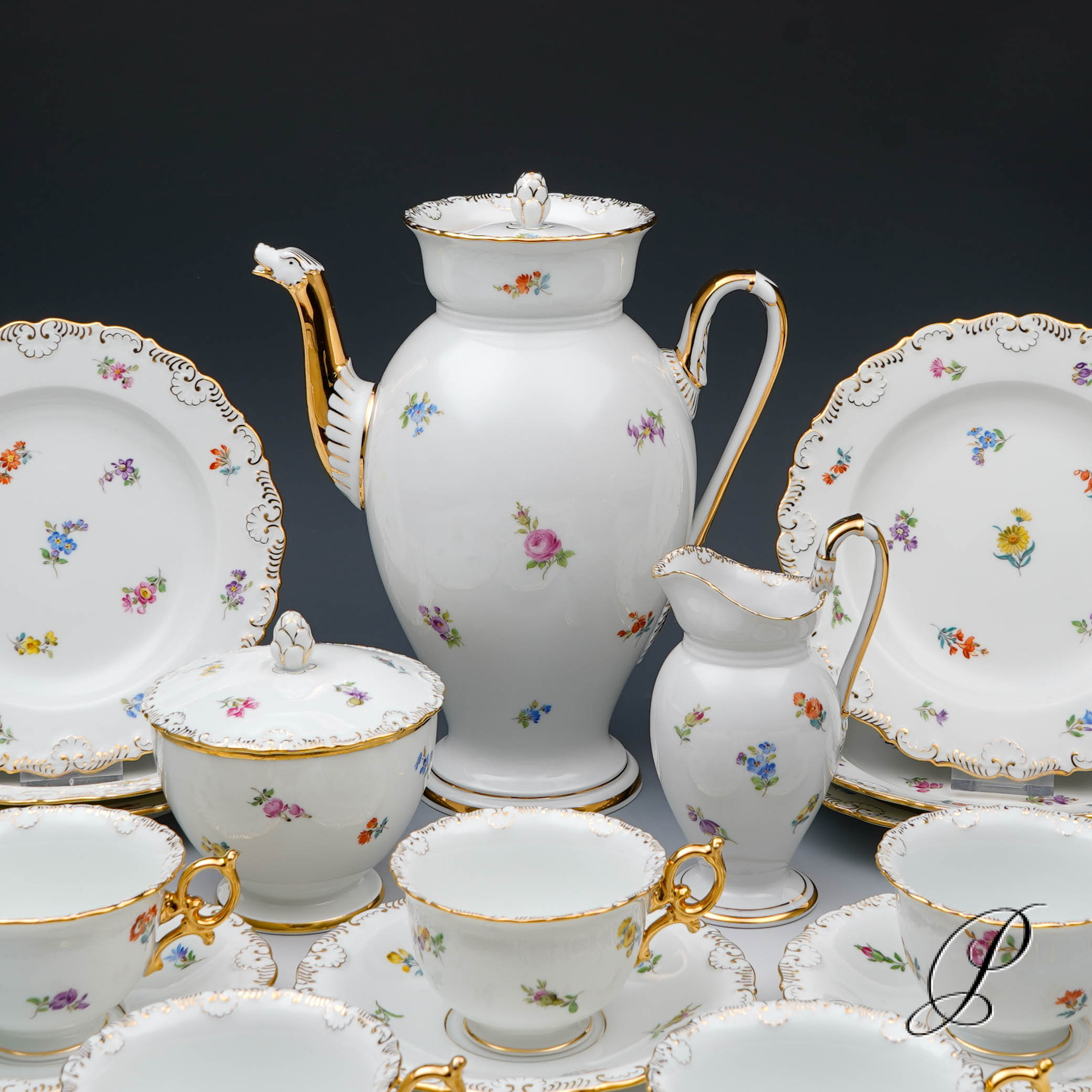 Dekor: Streublume. Sehr aufwedig vergoldete Ornamente. Tierkopfausguss an der Kanne.