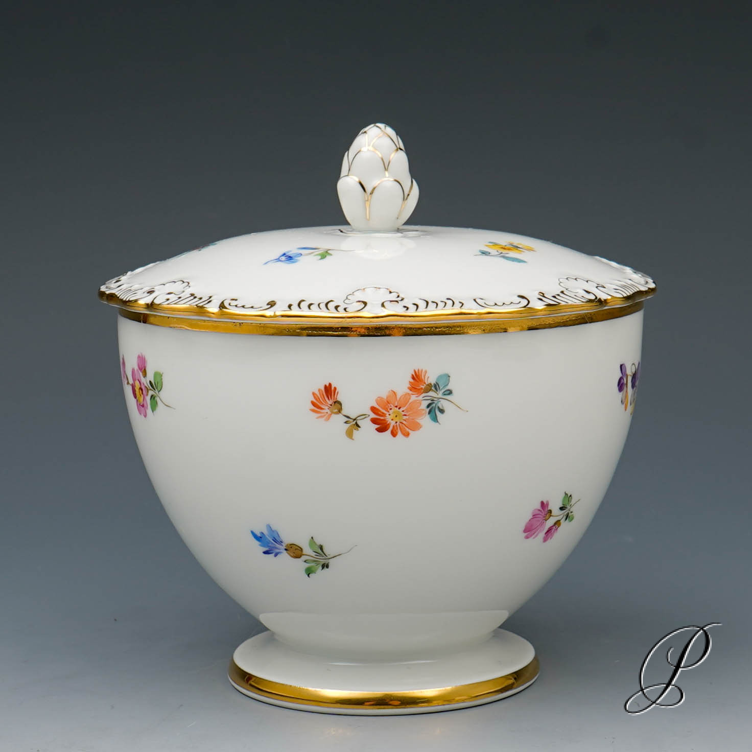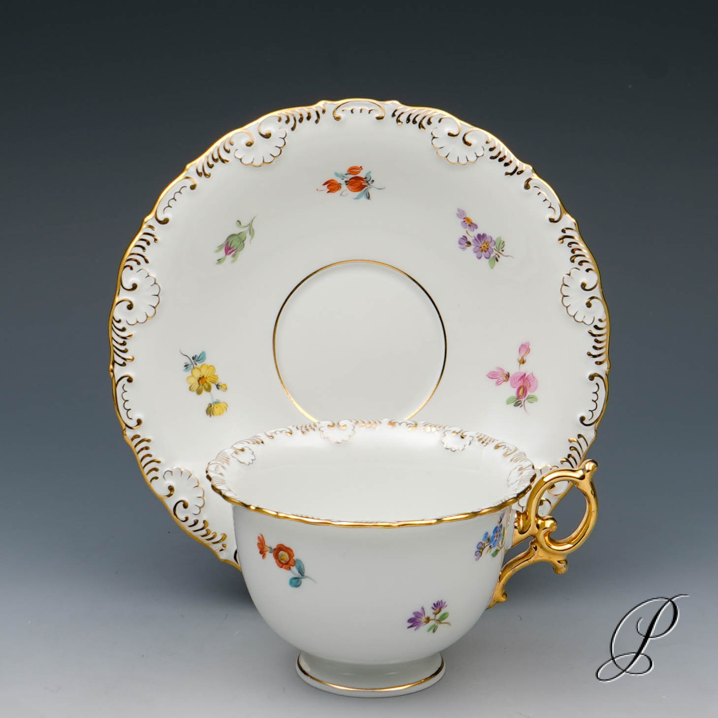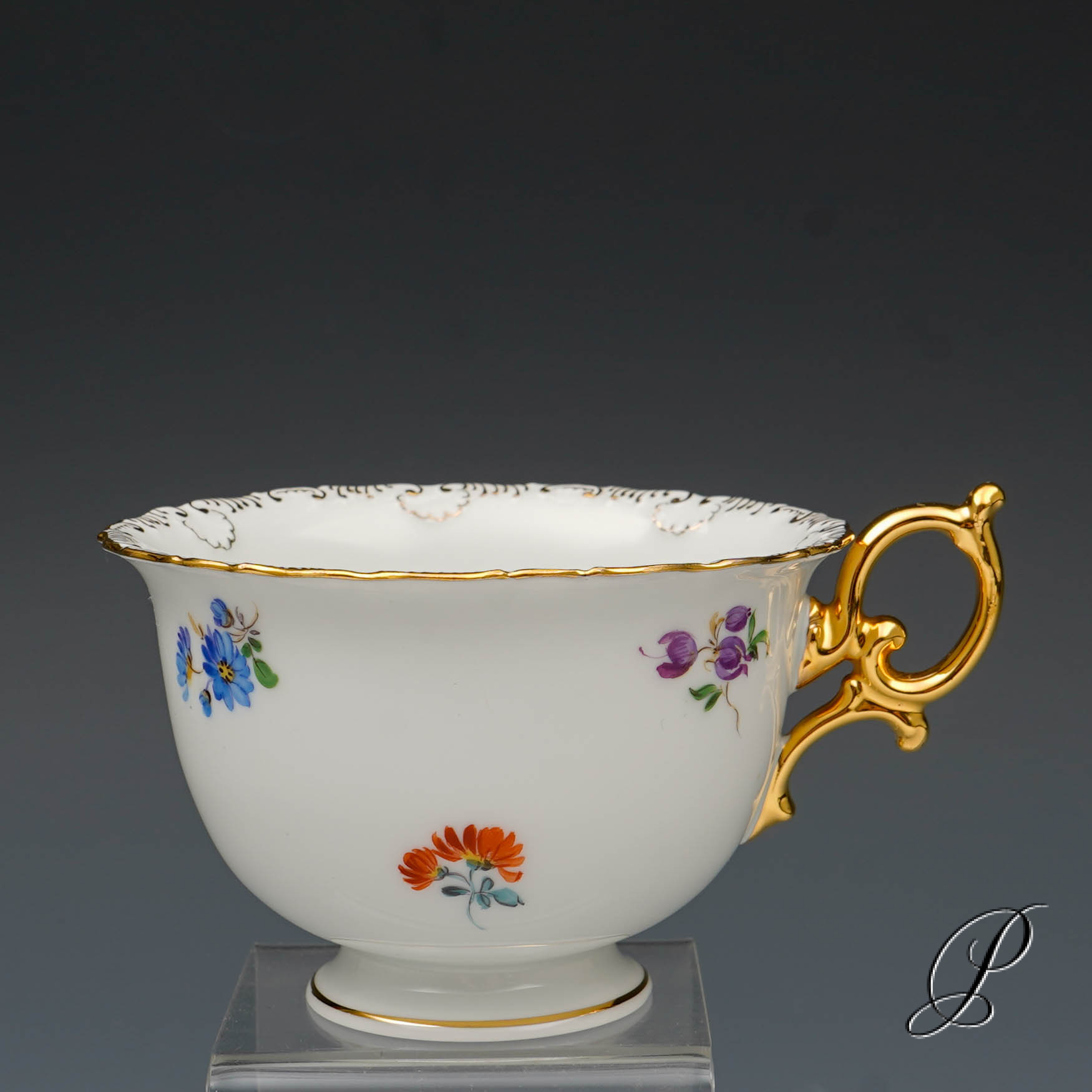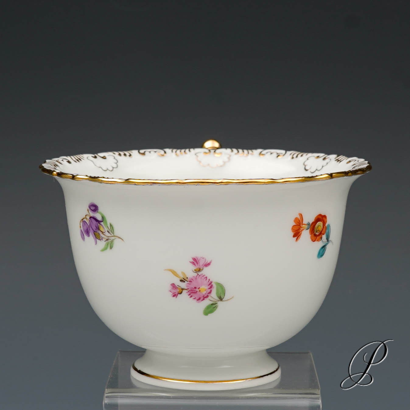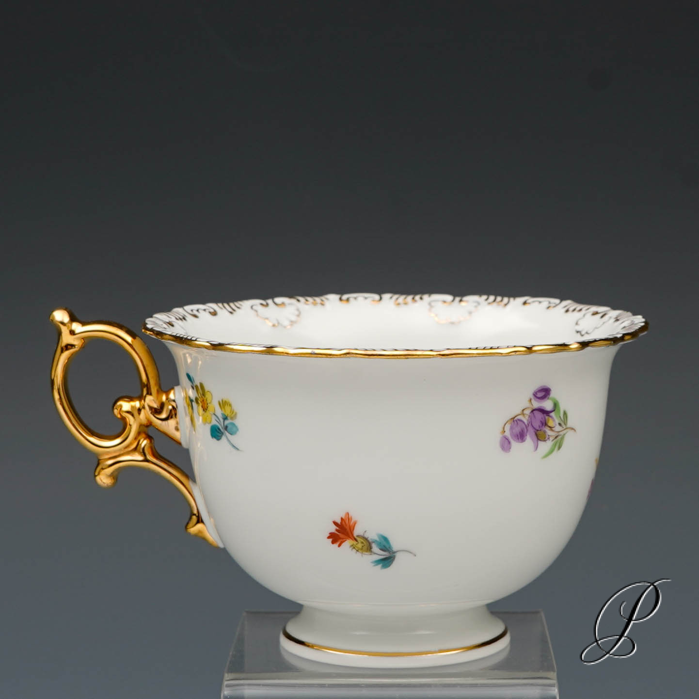 Dekor: Streublume. Sehr aufwedig vergoldete Ornamente. Tierkopfausguss an der Kanne.