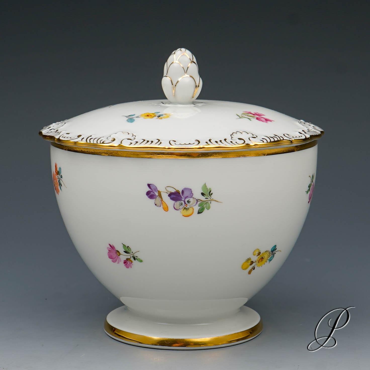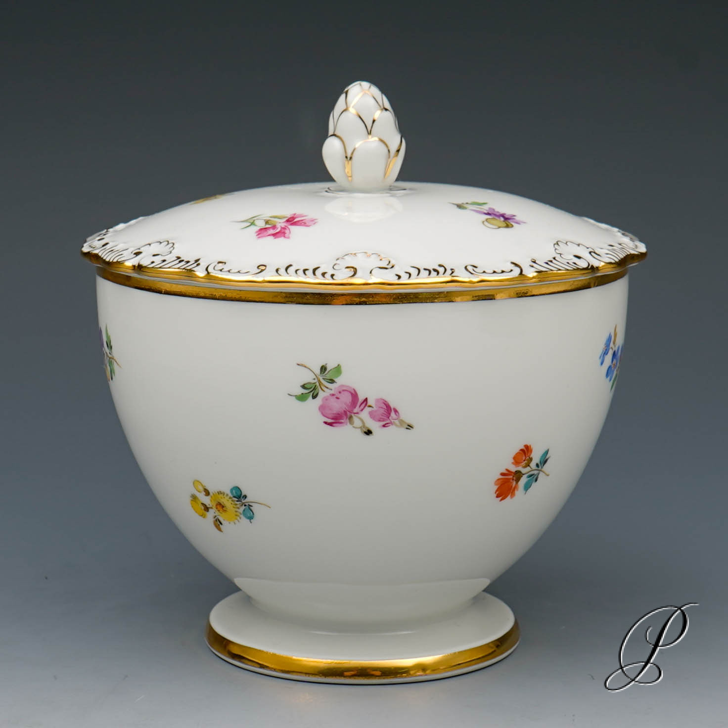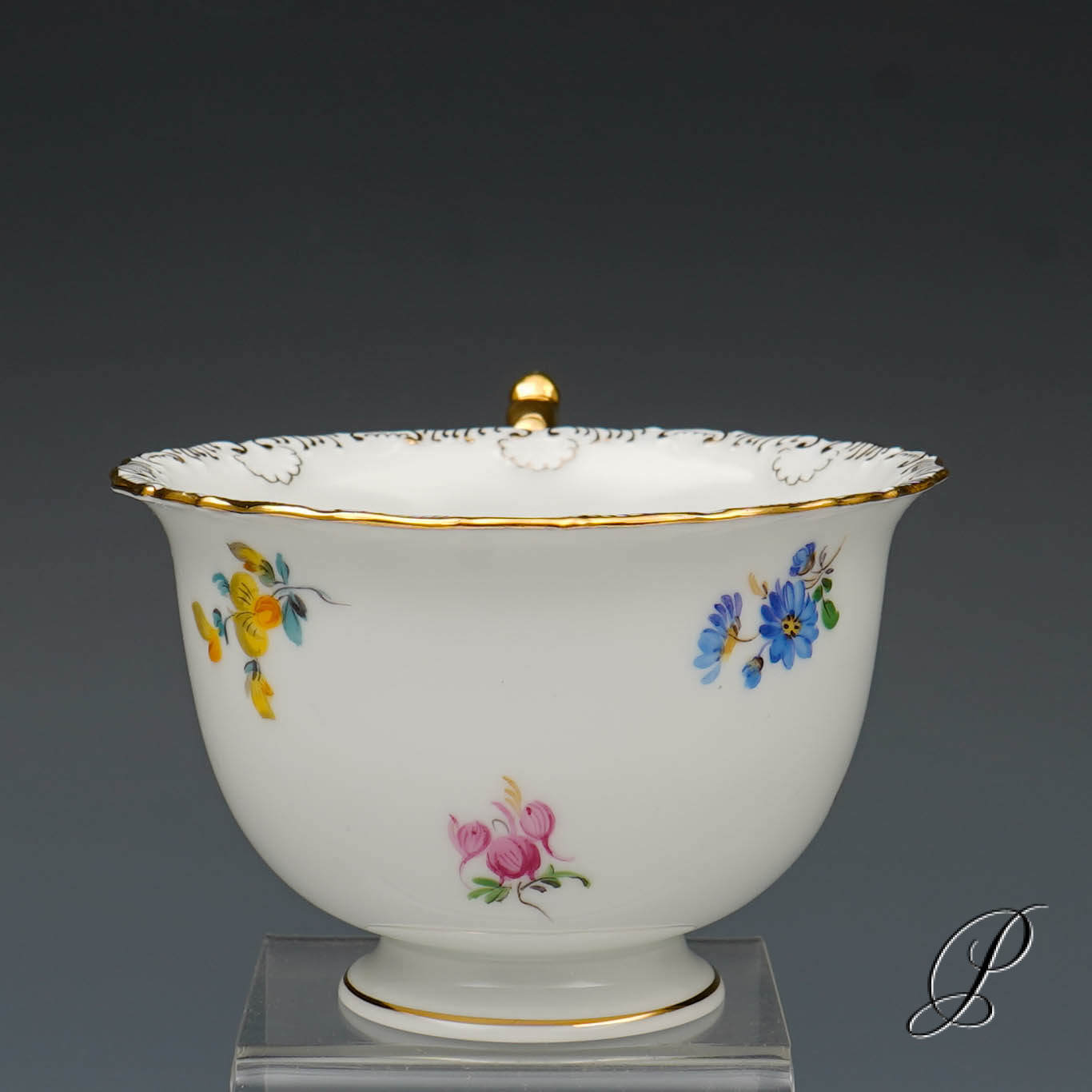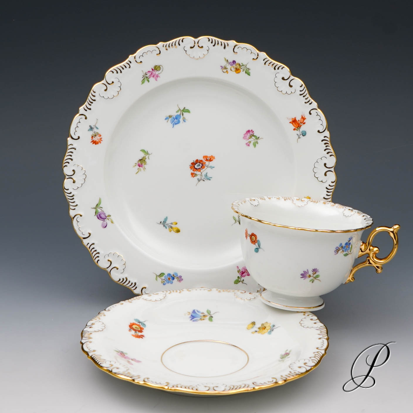 Dekor: Streublume. Sehr aufwedig vergoldete Ornamente. Tierkopfausguss an der Kanne.