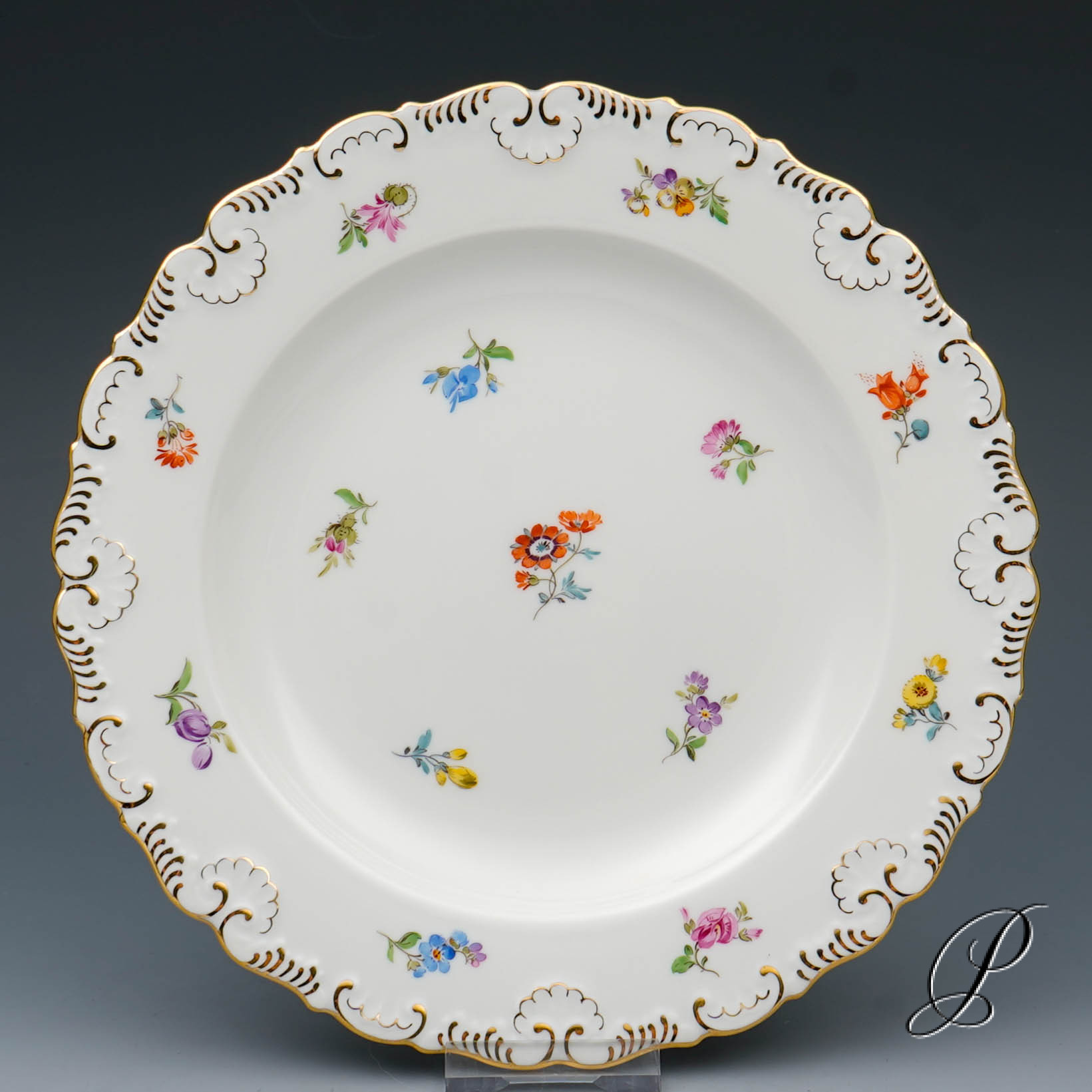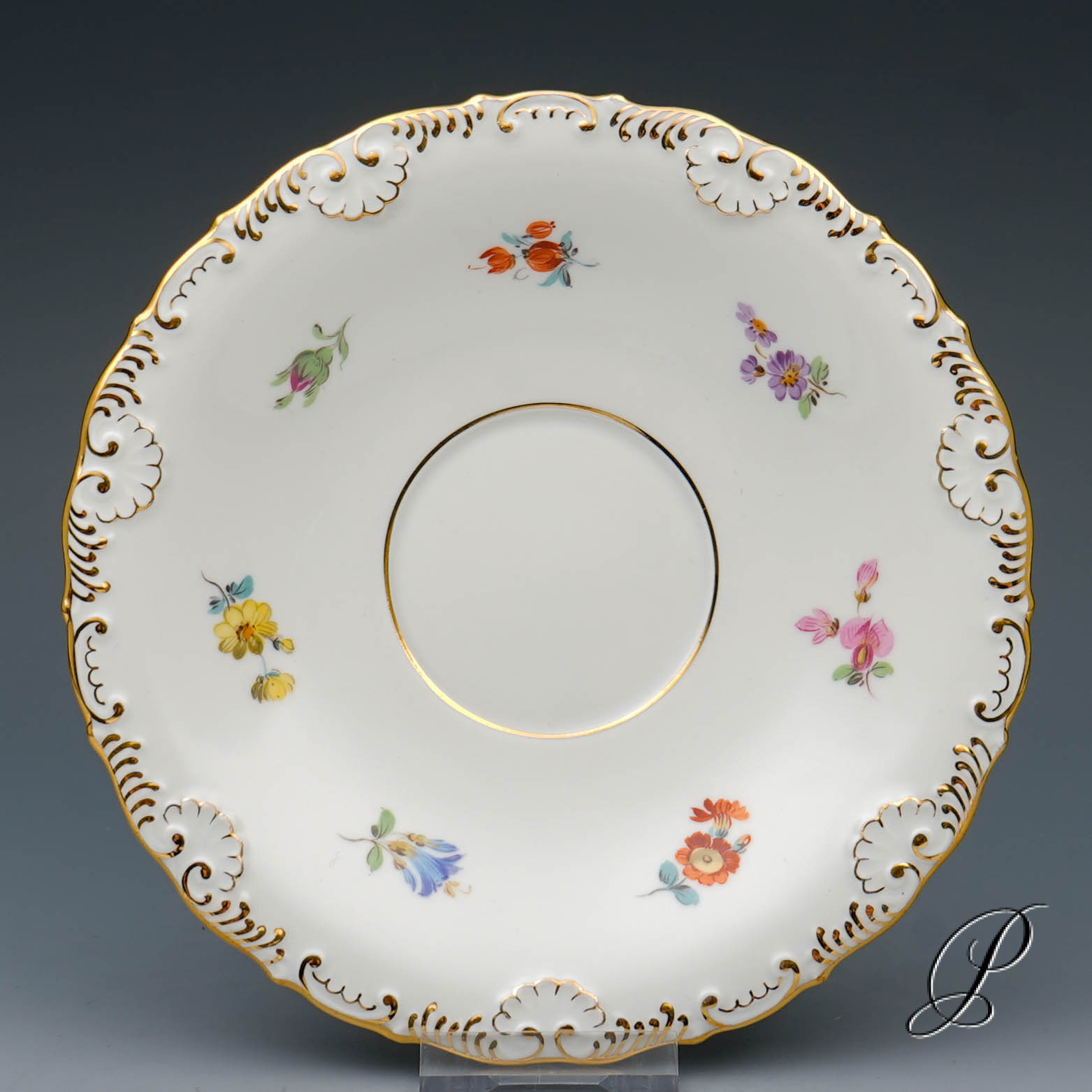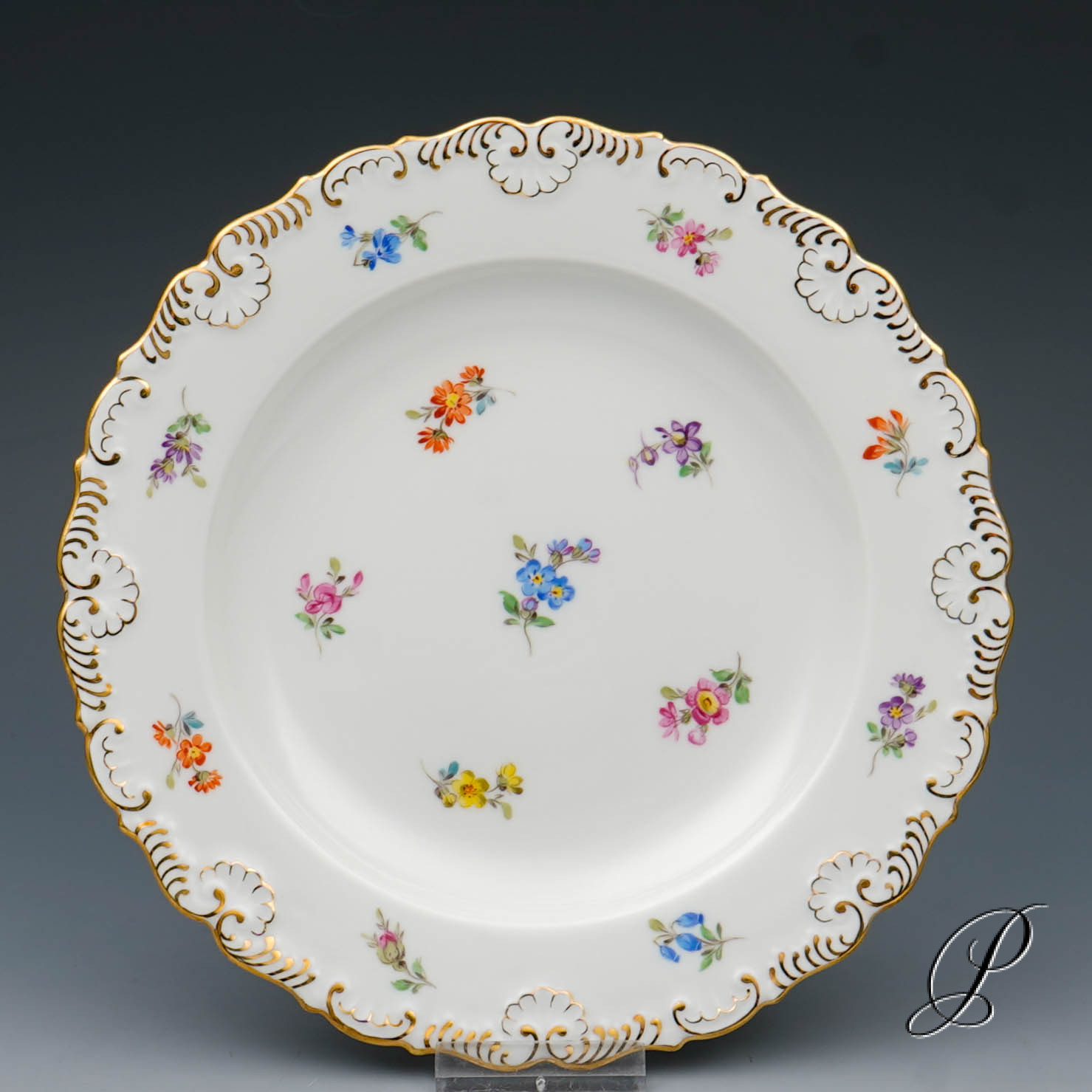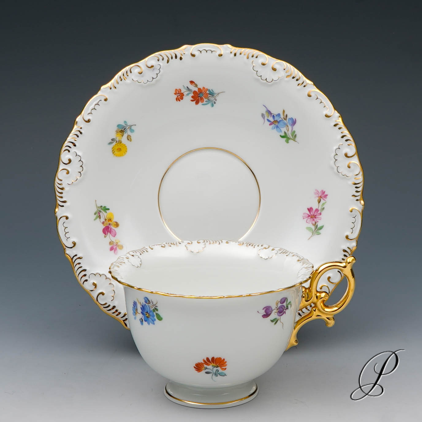 Dekor: Streublume. Sehr aufwedig vergoldete Ornamente. Tierkopfausguss an der Kanne.
