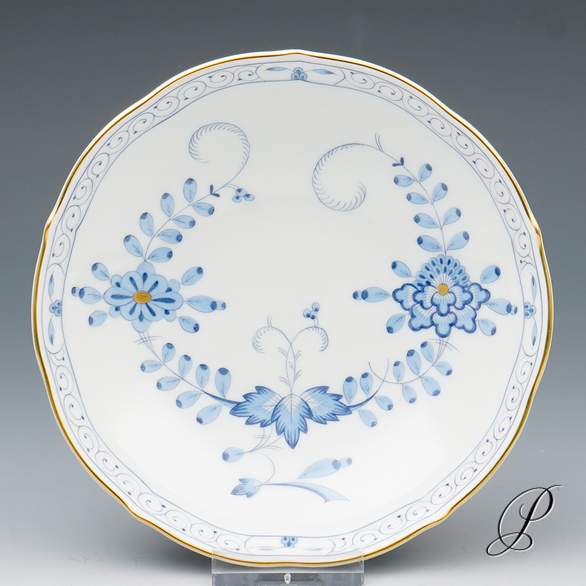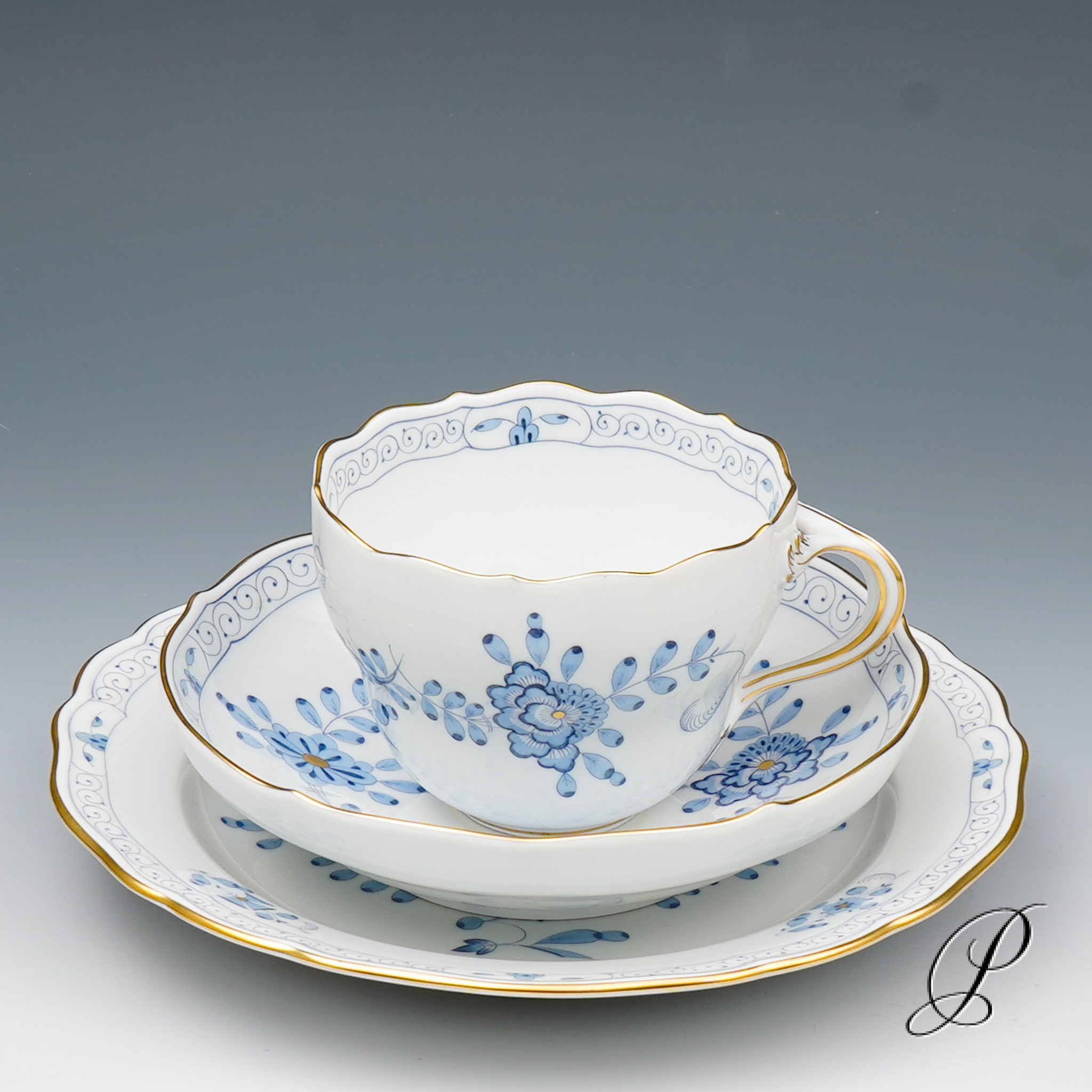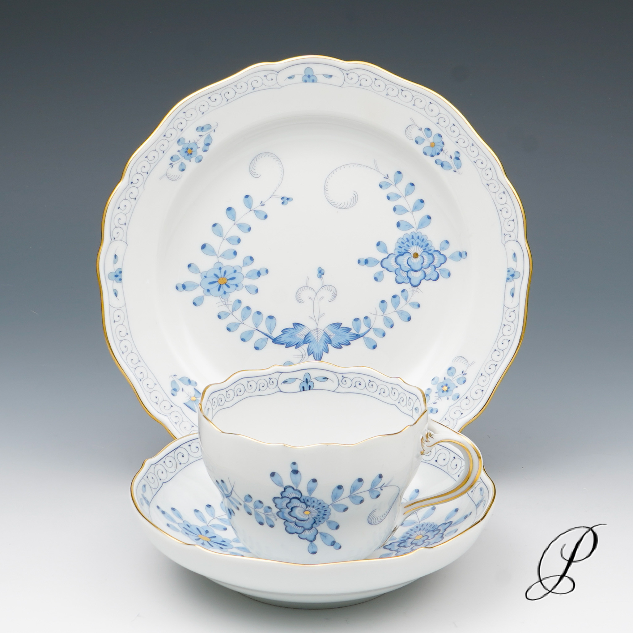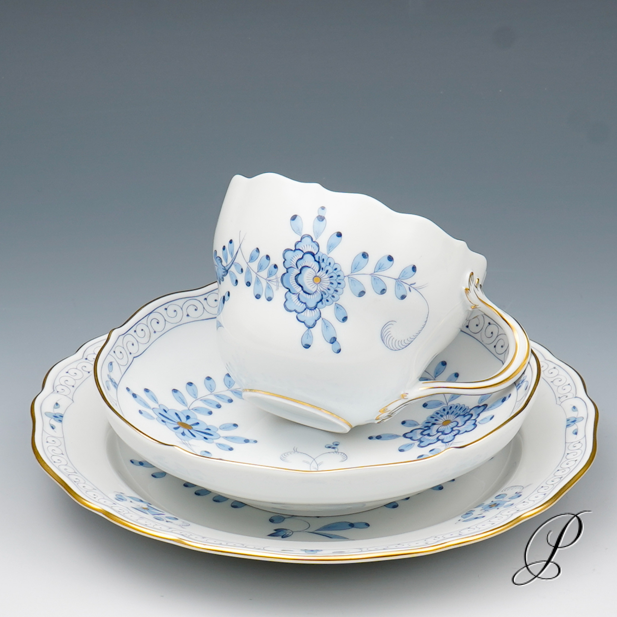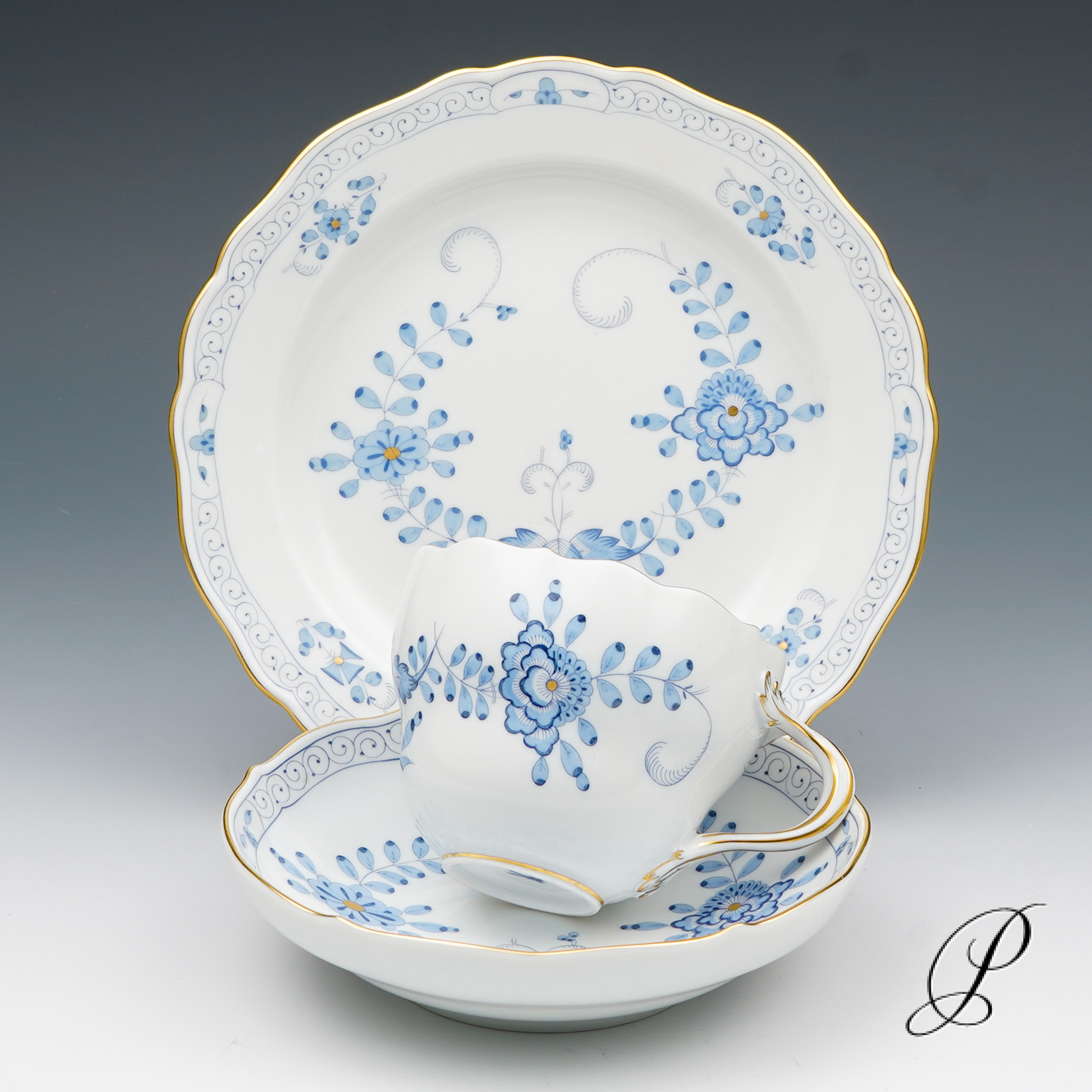 Dekor: Indische Malerei2, mit Kante, hellblau, Goldpunkte und Goldrand. Dekornummer 340210.