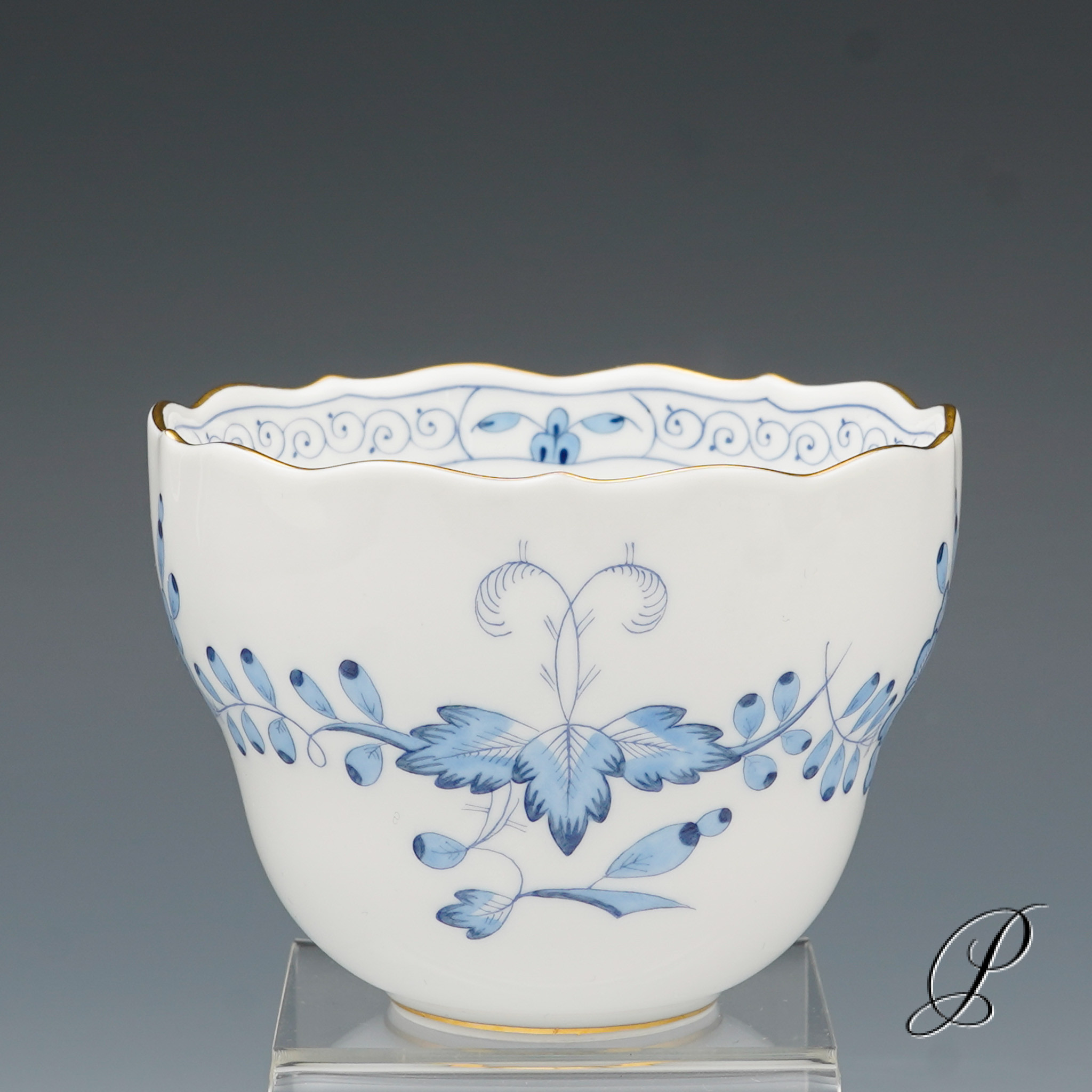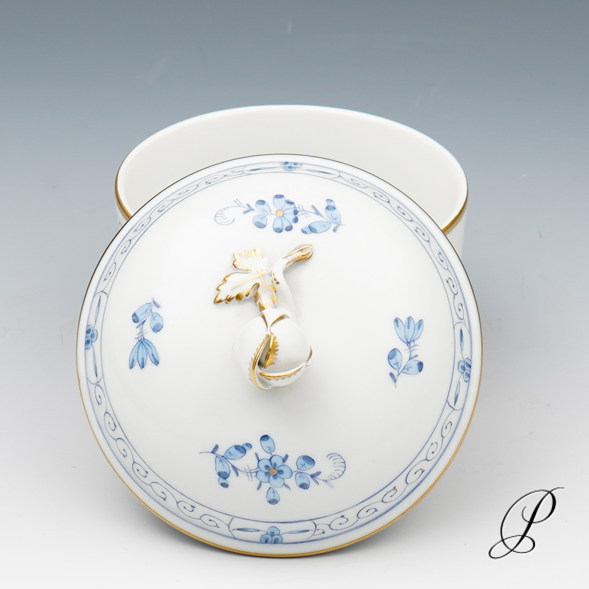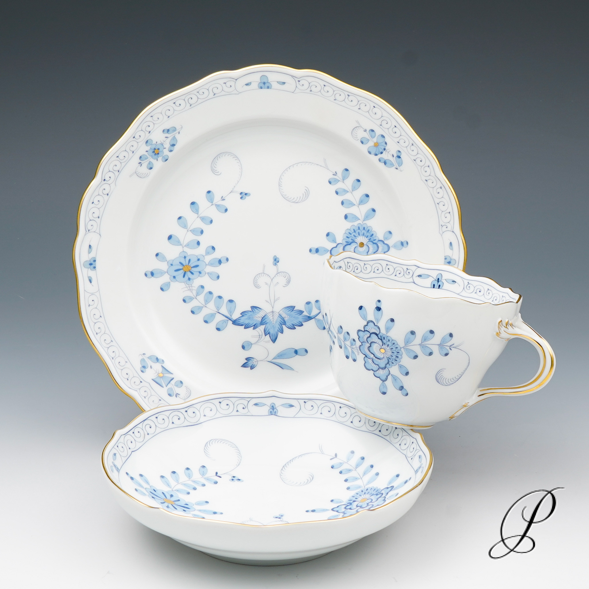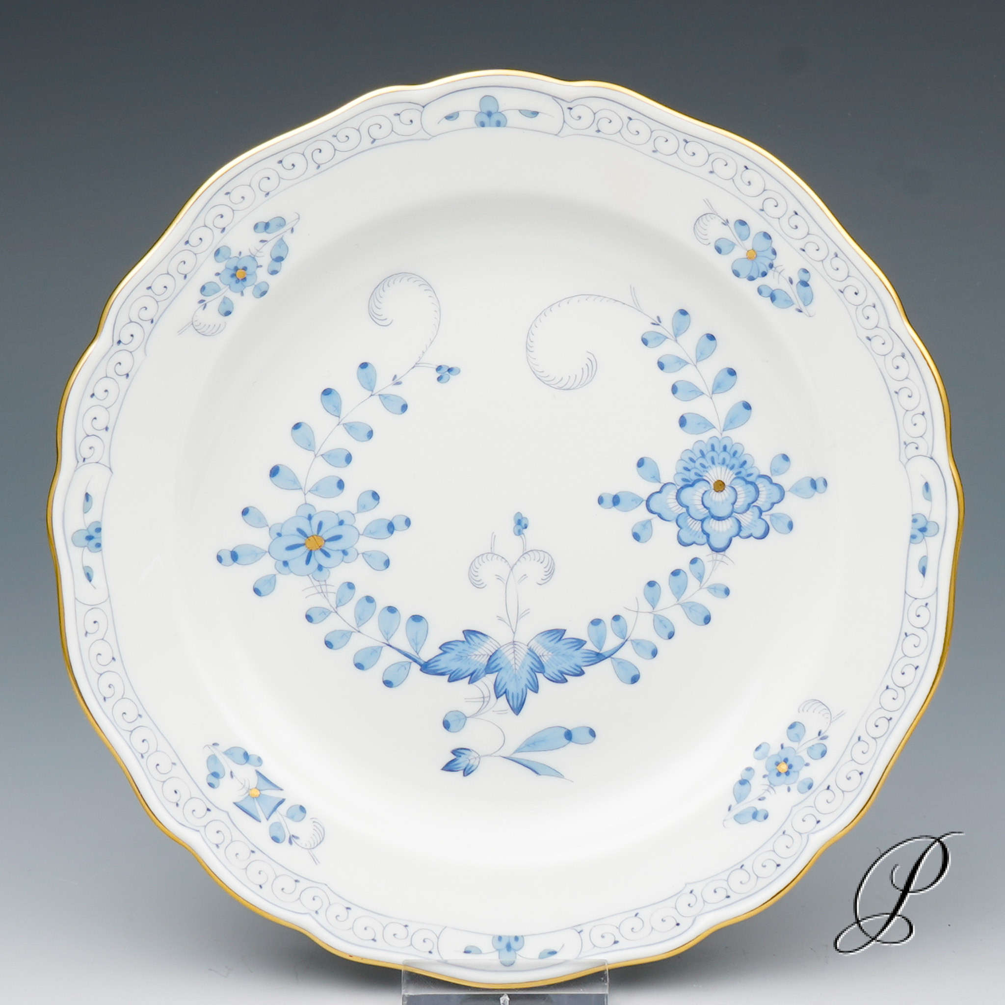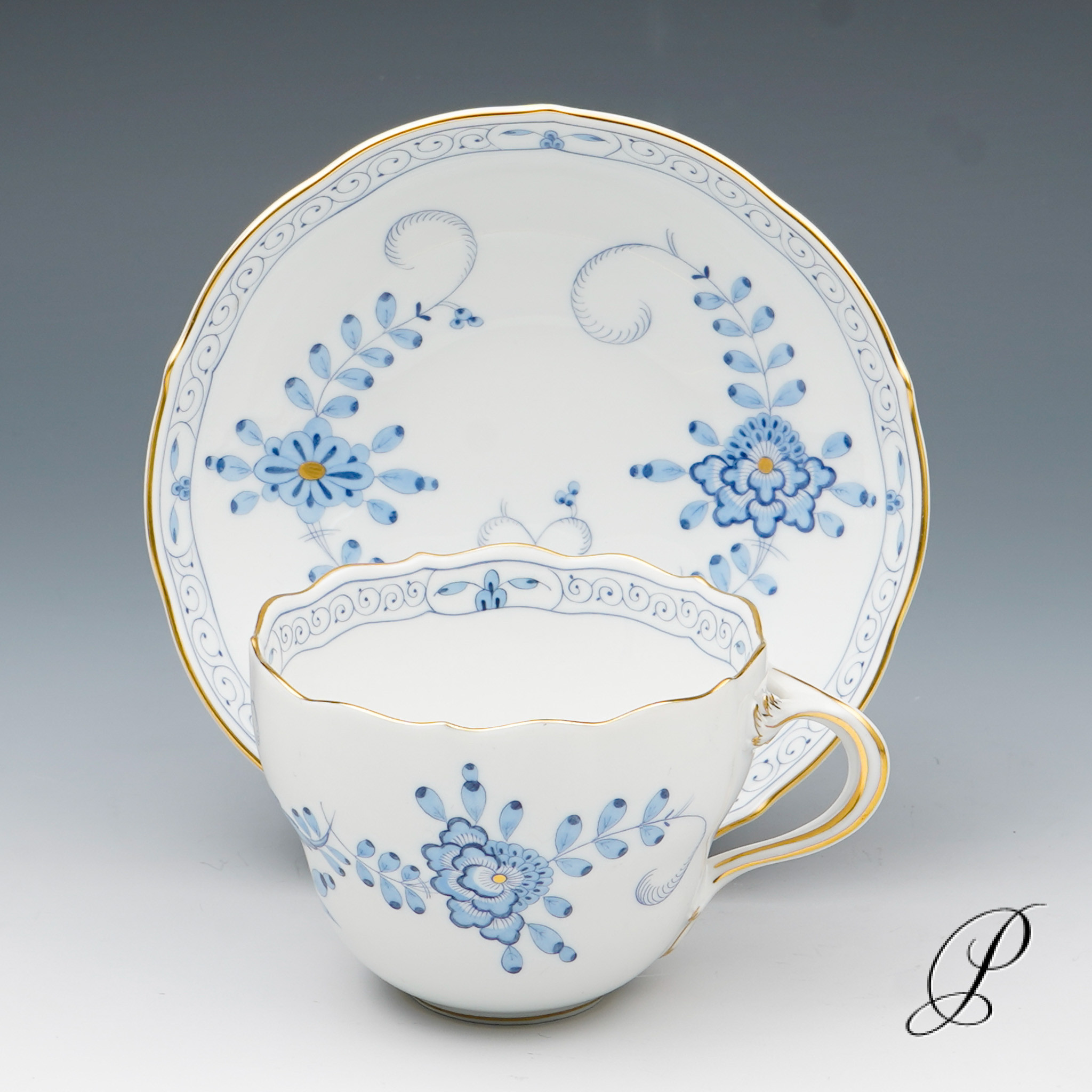 Dekor: Indische Malerei2, mit Kante, hellblau, Goldpunkte und Goldrand. Dekornummer 340210.