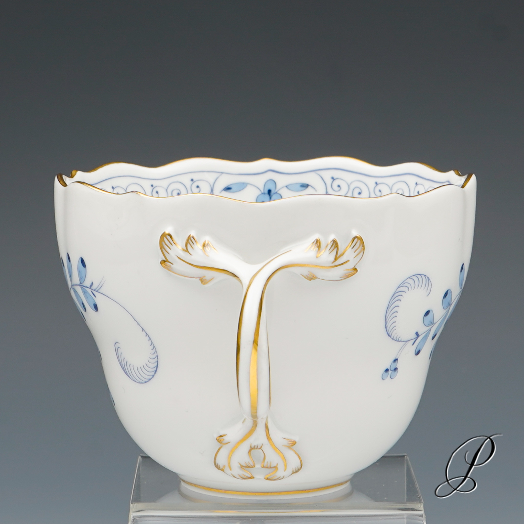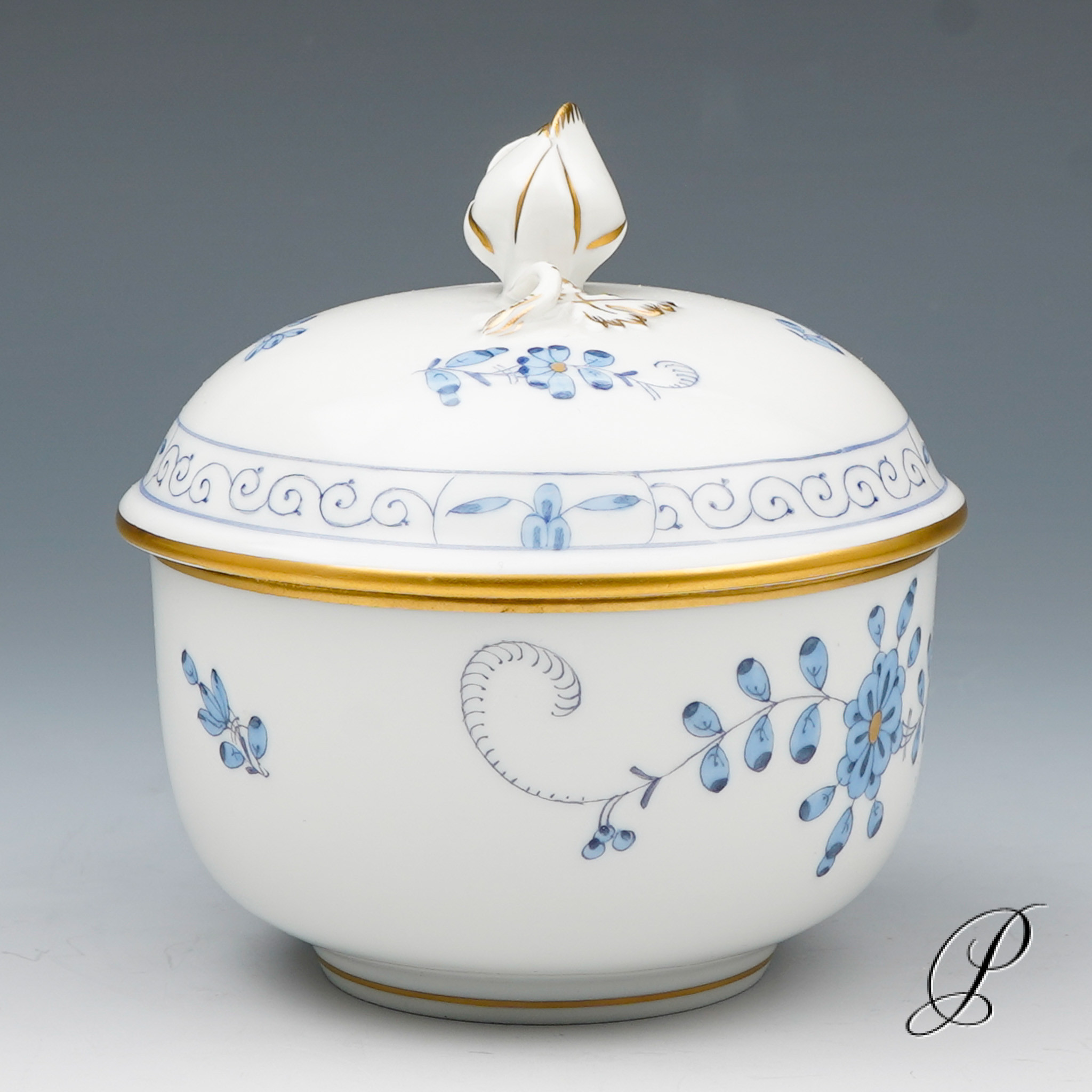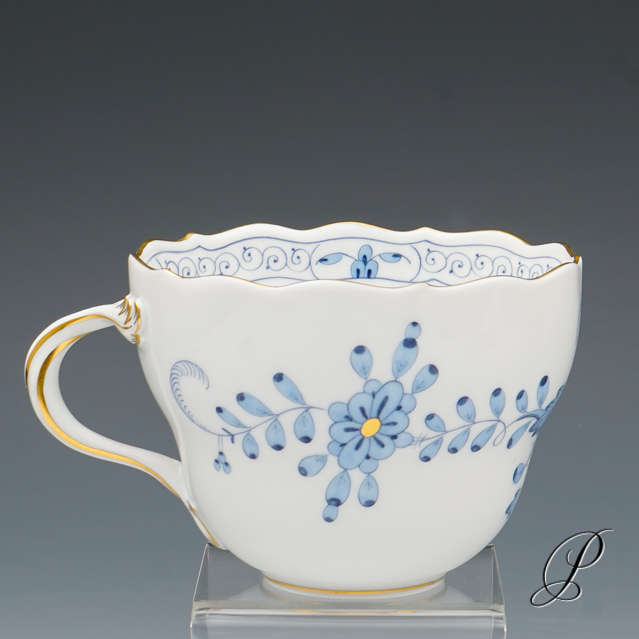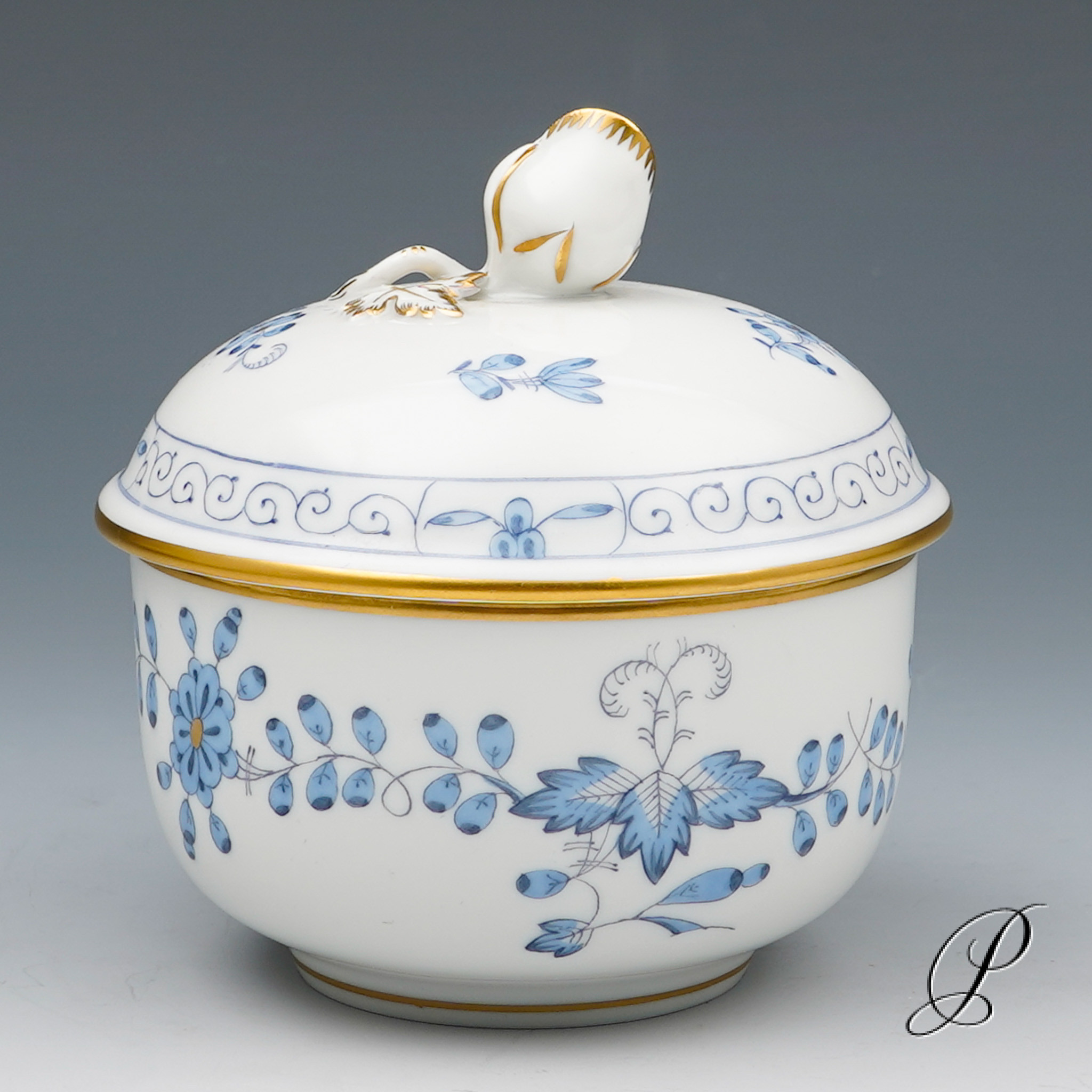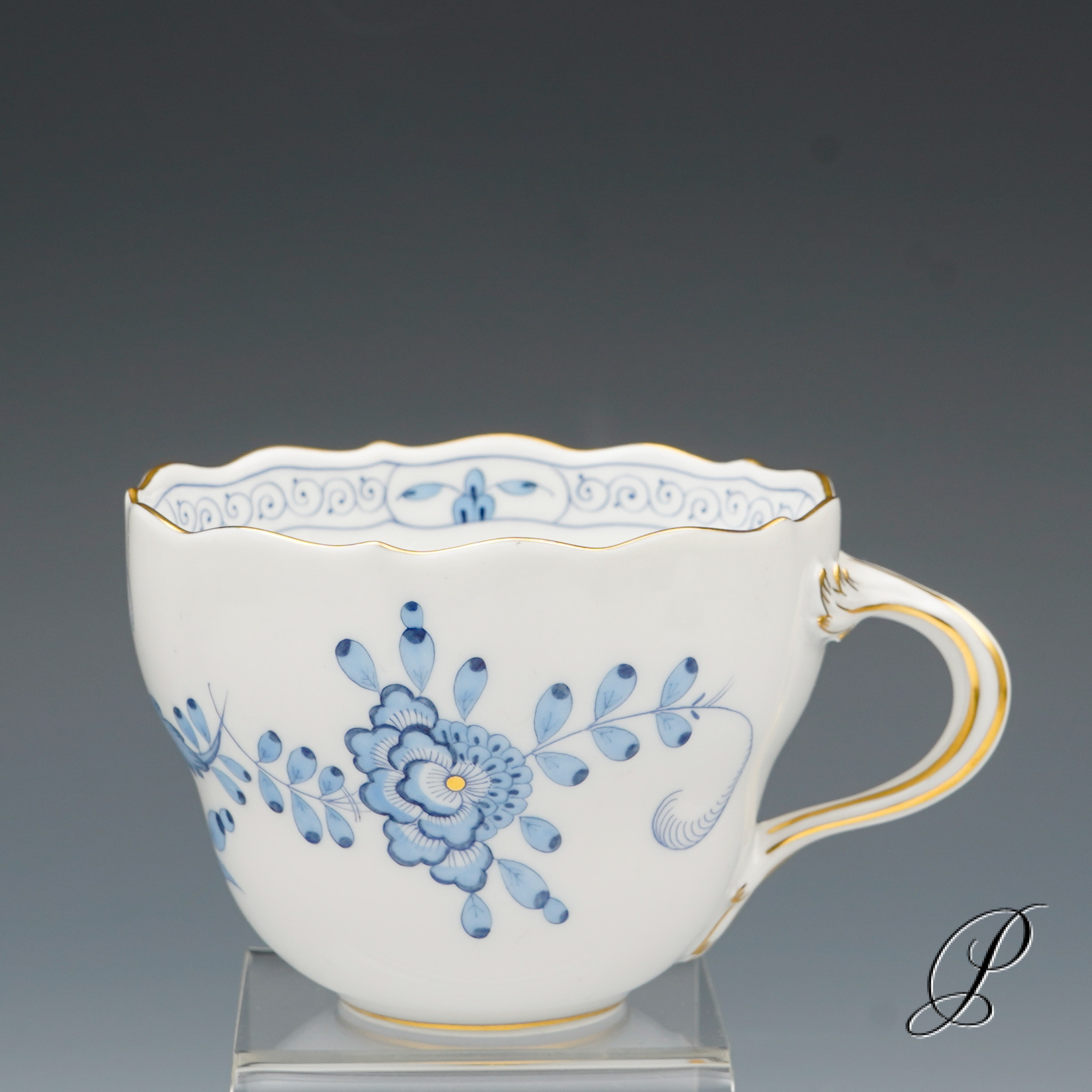 Dekor: Indische Malerei2, mit Kante, hellblau, Goldpunkte und Goldrand. Dekornummer 340210.