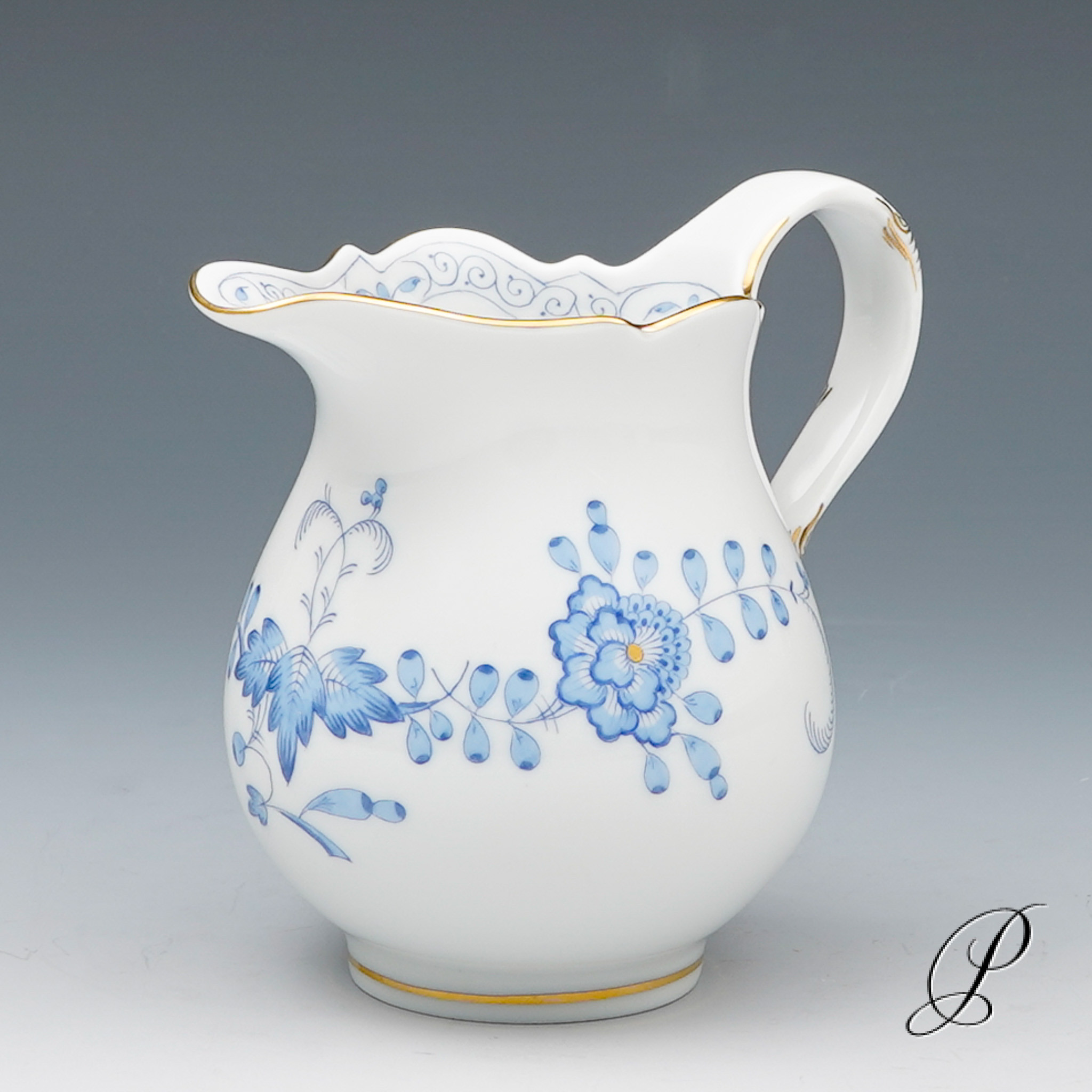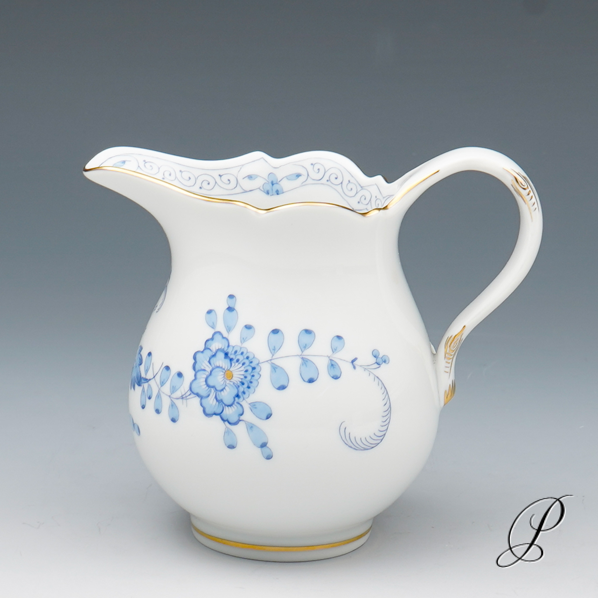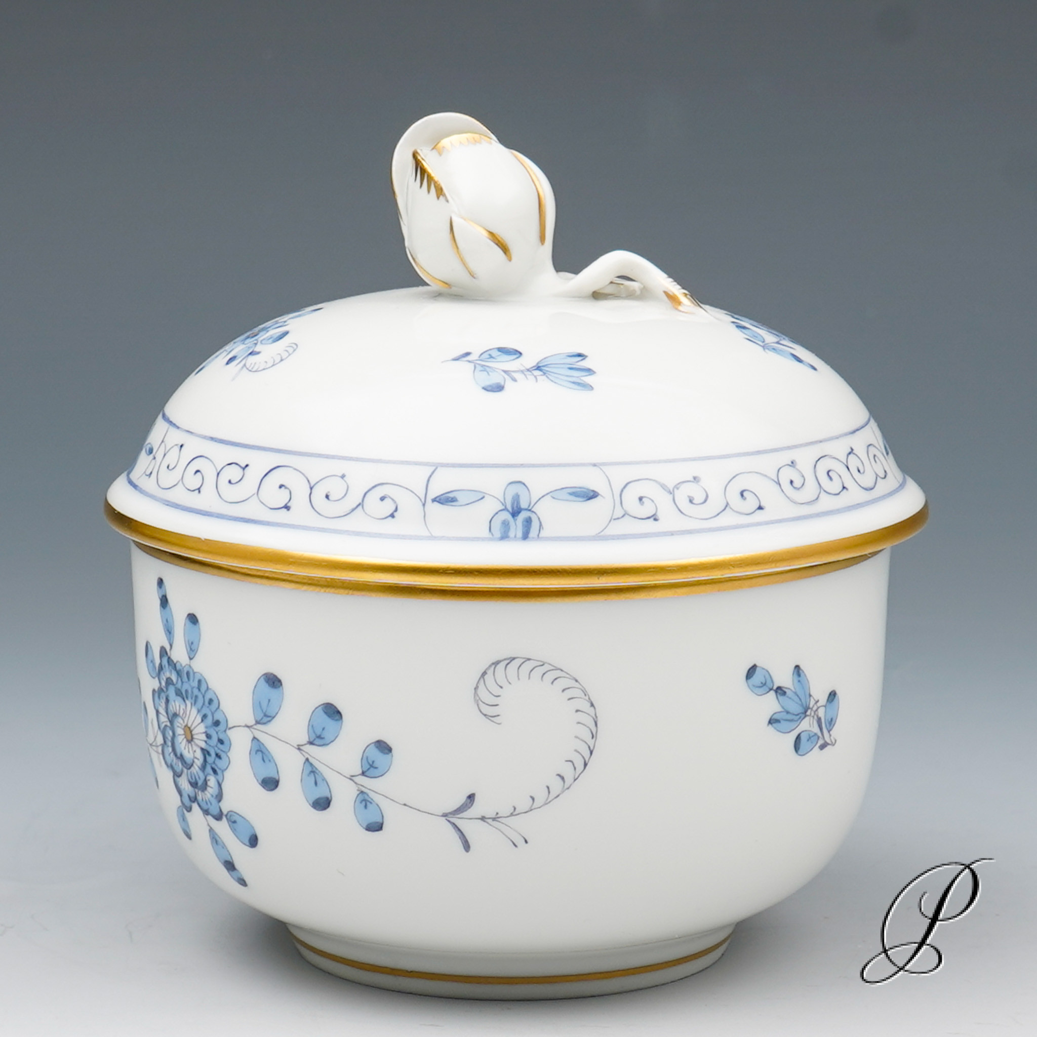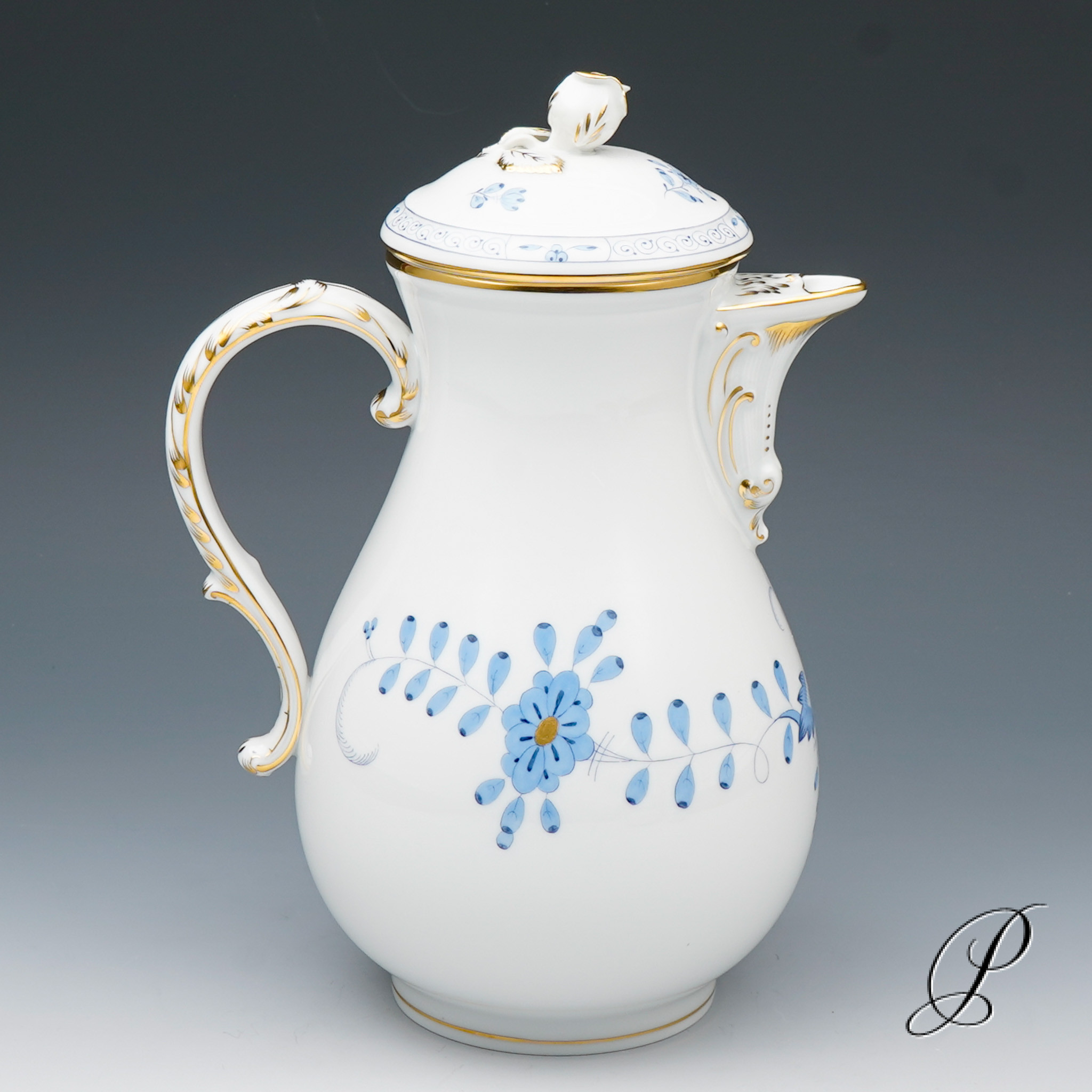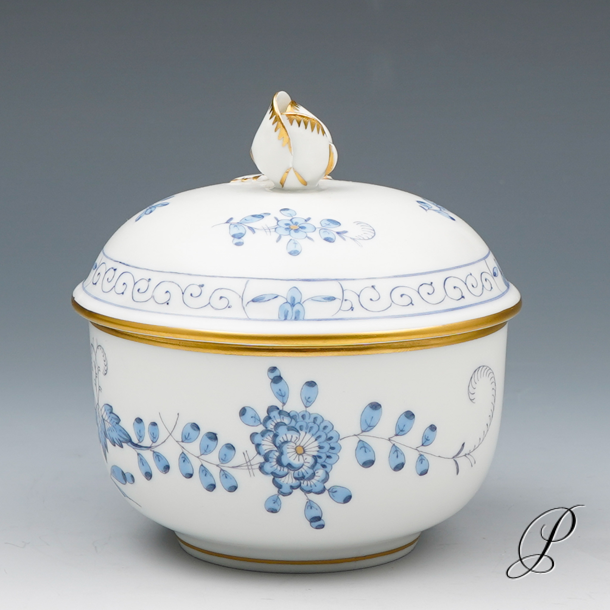 Dekor: Indische Malerei2, mit Kante, hellblau, Goldpunkte und Goldrand. Dekornummer 340210.
