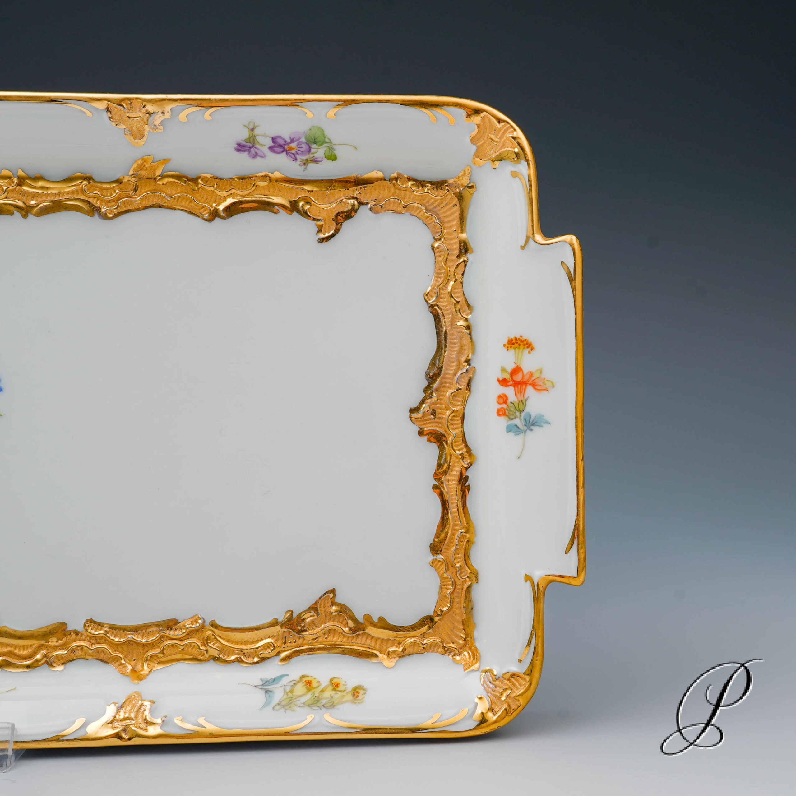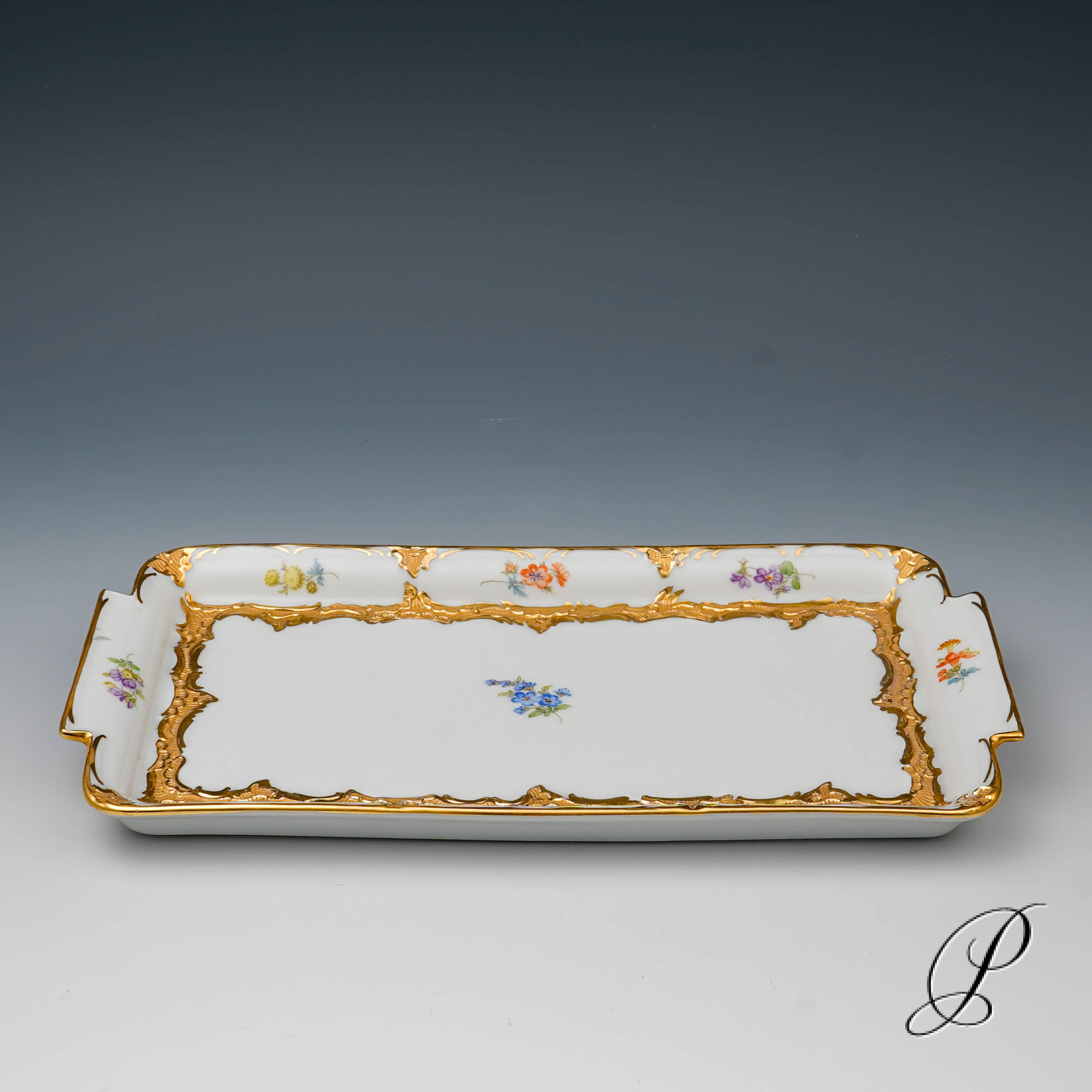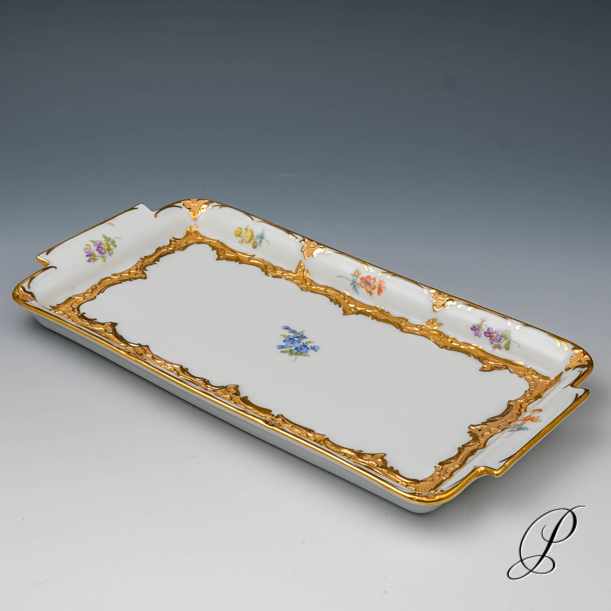 Dekor: „B-Form“, gestreute Blümchen, bunt mit Goldbronze.