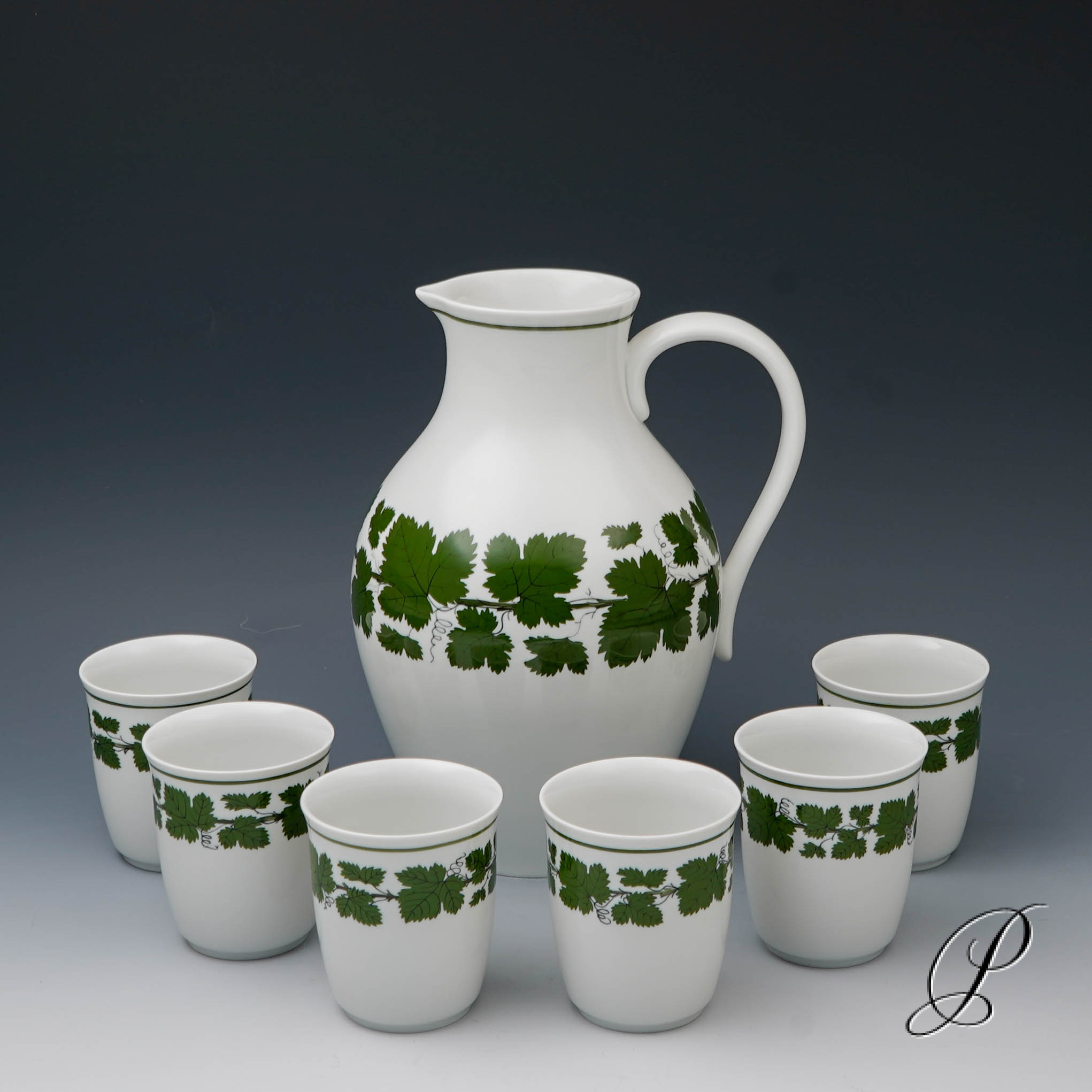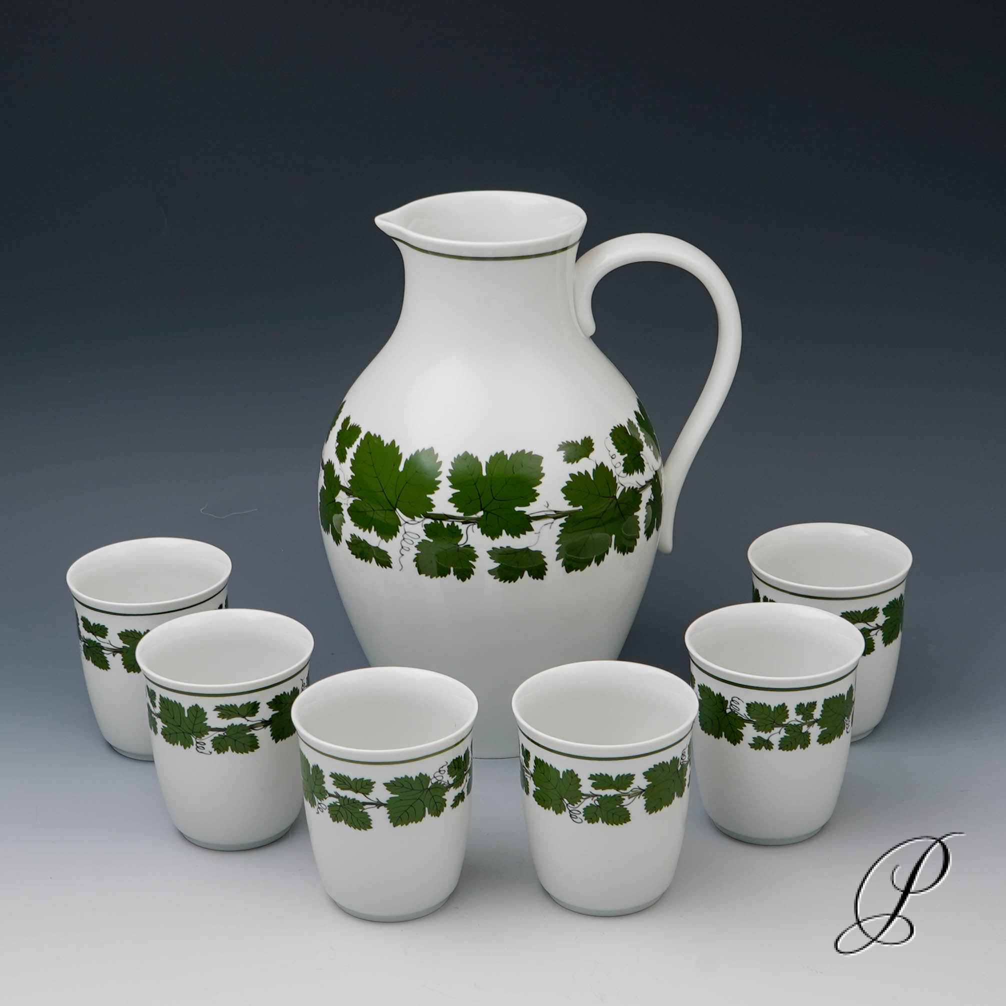Ein Meissner Krug mit sechs dazu passenden Bechern.