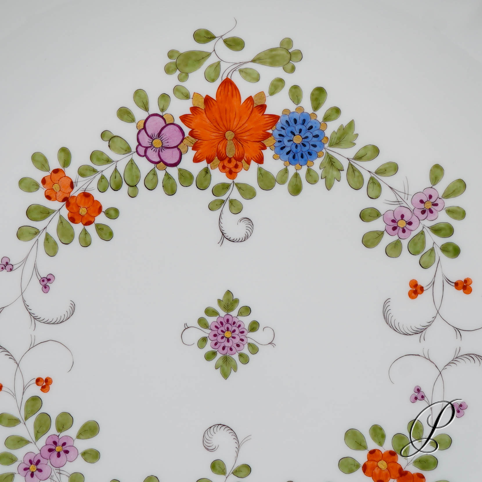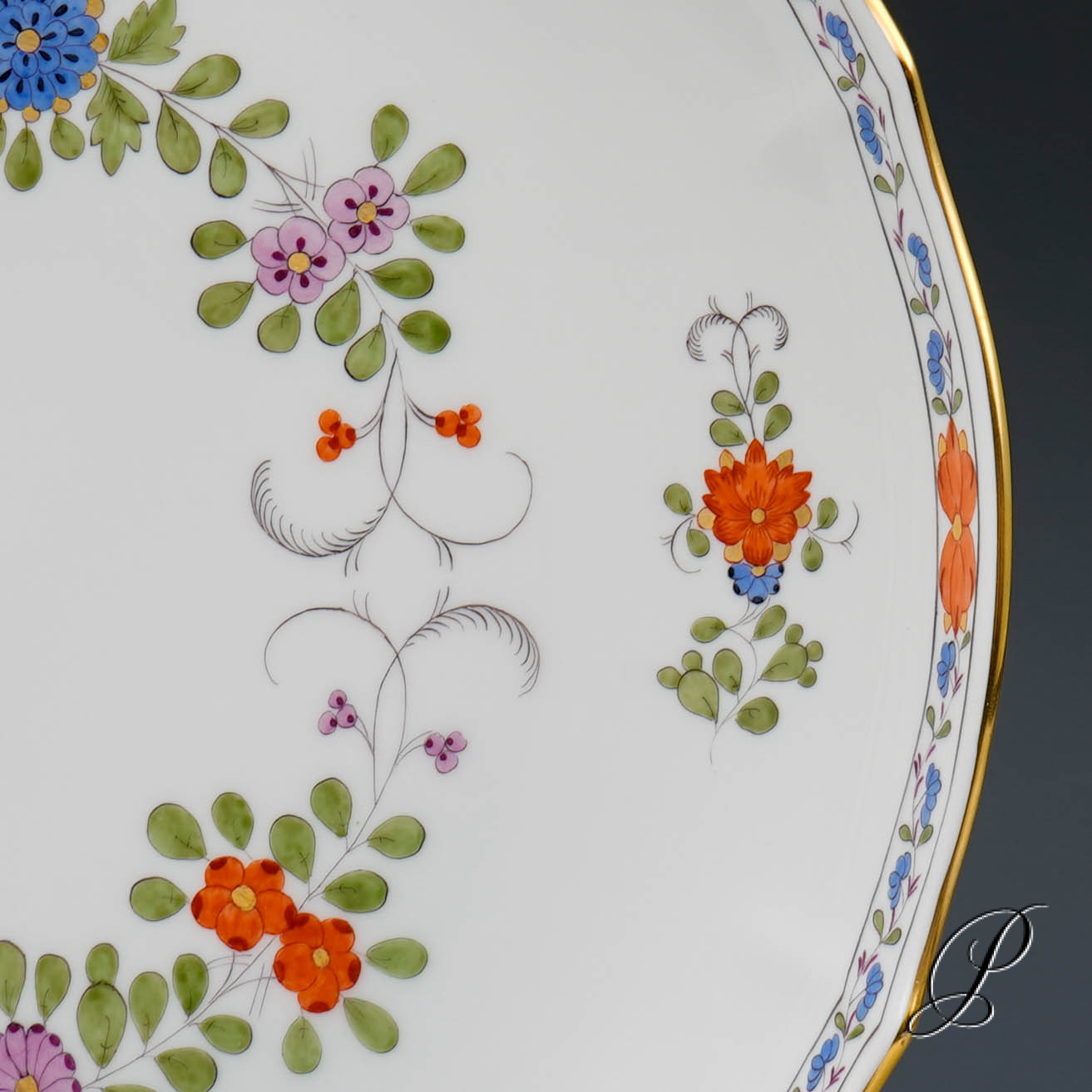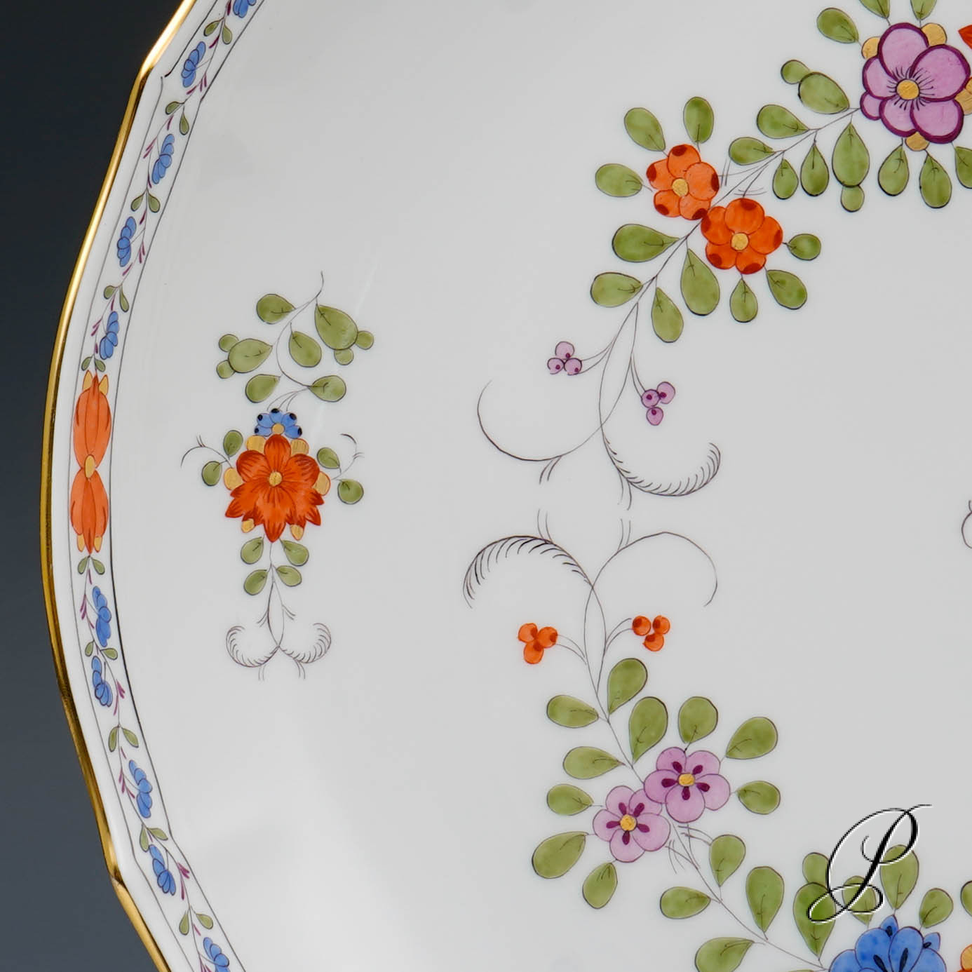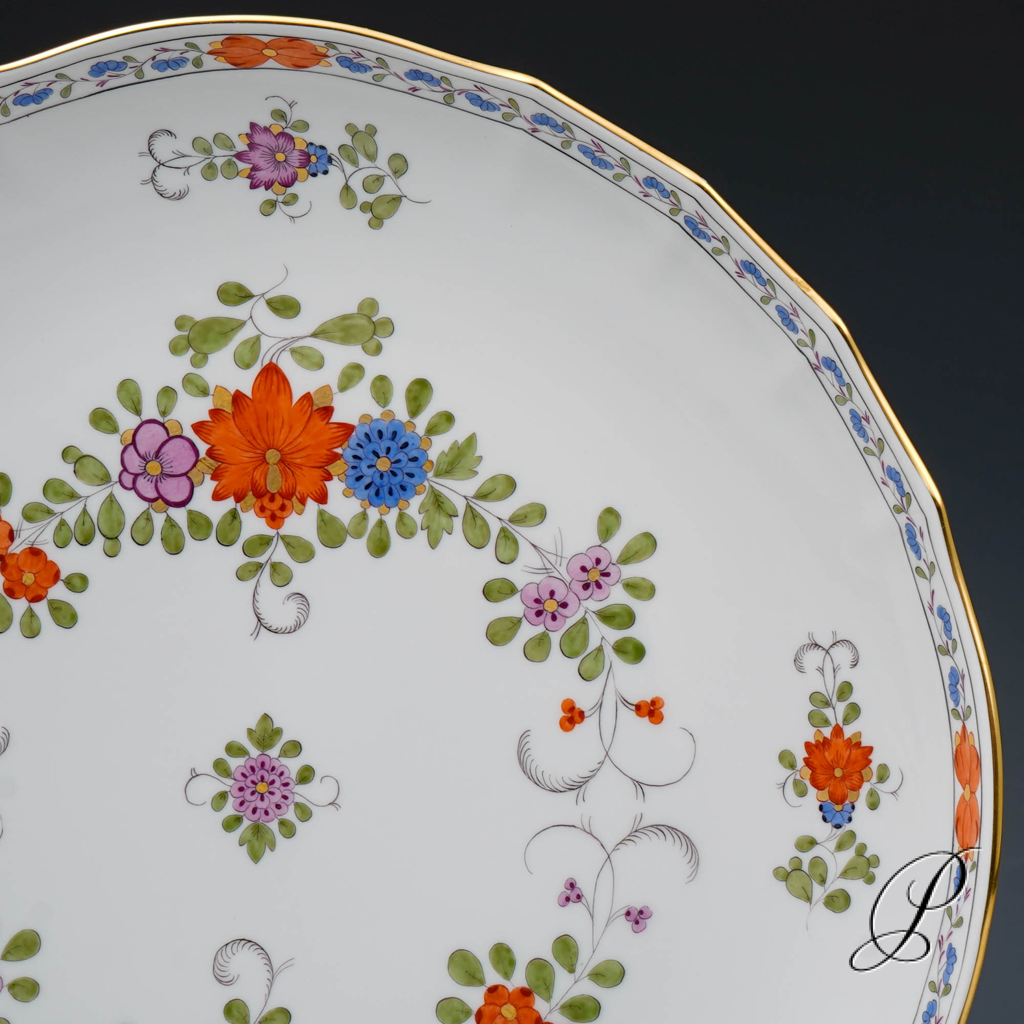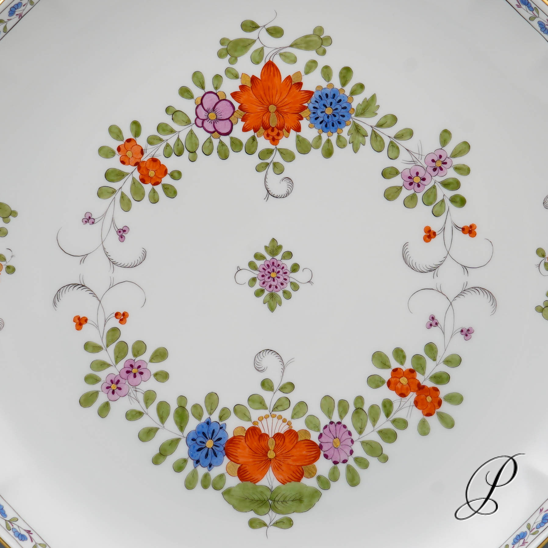 Dekor: Indische Blumenmalerei, bunt mit Kupferfarben und Goldrand.