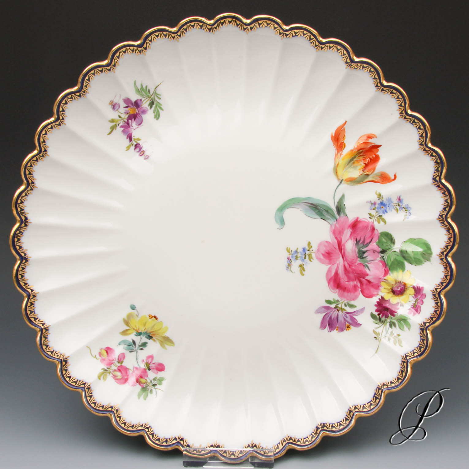 Dekor: Bukett schräg, bunt, königsblauer Reifen glasiert, Gold A-Kante und Goldrand.