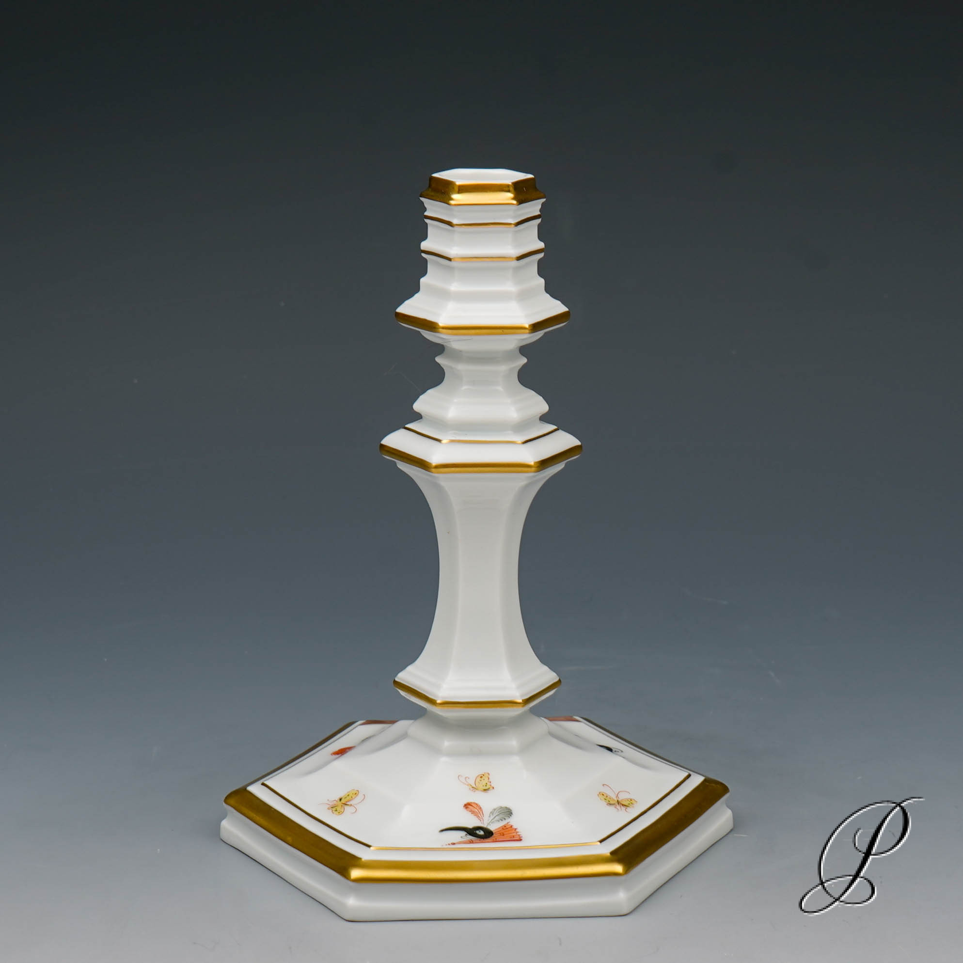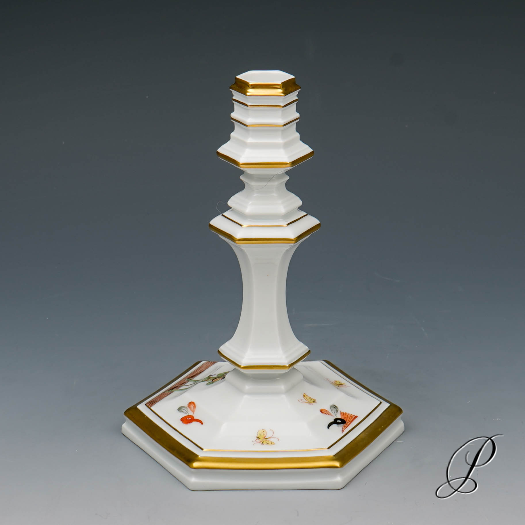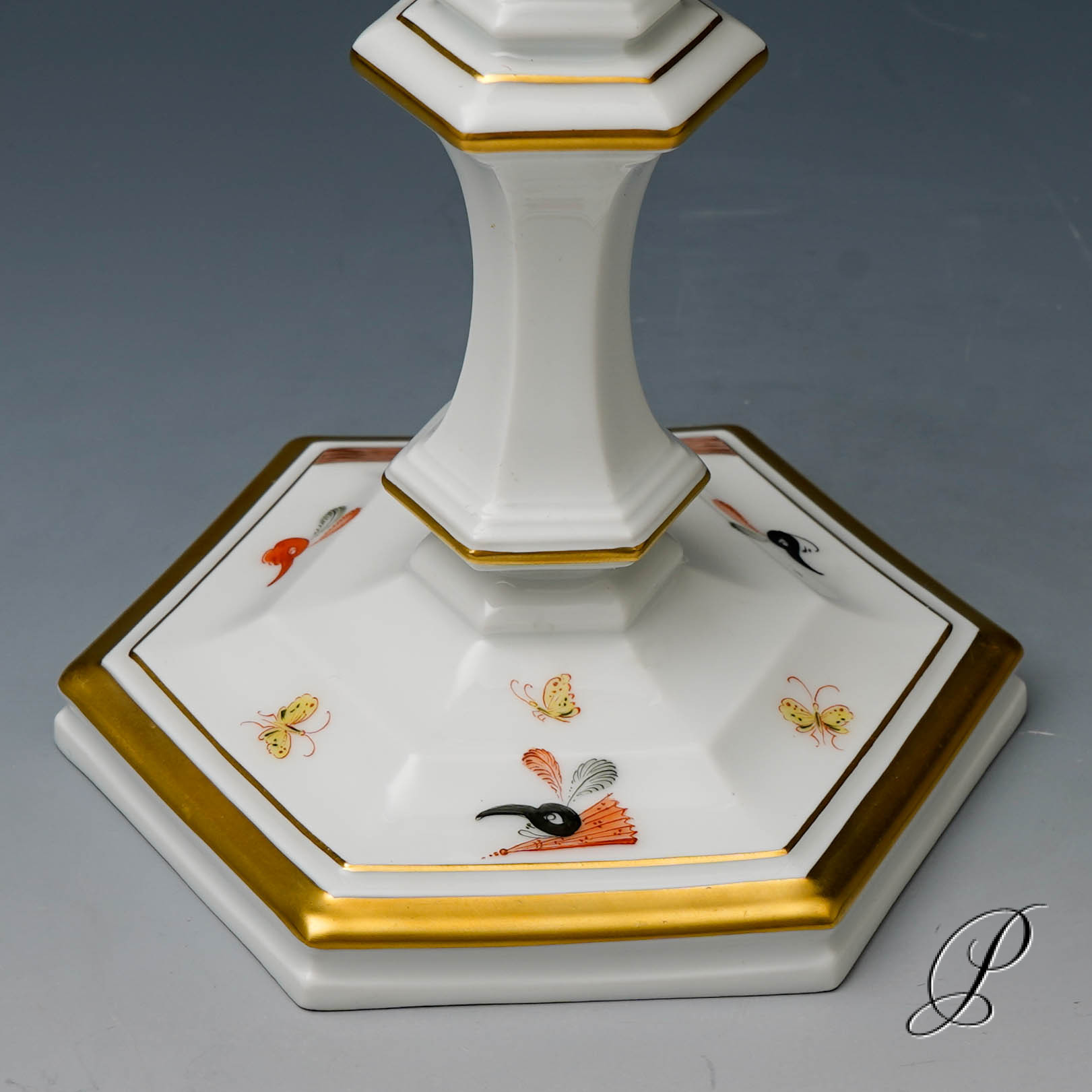 Formenentwurf von Johann Jakob Irminger. Er war Hofsilbermeister in Dresden der als Gestalter auch für die Meissen Manufaktur tätig war. Der Entwurf für den Leuchter entstand 1712. Das bestimmende Element des Leuchters ist das Sechseck, es wird vom Fuß bis zur Tülle in stufigen Reliefs variiert. In der Symbolik bezeichnet die Zahl Sechs Gleichgewicht und Harmonie aber auch Gesundheit und Glück.
