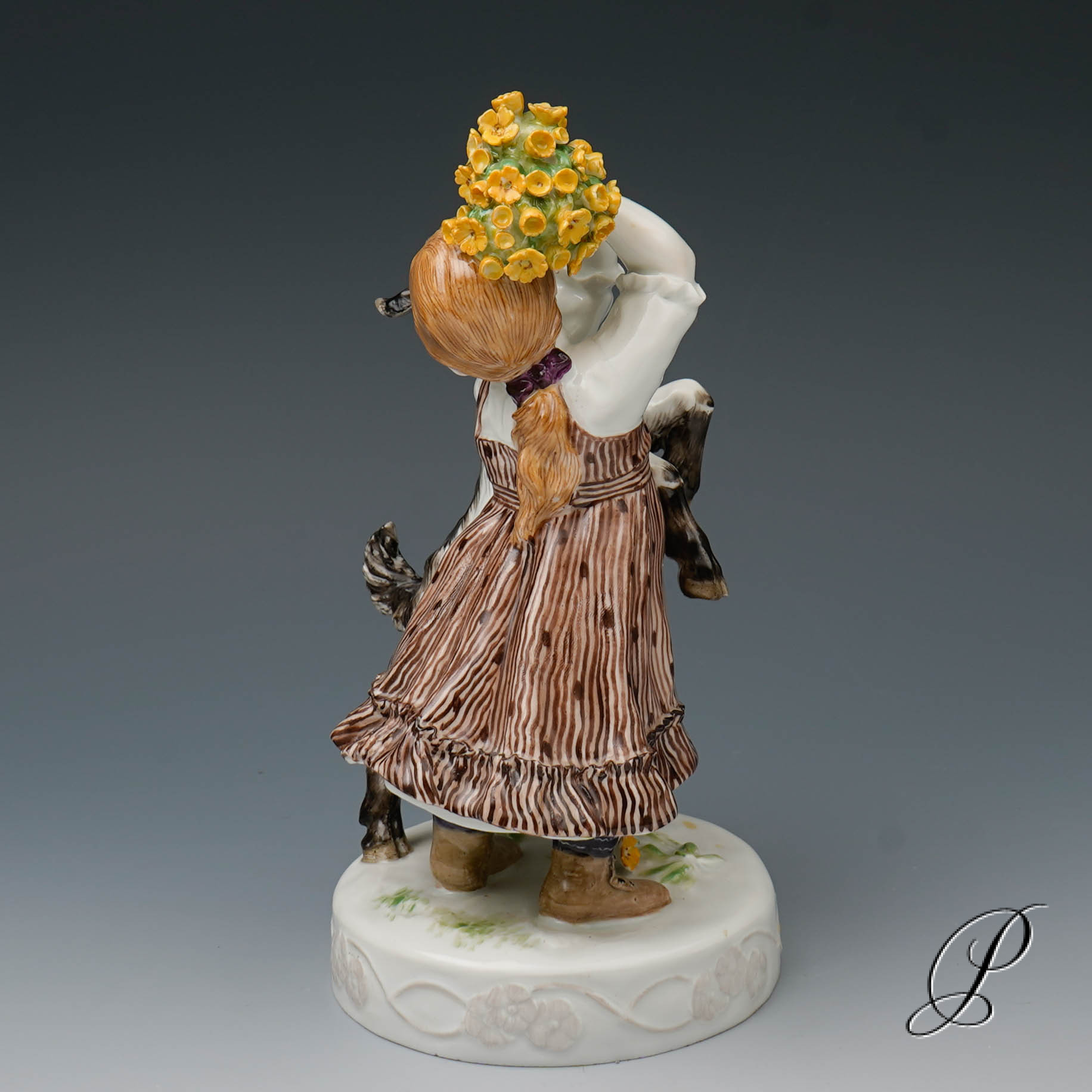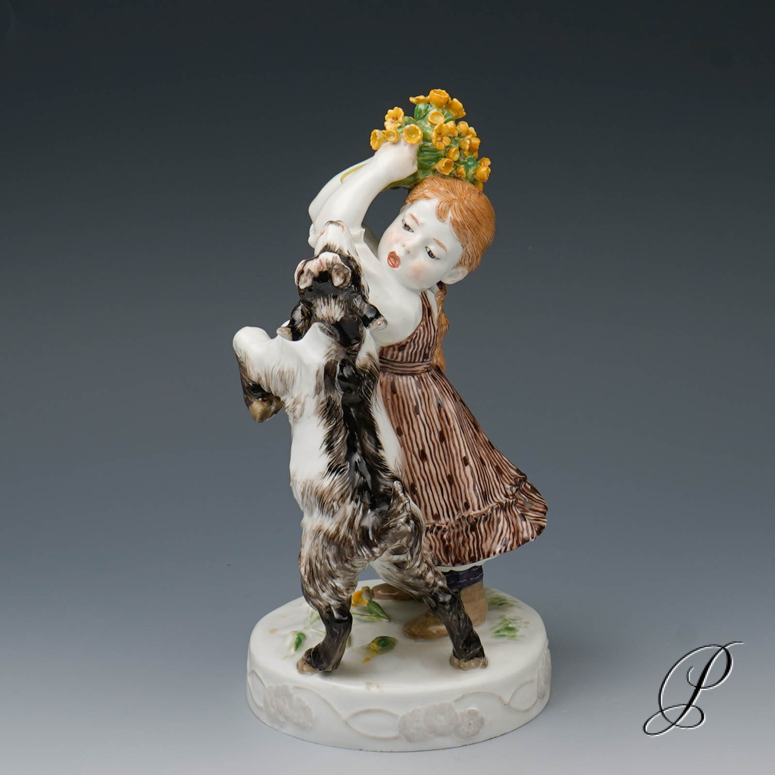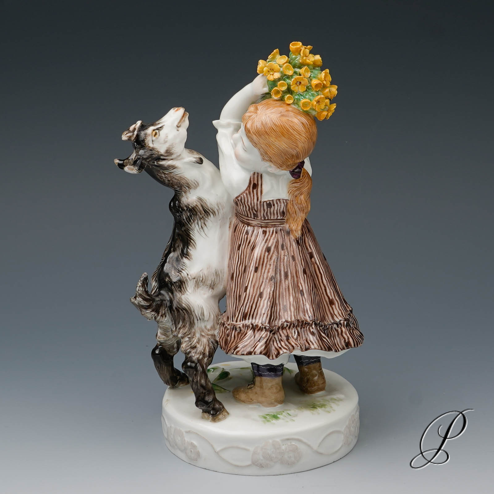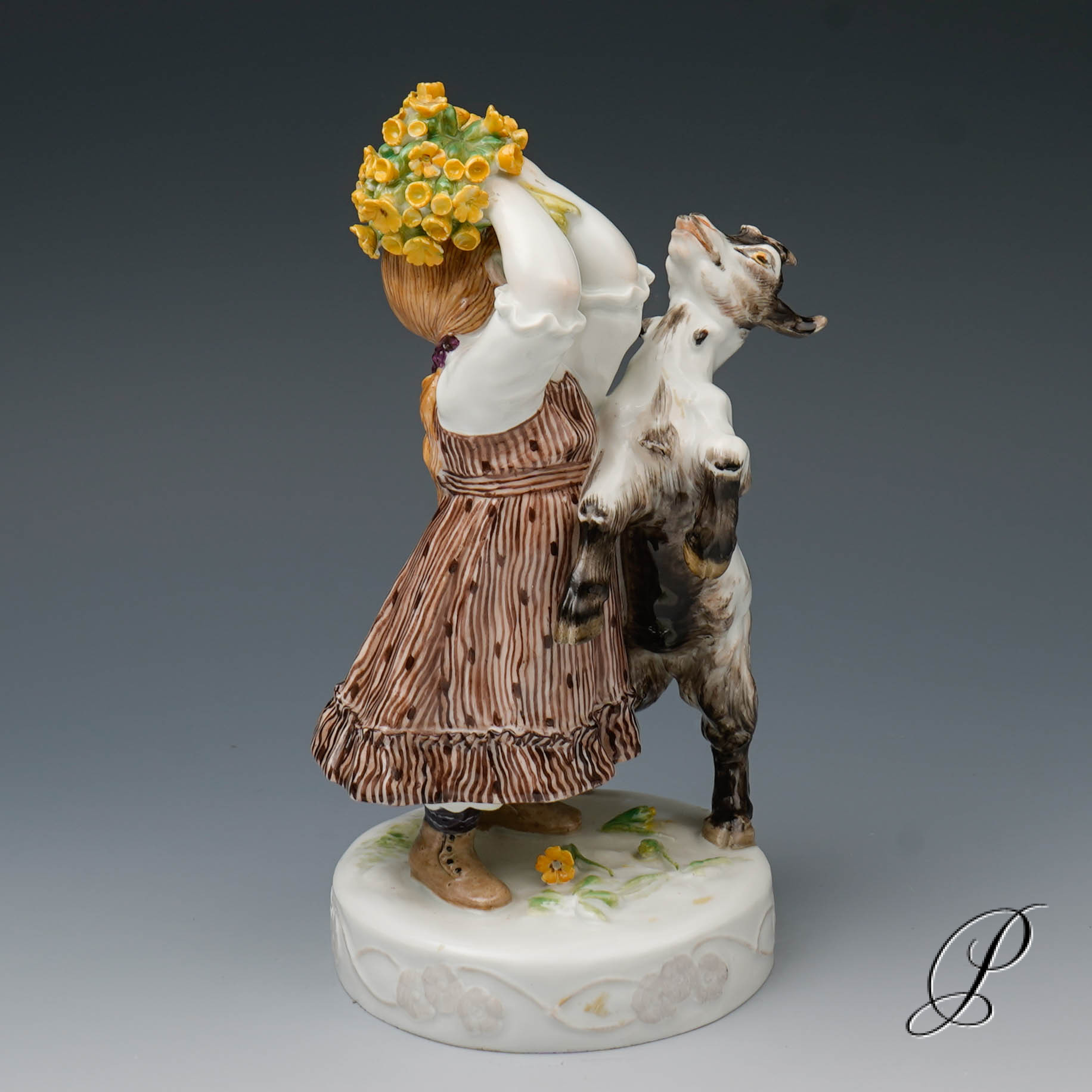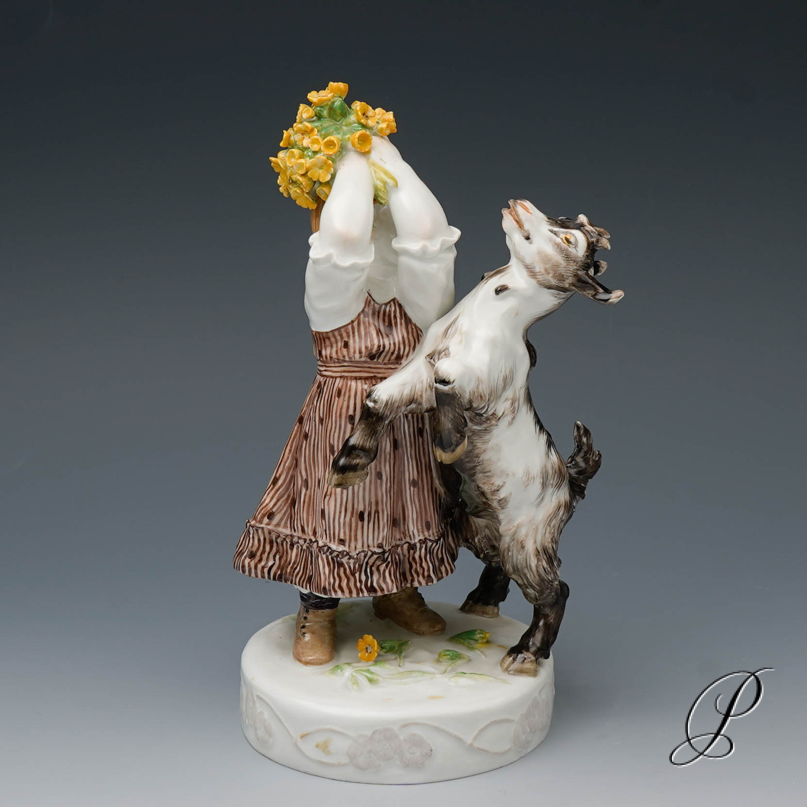 In der Darstellung ein Mädchen mit Ziege. Eine wunderbare Ausführung mit toller Staffage. Auf rundem Sockel mit umlaufendem Blütenrankenrelief und aufgelegten Blumen stehendes Mädchen in blauem Kleid, das die neben ihr emporsteigende, gefräßige Ziege von ihrem gepflückten Primelstrauß abzuwehren versucht.