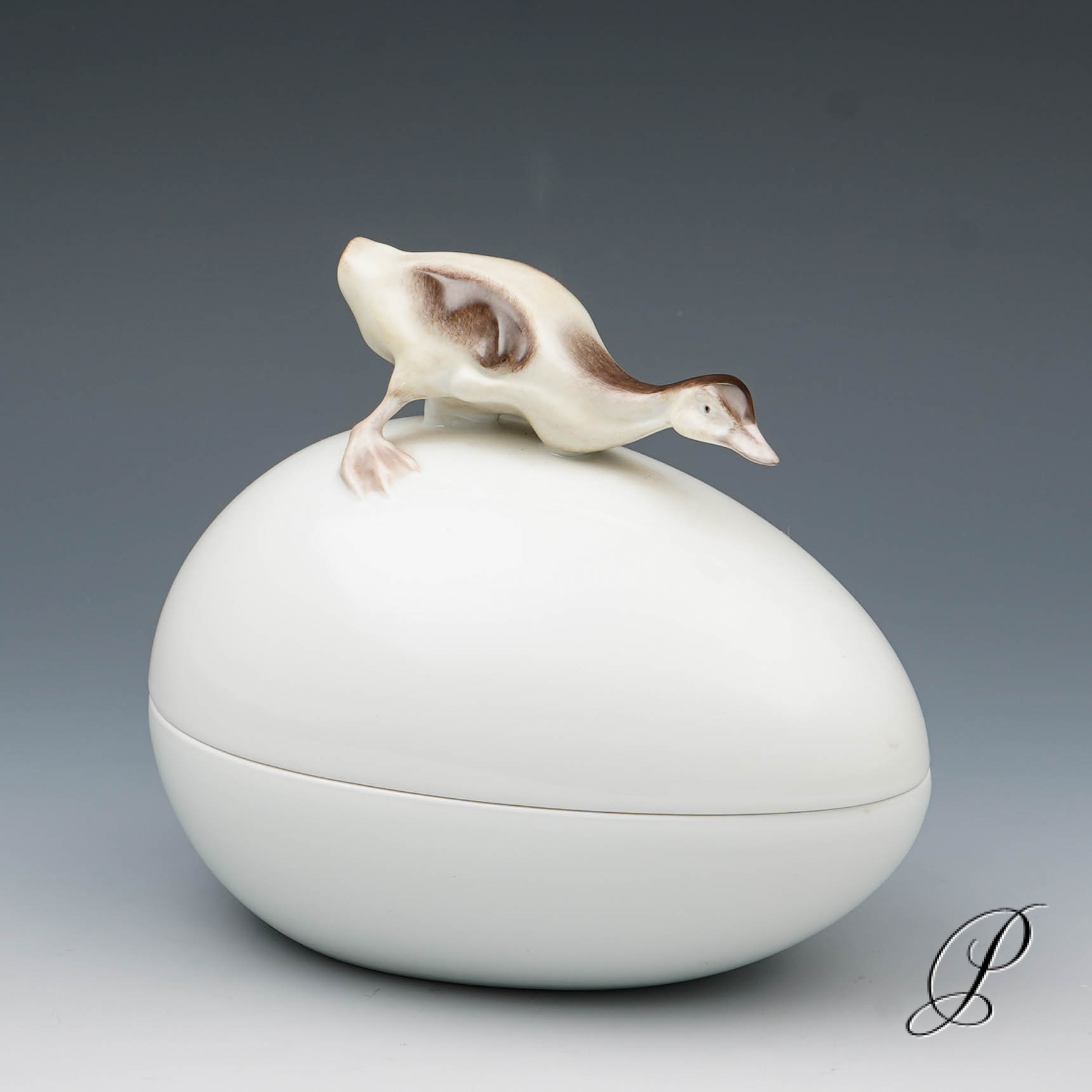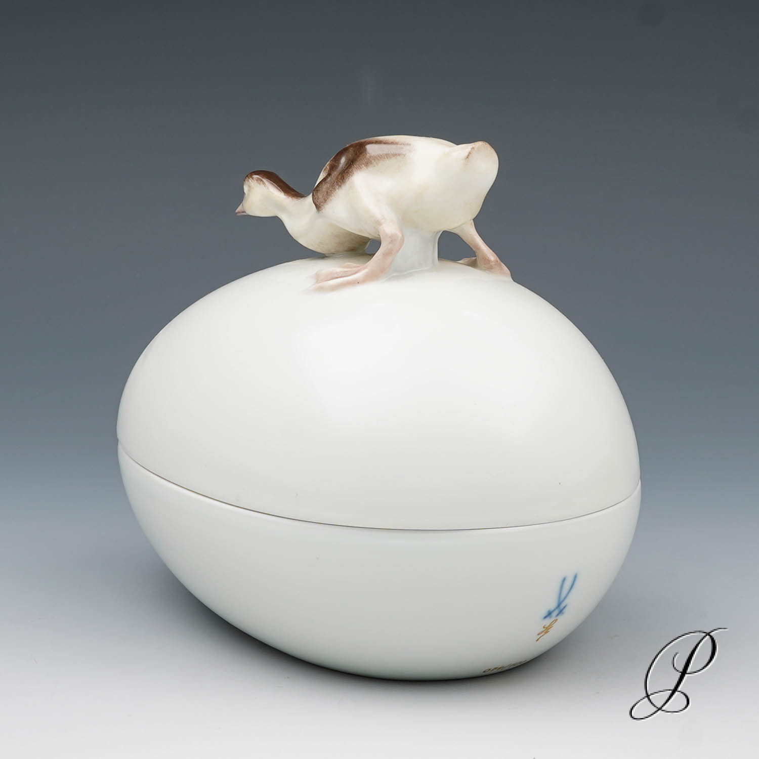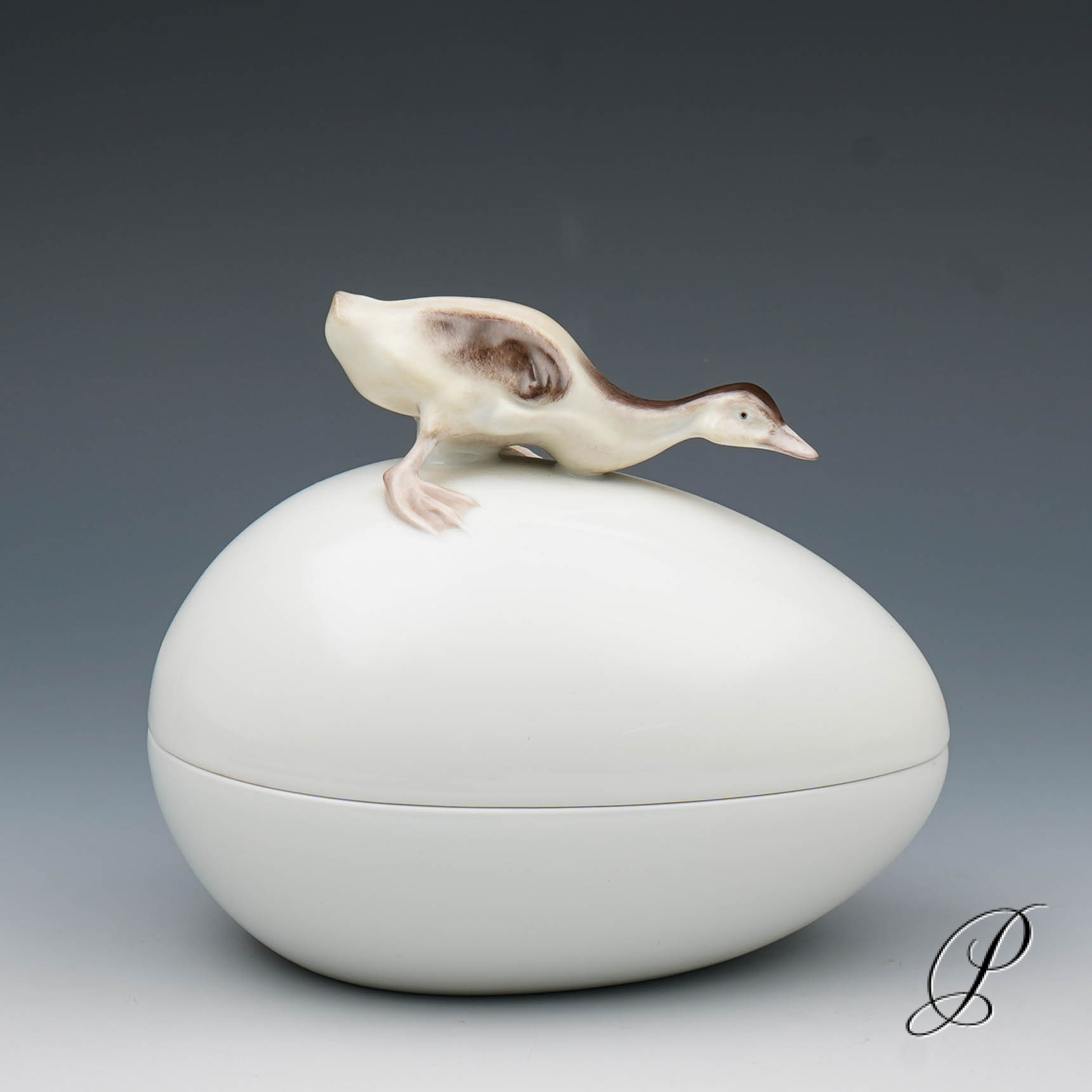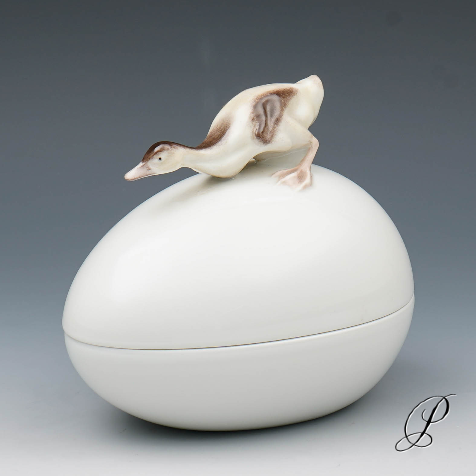 Deckeldose in Ei-Form, Deckel mit Knauf in Form mit plastischem Entenküken.